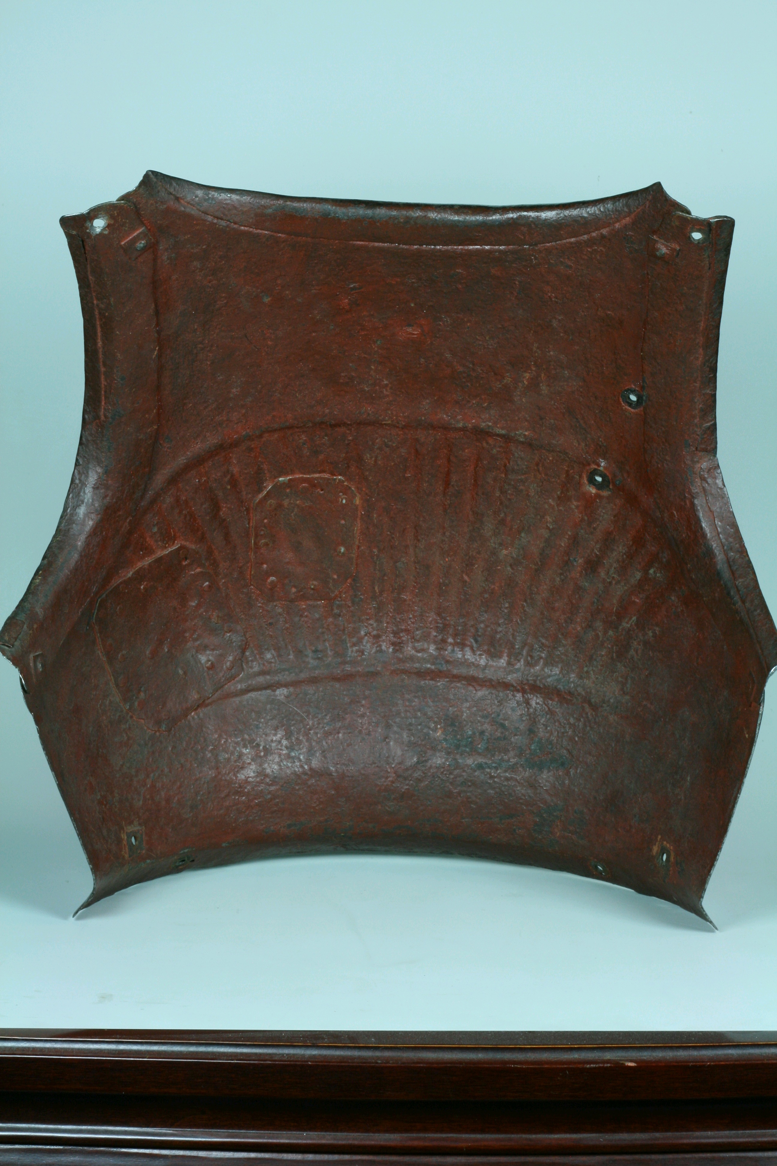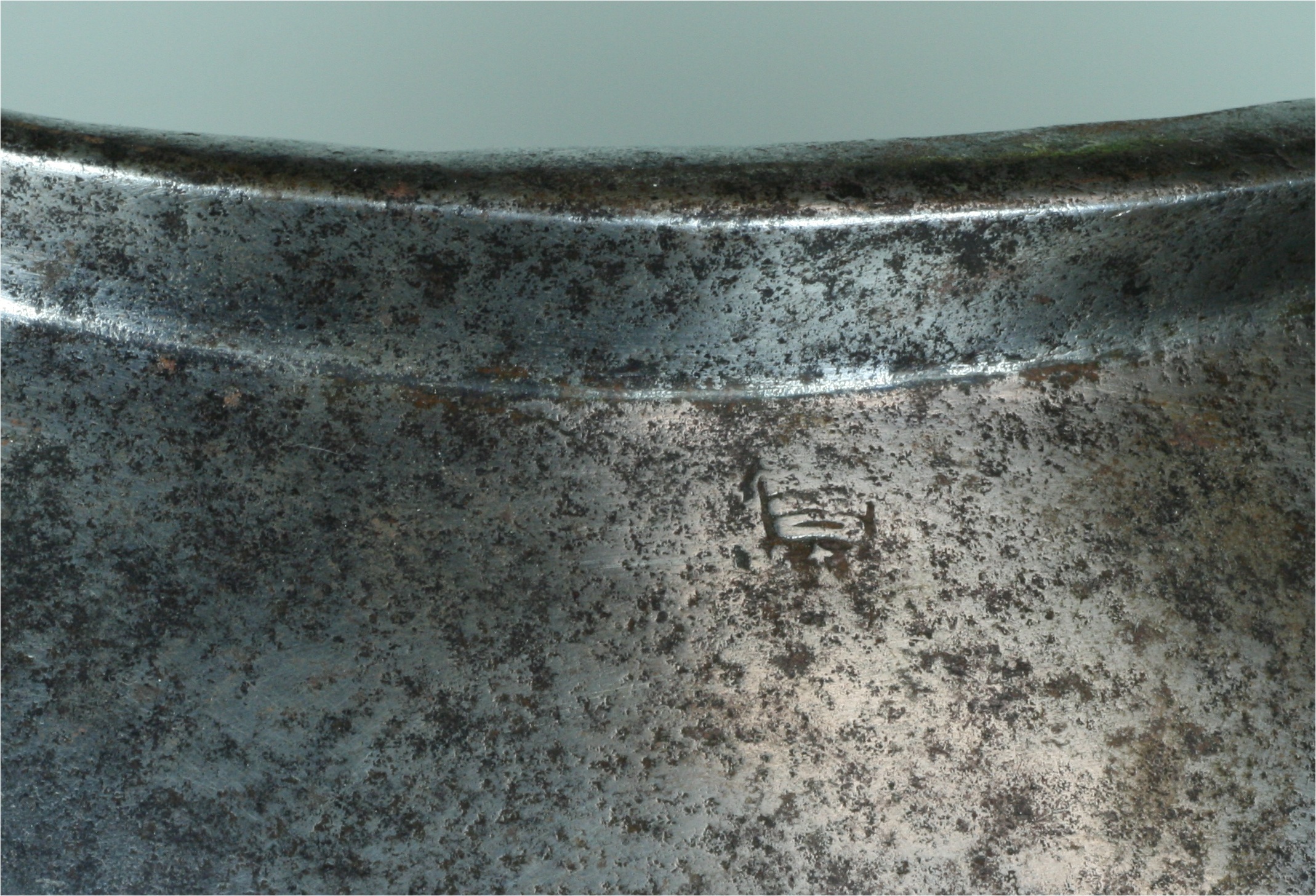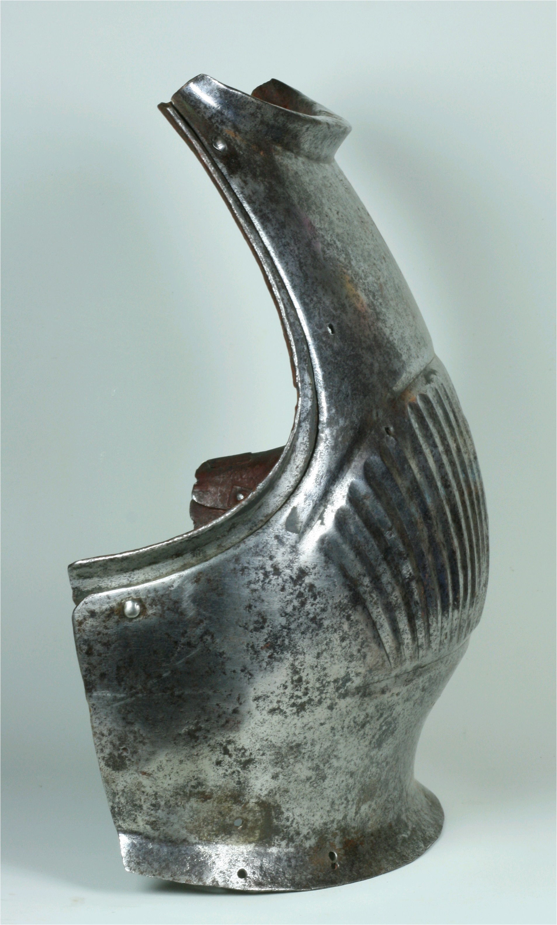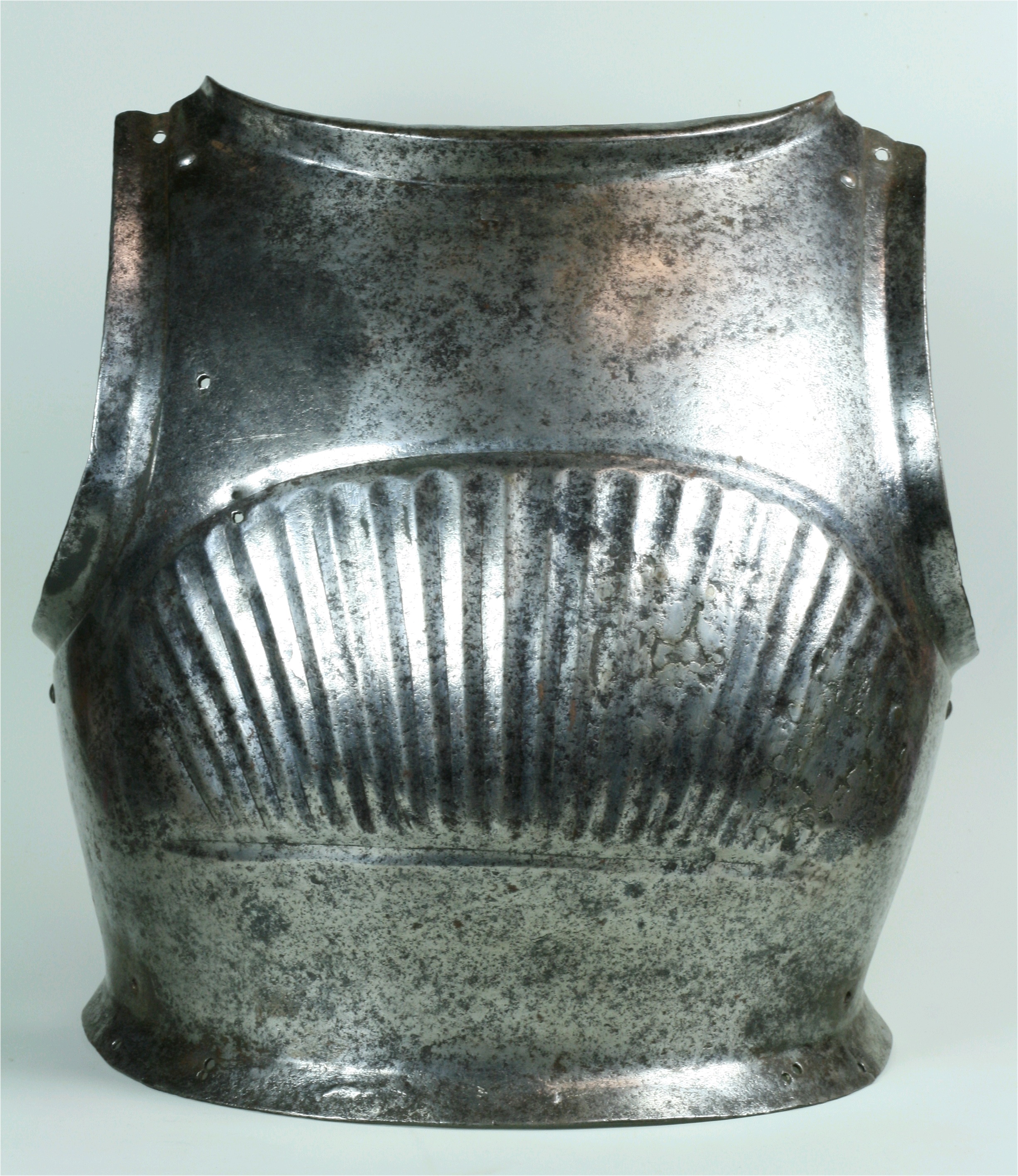 Italian fluted in a German style. Formed with a deep globose shape. Rolled at the neck with a large, angular inward turn. Arm holes bordered by gussets which are formed with a flare with the edge bent back, not a full roll. This style of simplified gusset appears on very late 15th and early 16th c. munition pieces. The waist is flared for a fauld. The center of the breastplate is fluted with a series of parallel vertical flutes terminated by a recessed band at the top and bottom. All of the flutes are accentuated by engraved lines. Marked below the center of the neck hole with a maker's mark - possibly a crowned crossbow bolt. Given the thickness this breastplate was most likely intended for infantry or light cavalry use with later holes for a lance rest. Two later internal patches. Fauld lames missing. Similar breastplates are preserved in the Museo Stibbert Florence (cat. no. 5) which is more complex and has roped rolls, Windsor castle, Mendlesham church in Suffolk, England, the Cleveland Museum of Art (with roped rolls on the gussets, inv. num. 1916.1640), Art Institute of Chicago (part of infantry armor dated 1510-15 inv. 1982.2427b-f) and the Schweizerisches Landesmuseum, Zurich - which is very similar, displayed in the arms drill display with other early 16th c. infantry armour.