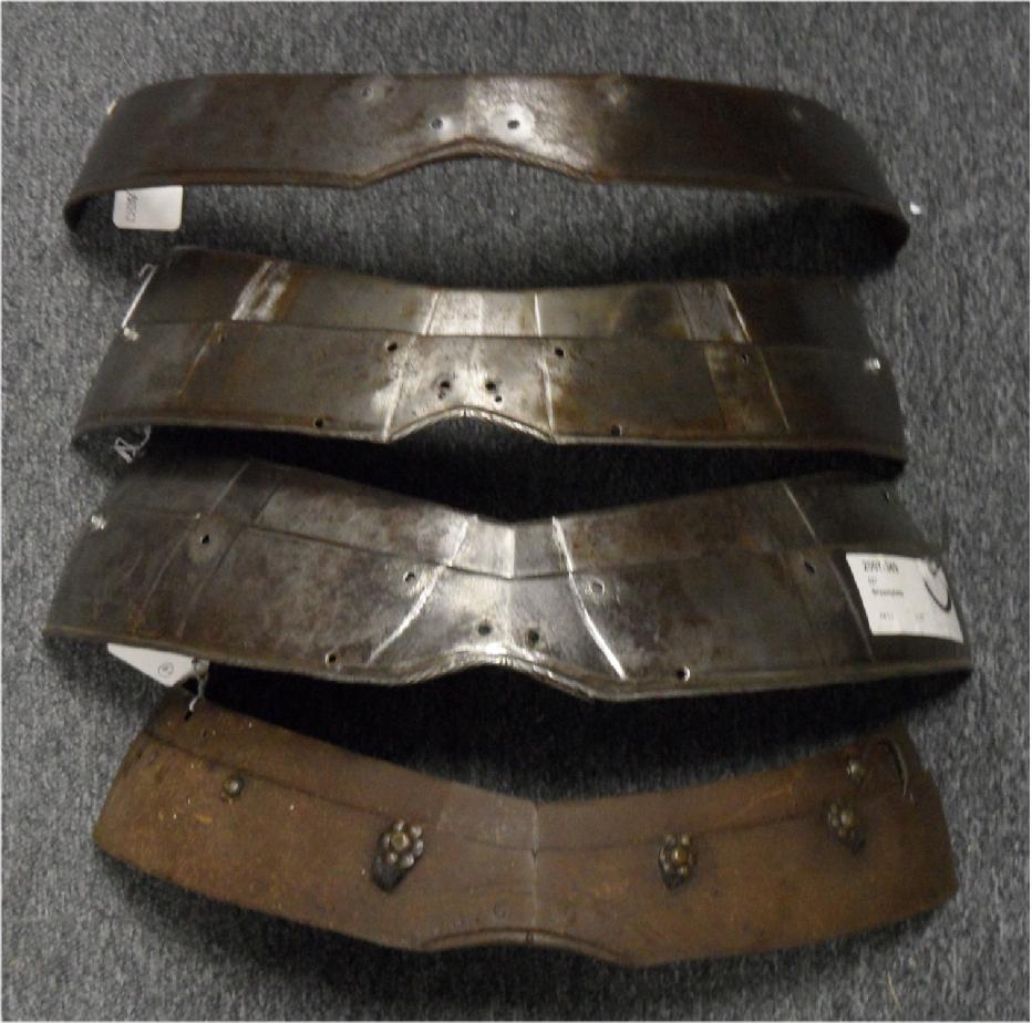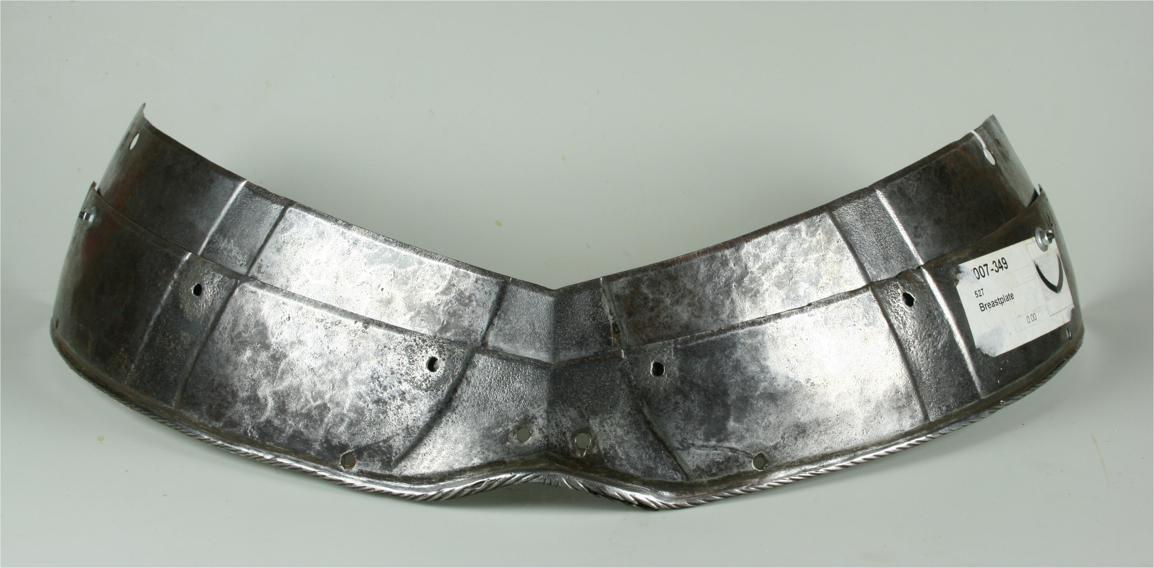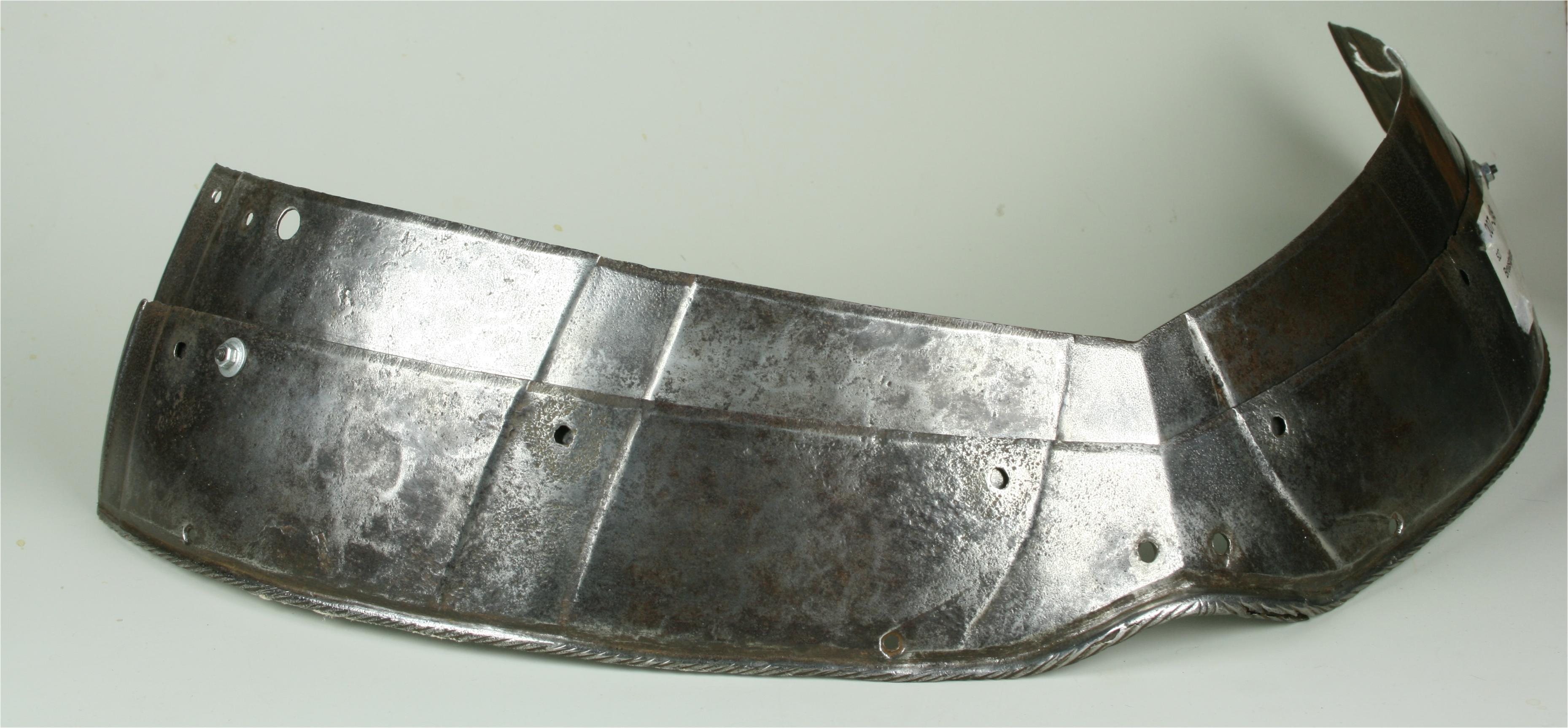 Brunswick. Of two plates. The lower with inward rolled edge at the bottom and rising to a low arch at the center. The plates decorated by recessed polished bands at the center and middle of each side between a raised, rough from the hammer, originally blackened surface. With single holes at the top of the bottom plate to secure tasset leathers and a pair of holes at the center for an internal leather. Ex. Brunswick Ducal Armoury, Wolfenbuttel. Schloss Marienburg.