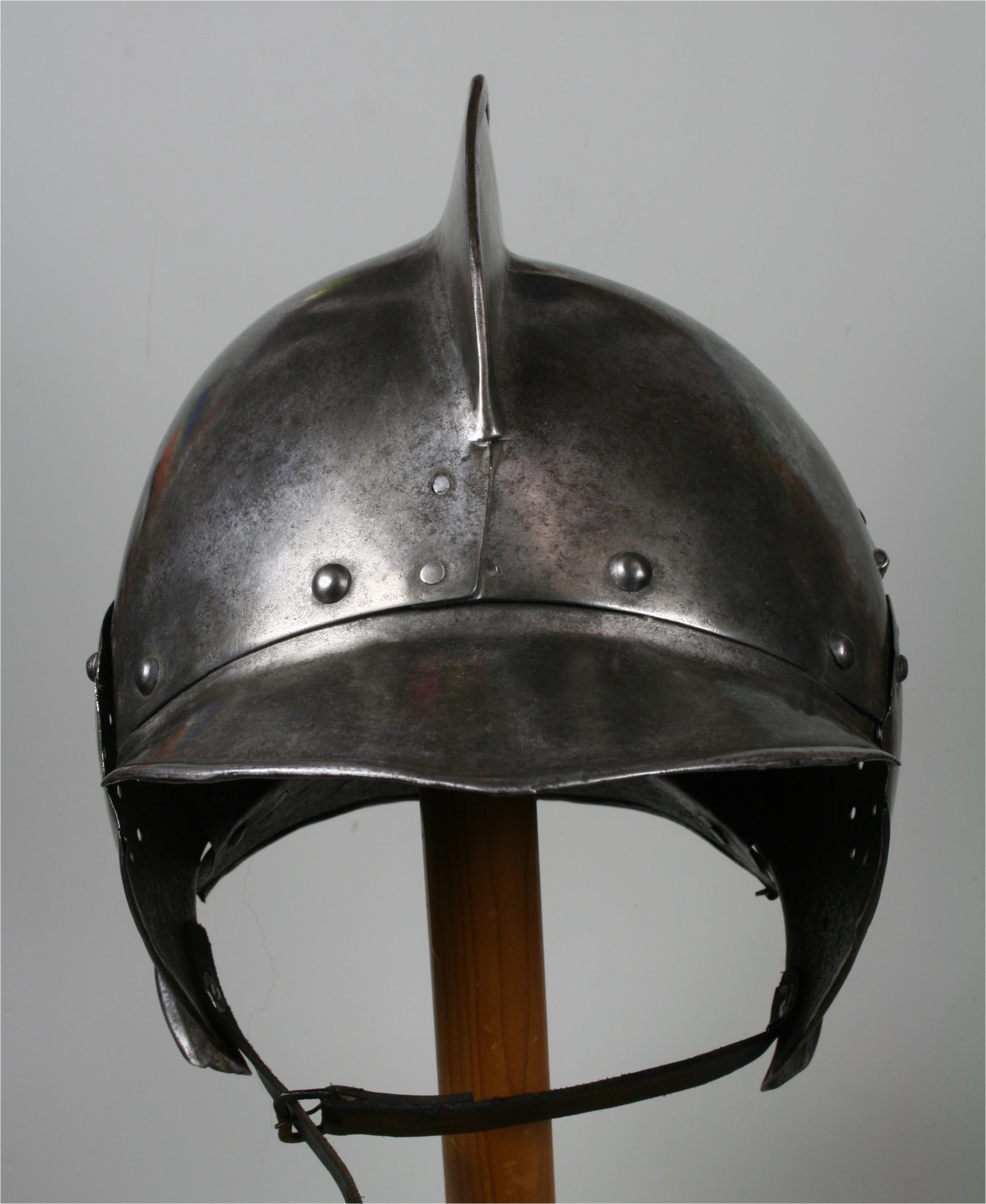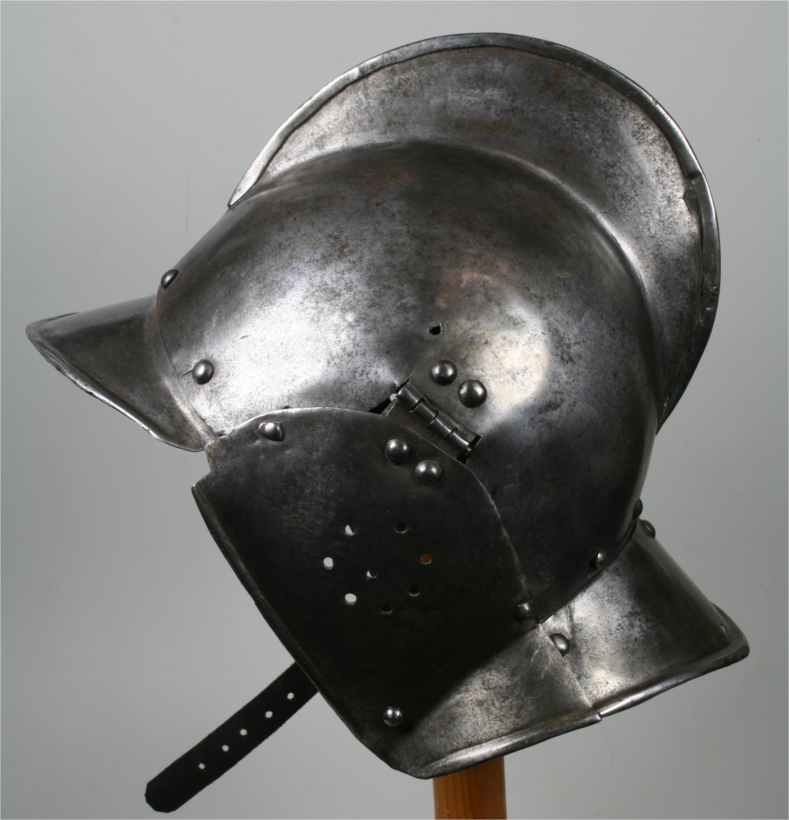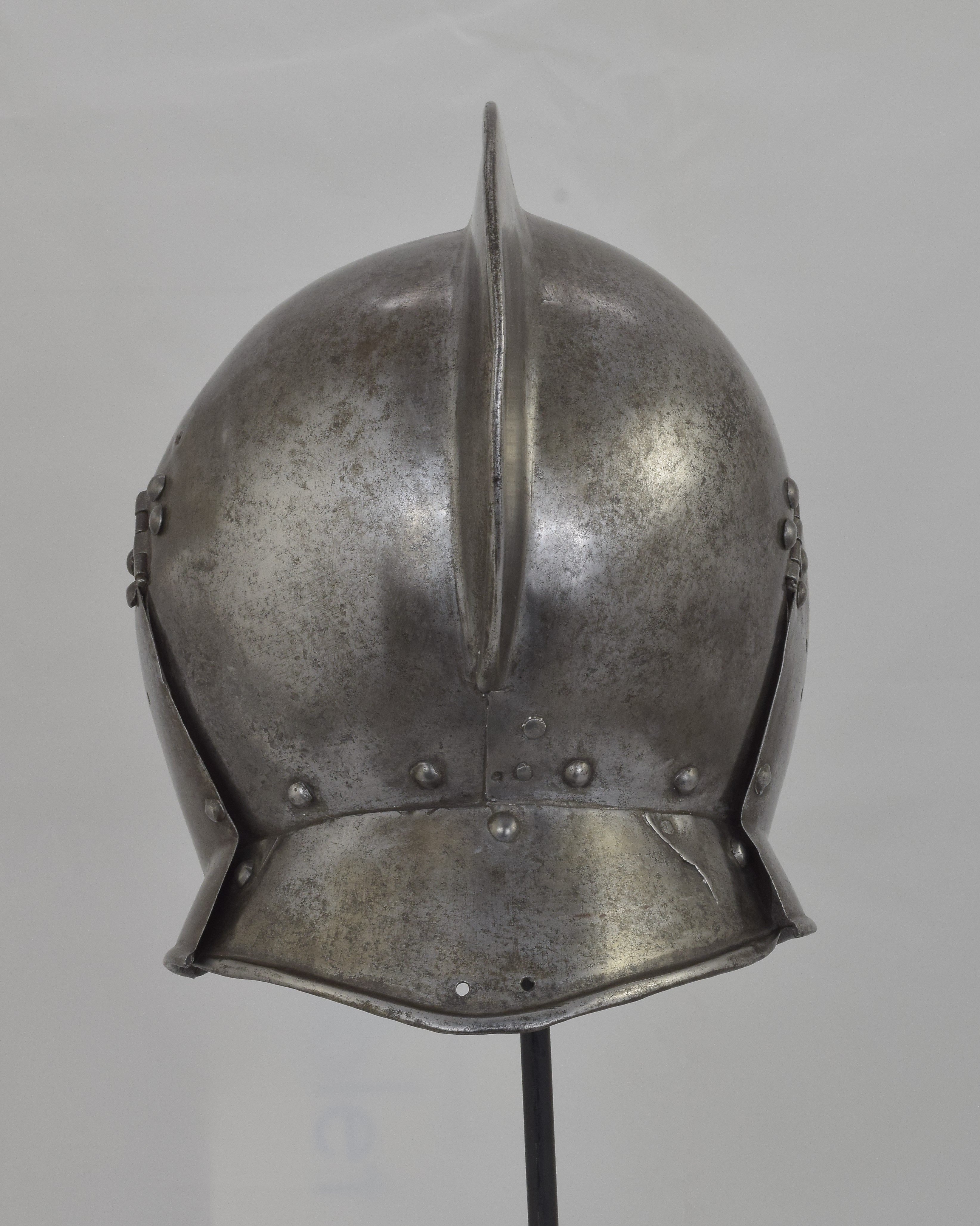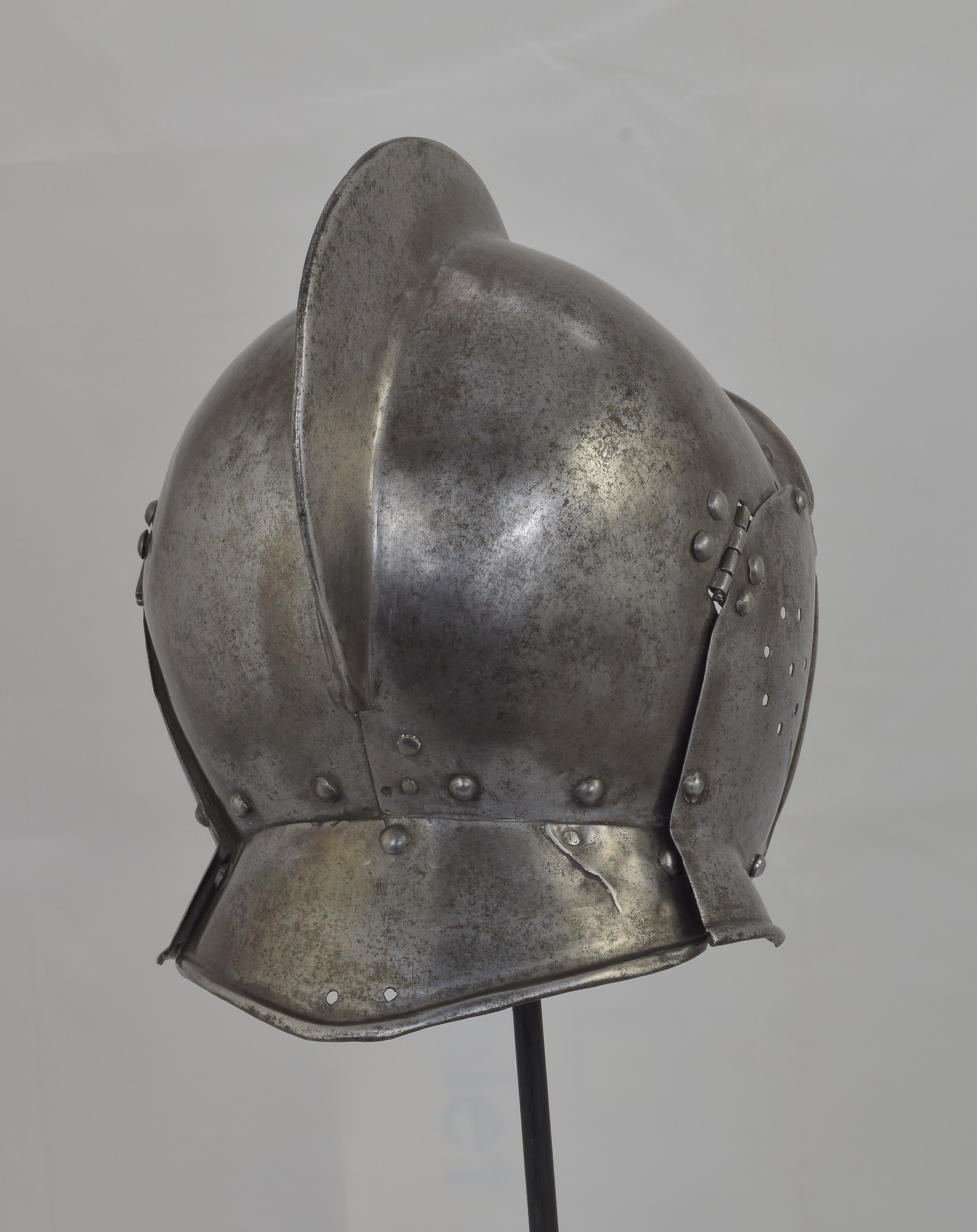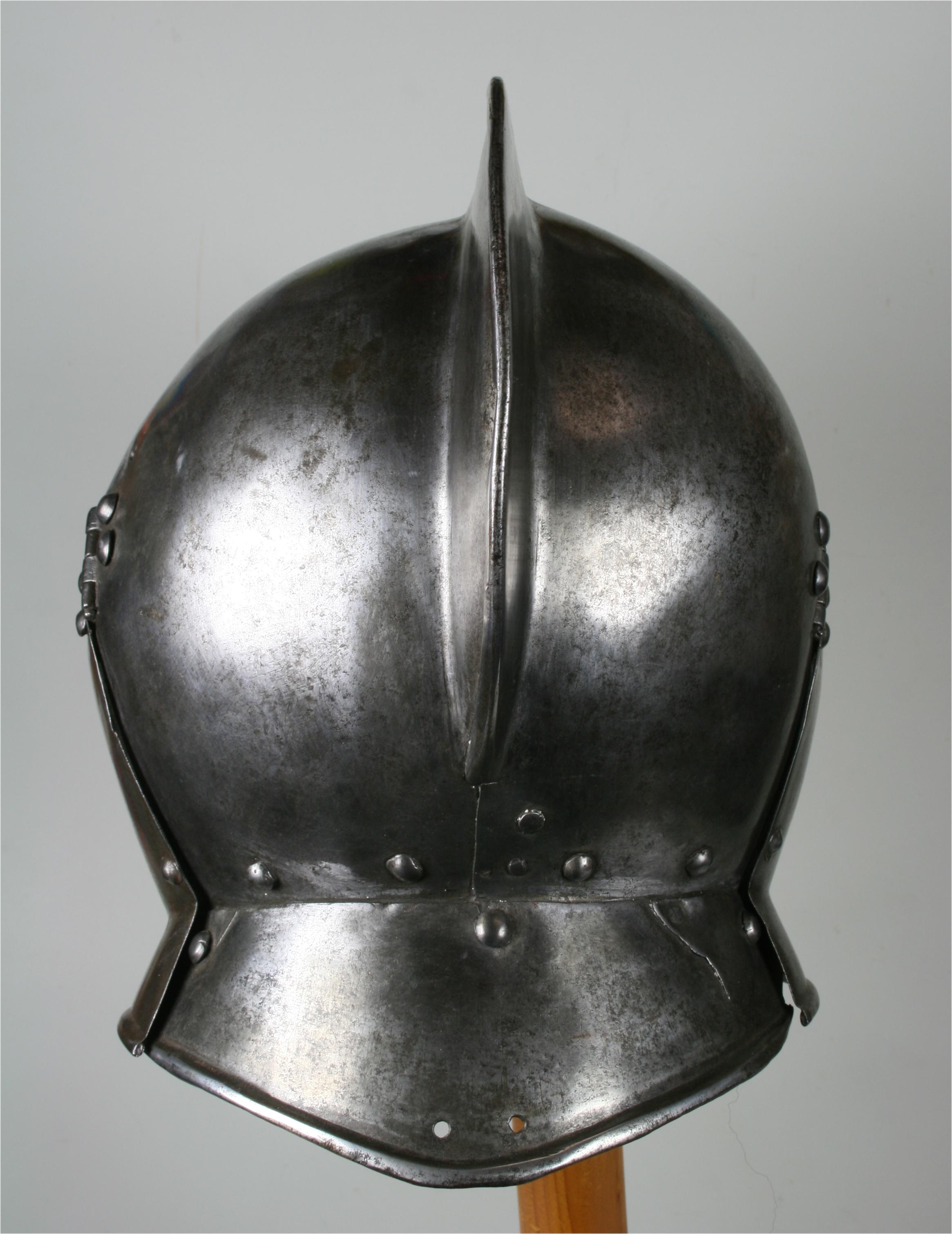German, probably Nuremberg. Rounded skull with tall comb formed of two pieces. The pieces are joined by a flat fold at the top of the comb and flat overlaps in the front and back. Separate brim riveted inside the skull. Separate tail lame attached to the outside of a flare at the back of the skull. Borders of the tail and brim with simple inward turns, the one on the tail rolled around wire. Cheekplates with flared bottom edge following the line of the neck lame. Bottom and front edges with simple inward turns. Cheekplates secured to the skull with internal hinges. This is an interesting example of a relatively degenerate burgonet. Formed of two pieces to simplify construction, separate brim also minimizes metal work and the shape covers somewhat less of the forhead than normal. Even at this level it appears to have been originally ground to a white surface.