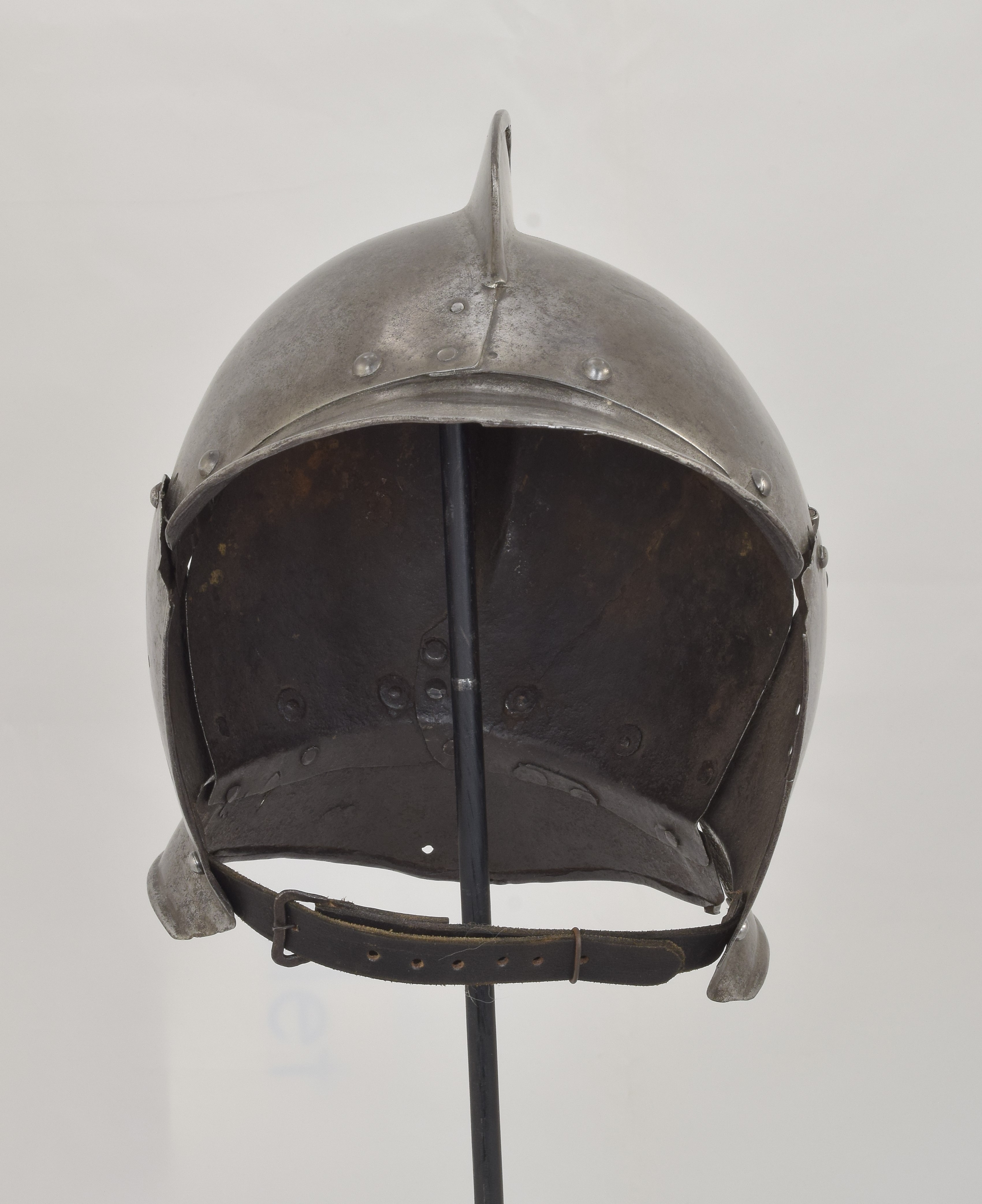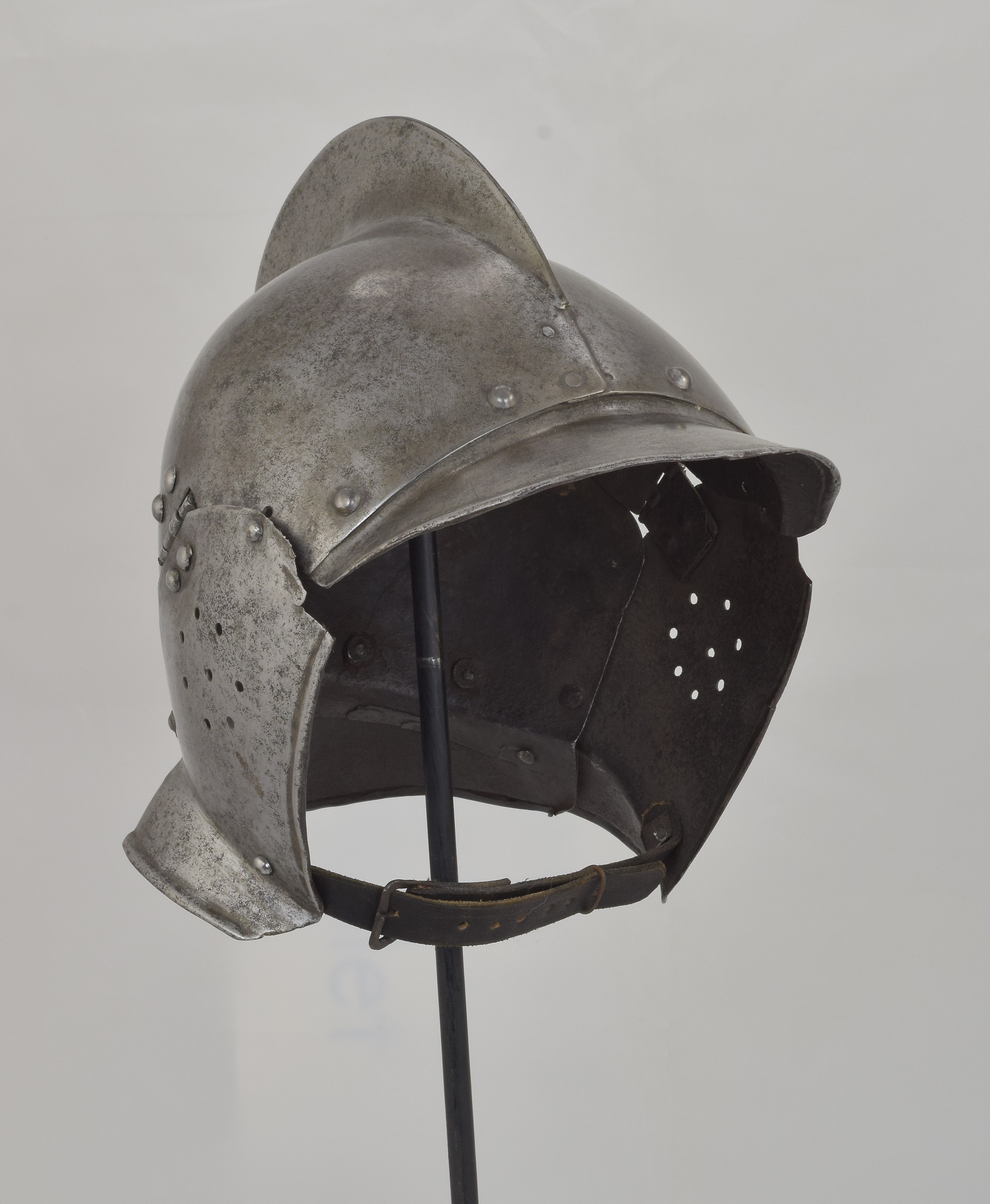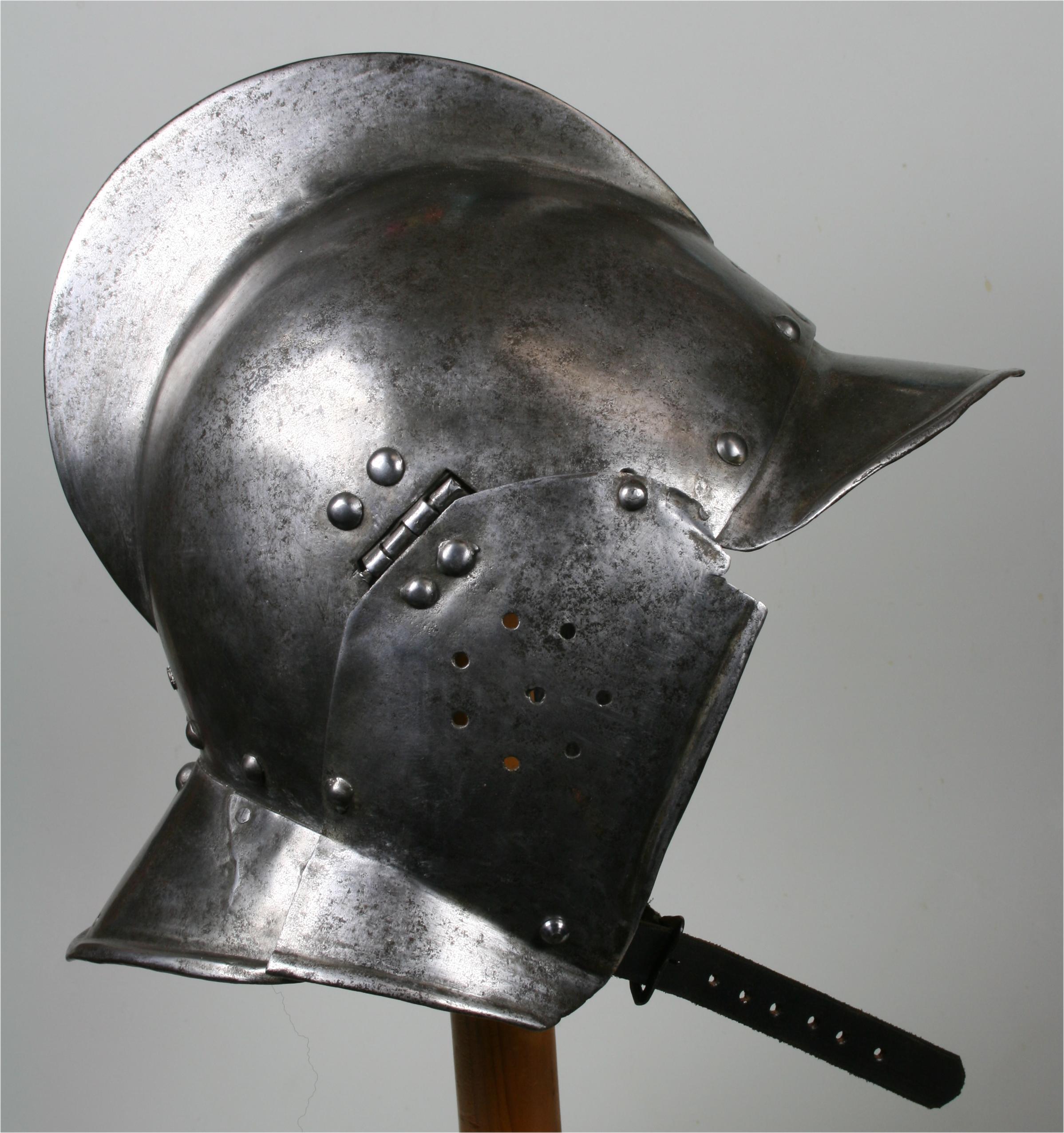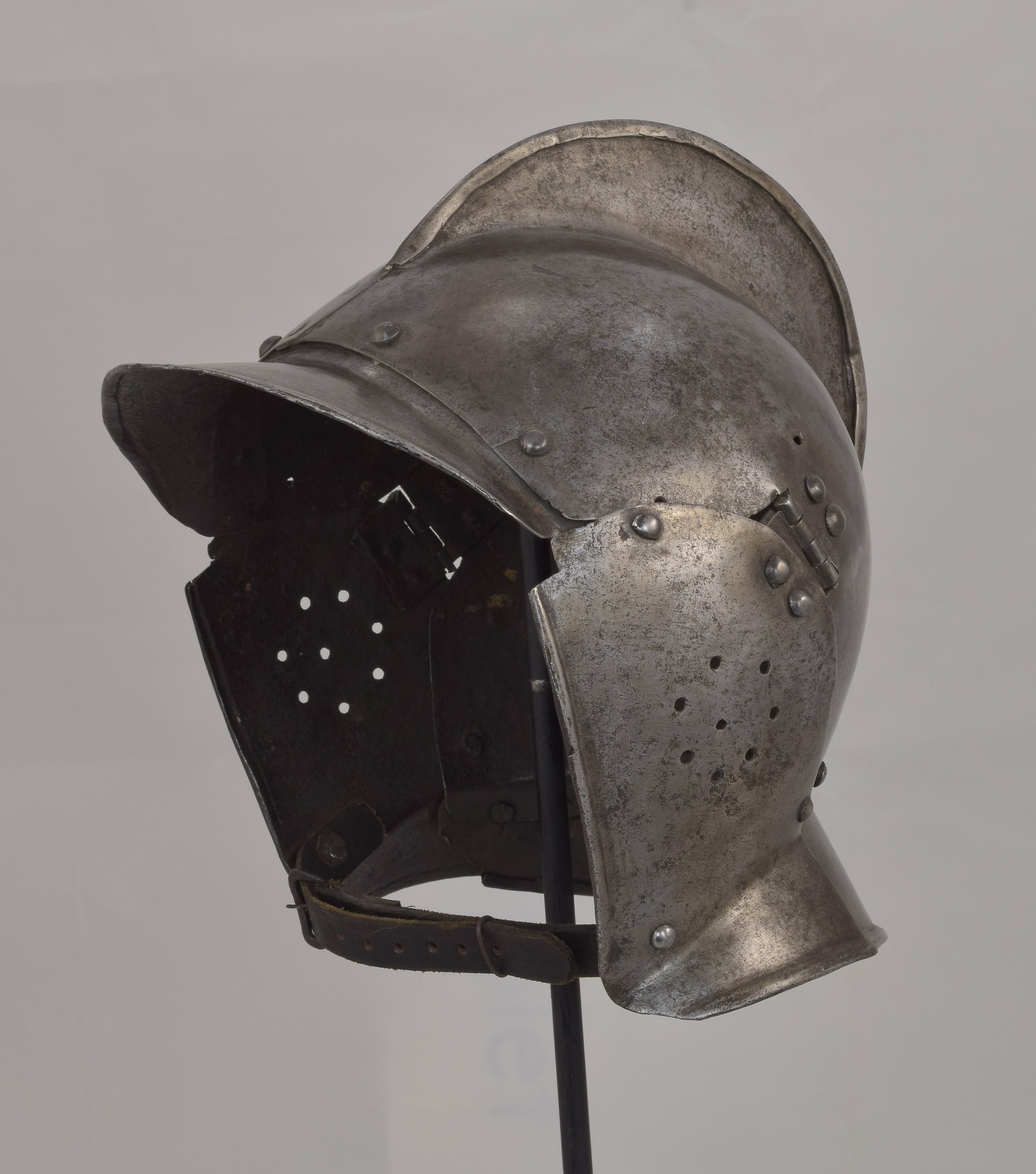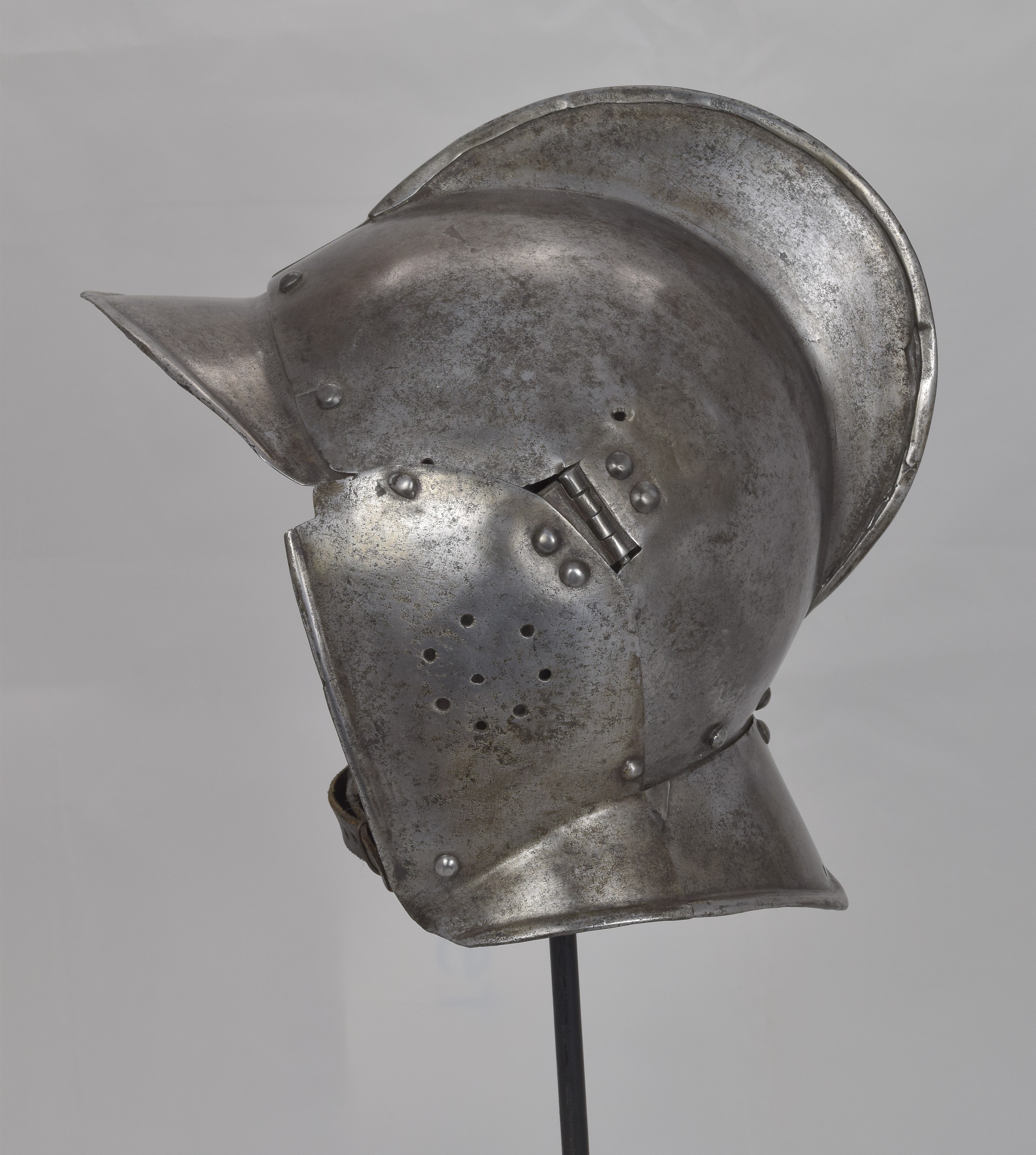 German, probably Nuremberg. Rounded skull with tall comb formed of two pieces. The pieces are joined by a flat fold at the top of the comb and flat overlaps in the front and back. Separate brim riveted inside the skull. Separate tail lame attached to the outside of a flare at the back of the skull. Borders of the tail and brim with simple inward turns, the one on the tail rolled around wire. Cheekplates with flared bottom edge following the line of the neck lame. Bottom and front edges with simple inward turns. Cheekplates secured to the skull with internal hinges. This is an interesting example of a relatively degenerate burgonet. Formed of two pieces to simplify construction, separate brim also minimizes metal work and the shape covers somewhat less of the forhead than normal. Even at this level it appears to have been originally ground to a white surface.