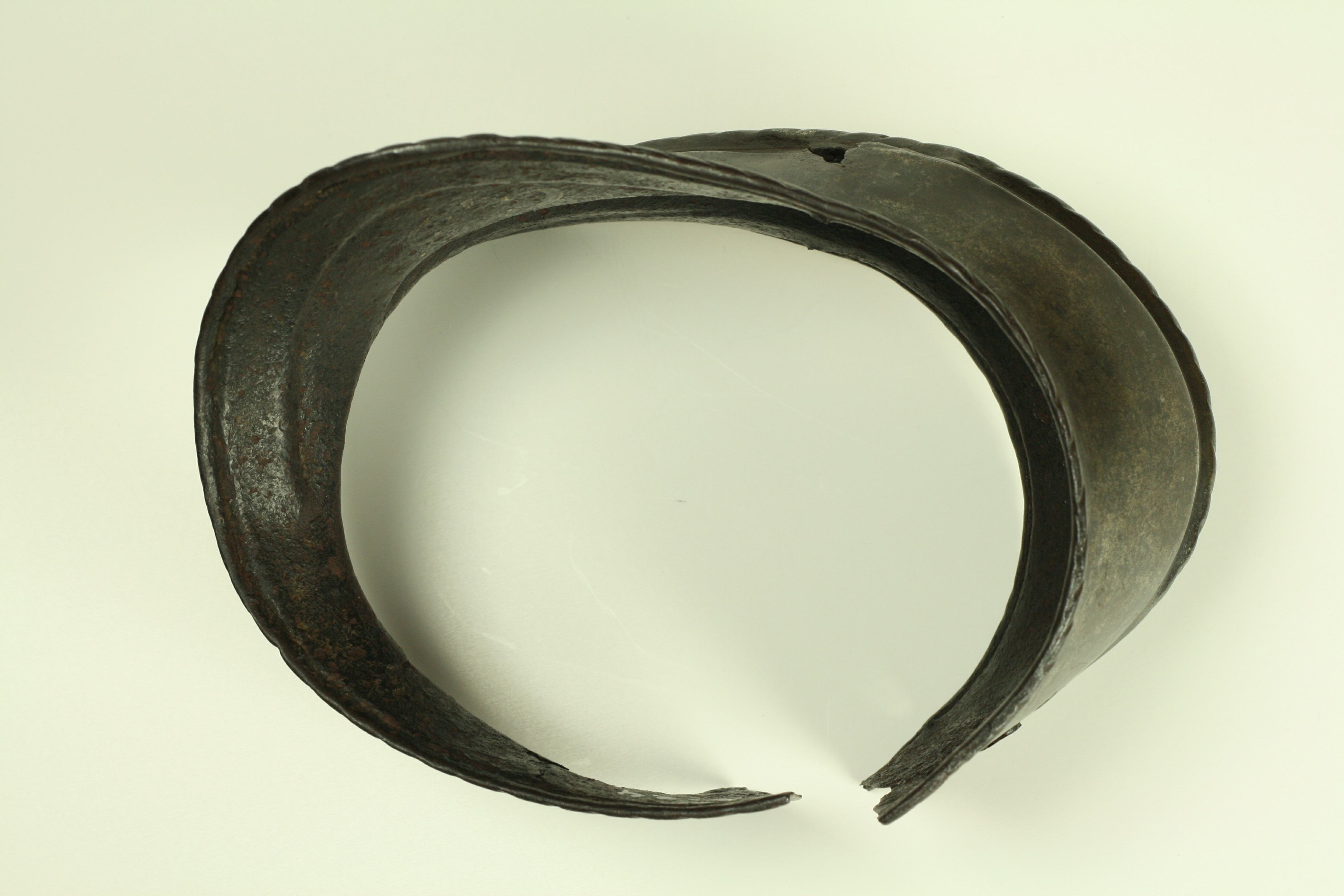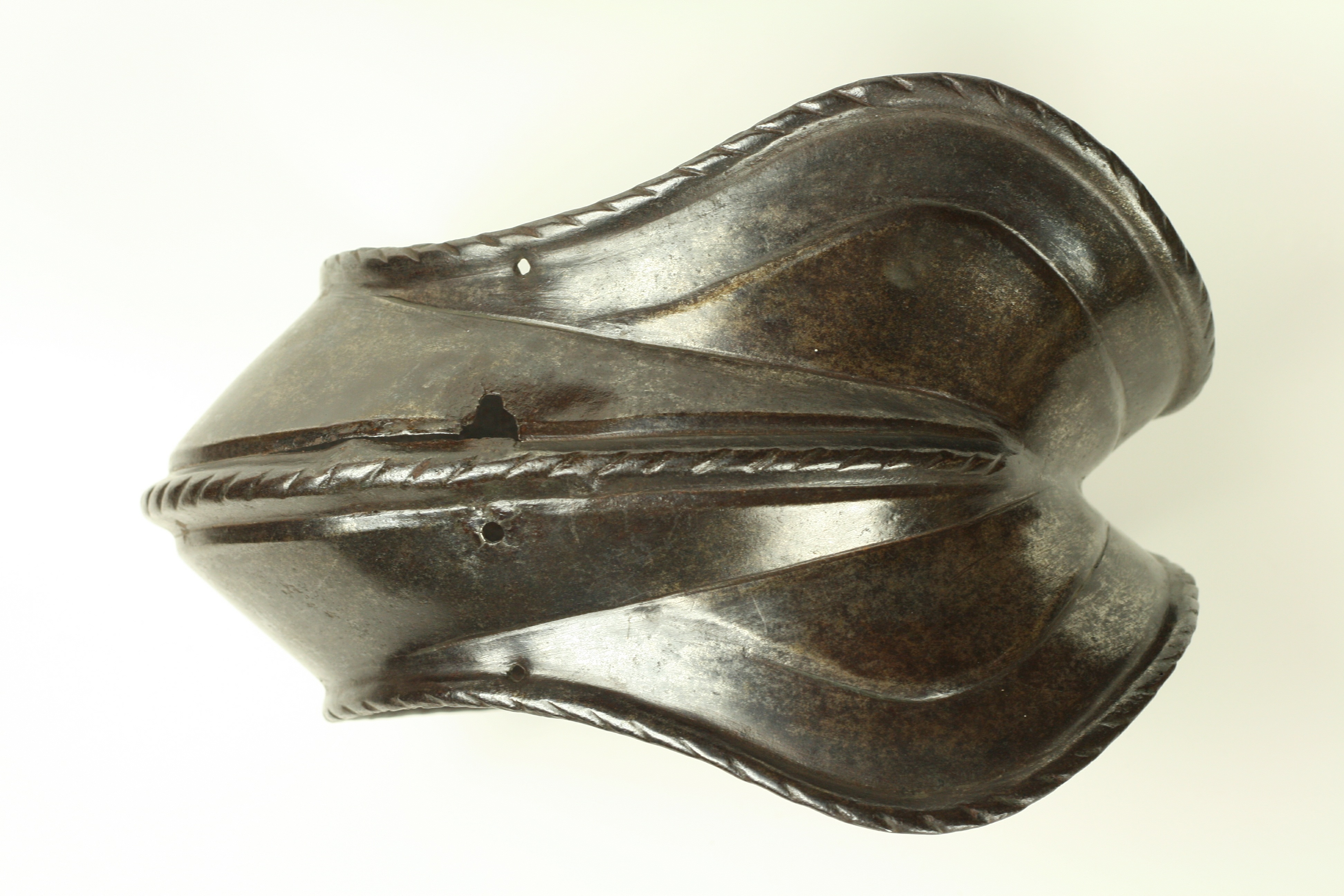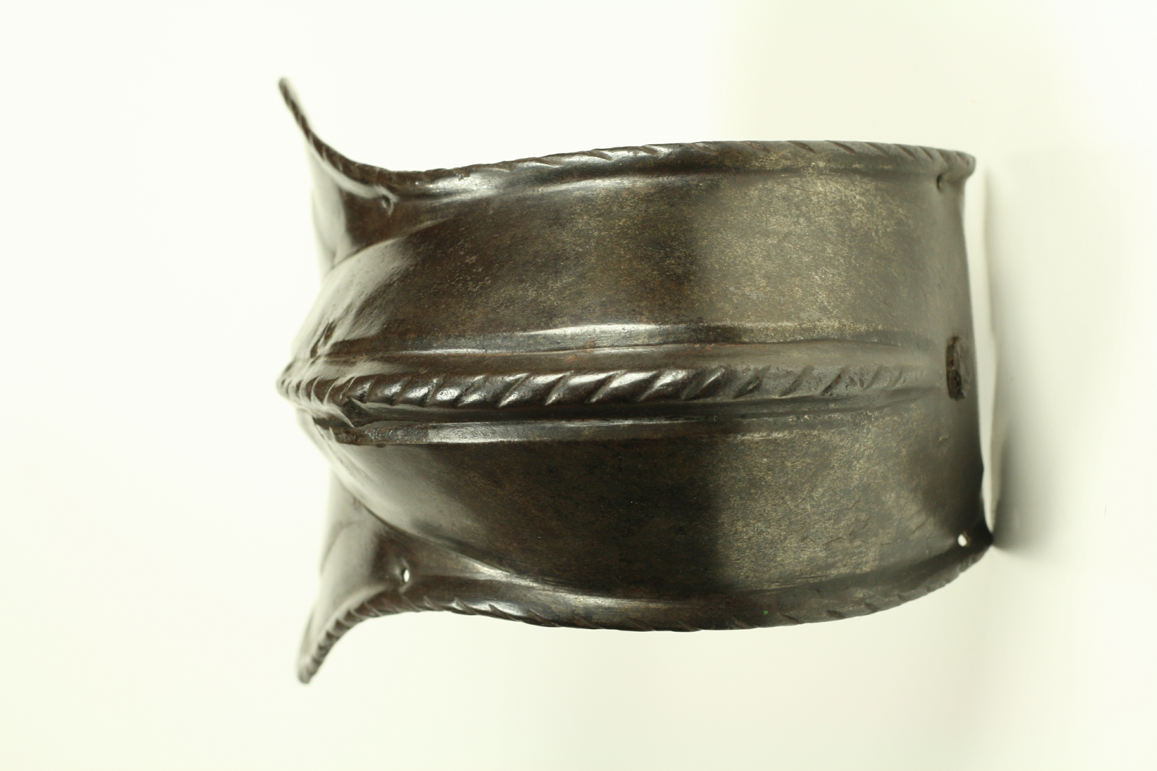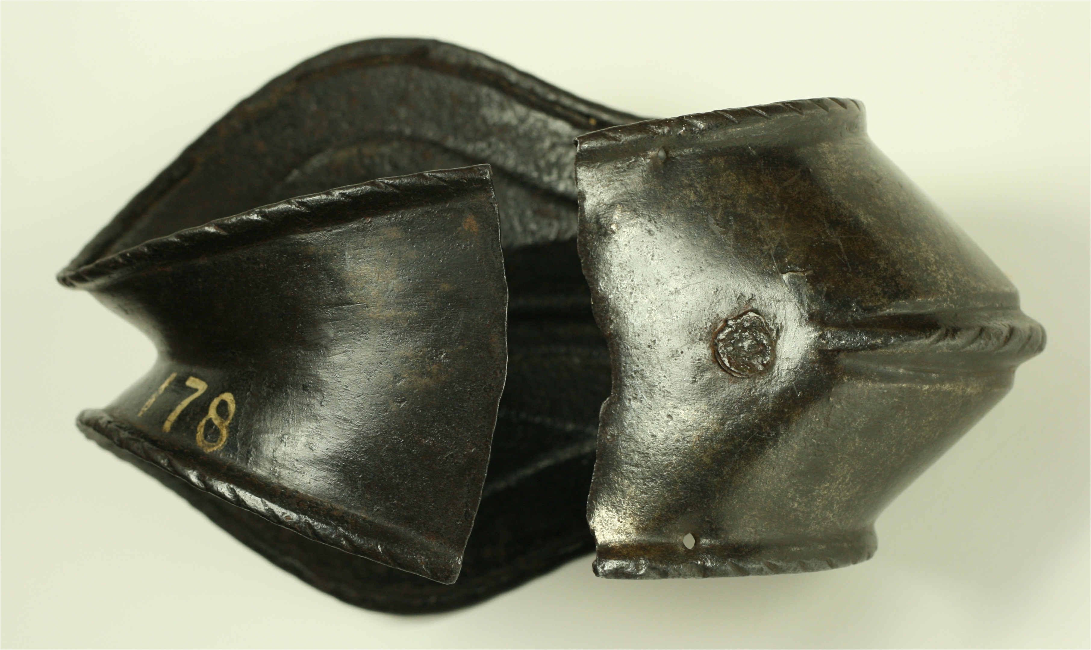 Italian. Of nearly bracelet form. There is a narrow gap of app 1/2 inch between the rear edge of the cop and the wing. The cop is asymetric, being flatter at the back and rising to a peak at the center from slightly behind the point of the elbow through the wing. The wing is slightly larger on one side than the other indicating that this is a right elbow. The outer edges are rolled and roped for their entire length. The roll is bordered by a recessed border on the front portion of the wing. There is a central raised roped band running along most of the raised portion of the cop. There are 2 holes on the front and one at the back for attachment of the cop to the vambrace plates. There is an old collection number in white paint ('178') on the back of the wing. Some delaminations on the inside.