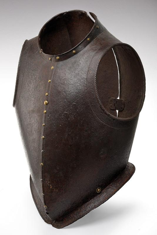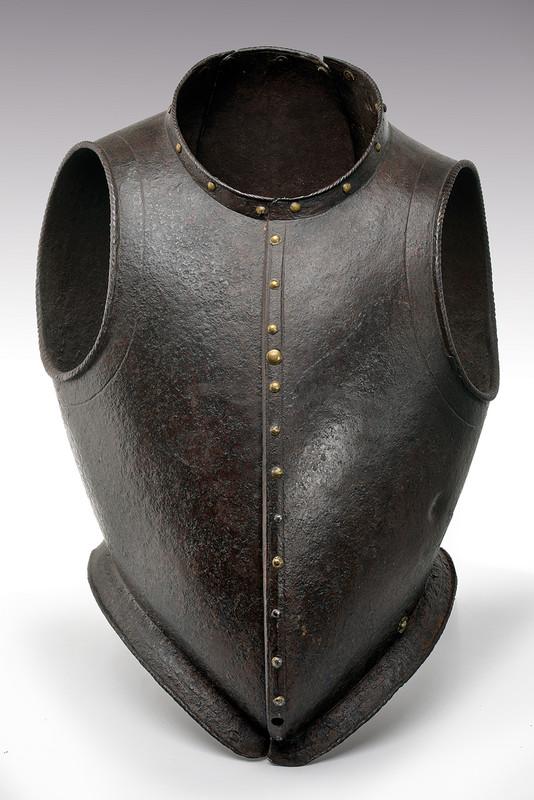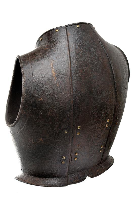 Italian. Full peasscod shape mimicing the doublet of the time. Formed in three pieces, one narrow one down the center of the back and two sides which join at the center of the front. The sections are secured by a pair of interior inset hinges in the lower portion of the back. Arm holes with outward turned roped rolls bordered by an engraved line. Neck and waist edges with inward turned finely roped rolls and bordered by single incised lines. The front is decorated with a series of false buttons formed of iron rivets with brass caps, a few of which have lost their caps. The cuirass is secured closed by means of two threaded studs on the interior plate that engage holes on the outer plate. Currently one of these holes is filled with a modern brass bolt. The top edge is formed into a low straight collar, the bottom edge is flared out below the waist. Shot proof thickness with what appears to be a proof mark on the left side. A nice example of a rare type of body armour. Several defenses of this type (etched) survive in the Wallace collection. There are a few plain ones in the Graz arsenal. These are normally thought of as light civilian armours or decorative, but there are several like this one that are definitely designed for protection against weapons used in warfare.