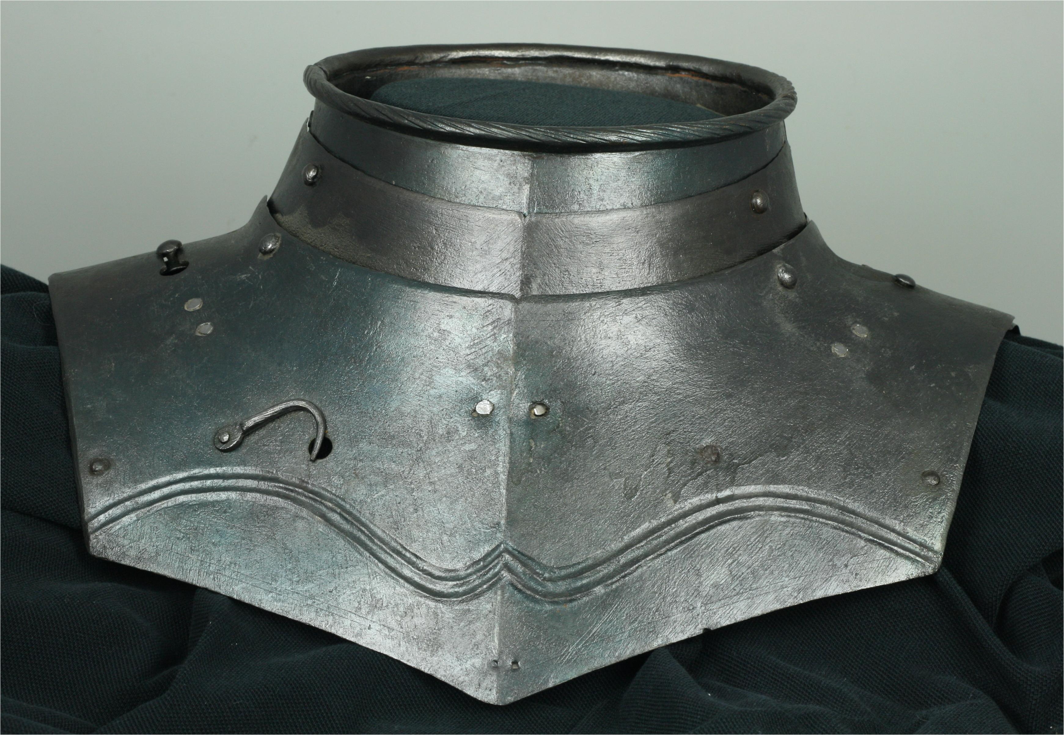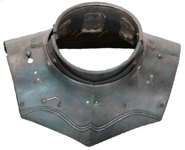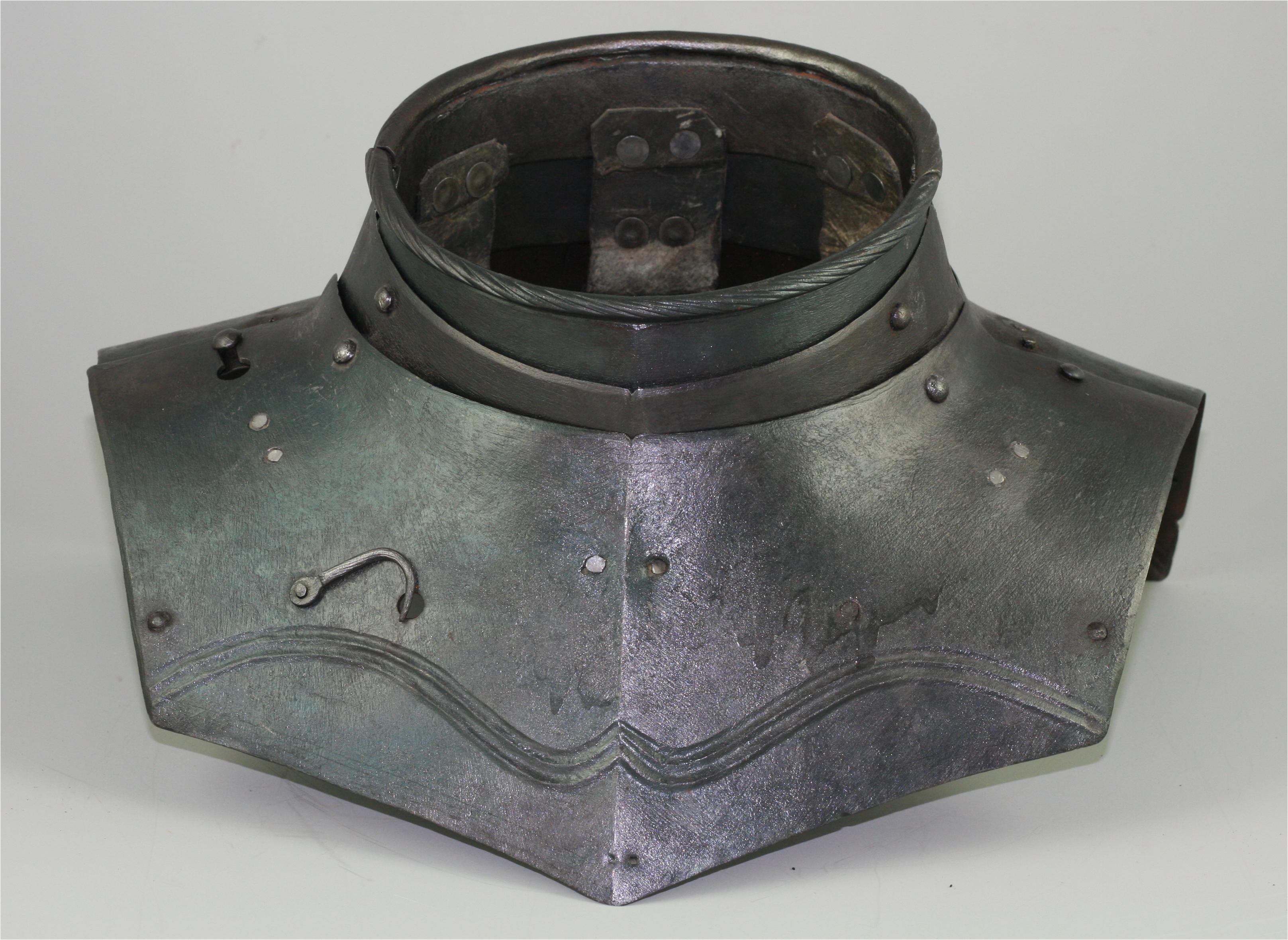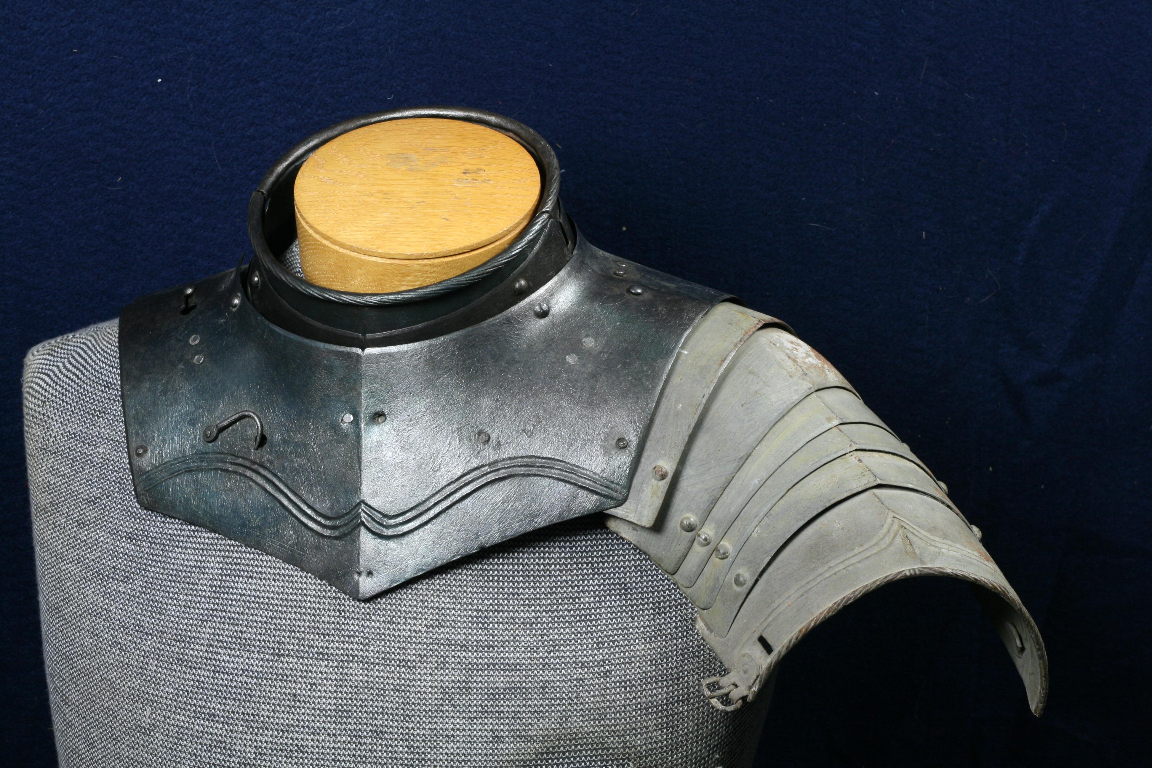 Three plates front and rear. Upper plates with inward turned, roped border at the neck (turn at least somewhat of jelly-roll form and fine very angular roping), secured by an integral hinge on the left and pin on the right (there are two holes on the right side, the top one secured to the rear plate and engaging the hole in the front plate). Main front and rear plates with triple raised lines curving up to a central point. Originally part of an almain collar, right side with a turning hook to secure the leather for the right shoulder. Cleaned and re-blacked. Together with (detached) shoulder defense for the left shoulder of 6 plates. The lower plate with an inward turned ropped roll, buckle and raised flutes ensuite with the main plates. All aparently originally finished bright. Collar cleaned, re-leathered and with modern blackened finish. Shoulder cleaned and preserved but not restored. Remains of old leather at the front and center. The center of the front of the gorget and the shoulder creased, edges beveled and notched at the center. Buckle mounted to the front of the lower shoulder plate with a decorated plate. There is a slot behind the buckle which was probably used to secure the end of the strap. The shoulder plates of typical form - the top plate basically flat, the next dished more than the others, the next 3 lightly dished. The bottom plate slightly dished in the back half. The current shape of the shoulder is curled up due to deformation of the old leathers. This does mean that it illustrates how the arm could bend forward in use. From the Armoury of the Princely House of Hohenlohe-Langenburg, removed from Schloss Langenburg. Painted on the inside of the front and back plates of the gorget with inventory number 444.