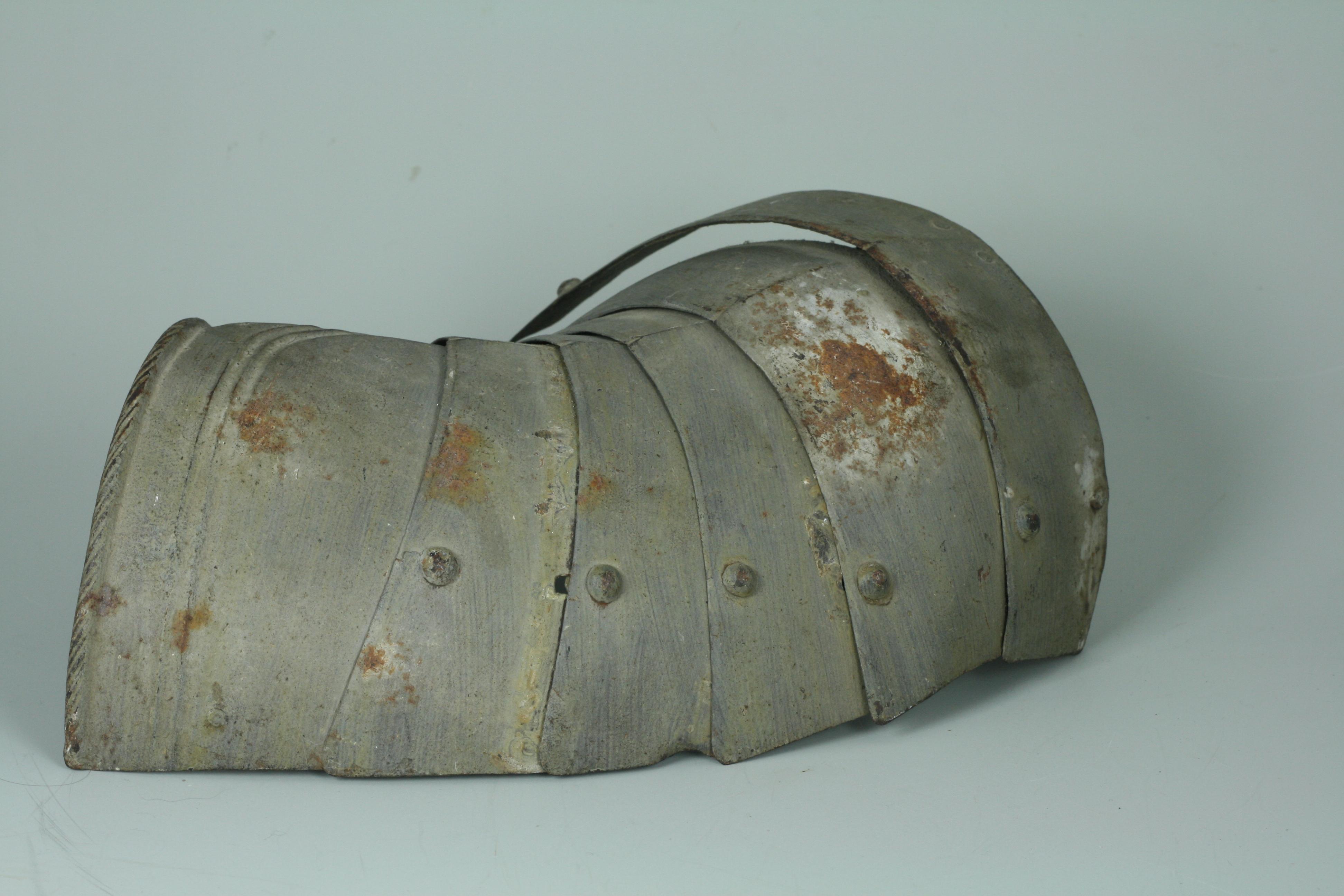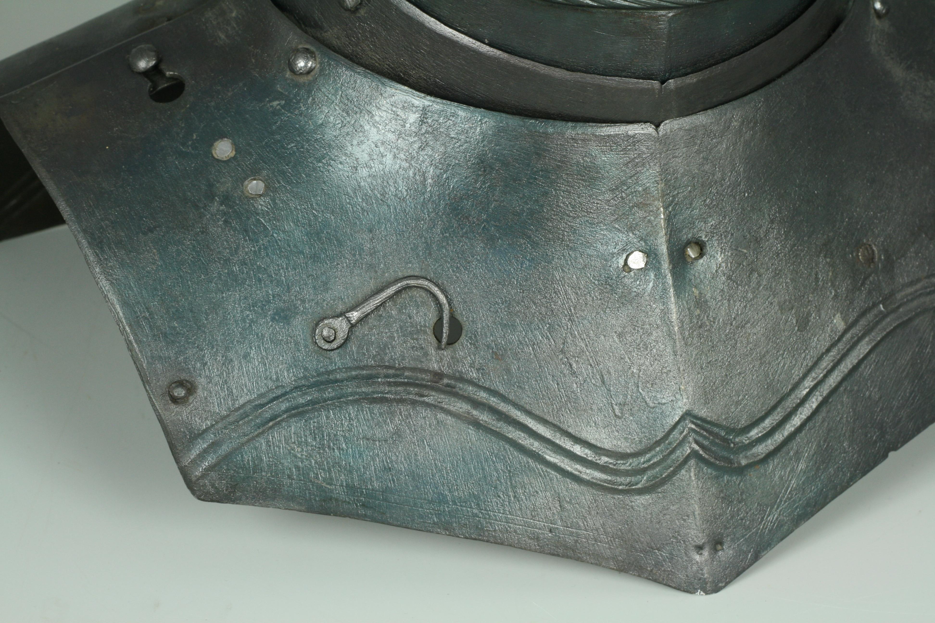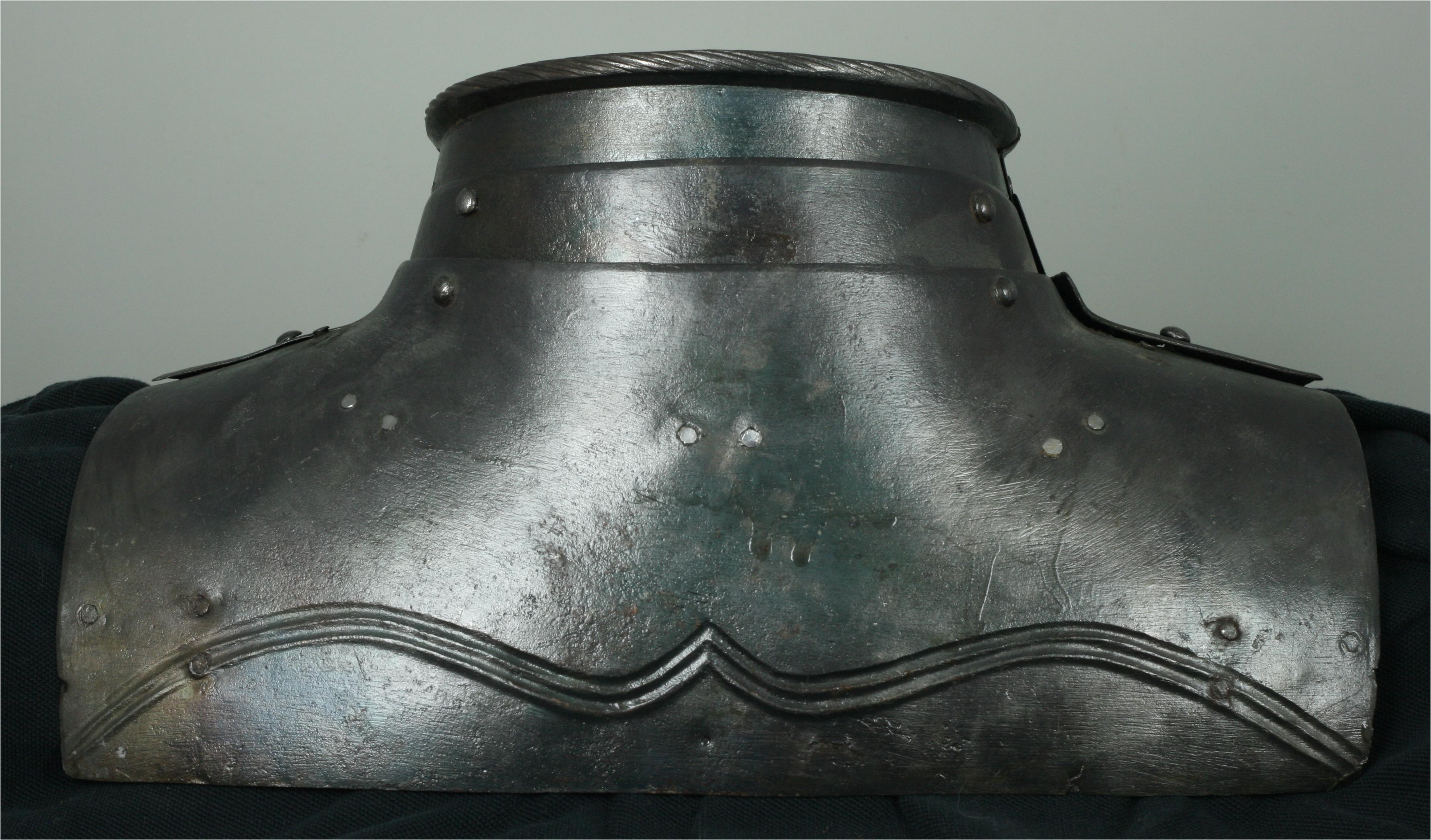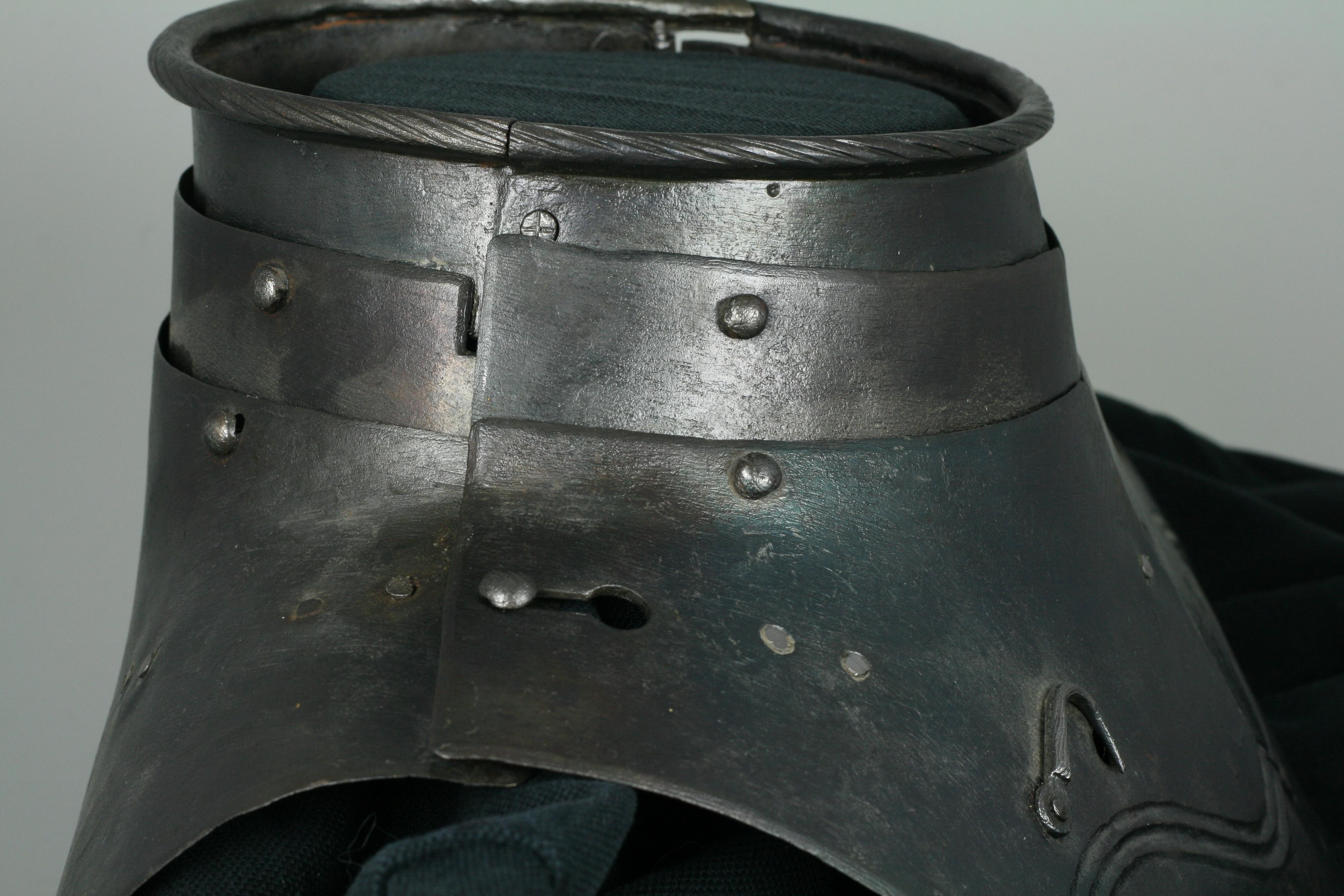 Three plates front and rear. Upper plates with inward turned, roped border at the neck (turn at least somewhat of jelly-roll form and fine very angular roping), secured by an integral hinge on the left and pin on the right (there are two holes on the right side, the top one secured to the rear plate and engaging the hole in the front plate). Main front and rear plates with triple raised lines curving up to a central point. Originally part of an almain collar, right side with a turning hook to secure the leather for the right shoulder. Cleaned and re-blacked. Together with (detached) shoulder defense for the left shoulder of 6 plates. The lower plate with an inward turned ropped roll, buckle and raised flutes ensuite with the main plates. All aparently originally finished bright. Collar cleaned, re-leathered and with modern blackened finish. Shoulder cleaned and preserved but not restored. Remains of old leather at the front and center. The center of the front of the gorget and the shoulder creased, edges beveled and notched at the center. Buckle mounted to the front of the lower shoulder plate with a decorated plate. There is a slot behind the buckle which was probably used to secure the end of the strap. The shoulder plates of typical form - the top plate basically flat, the next dished more than the others, the next 3 lightly dished. The bottom plate slightly dished in the back half. The current shape of the shoulder is curled up due to deformation of the old leathers. This does mean that it illustrates how the arm could bend forward in use. From the Armoury of the Princely House of Hohenlohe-Langenburg, removed from Schloss Langenburg. Painted on the inside of the front and back plates of the gorget with inventory number 444.