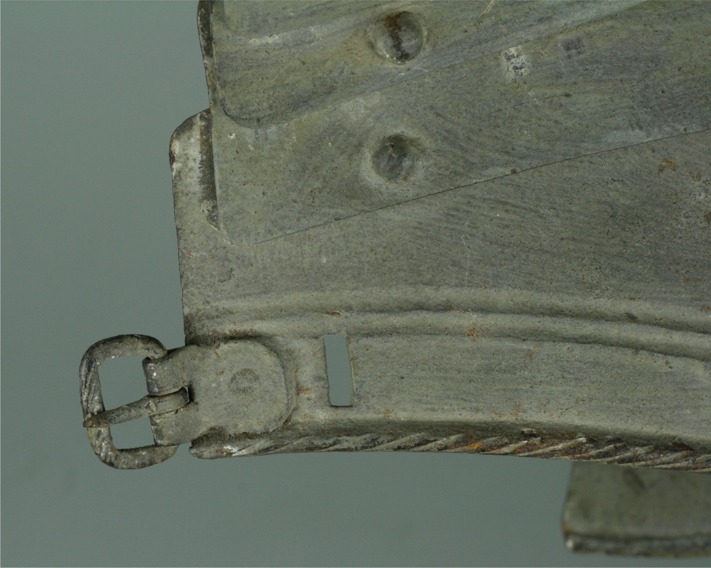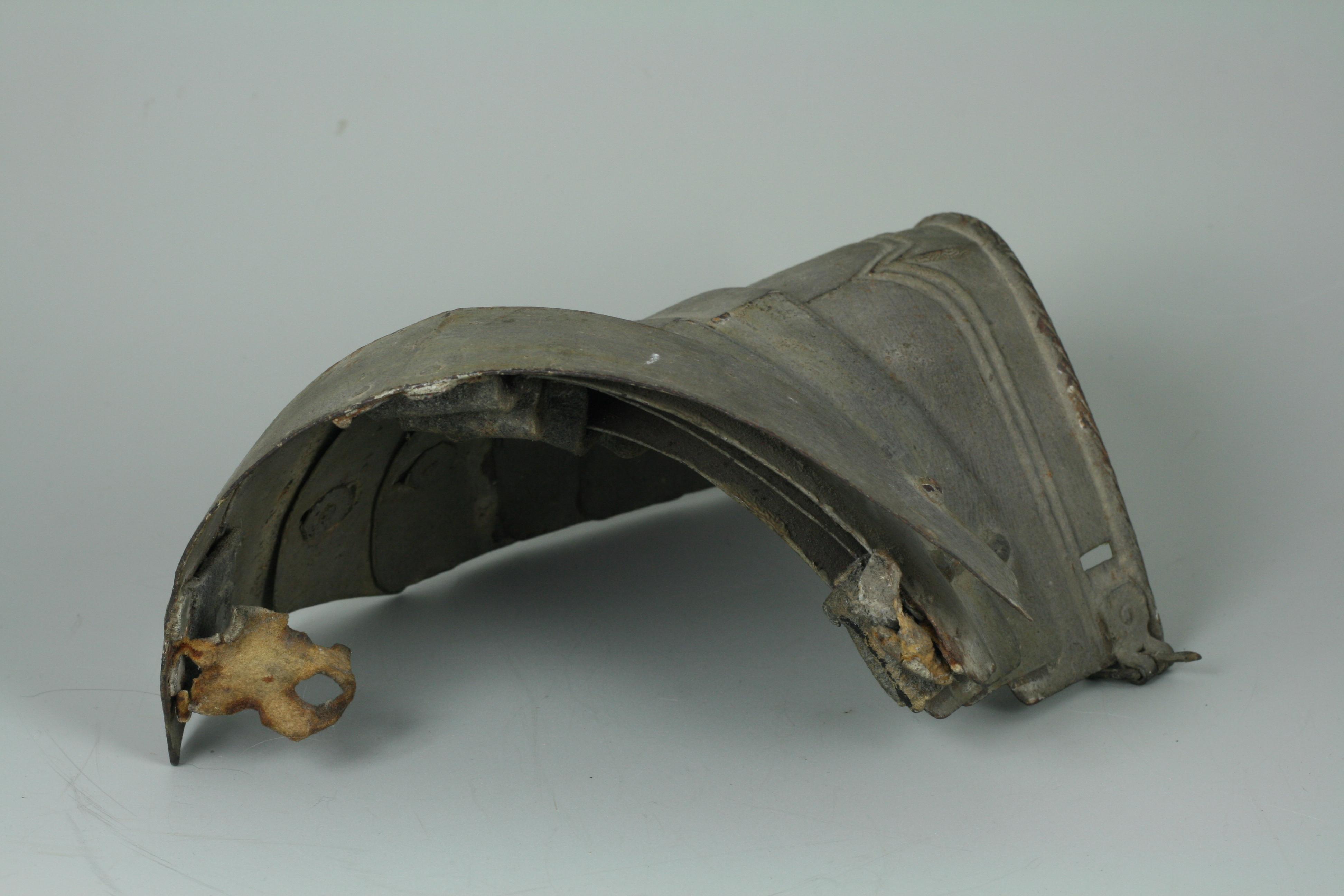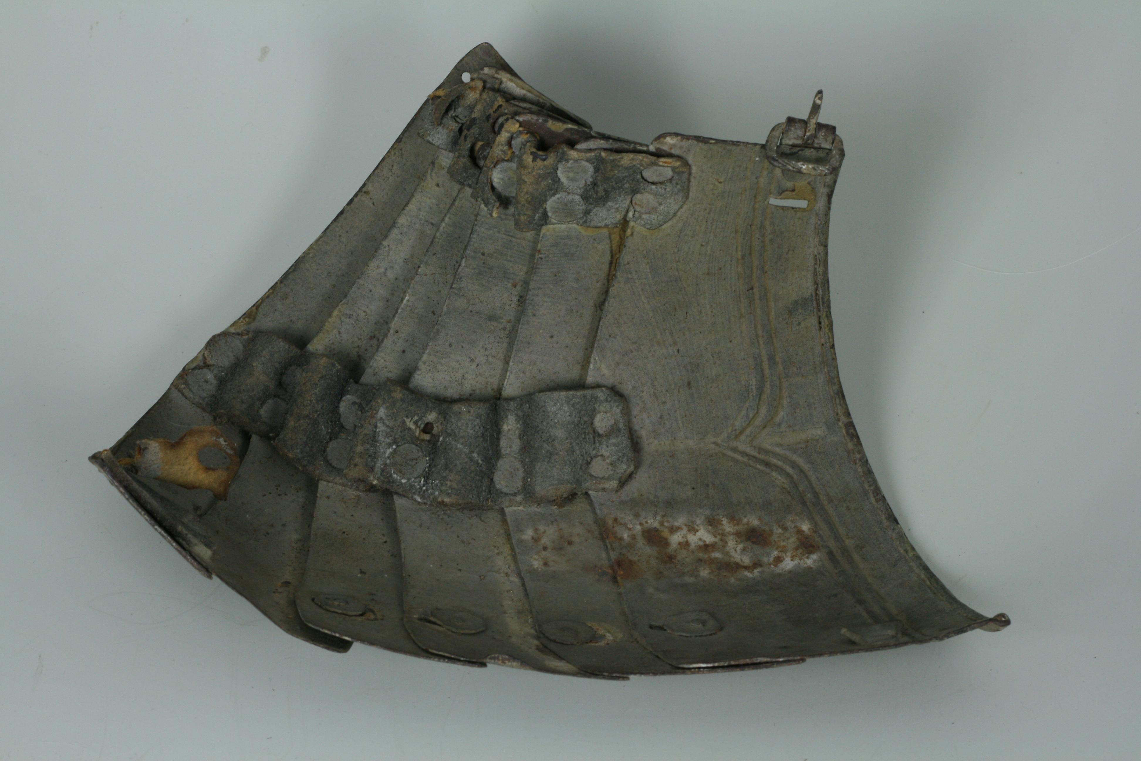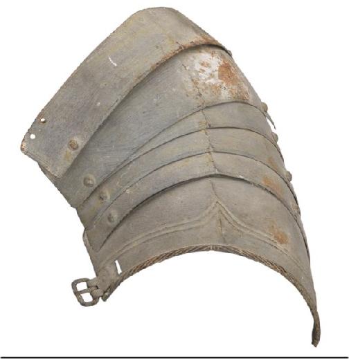 Three plates front and rear. Upper plates with inward turned, roped border at the neck (turn at least somewhat of jelly-roll form and fine very angular roping), secured by an integral hinge on the left and pin on the right (there are two holes on the right side, the top one secured to the rear plate and engaging the hole in the front plate). Main front and rear plates with triple raised lines curving up to a central point. Originally part of an almain collar, right side with a turning hook to secure the leather for the right shoulder. Cleaned and re-blacked. Together with (detached) shoulder defense for the left shoulder of 6 plates. The lower plate with an inward turned ropped roll, buckle and raised flutes ensuite with the main plates. All aparently originally finished bright. Collar cleaned, re-leathered and with modern blackened finish. Shoulder cleaned and preserved but not restored. Remains of old leather at the front and center. The center of the front of the gorget and the shoulder creased, edges beveled and notched at the center. Buckle mounted to the front of the lower shoulder plate with a decorated plate. There is a slot behind the buckle which was probably used to secure the end of the strap. The shoulder plates of typical form - the top plate basically flat, the next dished more than the others, the next 3 lightly dished. The bottom plate slightly dished in the back half. The current shape of the shoulder is curled up due to deformation of the old leathers. This does mean that it illustrates how the arm could bend forward in use. From the Armoury of the Princely House of Hohenlohe-Langenburg, removed from Schloss Langenburg. Painted on the inside of the front and back plates of the gorget with inventory number 444.