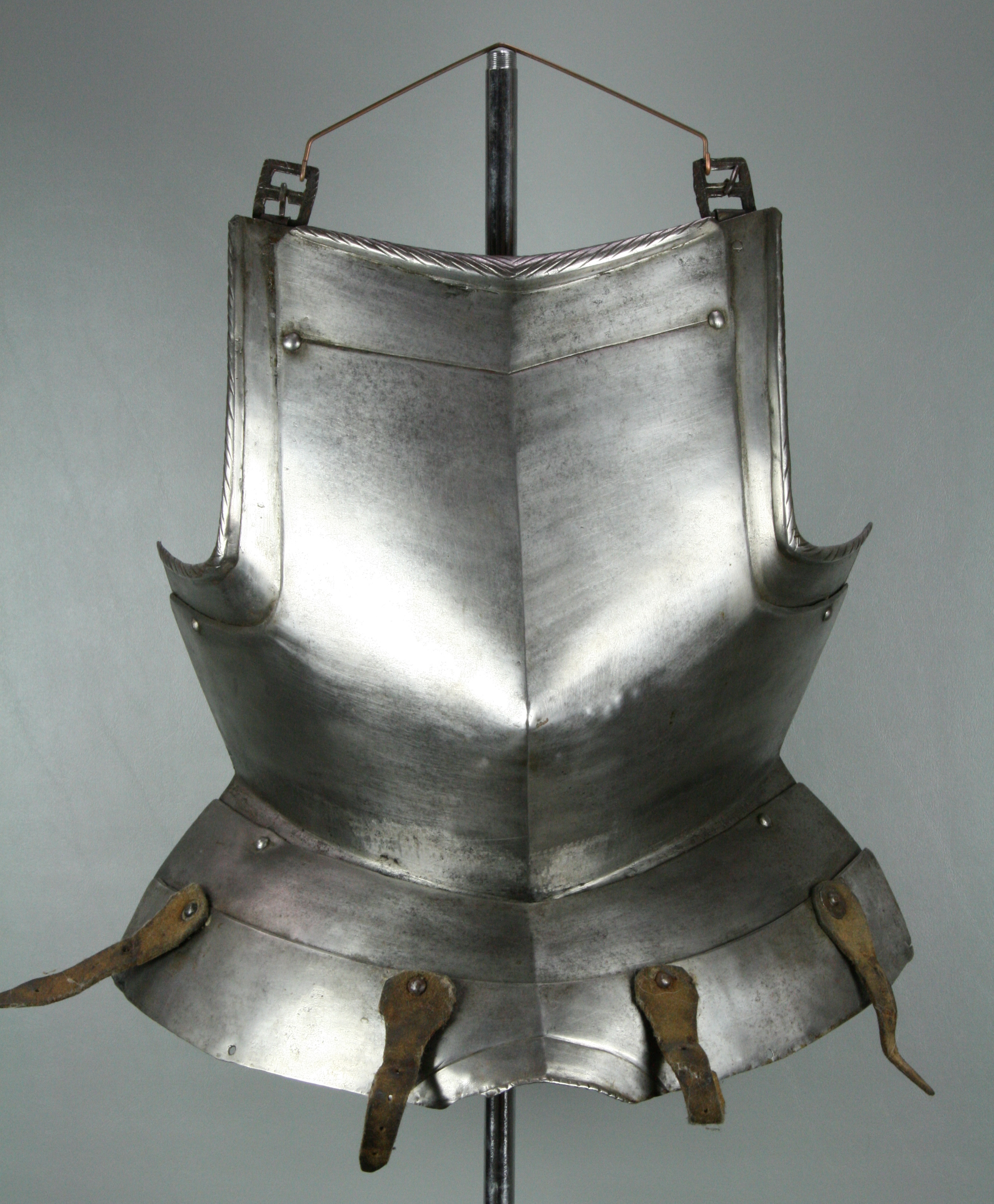 German. White. With a central crease and drawn out to a point below the center. The neck with a tapered inward turned roped roll. The arms fitted with gussets with inward turned tapered rolls. All rolls with matching roped decoration. Retains fauld of 2 plates which would extend out in the center over the crotch, forming a simplified version of the faulds where the center of the bottom lame is pushed out over the cod piece. Lower plate with 2 (probably later, but possibly working life) leather straps which may be buff for the suspension of tassets. Gussets with buckles for the shoulder straps. Interior of both fauld lames and left gusset marked with a single punch mark that appears to be the assembly mark.