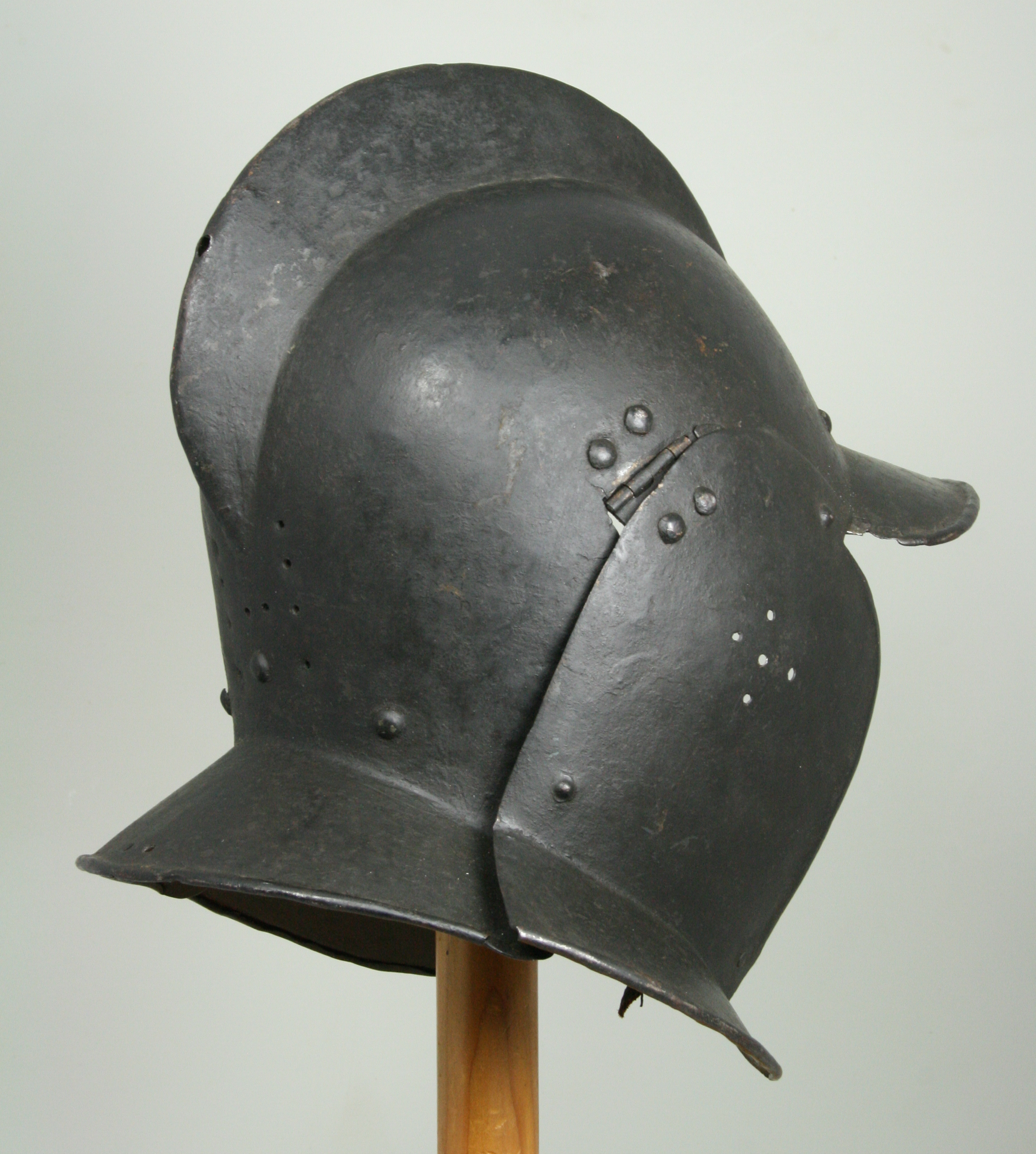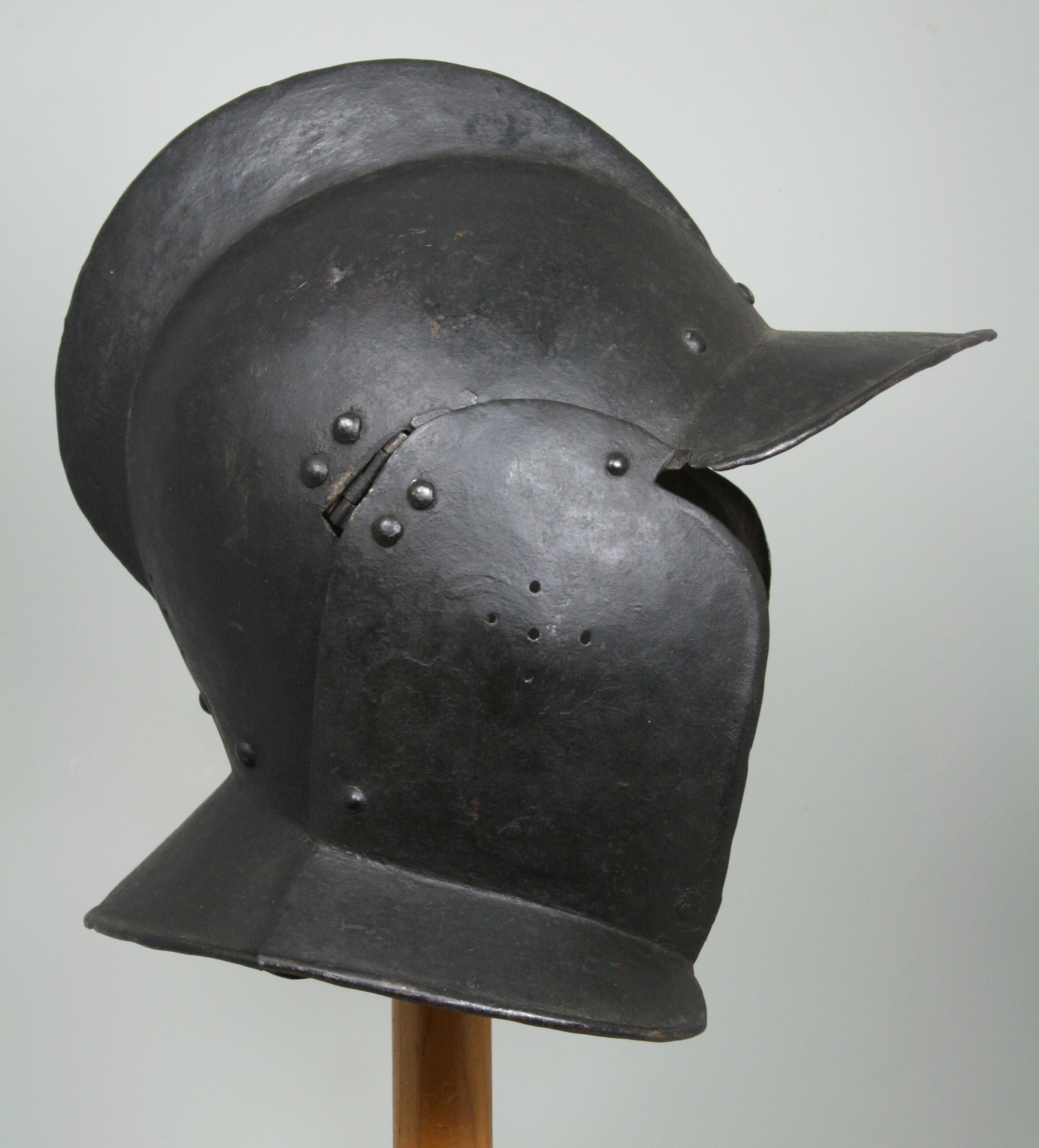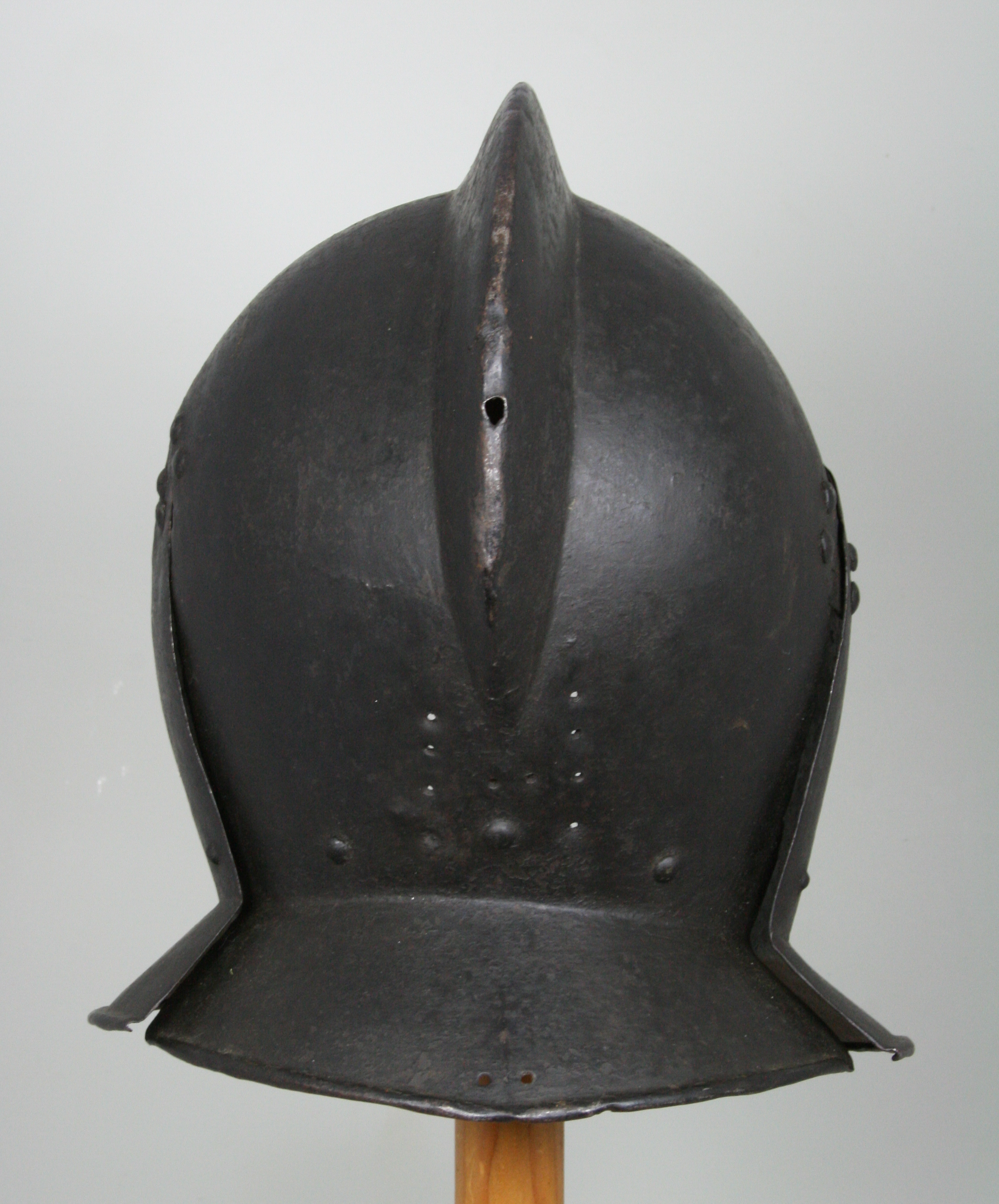 South German, probably Augsburg. One piece skull with high comb and integral peak and (atypically) neck flare and a pair of cheek plates. Inward turns at the edge of the peak, neck and lower edge of the cheek plates. The face edge of the cheek plates with a simple raised edge. Each cheek pierced with 5 holes at the center. Retains lining rivets at the face and neck. Rough from the hammer. One large hole in the back of the crest and an H pattern of smaller holes above the neck in the skull. The larger hole likely from how the piece was mounted in a display. Purpose of the smaller holes unknown. Retains blackened finish refreshed with paint. The integral neck flare is very unusual. It is present on some higher end burgonets often ascribed to an Augsburg origin, but generally the shape is more sweeping and less similar to the form of the burgonets with a neck lame.