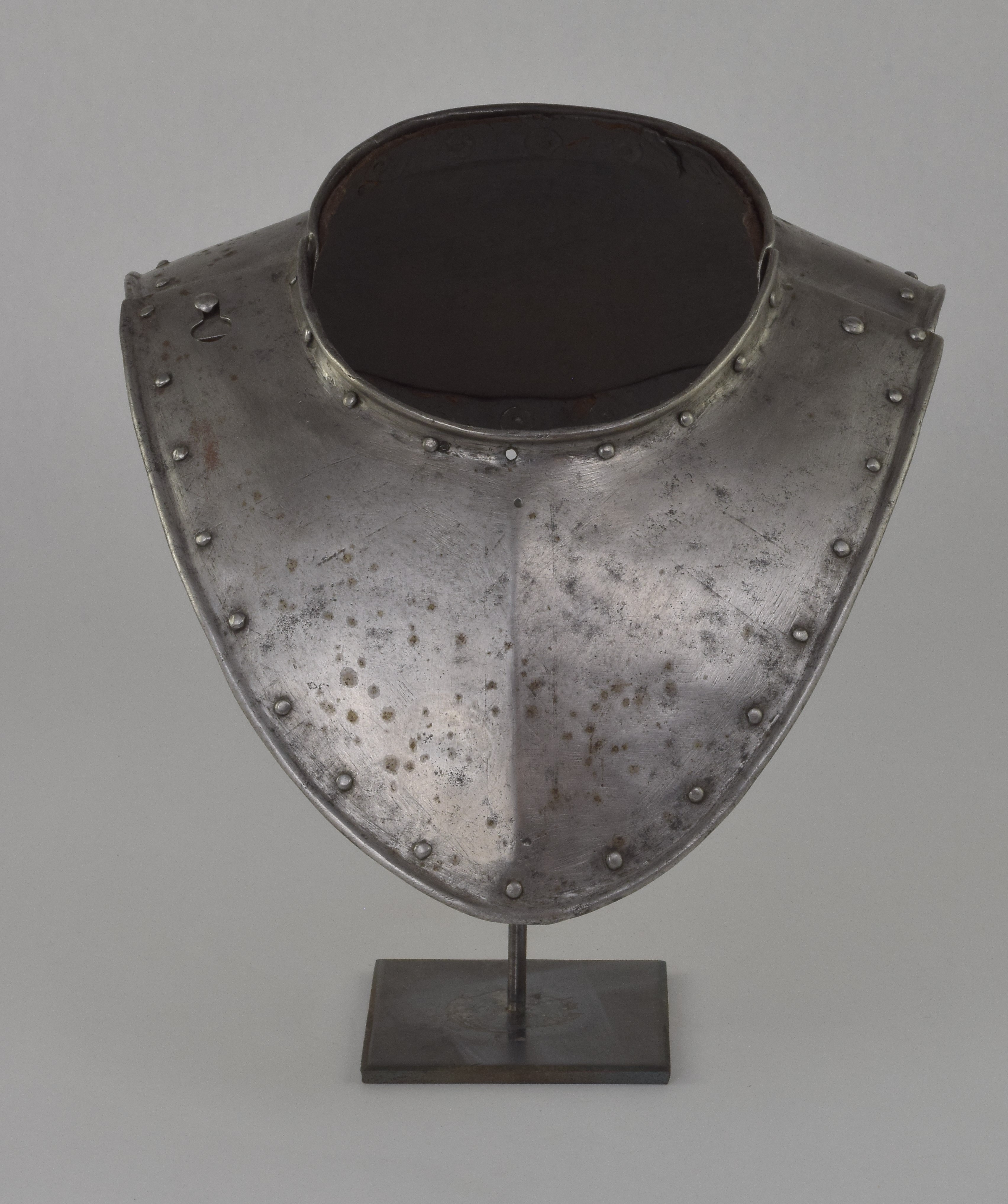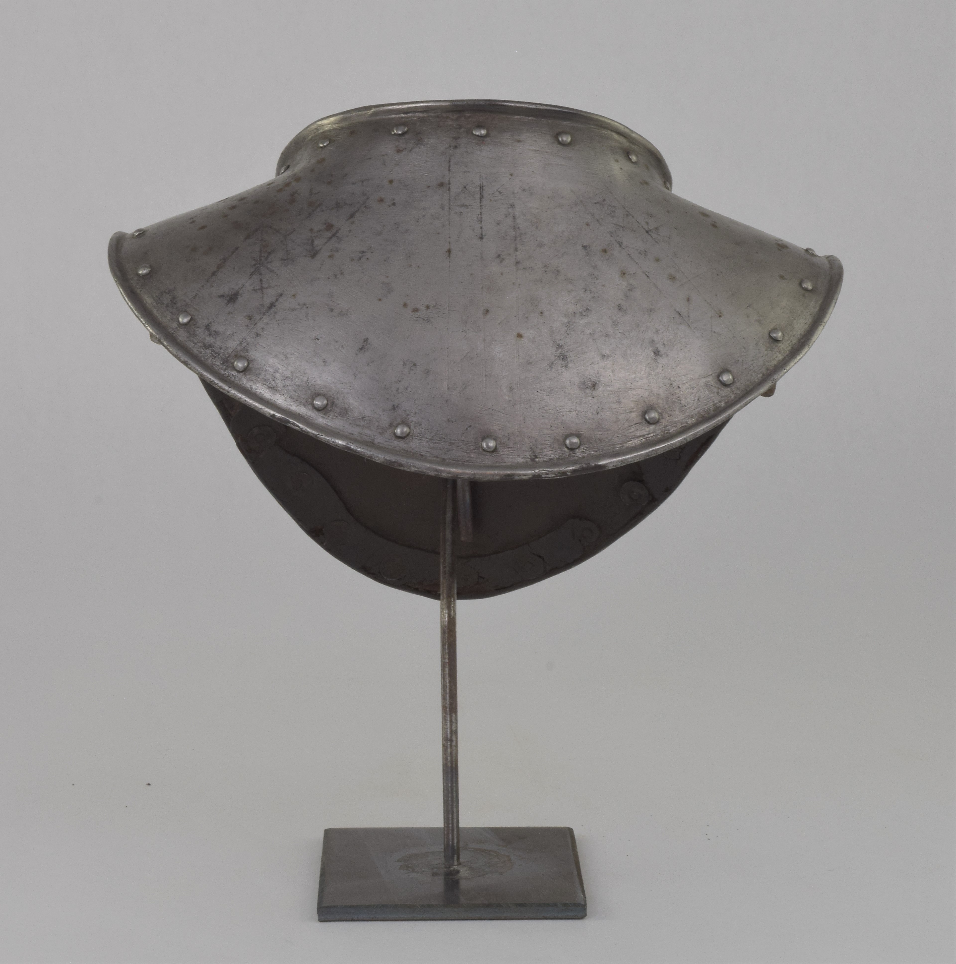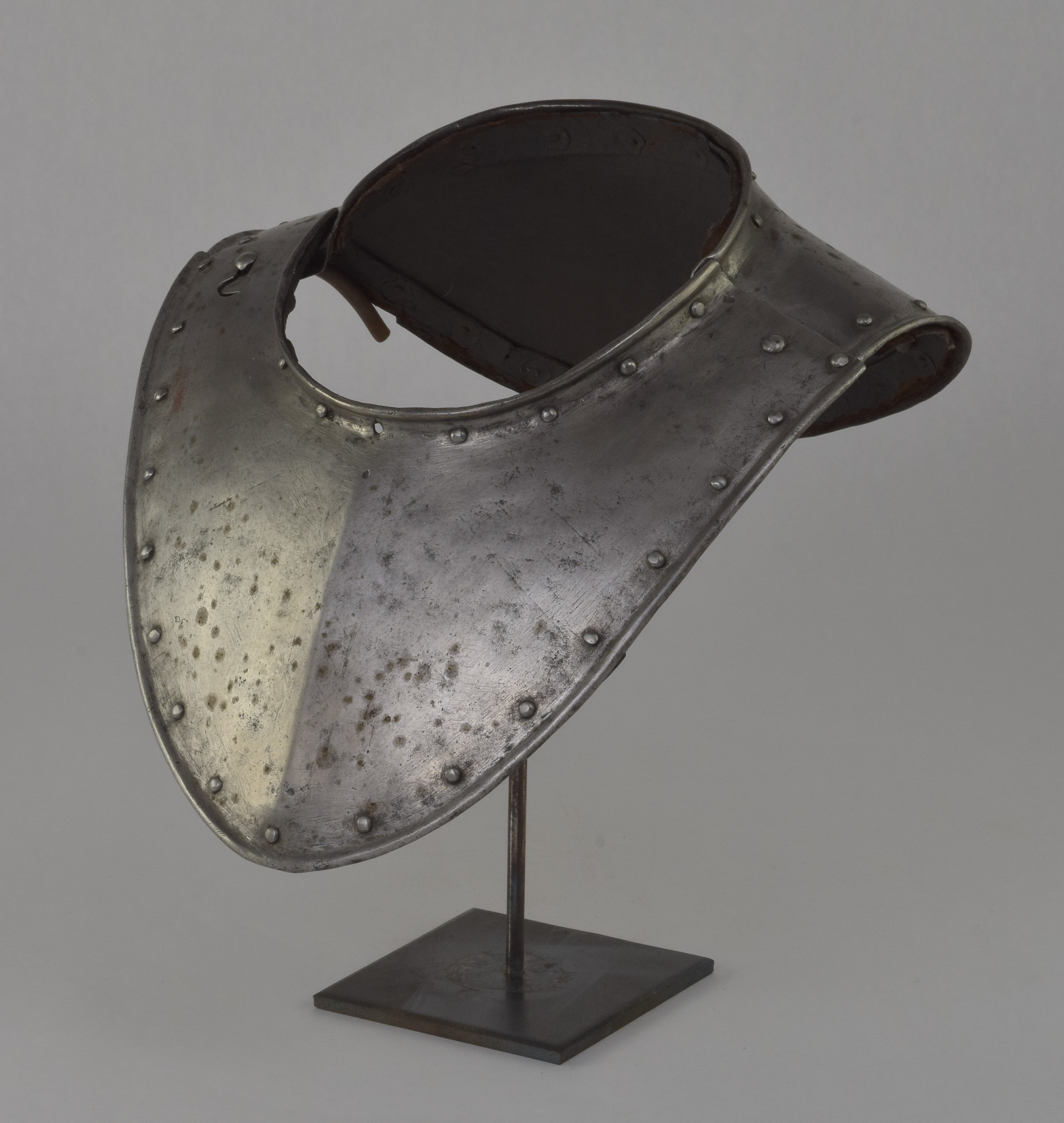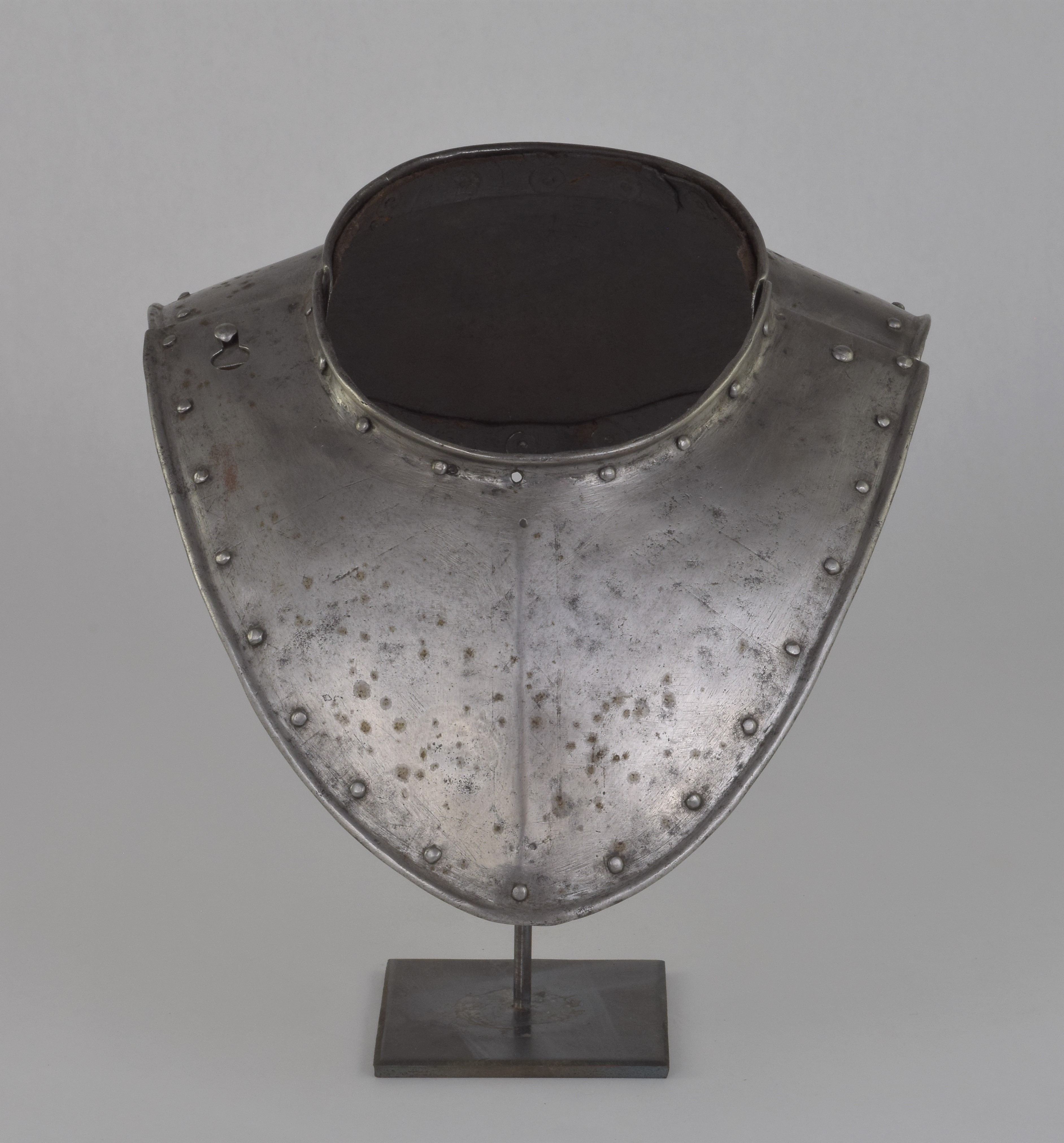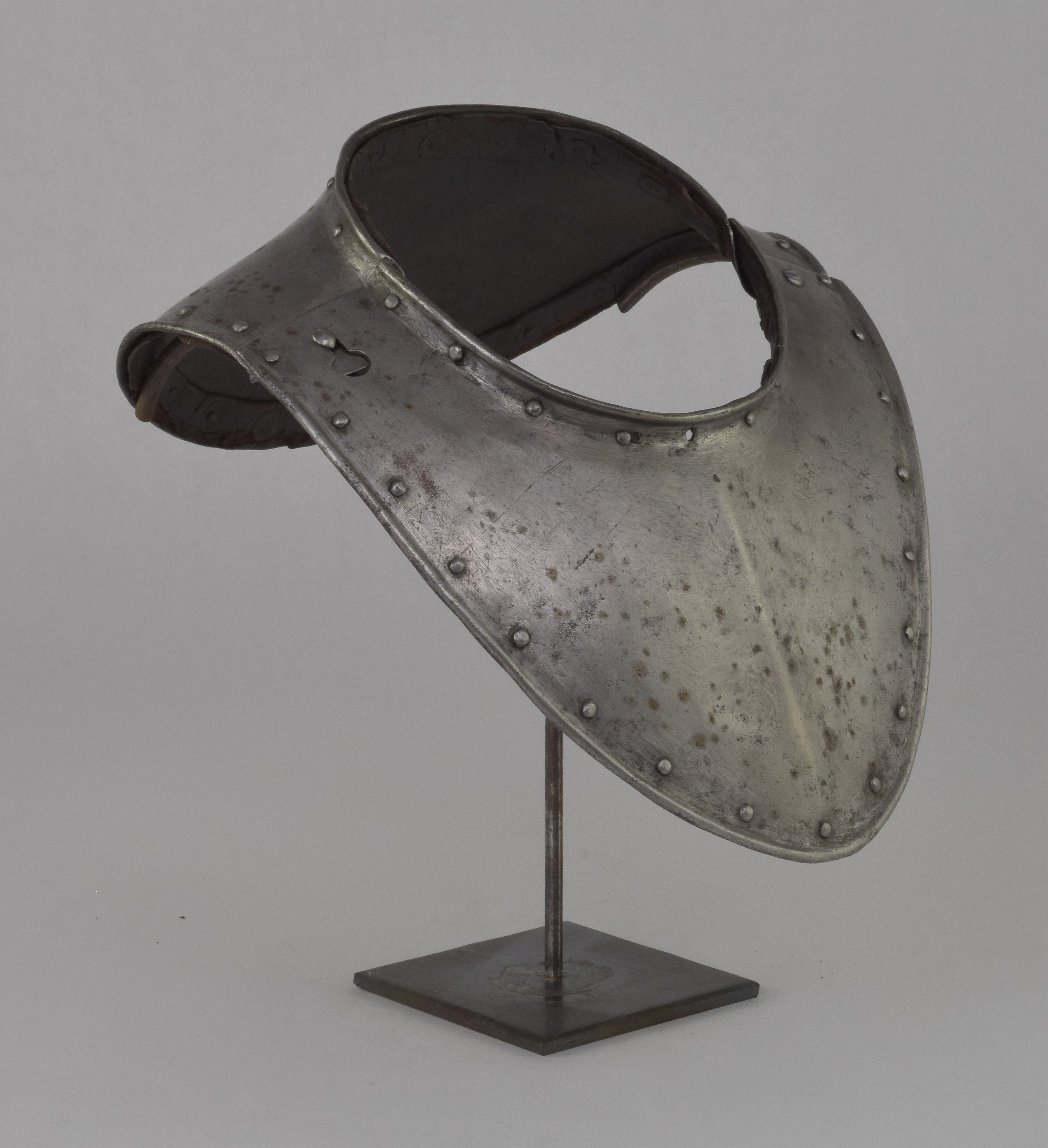 German. Possibly Nuremberg. Rough from the hammer. Rolled neck and outer edge, both bordered by rivets carrying the remains of leather bands. Shape original. Signs of later enhancement by the addition of engraved bands with patterns. These are light, surface lines. This is likely a minimal example of a gorget designed for wear without a breastplate. The most aggressive form of this style is illustrated by item number A-261.