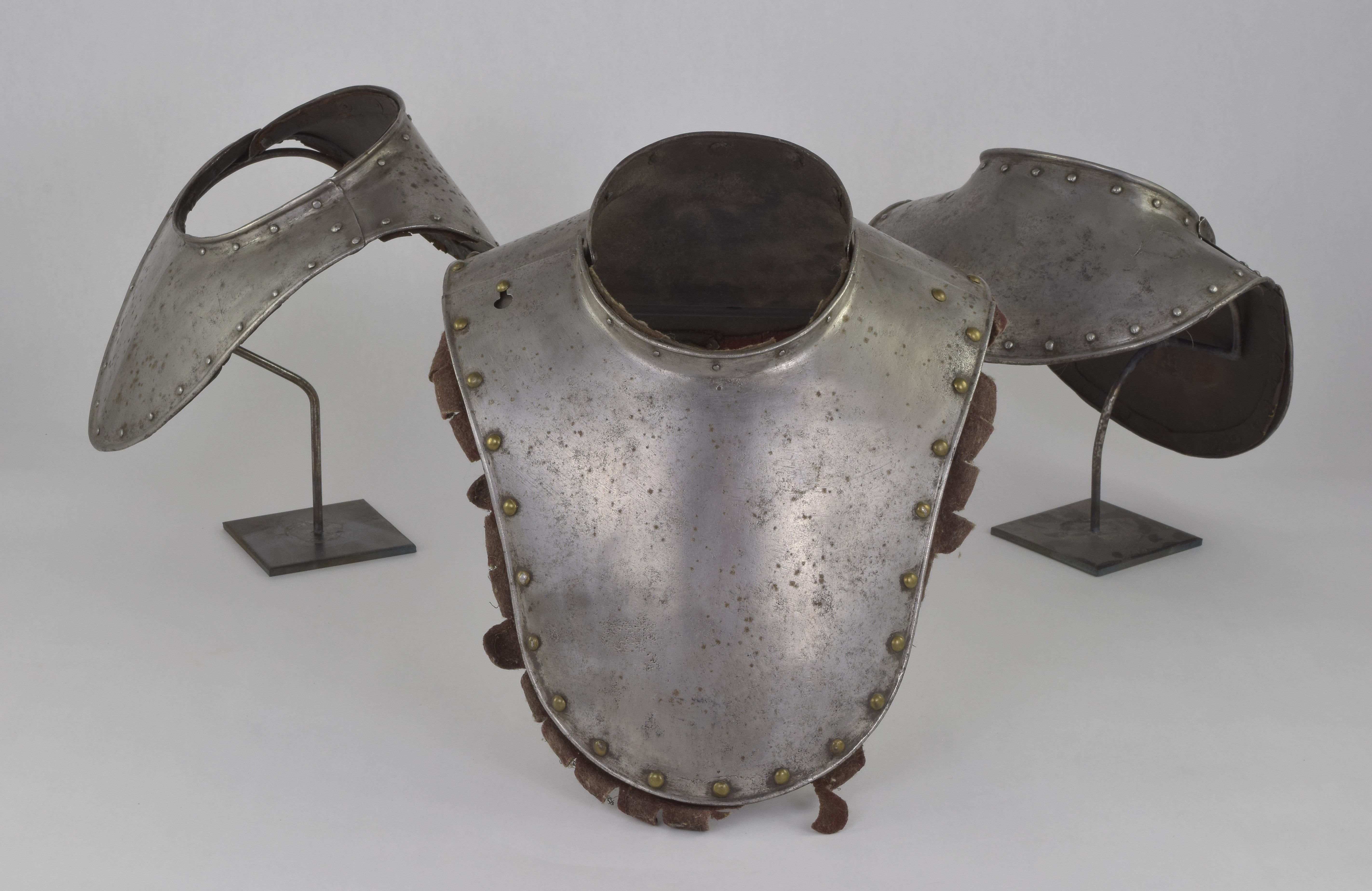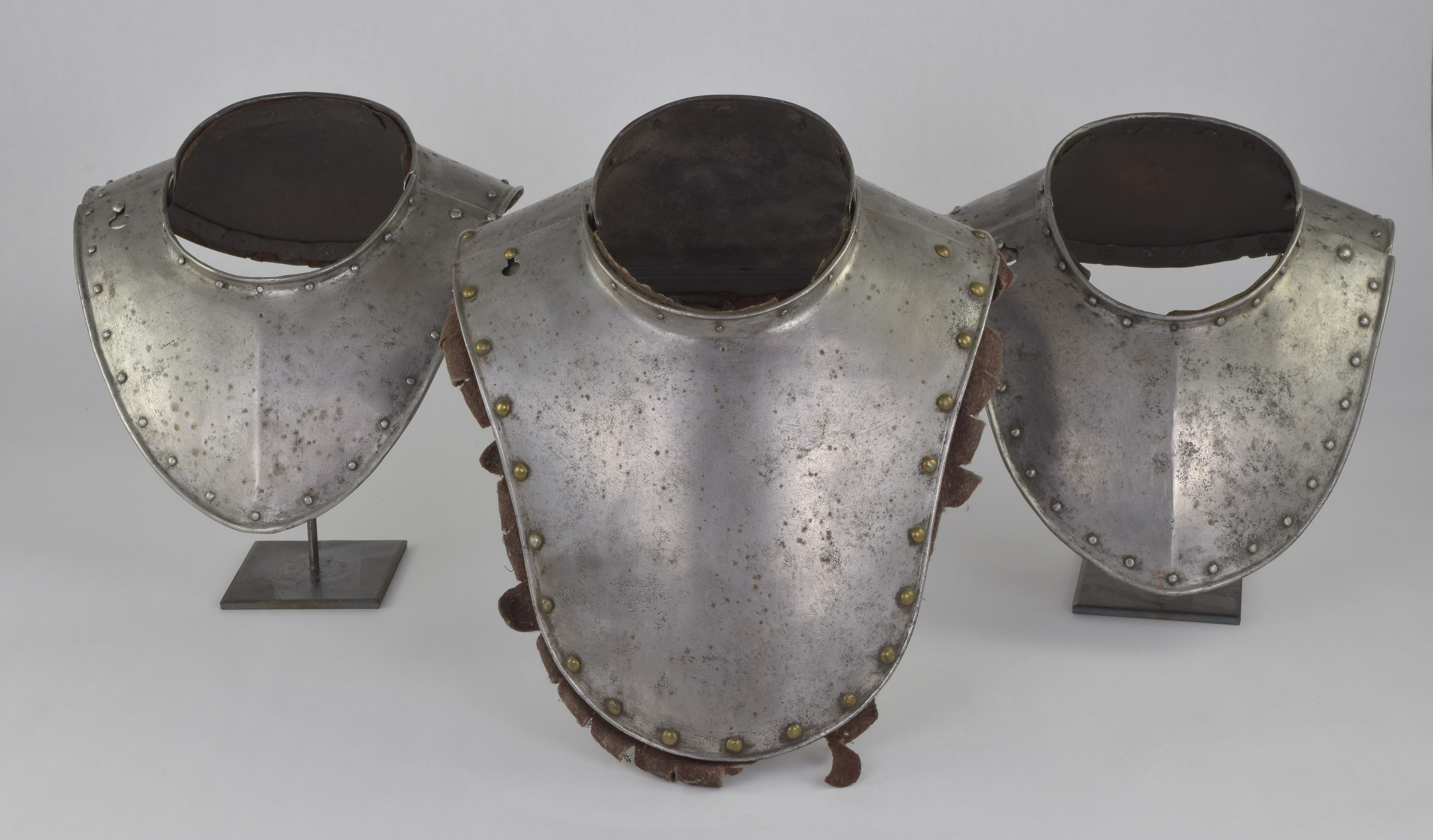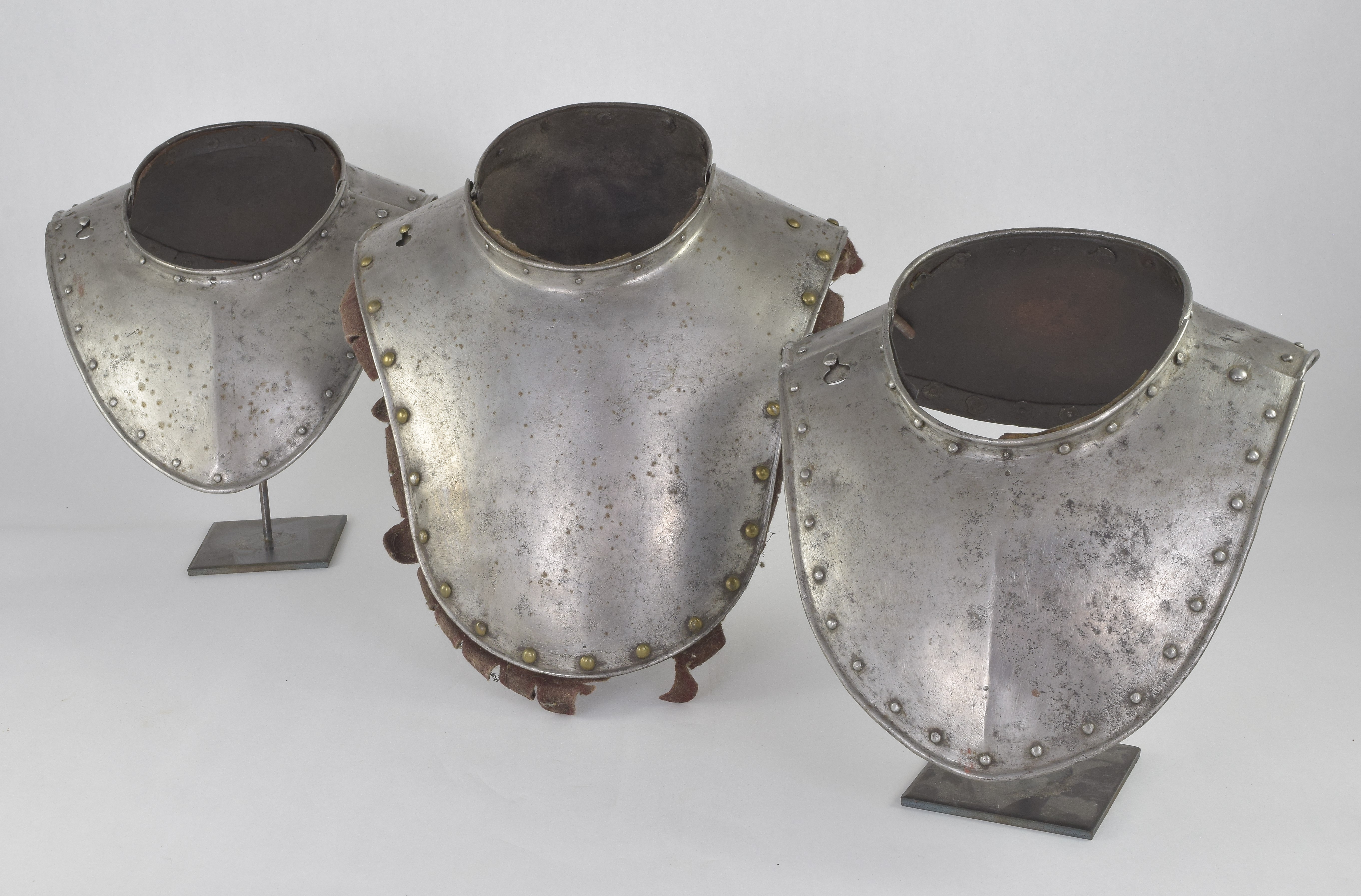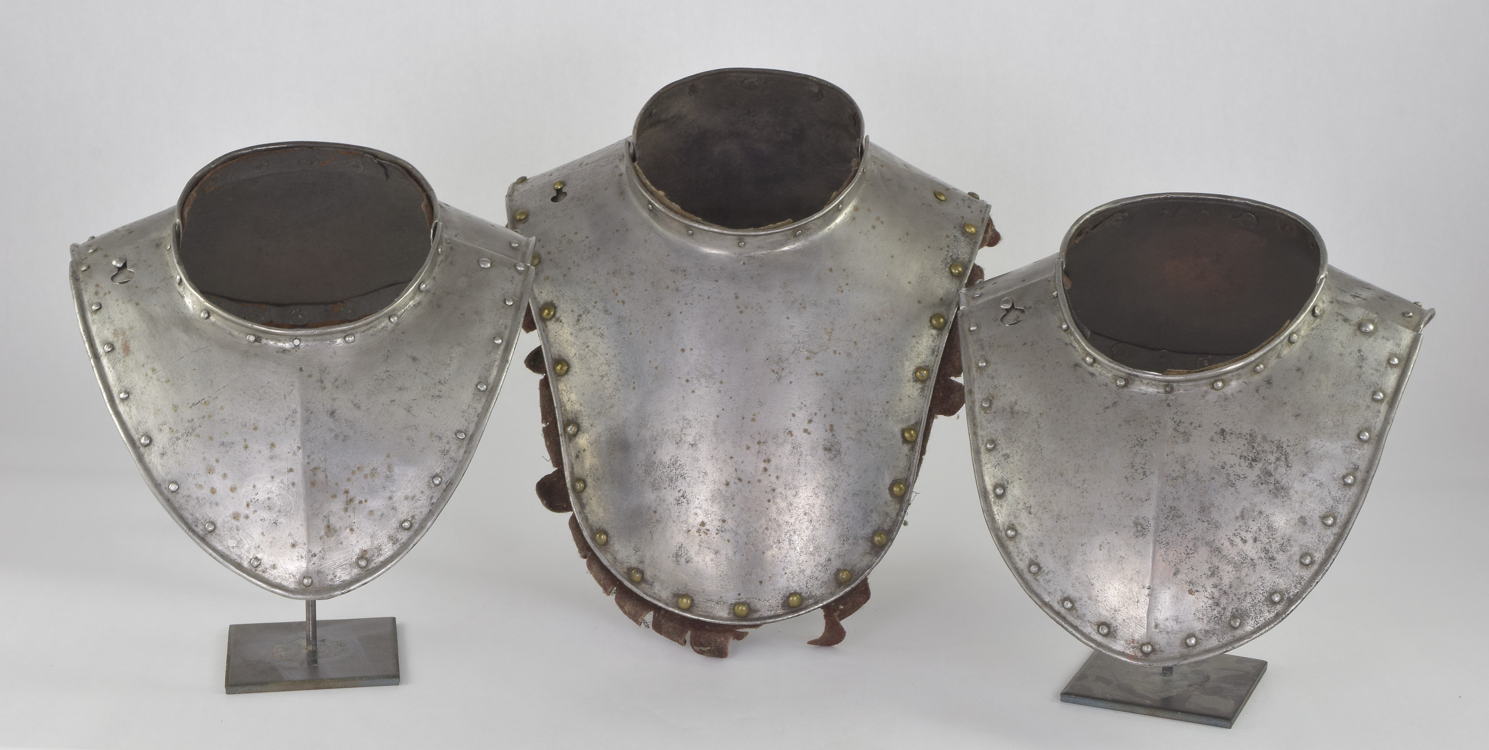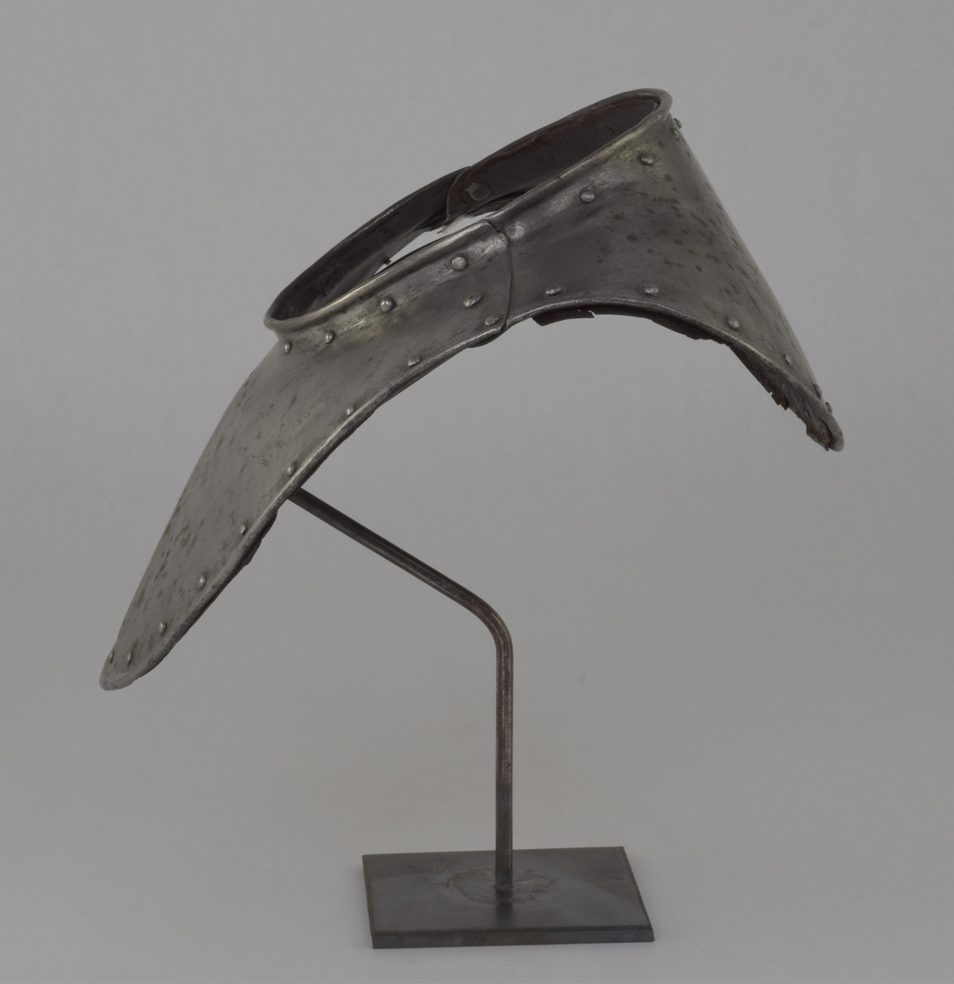 German. Possibly Nuremberg. Rough from the hammer. Rolled neck and outer edge, both bordered by rivets carrying the remains of leather bands. Shape original. Signs of later enhancement by the addition of engraved bands with patterns. These are light, surface lines. This is likely a minimal example of a gorget designed for wear without a breastplate. The most aggressive form of this style is illustrated by item number A-261.
