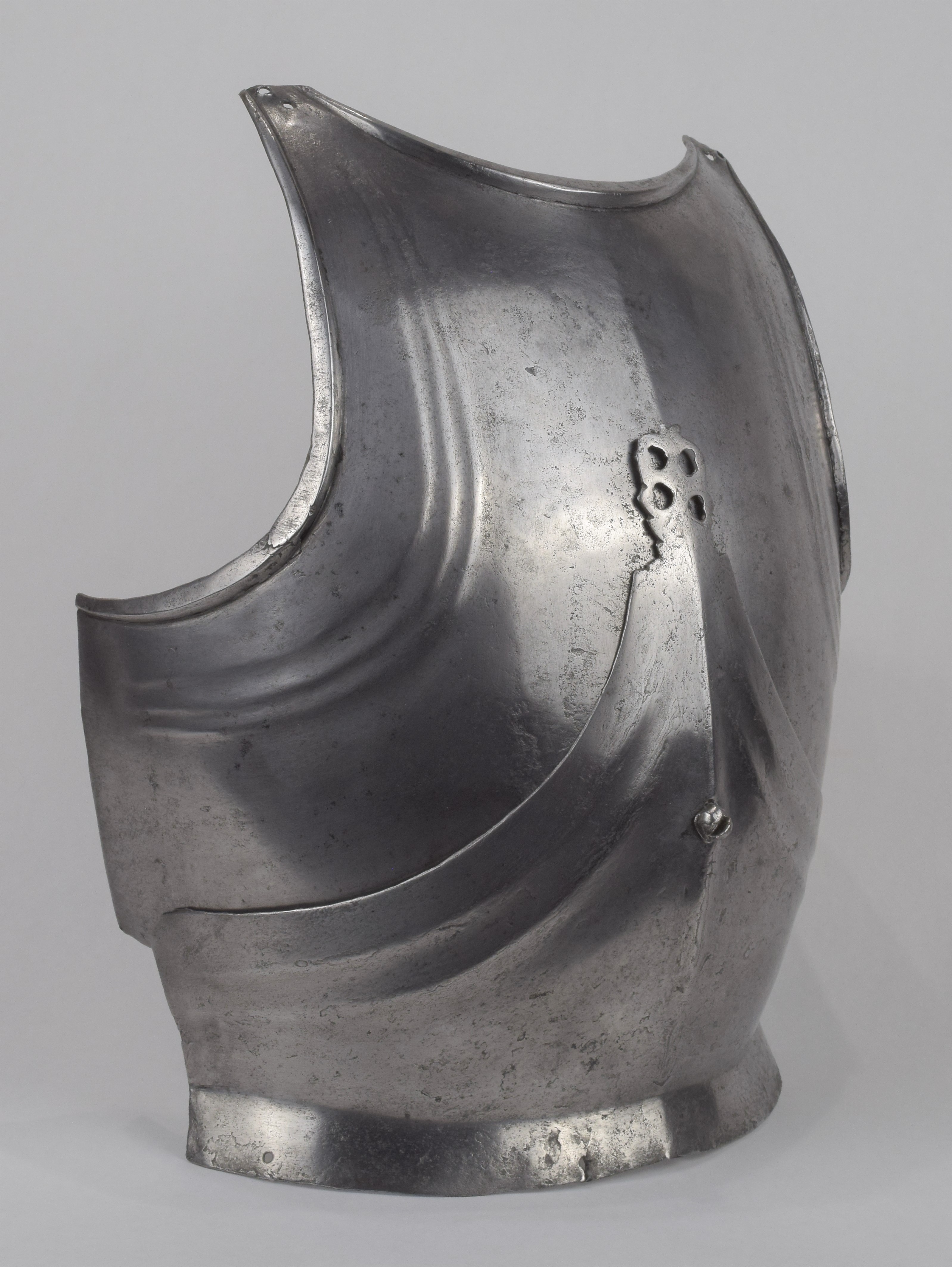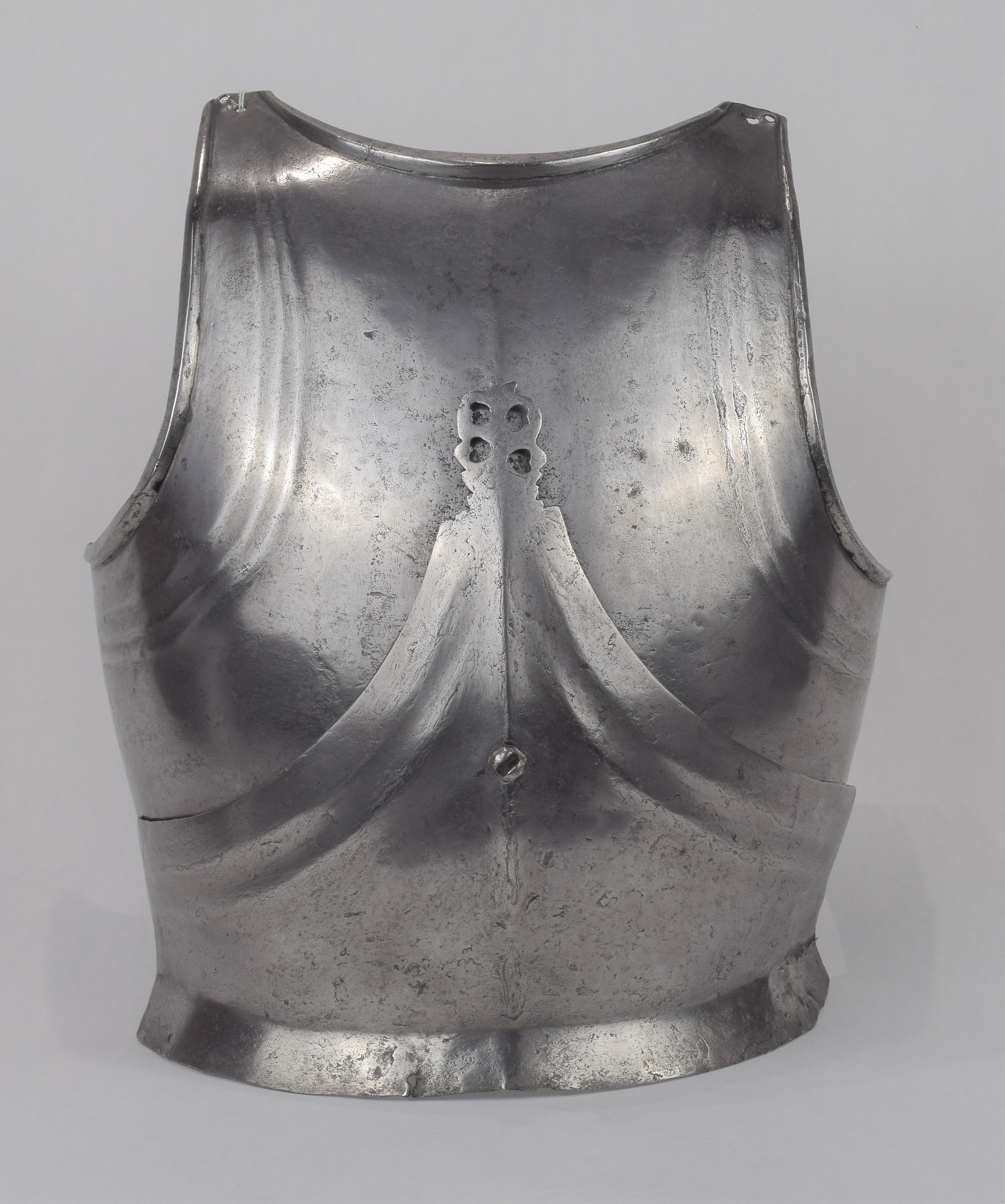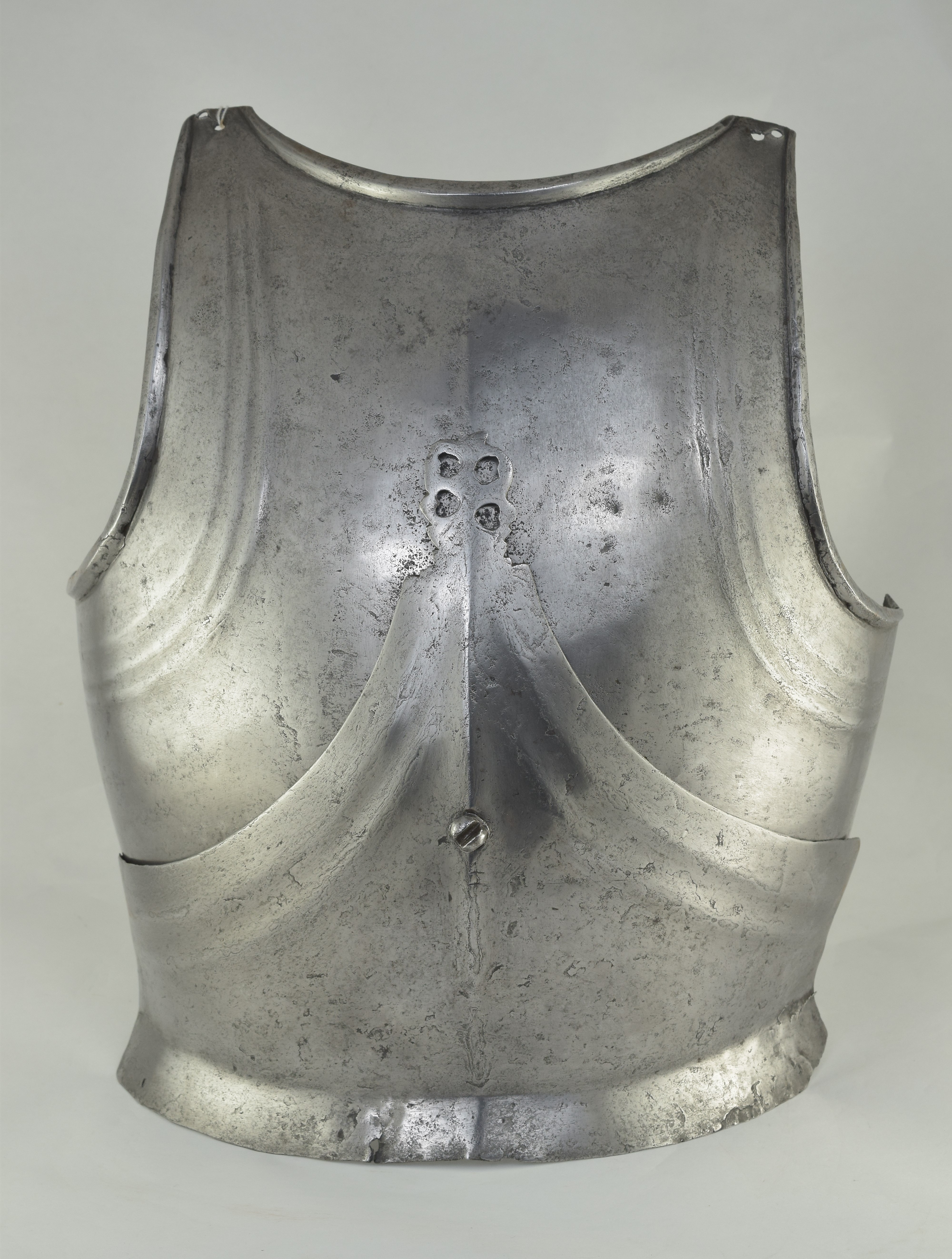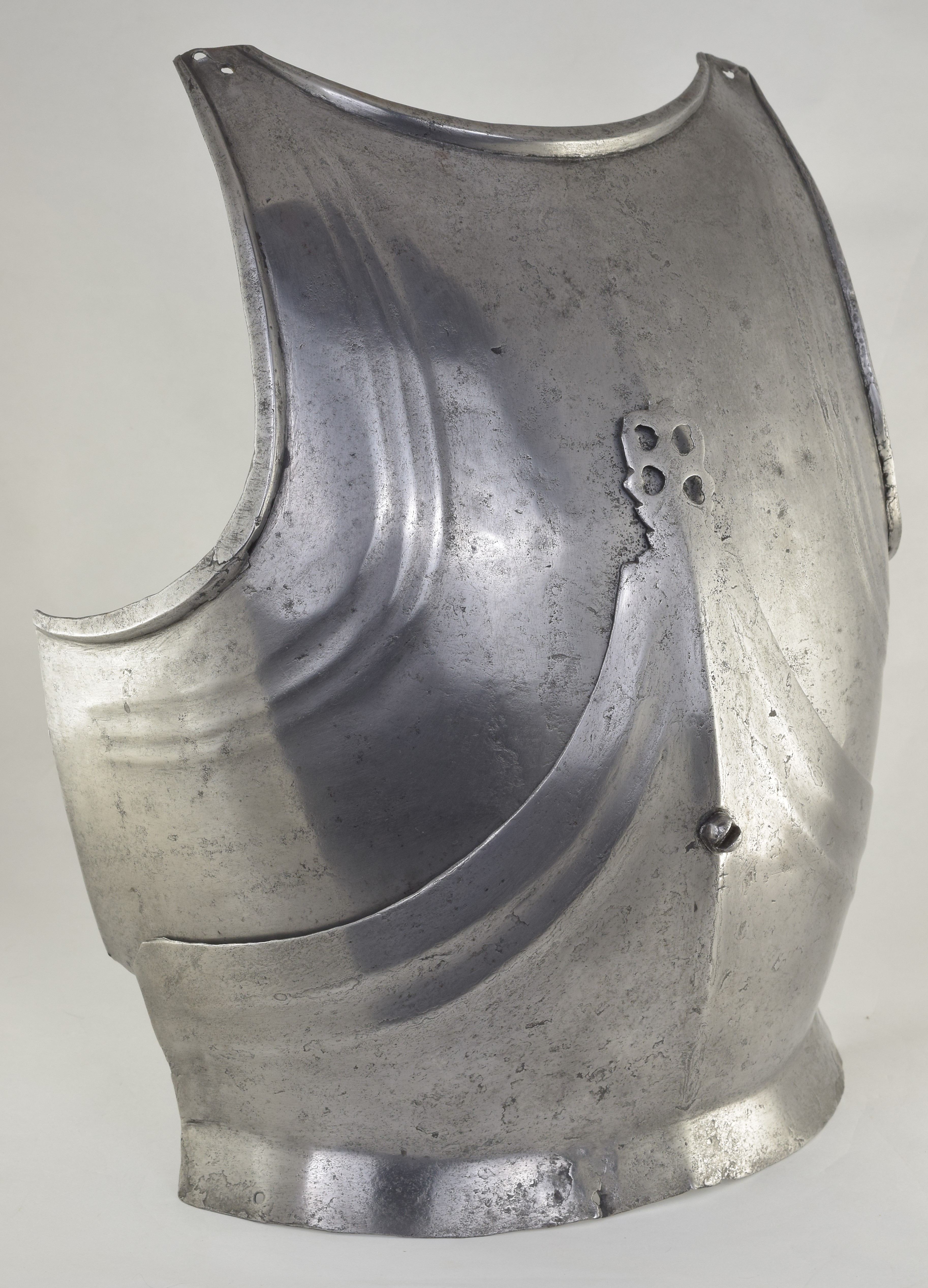 Composed. Formed of two pieces joined by a bolt. The main plate with a low medial ridge, plain angular, outward turned rolls at the neck and arm holes. The roll at the neck forming a vertical front edge then rounded over the top. The roll tapers nicely at the ends. The arm rolls of similar, but not as nicely executed form. The arm holes each with three one sided step flutes parallel to the rolls. Plackart rising to a central squared off point pierced with four hearts, the center with a vertical keel. The upper edges of the plackart with two parallel flutes. The outer of these is a step, the next seems symmetric. Bottom edge of the plackart flared to carry a fauld. The parts have been together for all of its modern history, but they are associated. The plackart and upper are secured to each other by a central bolt which threads directly into one of 4 holes pierced in the upper. The bolt is likely from the same period and the threads fit the threads in the upper. The top hole is cleanly cut, the bottom three are significantly mushroomed inward around the edges. As currently displayed, it sits a little tall, and the waist line will appear to be straighter than it would have been originally. Plates show signs of delamination and wear through cleaning. There are two small dents in the upper breast. These look like they may have been caused by impact from a square pointed weapon.