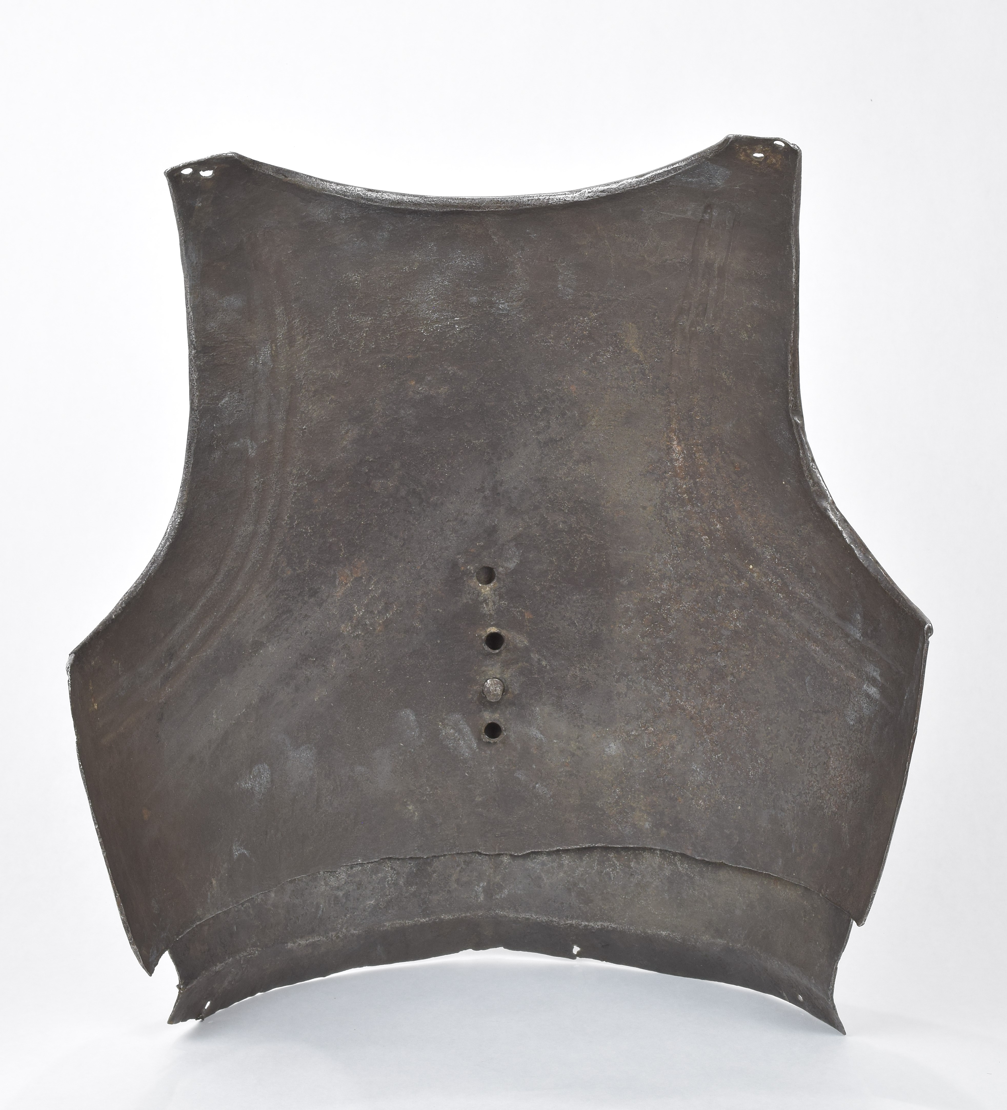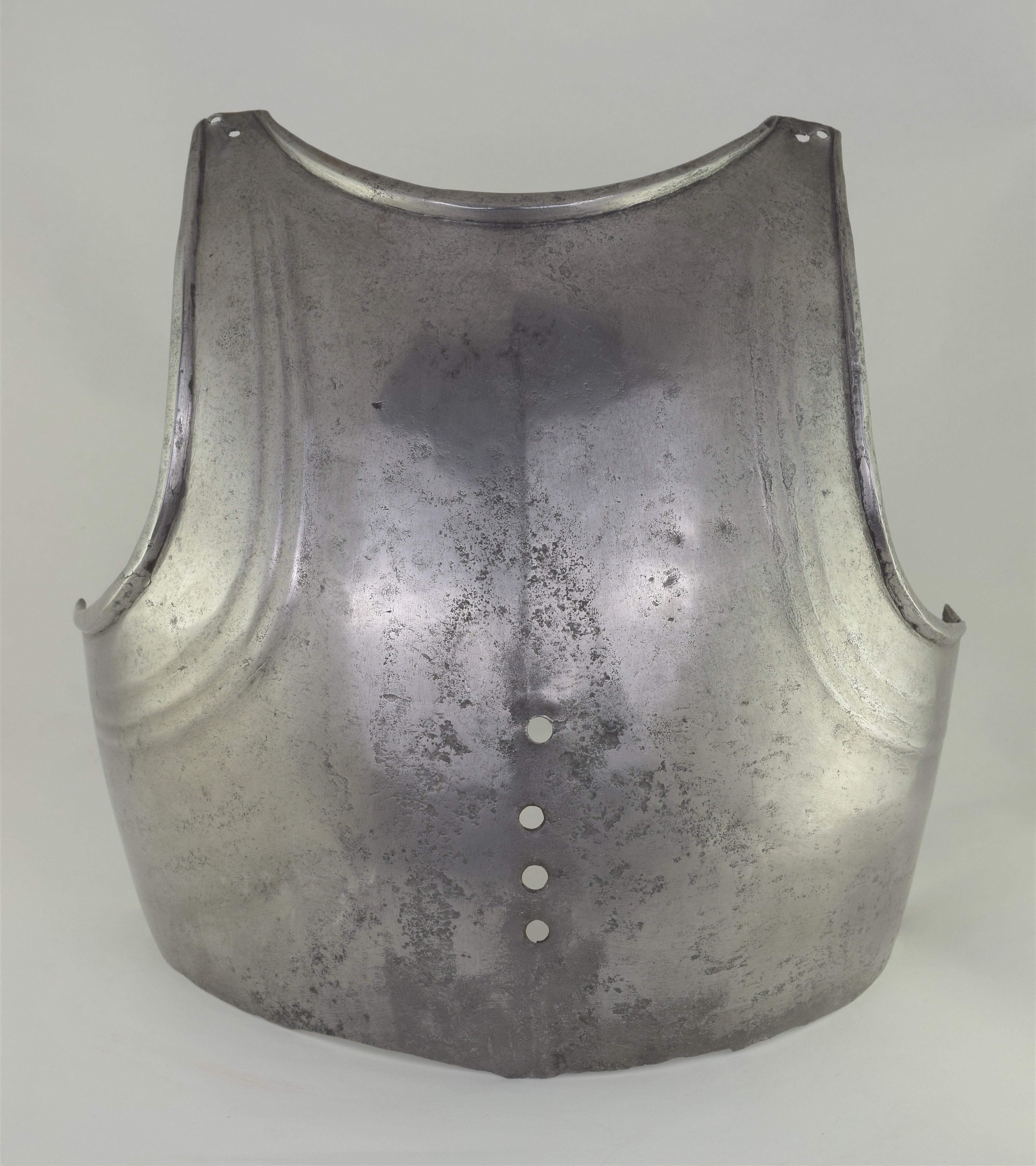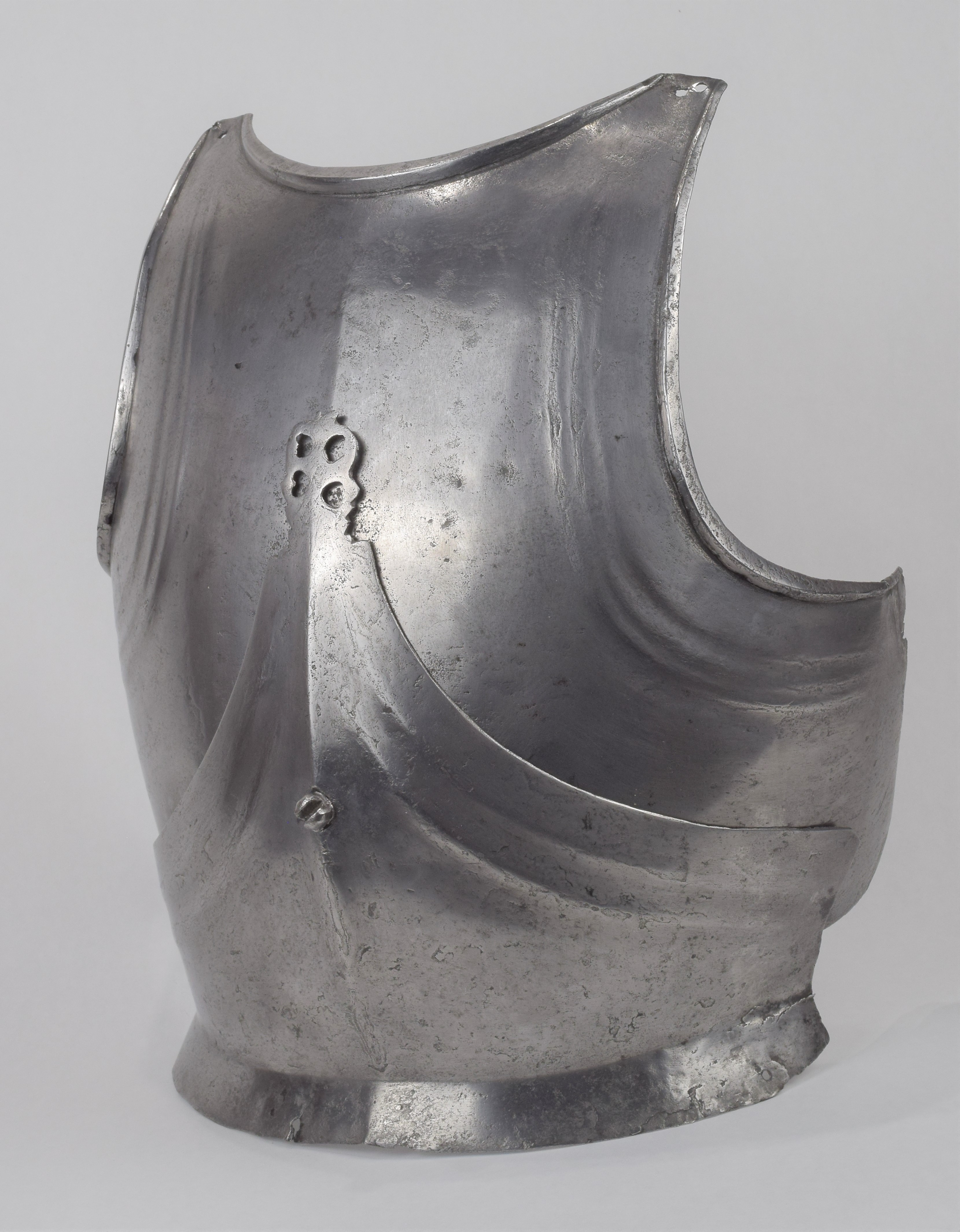 Composed. Formed of two pieces joined by a bolt. The main plate with a low medial ridge, plain angular, outward turned rolls at the neck and arm holes. The roll at the neck forming a vertical front edge then rounded over the top. The roll tapers nicely at the ends. The arm rolls of similar, but not as nicely executed form. The arm holes each with three one sided step flutes parallel to the rolls. Plackart rising to a central squared off point pierced with four hearts, the center with a vertical keel. The upper edges of the plackart with two parallel flutes. The outer of these is a step, the next seems symmetric. Bottom edge of the plackart flared to carry a fauld. The parts have been together for all of its modern history, but they are associated. The plackart and upper are secured to each other by a central bolt which threads directly into one of 4 holes pierced in the upper. The bolt is likely from the same period and the threads fit the threads in the upper. The top hole is cleanly cut, the bottom three are significantly mushroomed inward around the edges. As currently displayed, it sits a little tall, and the waist line will appear to be straighter than it would have been originally. Plates show signs of delamination and wear through cleaning. There are two small dents in the upper breast. These look like they may have been caused by impact from a square pointed weapon.