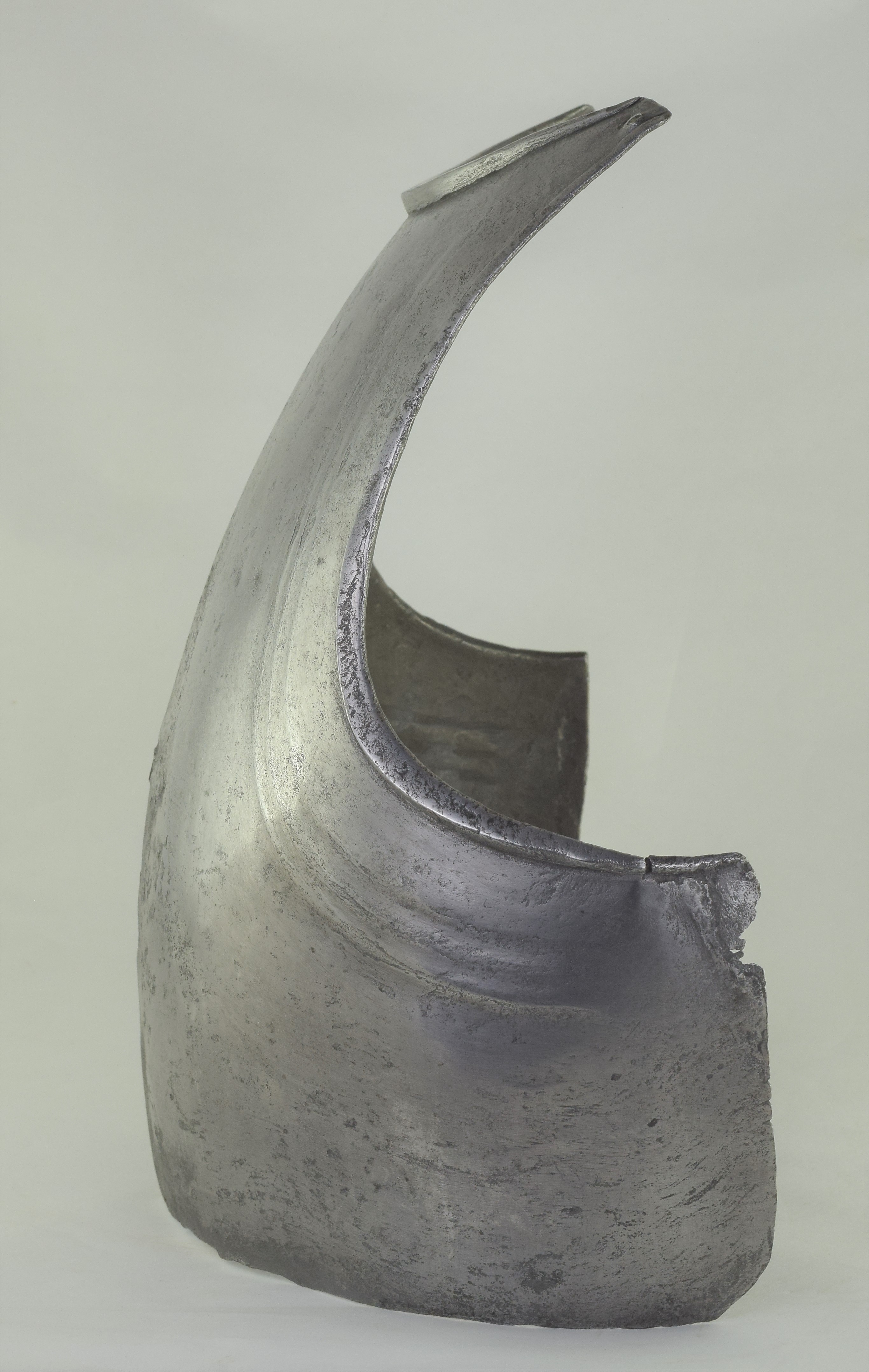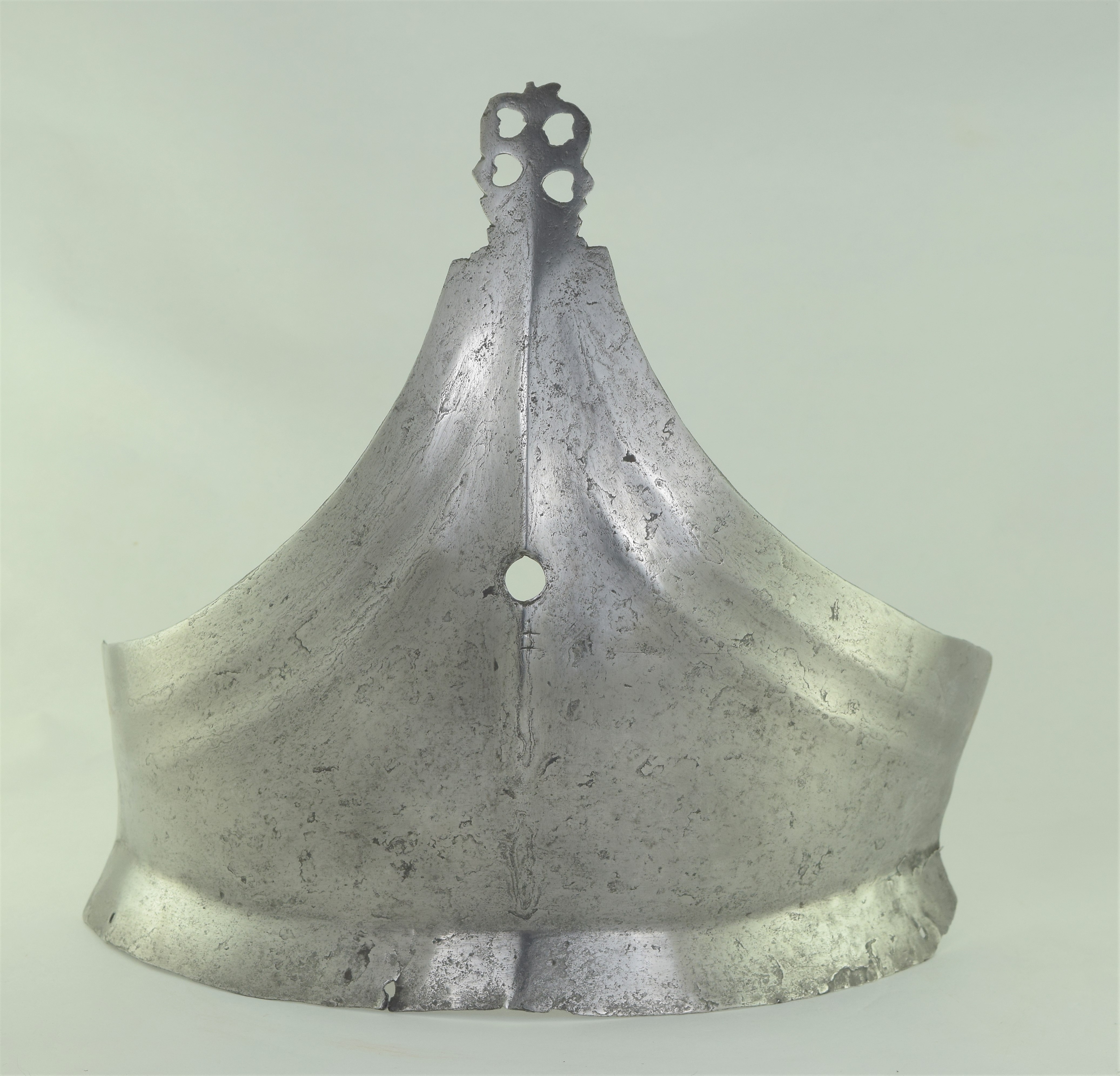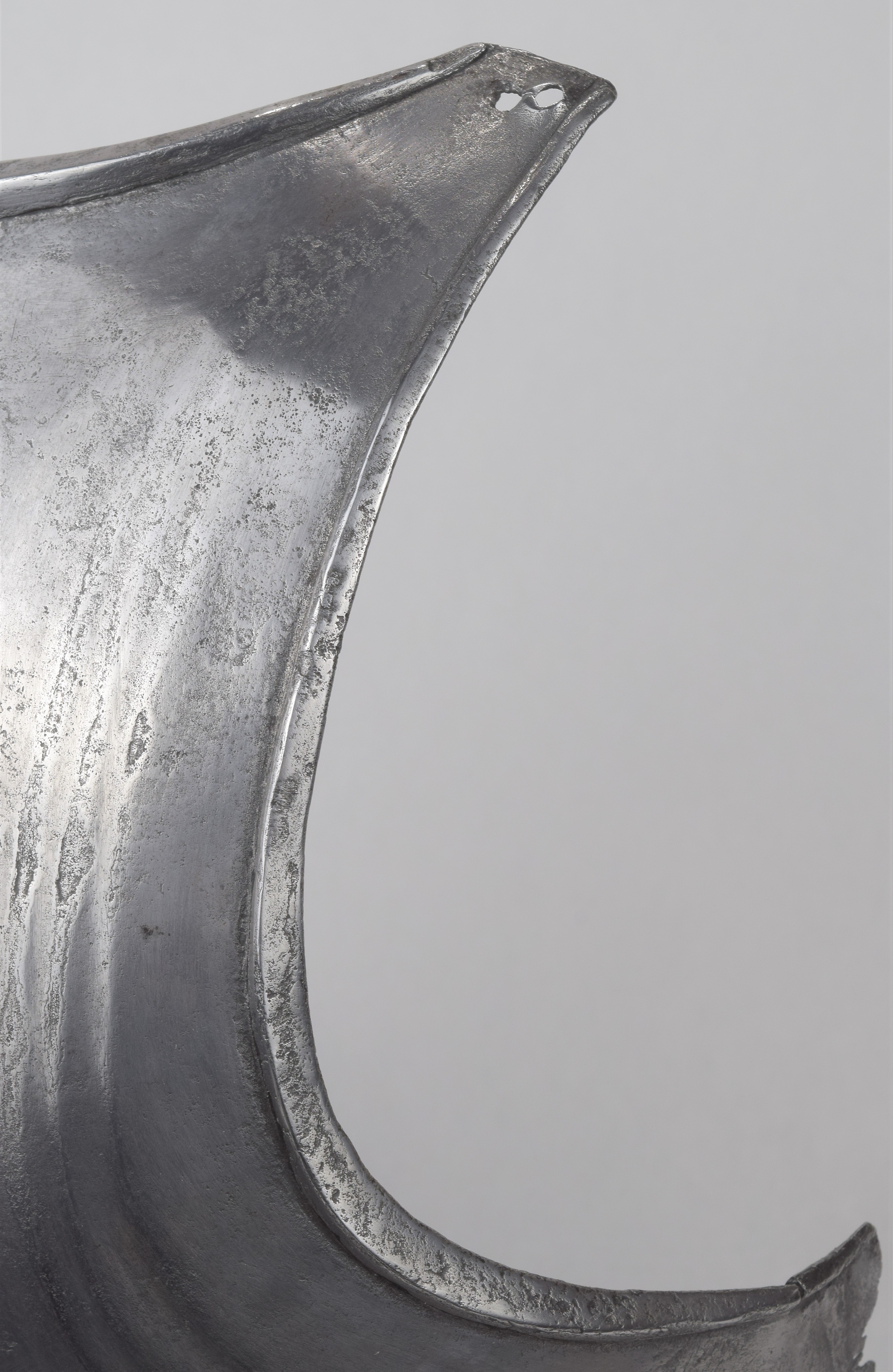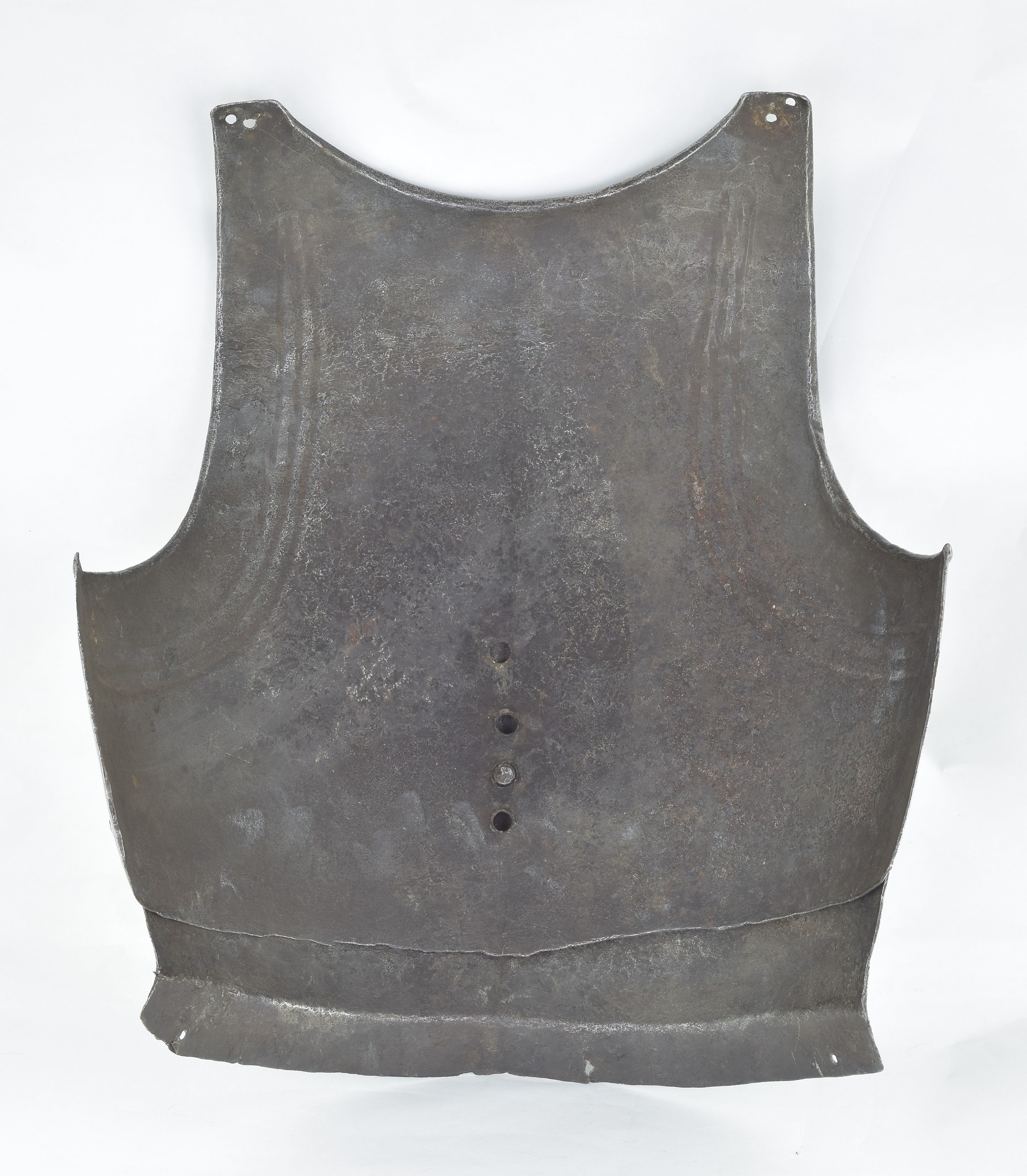Composed. Formed of two pieces joined by a bolt. The main plate with a low medial ridge, plain angular, outward turned rolls at the neck and arm holes. The roll at the neck forming a vertical front edge then rounded over the top. The roll tapers nicely at the ends. The arm rolls of similar, but not as nicely executed form. The arm holes each with three one sided step flutes parallel to the rolls. Plackart rising to a central squared off point pierced with four hearts, the center with a vertical keel. The upper edges of the plackart with two parallel flutes. The outer of these is a step, the next seems symmetric. Bottom edge of the plackart flared to carry a fauld. The parts have been together for all of its modern history, but they are associated. The plackart and upper are secured to each other by a central bolt which threads directly into one of 4 holes pierced in the upper. The bolt is likely from the same period and the threads fit the threads in the upper. The top hole is cleanly cut, the bottom three are significantly mushroomed inward around the edges. As currently displayed, it sits a little tall, and the waist line will appear to be straighter than it would have been originally. Plates show signs of delamination and wear through cleaning. There are two small dents in the upper breast. These look like they may have been caused by impact from a square pointed weapon.
