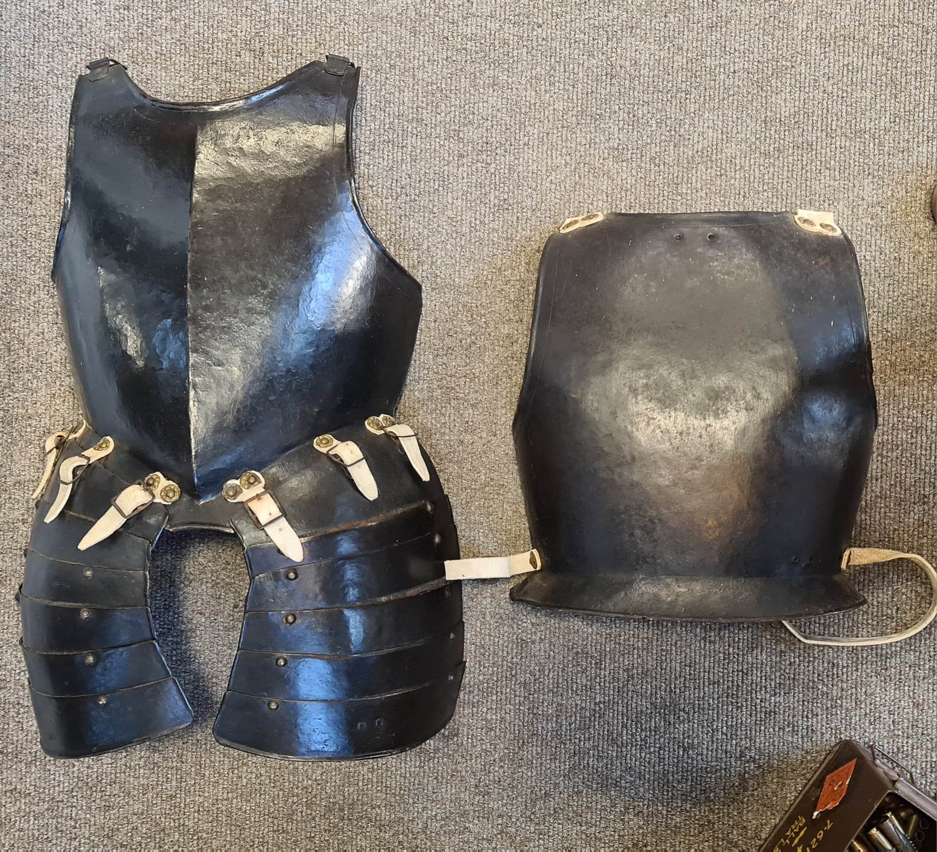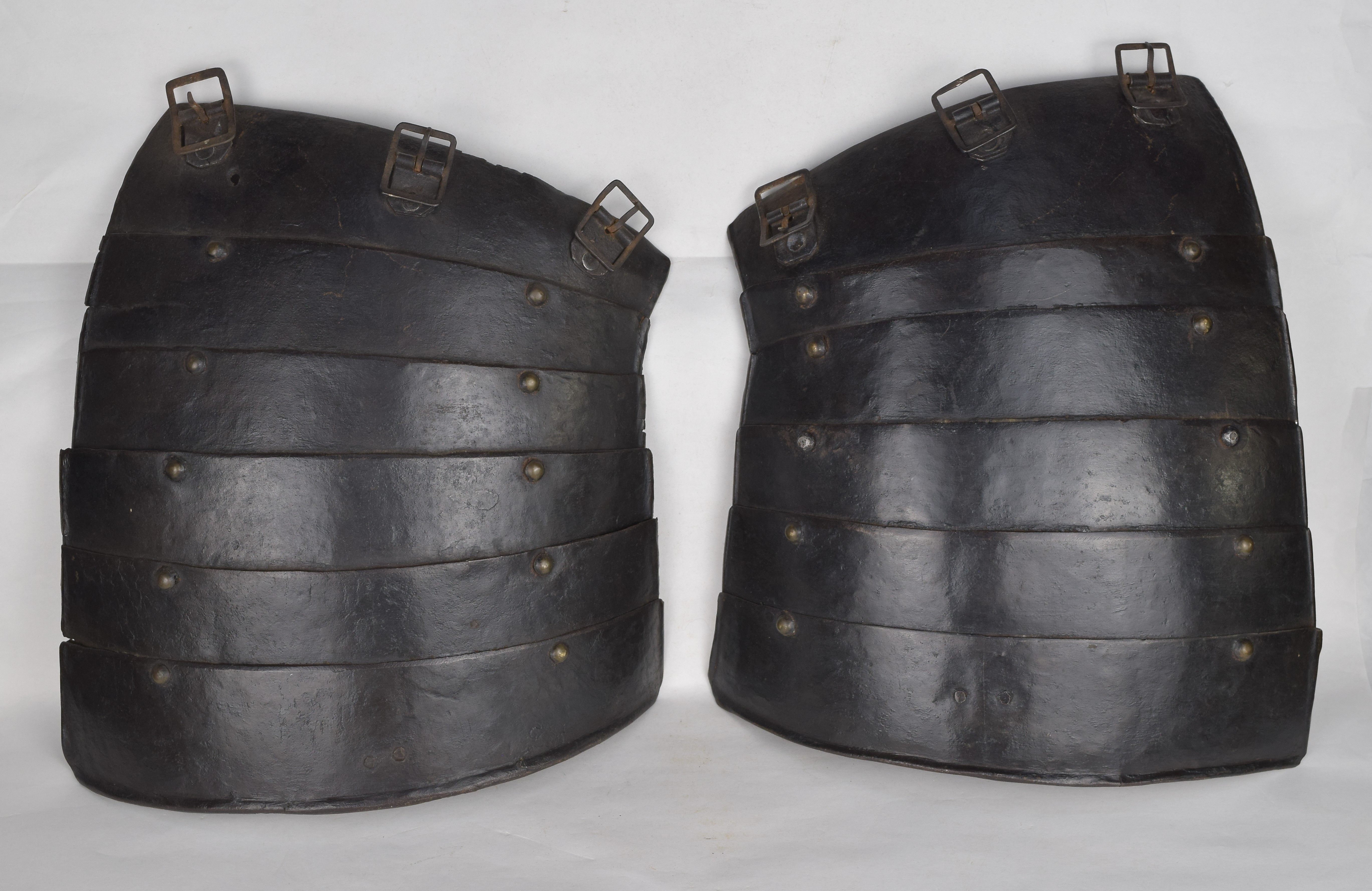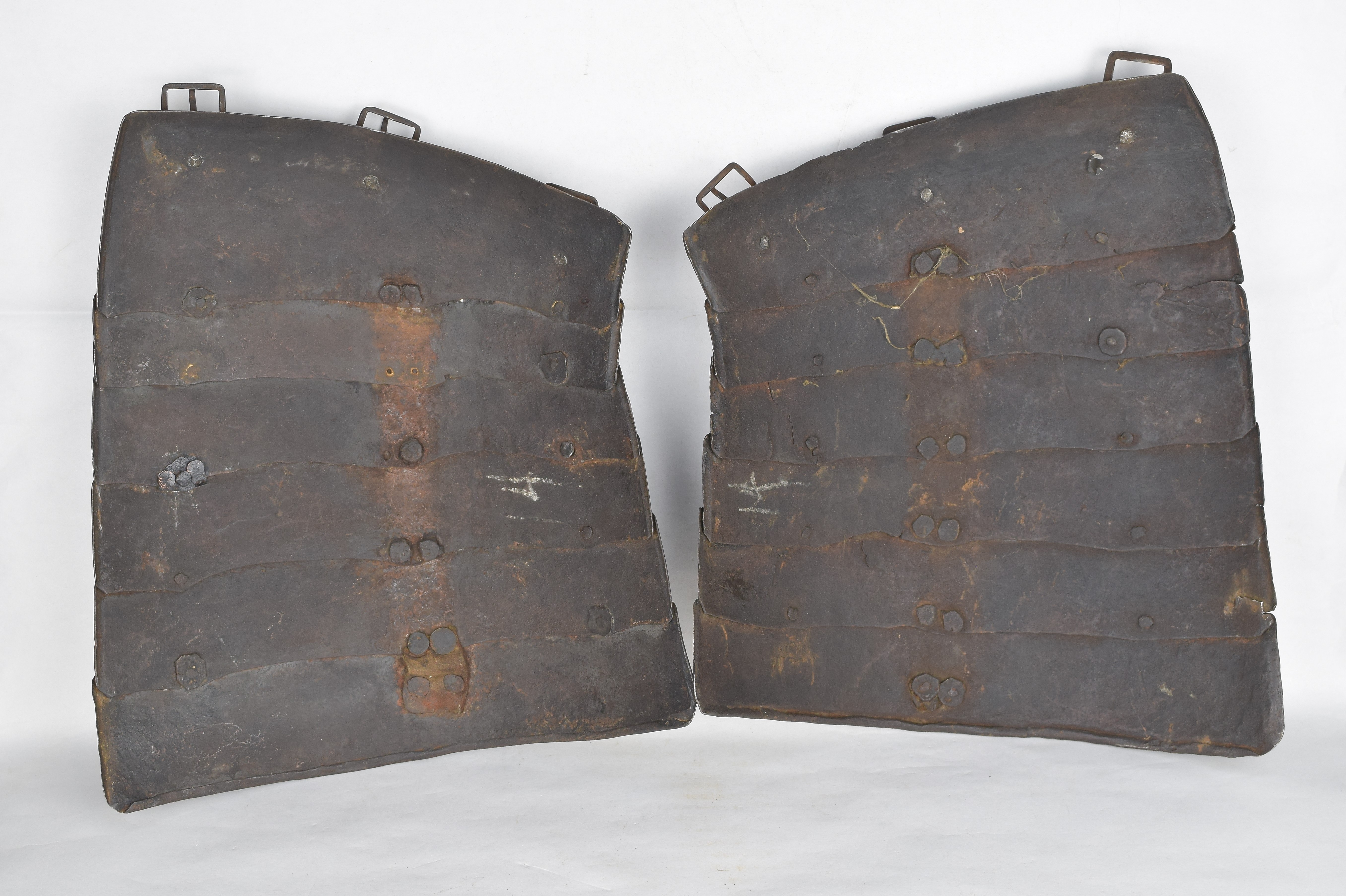 Consisting of six horizontal plates. Plates secured by rivets front and back and a (lost) central internal leather. Lower edge with a plain inward turned roll. Sides with simple bump simulating a roll. Top plates with three buckles (replaced) for suspension from the breastplate. Black rough from the hammer finish (refreshed with paint). Marked internally '14' matching the back and breast.