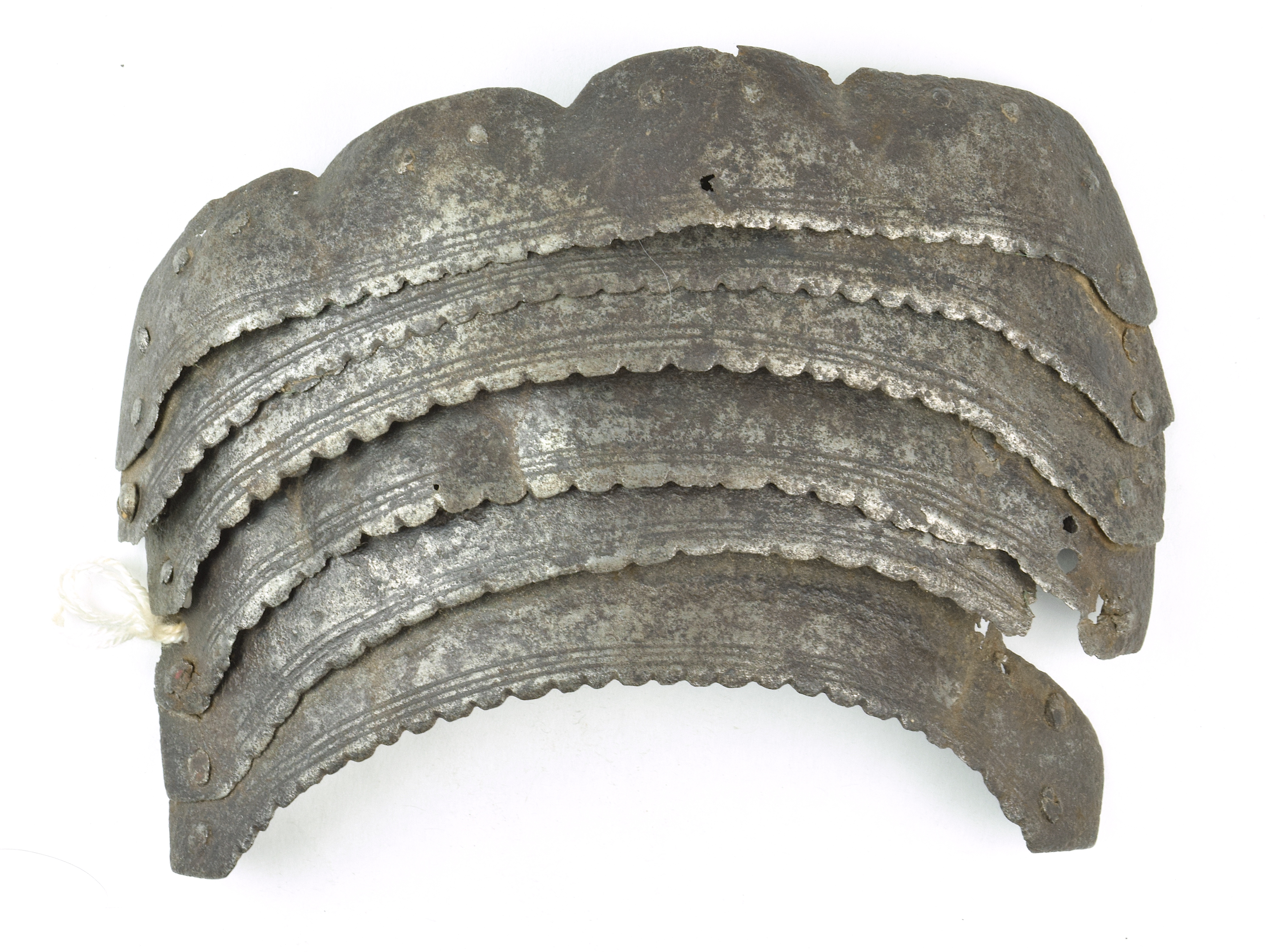 Consisting of five metacarpal plates and a knuckle plate. The rear edges of the plates bevelled and filed with a fine cusps. Each knuckle with two rivets to secure the finger plates. Each with tripple engraved lines.