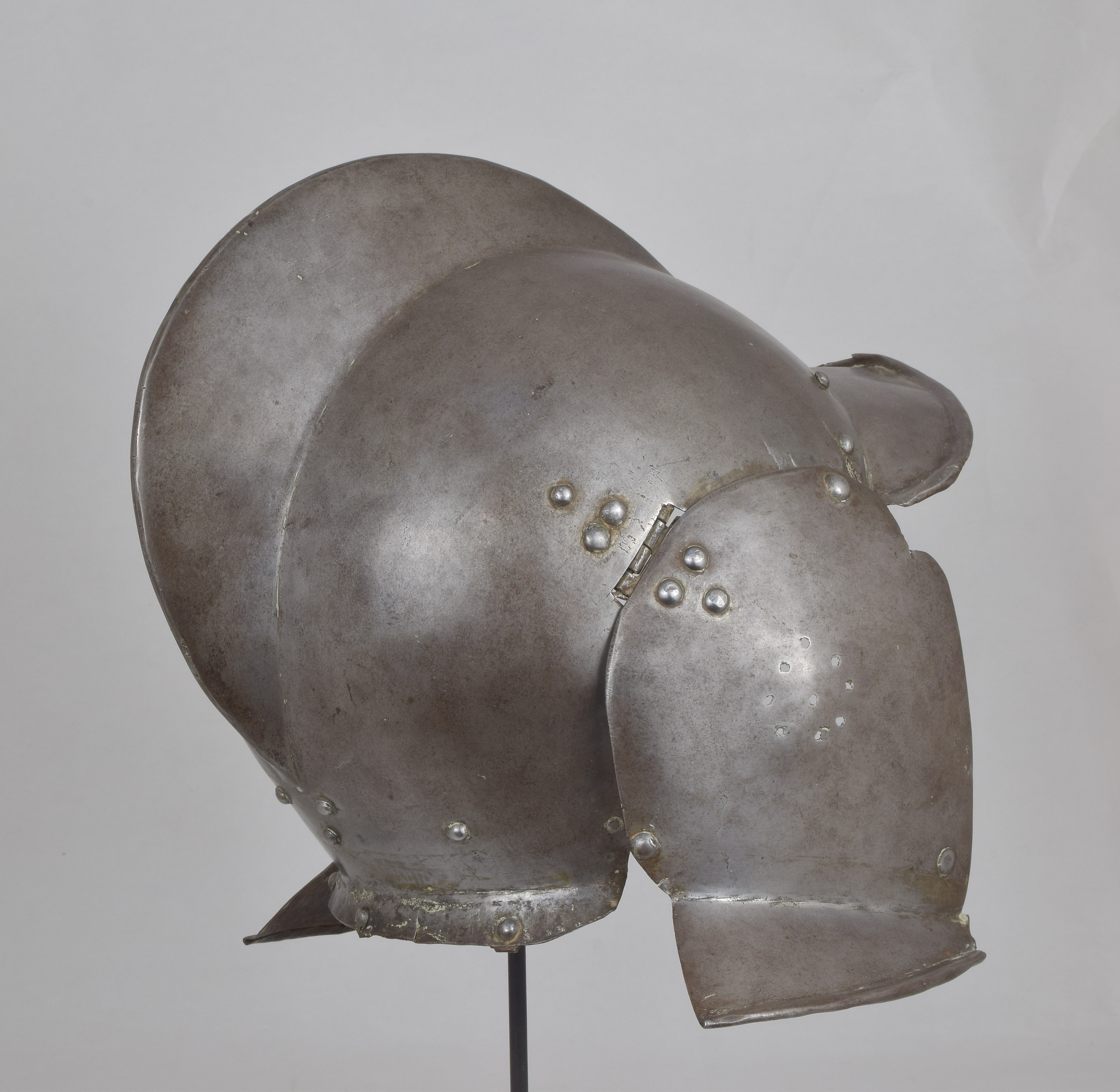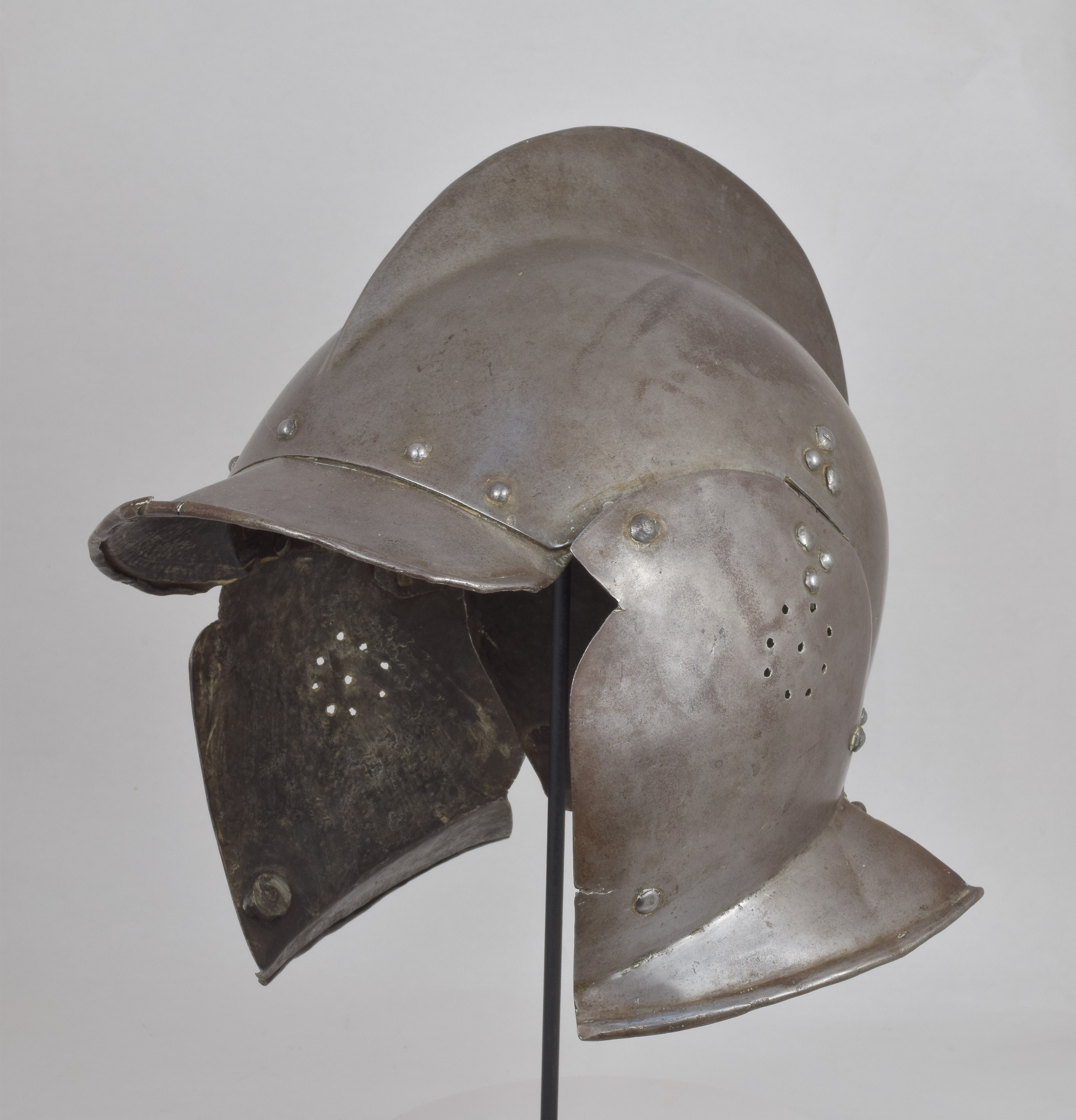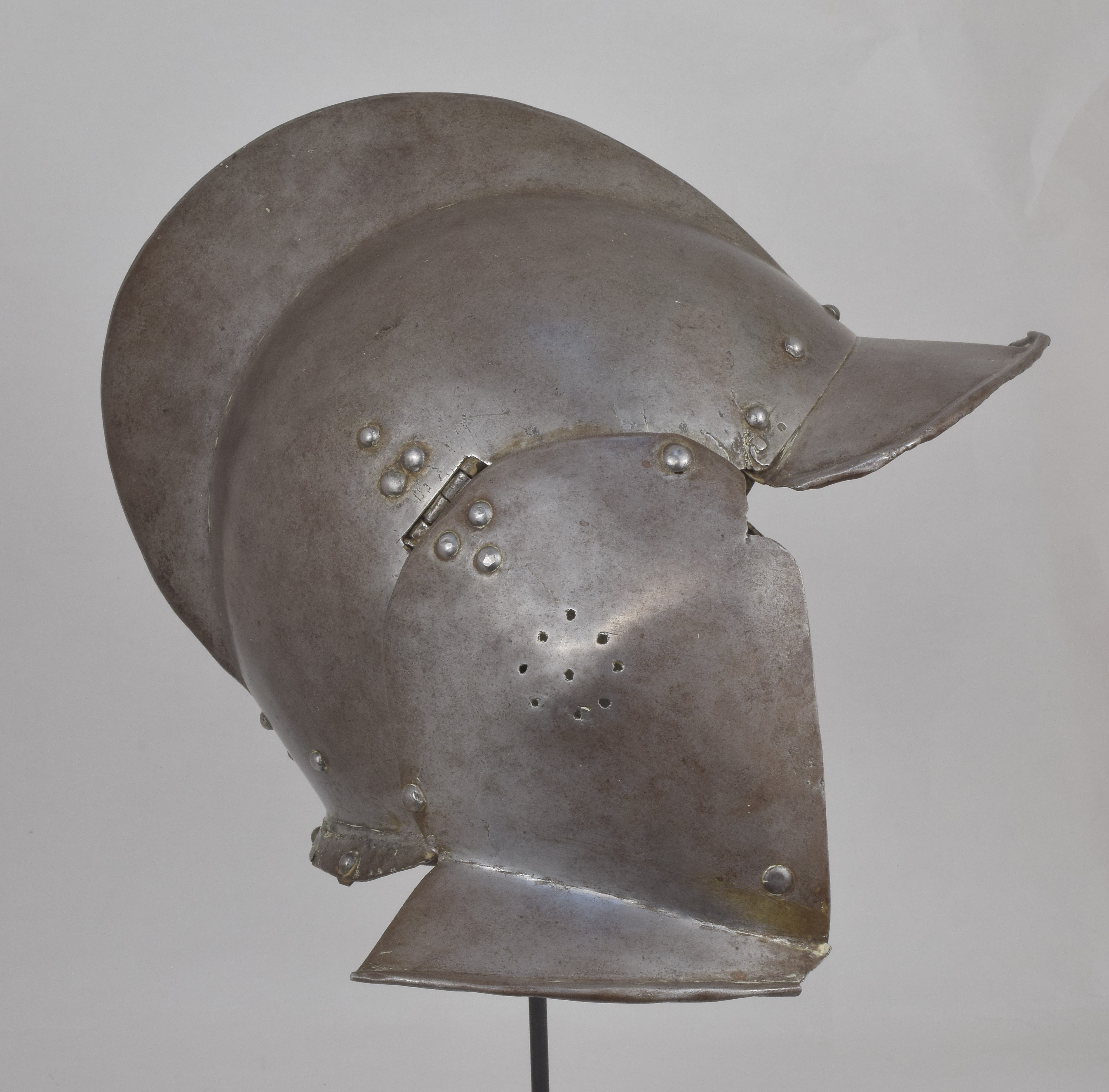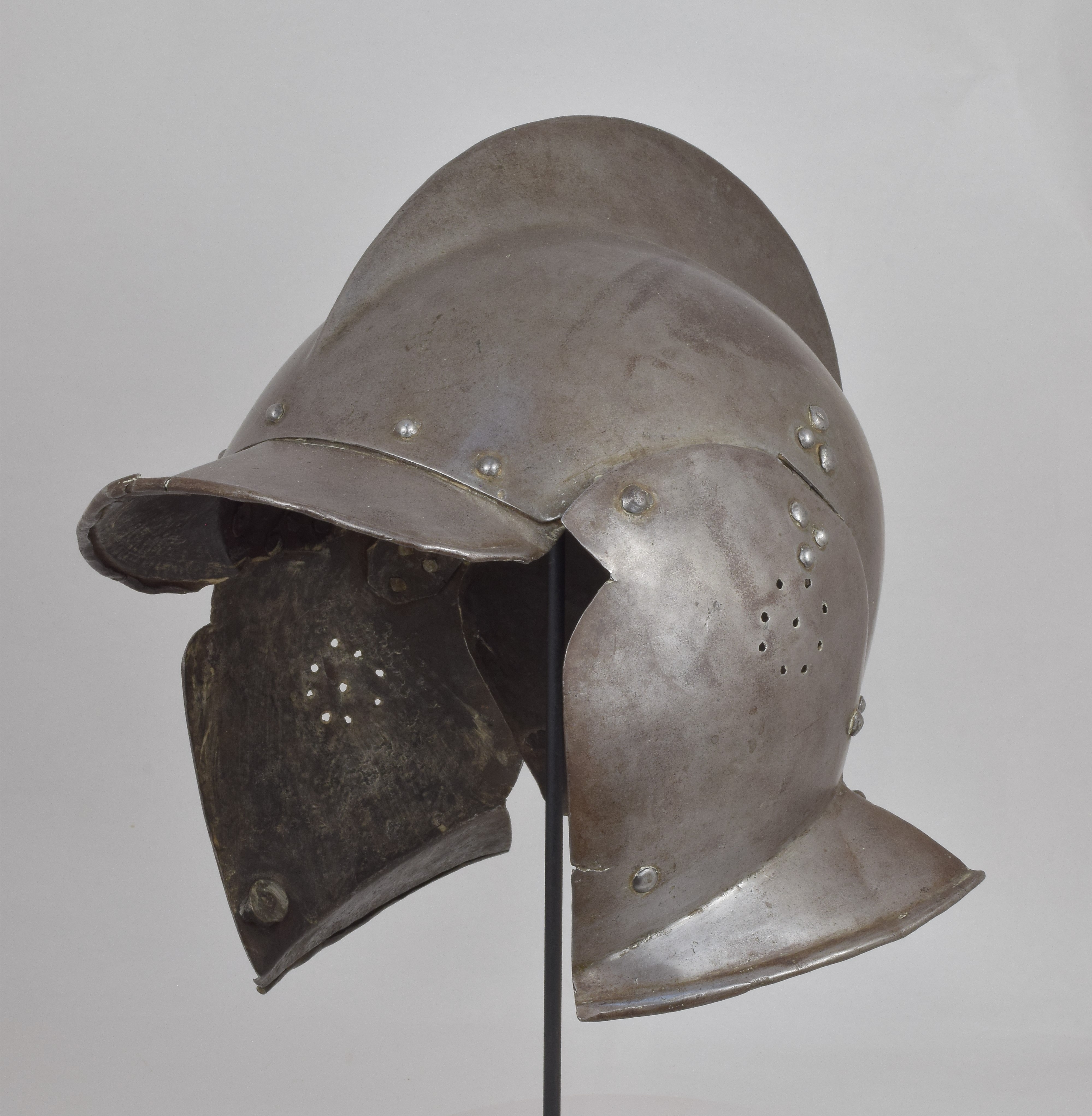 Burgonet. Smooth surface. Nuremberg form. One piece bowl. High, straight comb. Brim formed of a separate piece. Original cheek plates with simple hole decoration. Original (probably from the manufacturing process) patch inside the edge of the skull under the right cheekplate. De-laminations in the bowl and brim. Tail plate missing.
