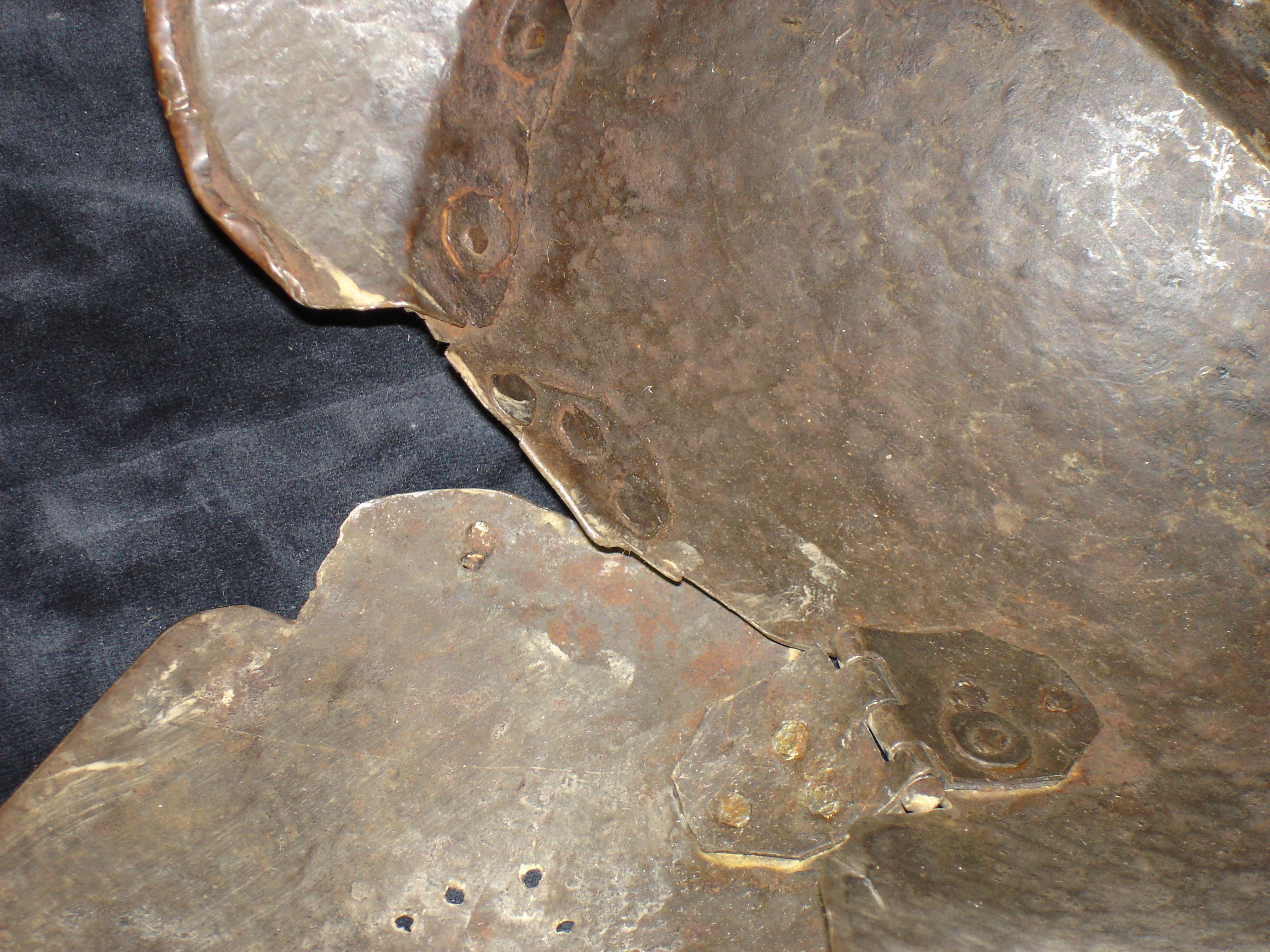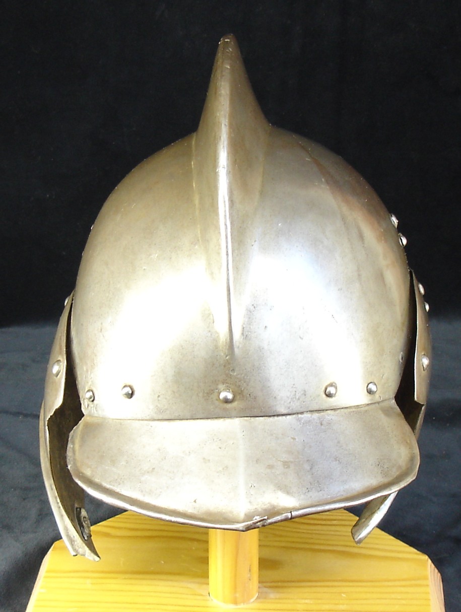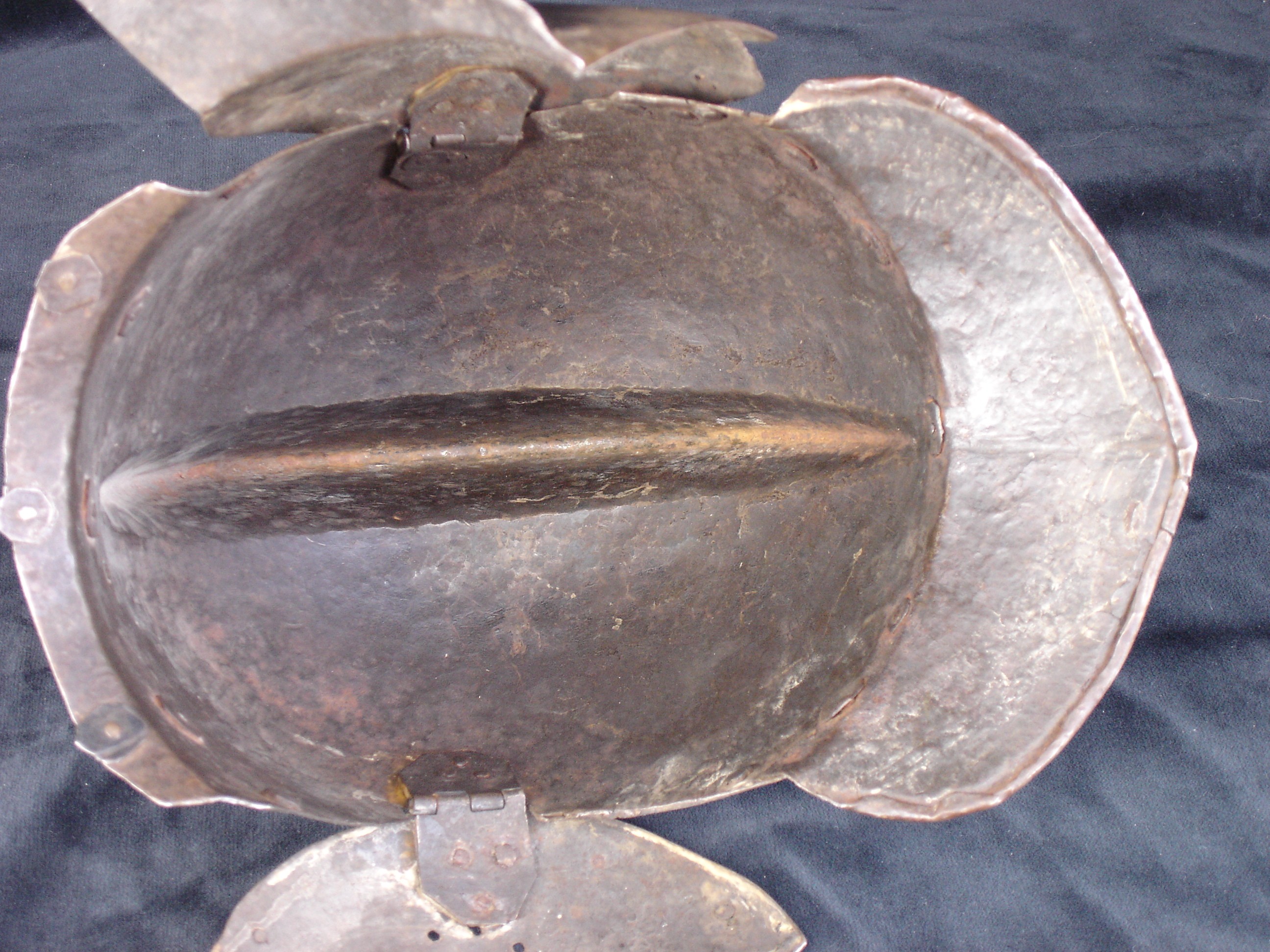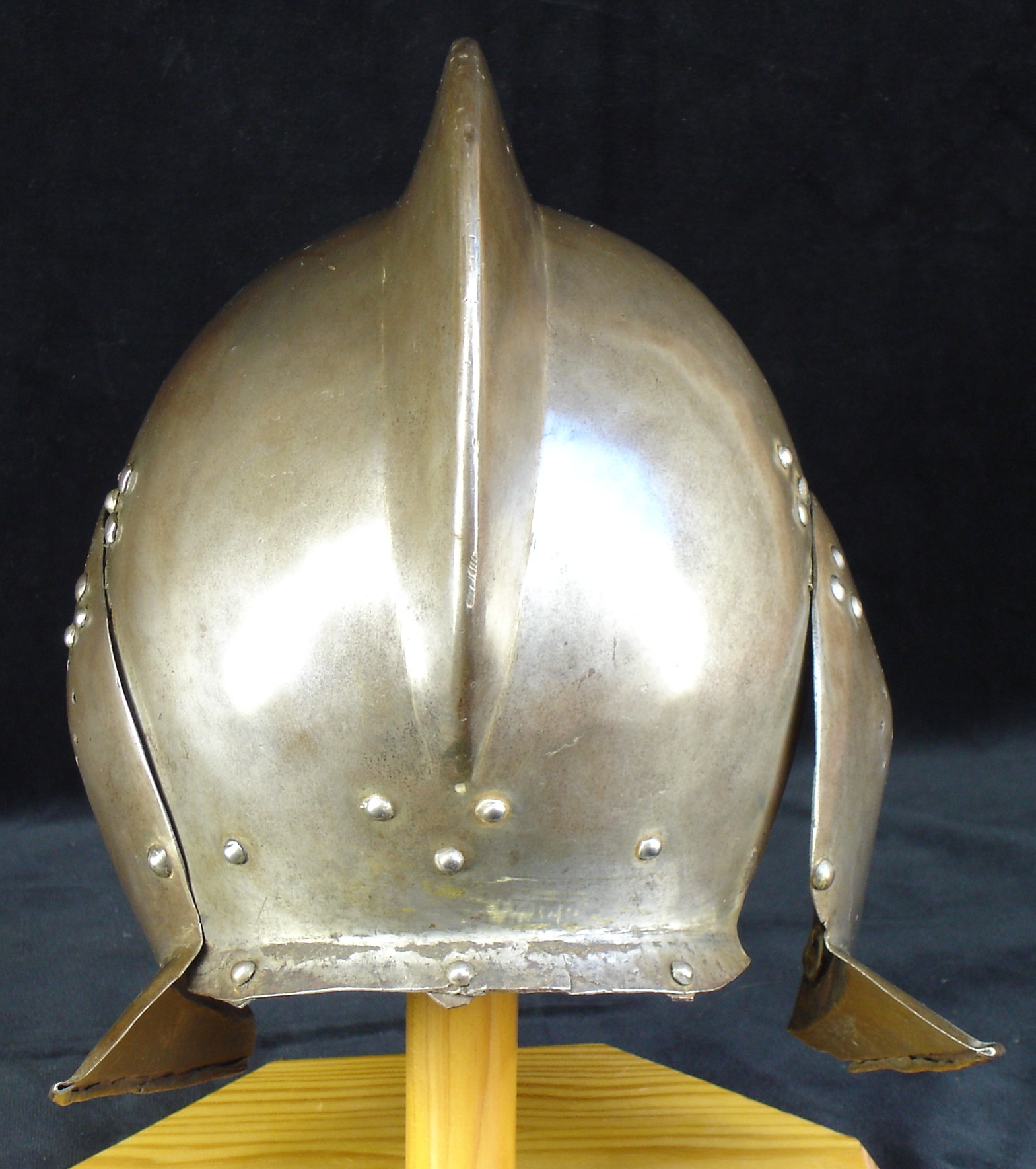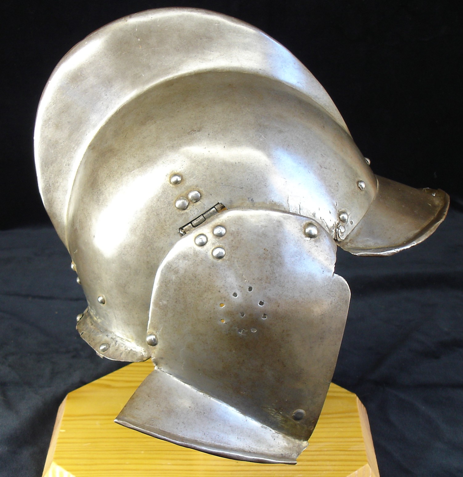 Burgonet. Smooth surface. Nuremberg form. One piece bowl. High, straight comb. Brim formed of a separate piece. Original cheek plates with simple hole decoration. Original (probably from the manufacturing process) patch inside the edge of the skull under the right cheekplate. De-laminations in the bowl and brim. Tail plate missing.