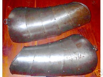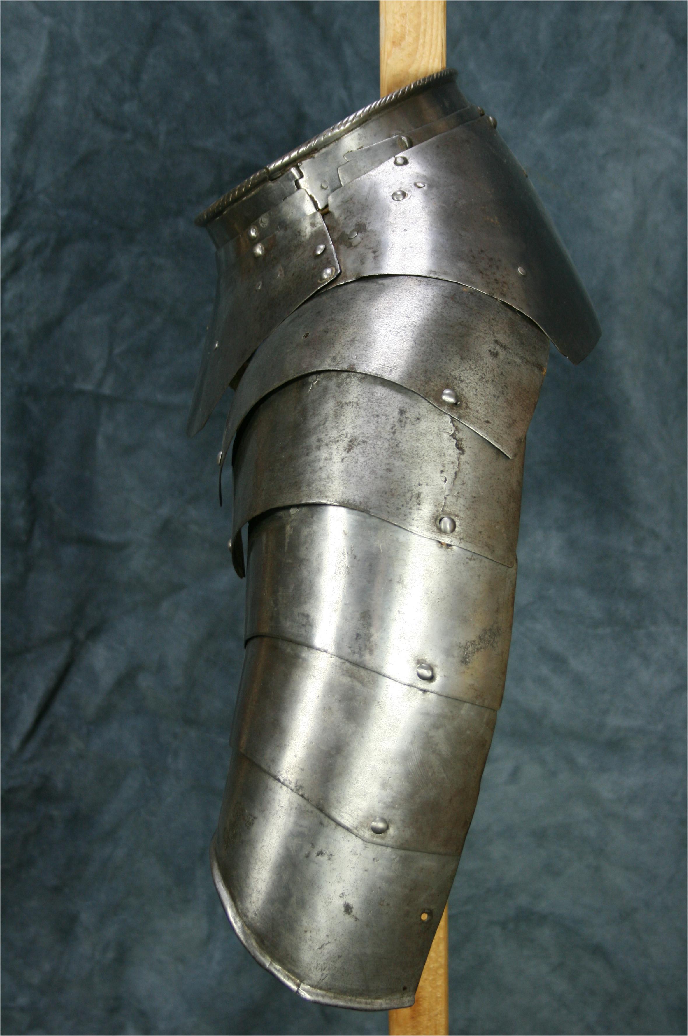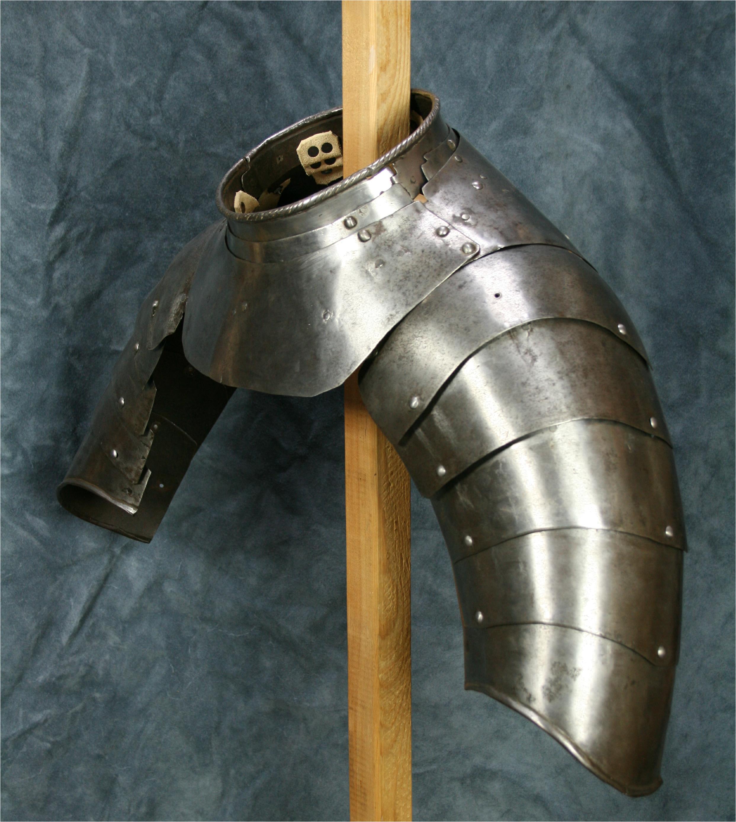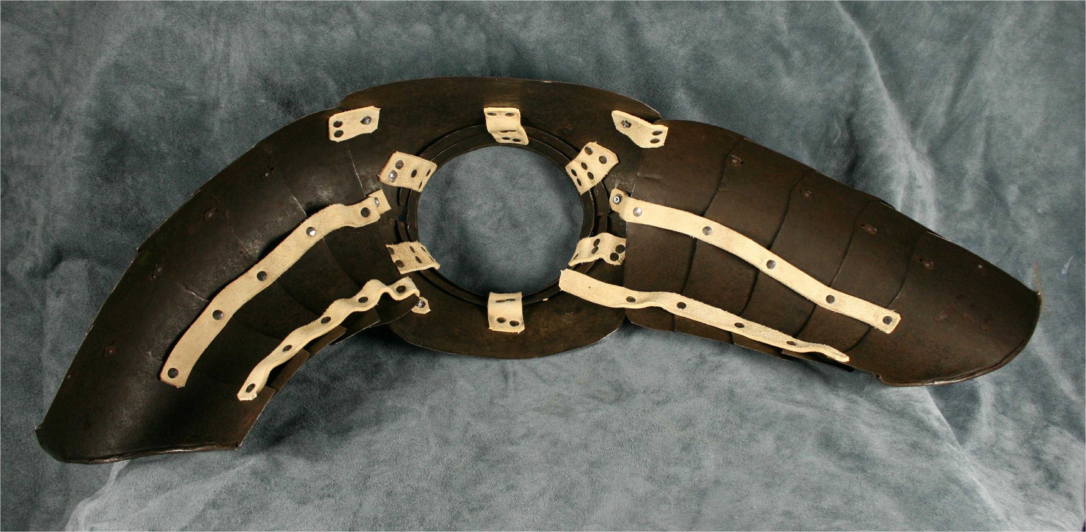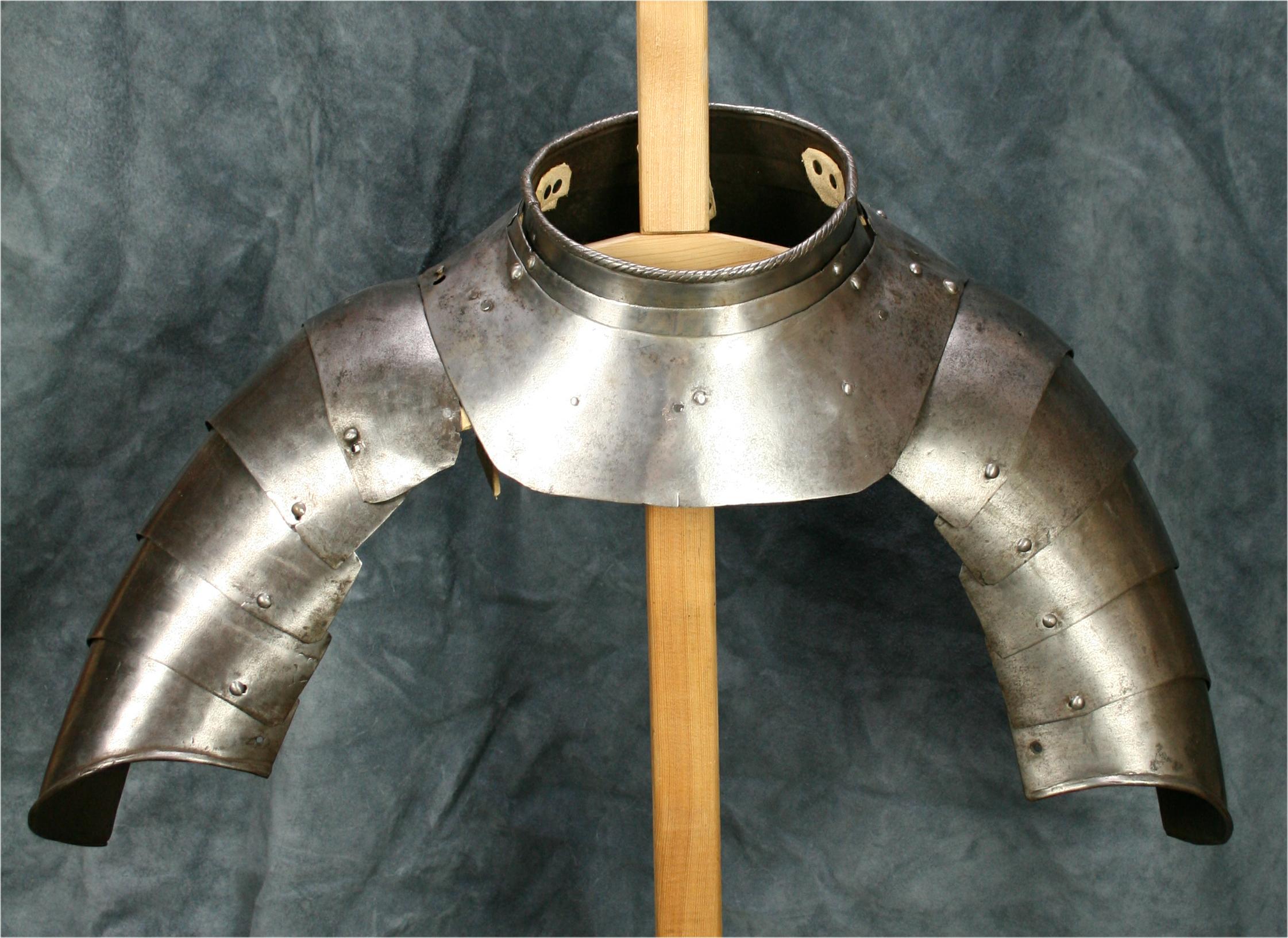 Shoulders for a pair of munions. composed of 5 plates each. bottom plate with rolled edge. When purchased the plates were secured by rivets front and back. They have since been re-leathered with internal buff straps. Comparable items include item number A-118, item number A-138, item number A-23, and the now separate shoulder from item number A-247. Now temporarily secured to item number A-159 which matches well. This unit is now displayed as part of the composed half suit item number A-161.