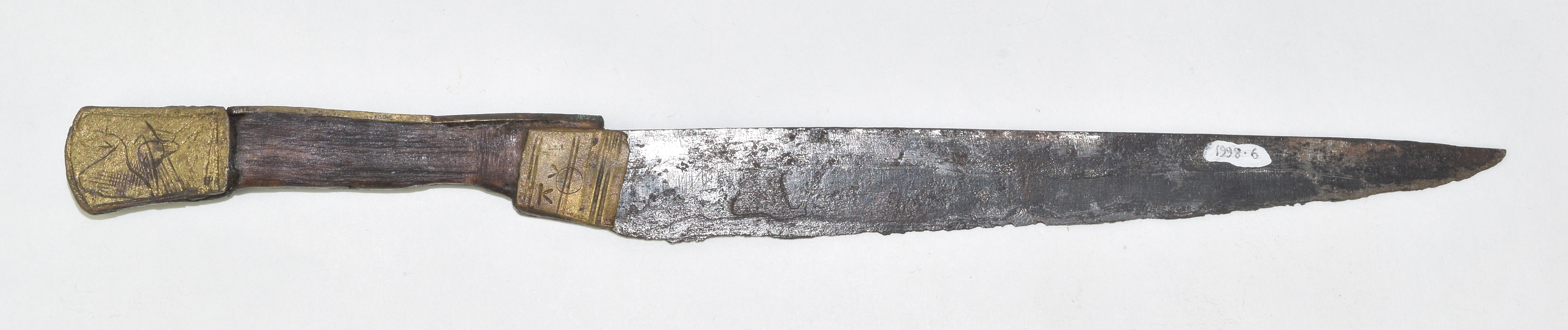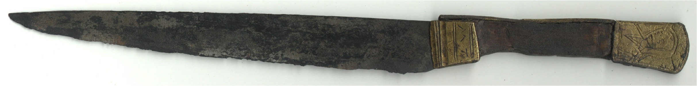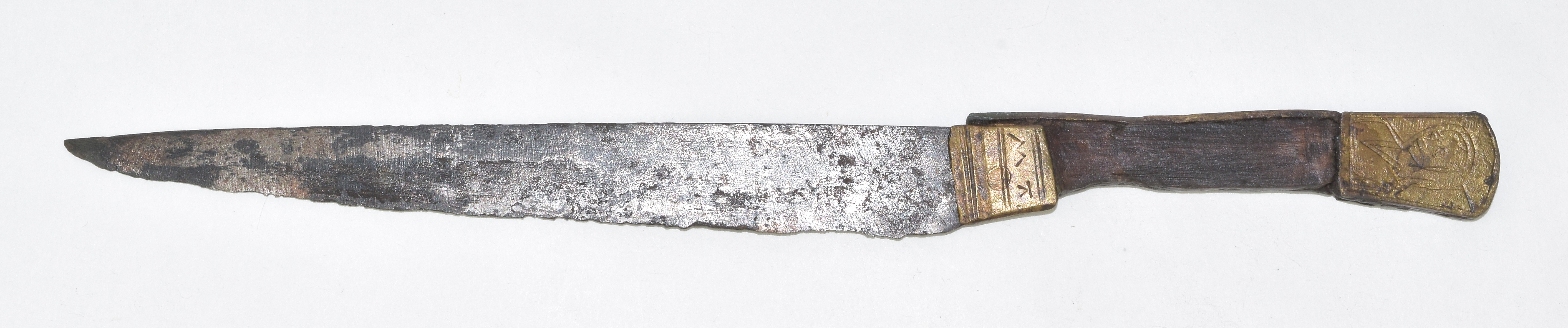 Knife from the Thames, unmarked, brass shoulders engraved AVE MA(RIA?) over both sides, wooden scales and brass surround (missing on lower surface of haft), flat terminal engraved with a woman's head on one side and a hawk on the other. The handle seems a little shorter than usual.