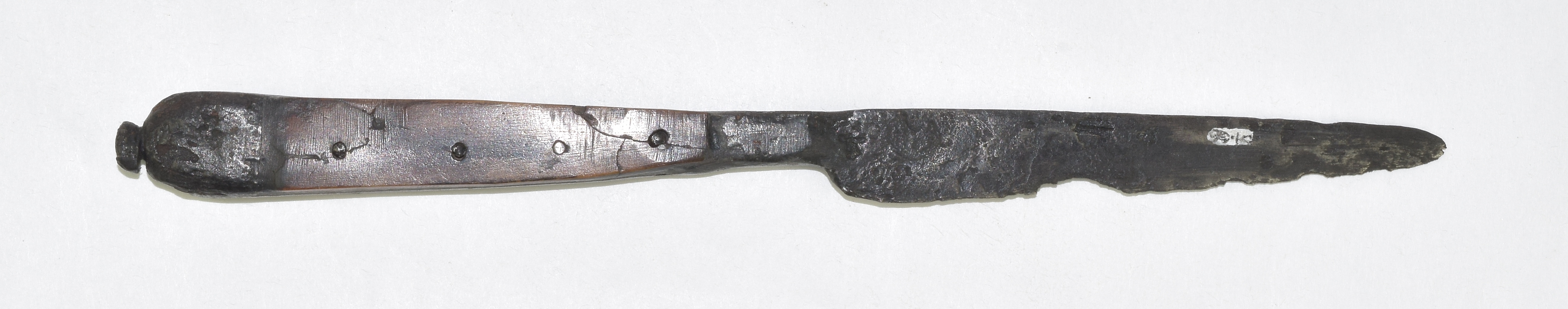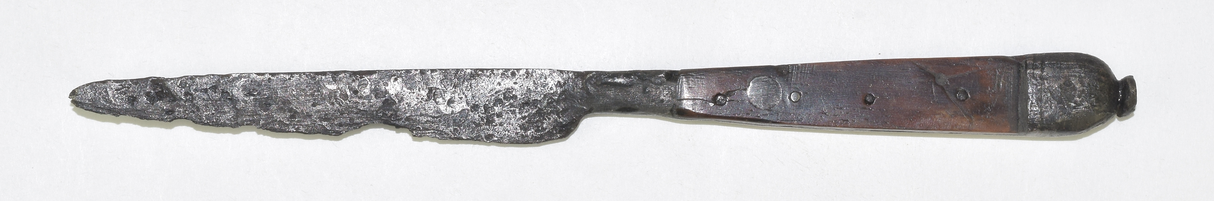 Small knife with bone scales and a round pewter inset on one of the scales. 16th century. baluster and pommel formed in one piece with the blade. Solid tang. Scales riveted to the tang with solid iron rivets.Some cracking and fill on the handle scales, but overall in very nice condition.