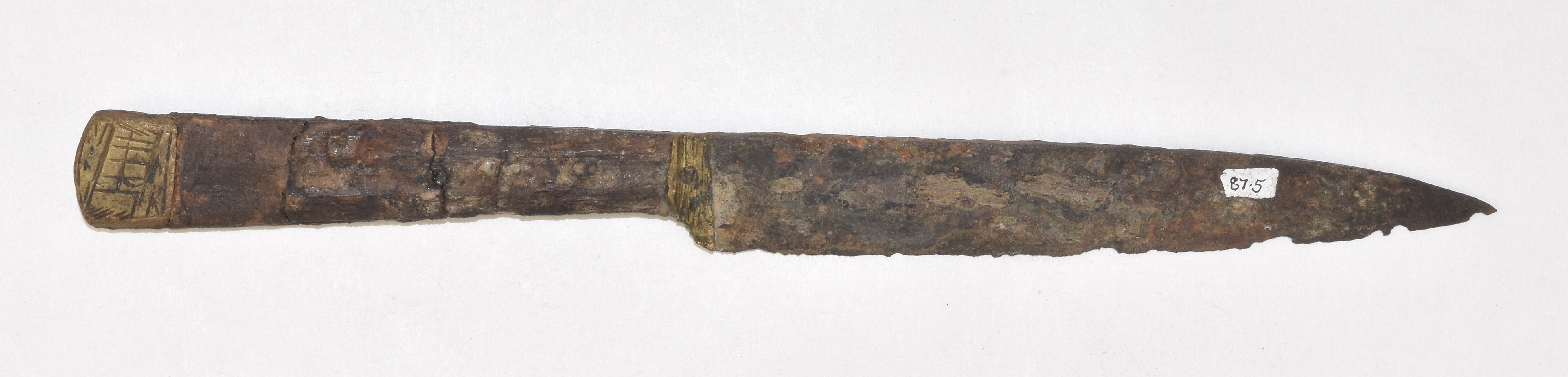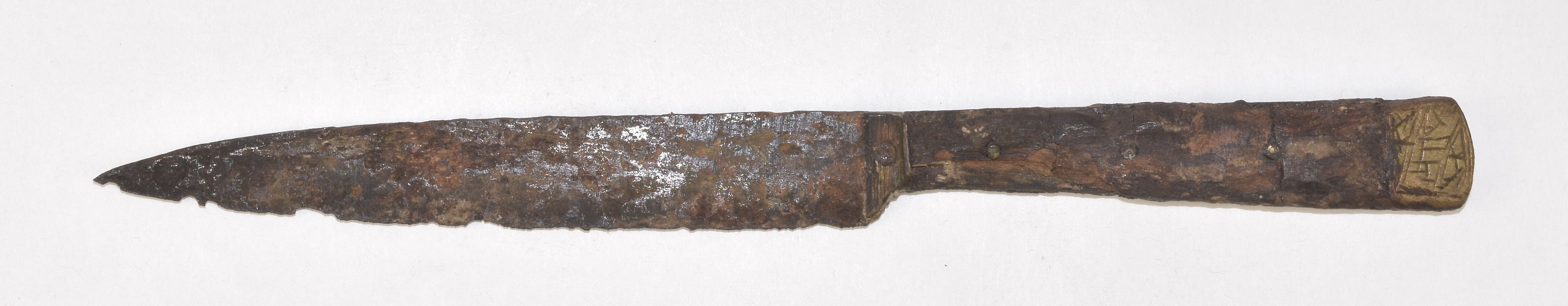 Knife with latten flat plaque finial with crudely (very) engraved image. Two part applied copper alloy bolster. wooden scales. Ex. Col. Simon Moore #87.5