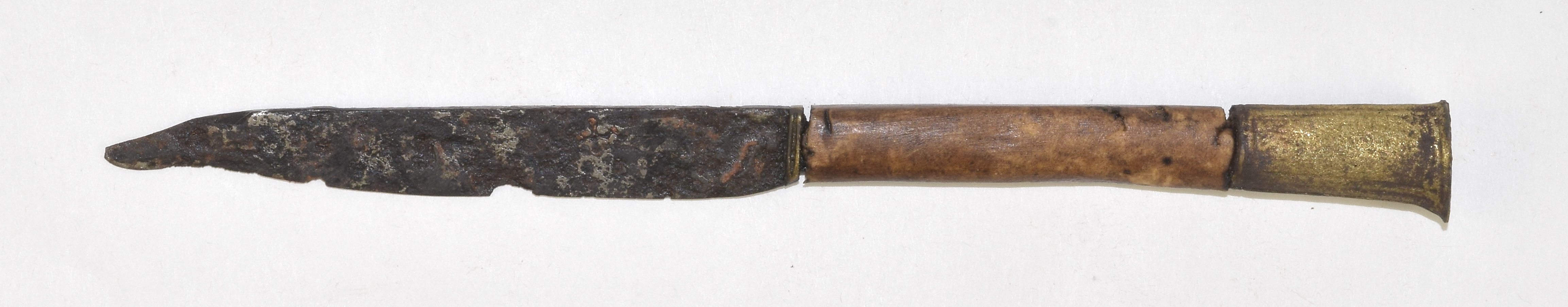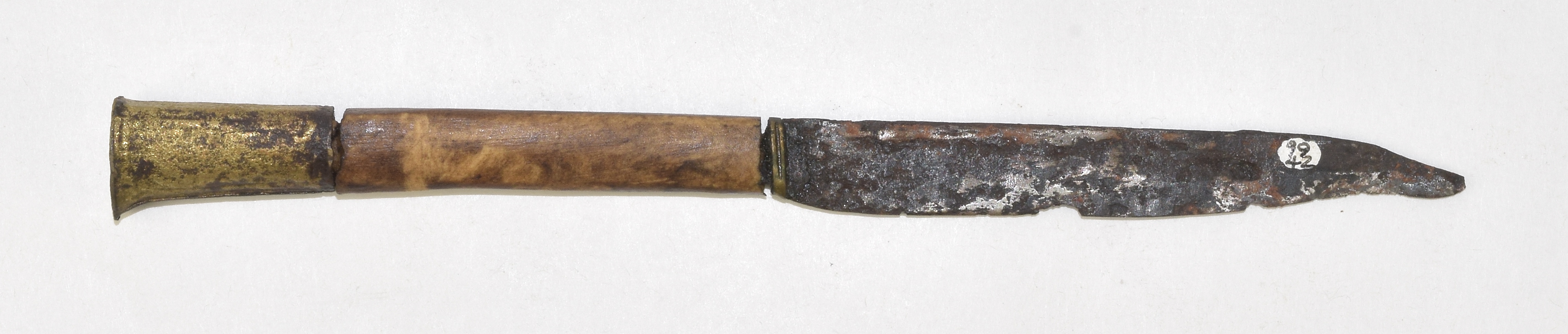 Whittle tang. Delicate separate bolster of copper alloy. One piece likely root wood wooden handle. Boot pommel of tear-drop cross section with engraving. Some linear shrinkage in the wood causing gaps to form. Ex. Col. Simon Moore #99.42