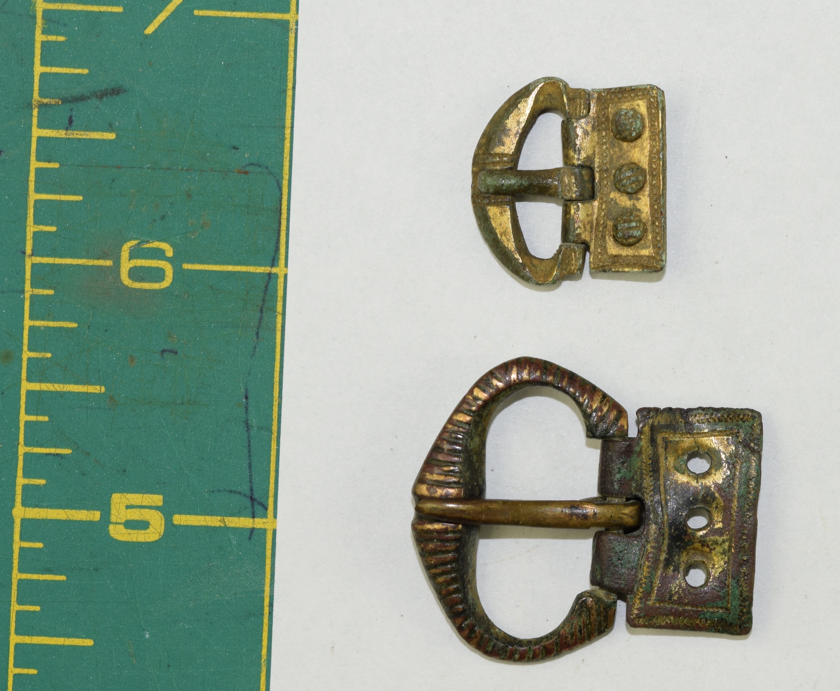 Two buckles with hinged mounting plates. Nice, fine detail. Copper alloy. Gilt.