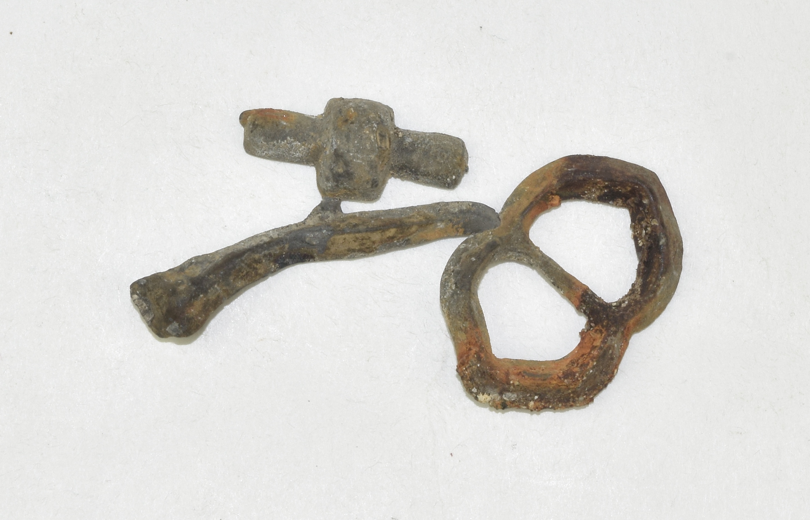 Pewter. Rare survival of unfinished pieces. Includes a buckle and a belt mount complete with the sprue for casting.