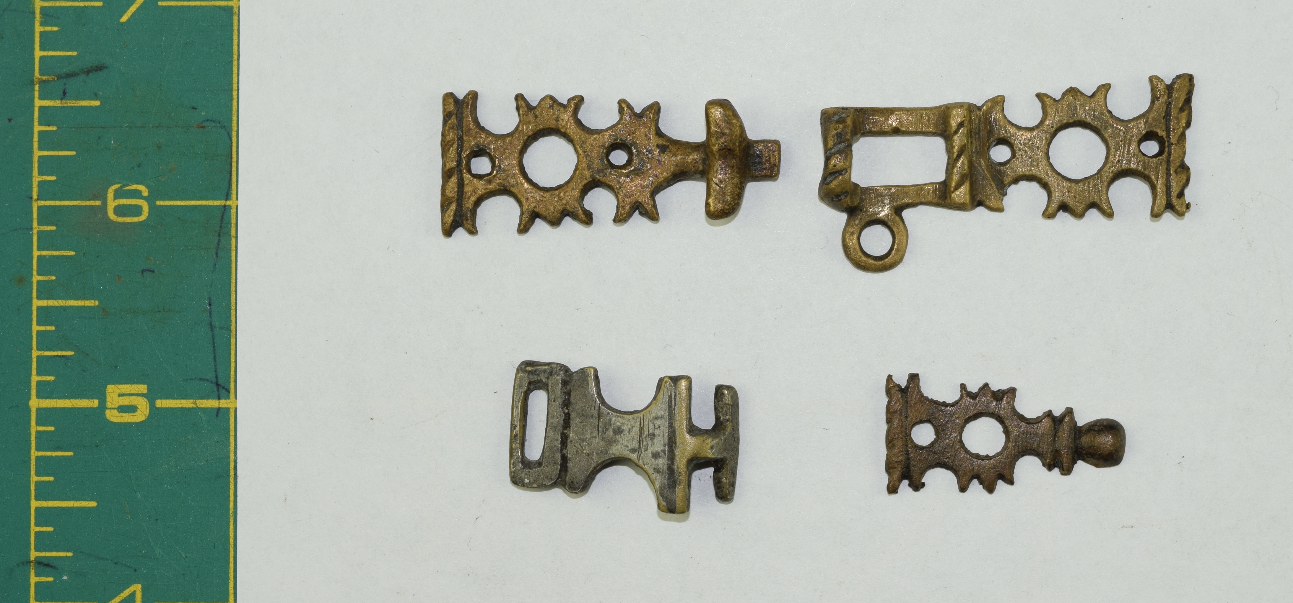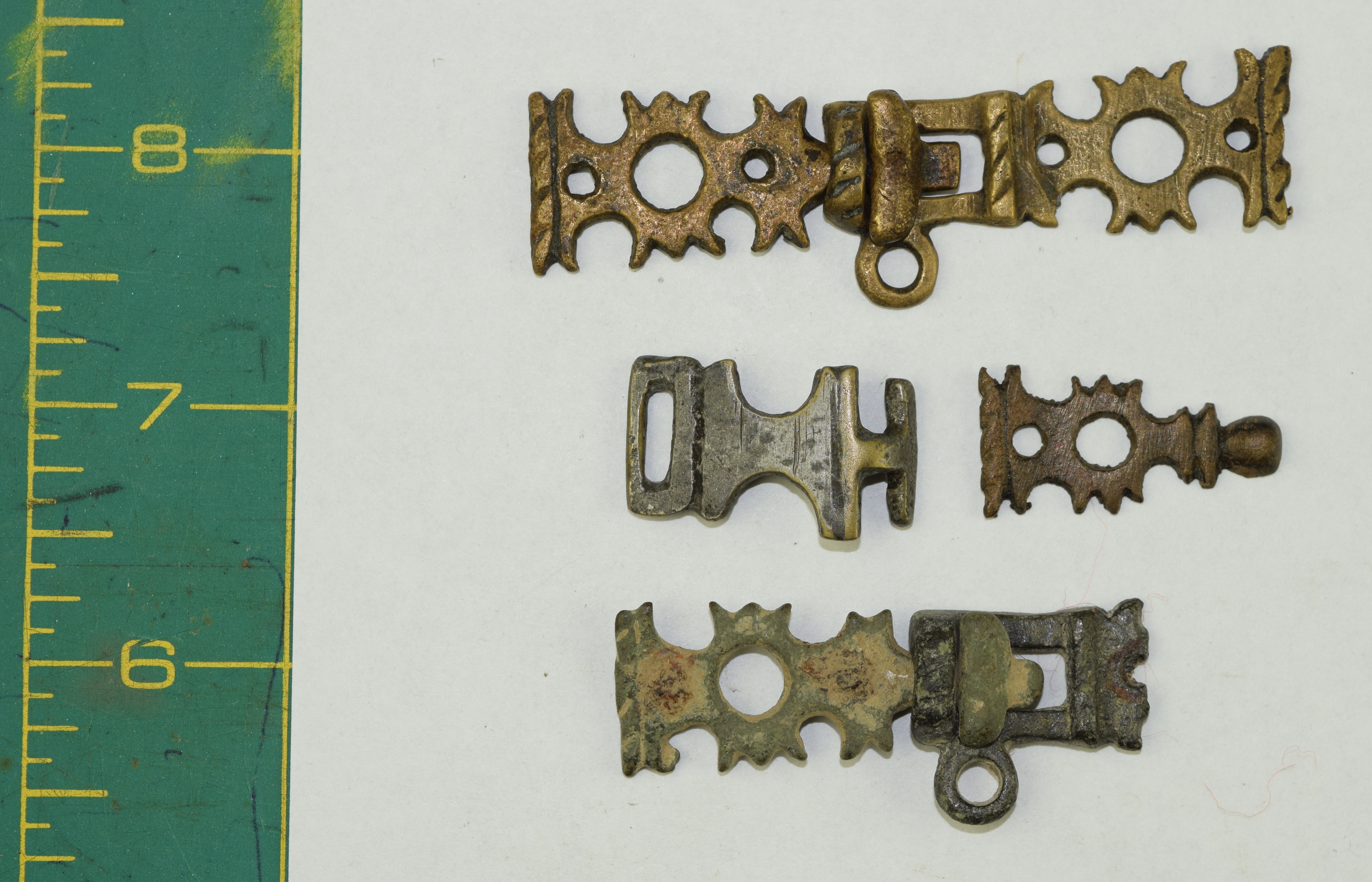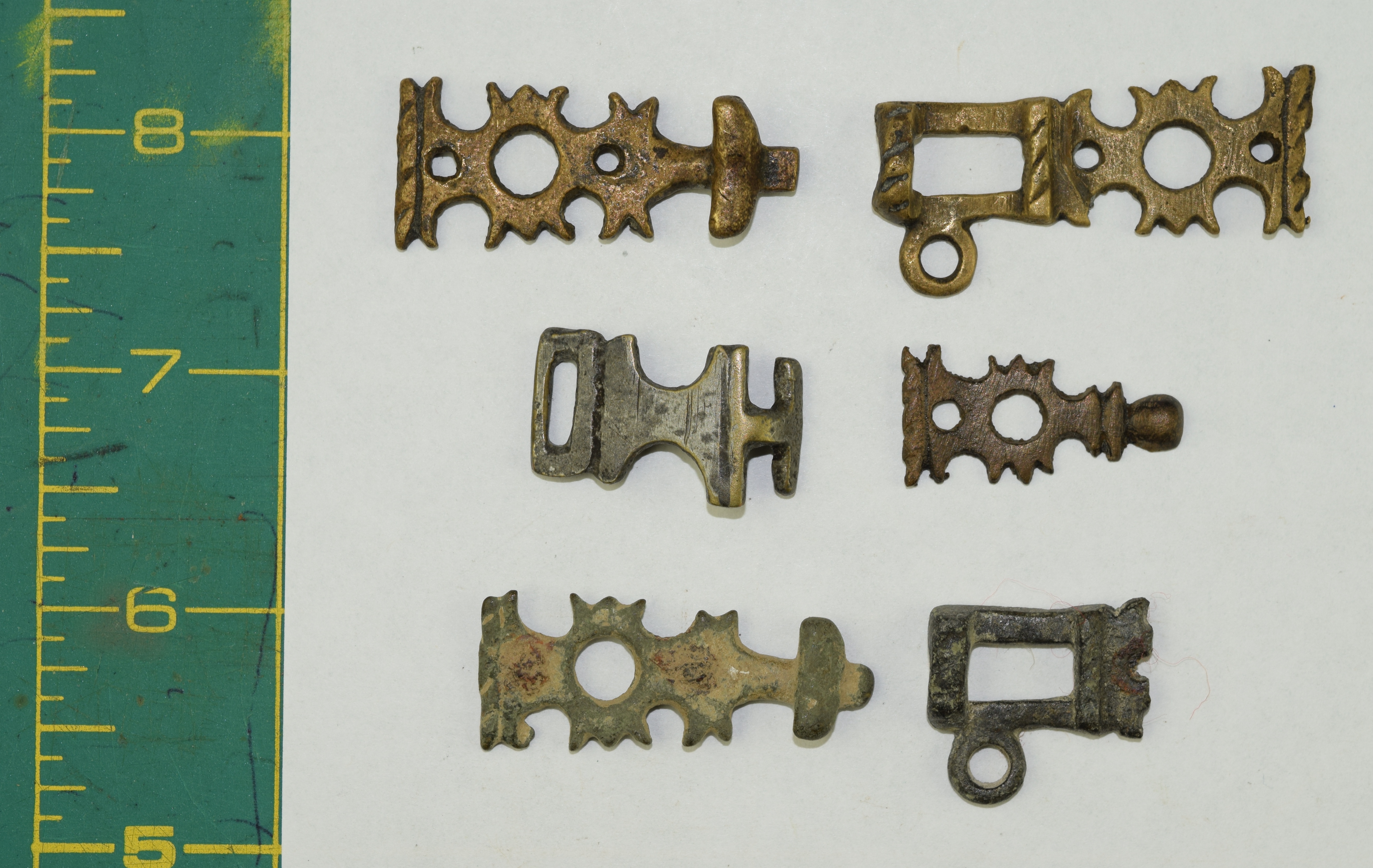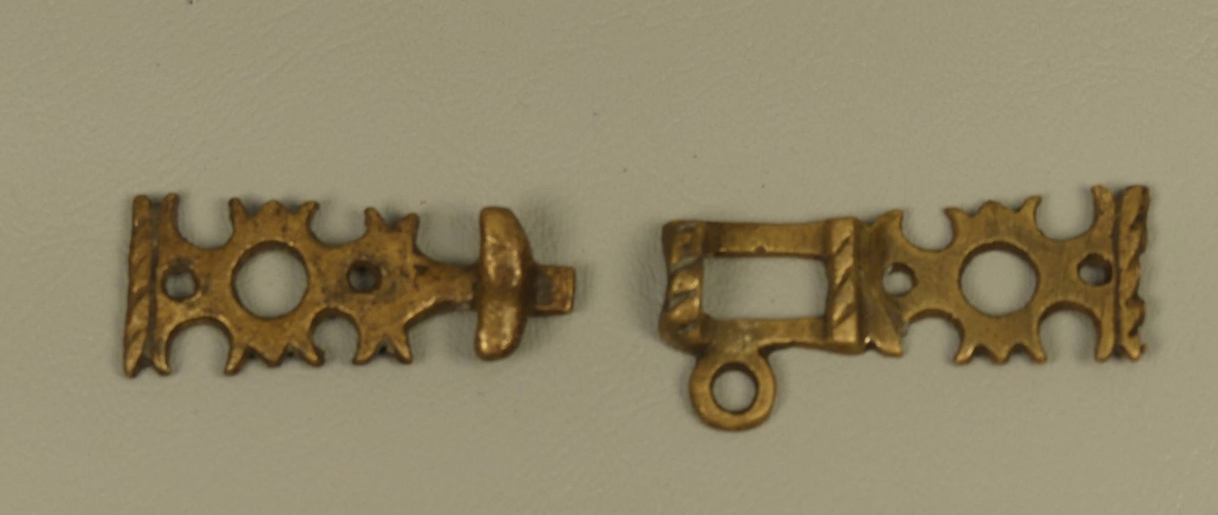 Copper alloy. Formed of two pieces that hook together. Cusped decoration on edges and vertical ridges with roped decoration. Similar to the remaining half recorded in Portable Antiquities Scheme as WAW-1562E8. Read type 1. Read 2008: 208-209, refs: 753-755 Hooked-Clasps and Eyes: A classification and Catalogue of Sharp-or Blunt-hooked claps and Miscellaneous Hooks, Eyes, Rings or Toggles. Together with some related similar parts of others. One apparently tinned. The first set illustrated appear to be complete and an actual pair. In the next line appear two parts (unrelated) the left probably whole and tinned, the right appears to have been the frame portion, but it has lost its rectangular slot. The third row shows another set that at least work together. The left part probably complete, the right missing most of its decorative mount.