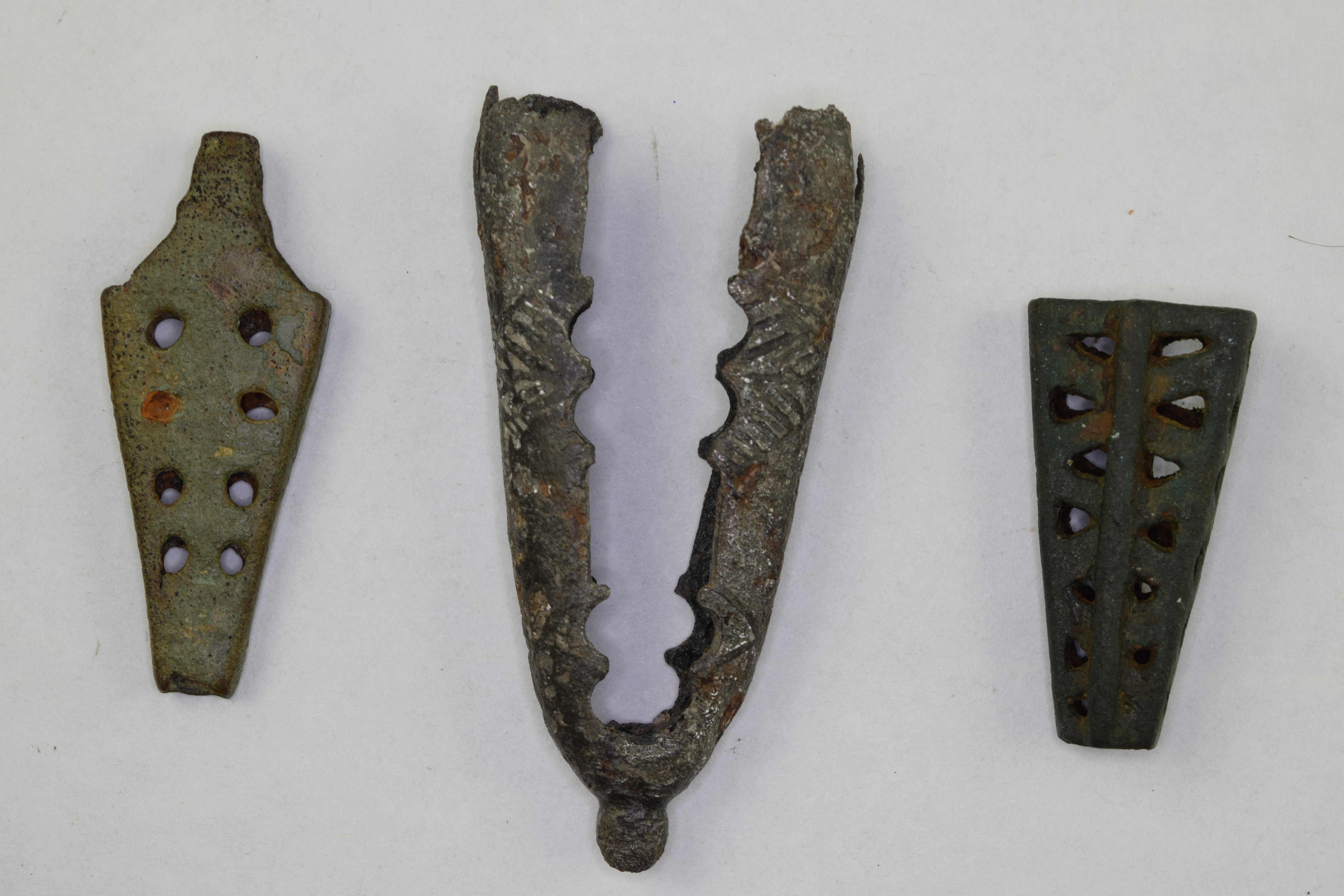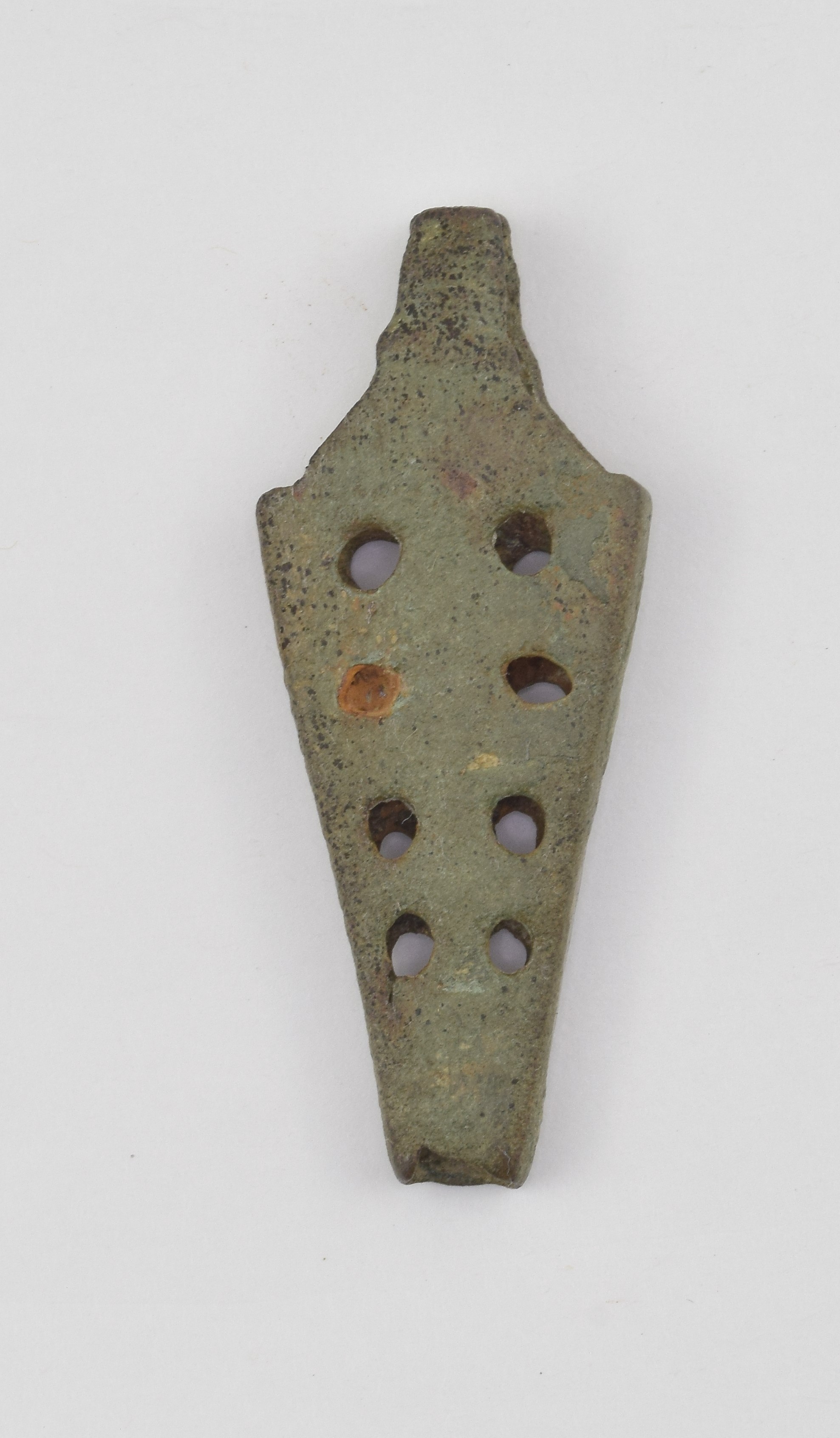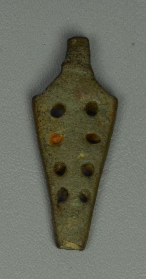 Copper alloy. Tapering to a blunt point. Extended at the center top. Pierced with decorative holes. likely for a dagger. From the Anthony De Reuck collection.