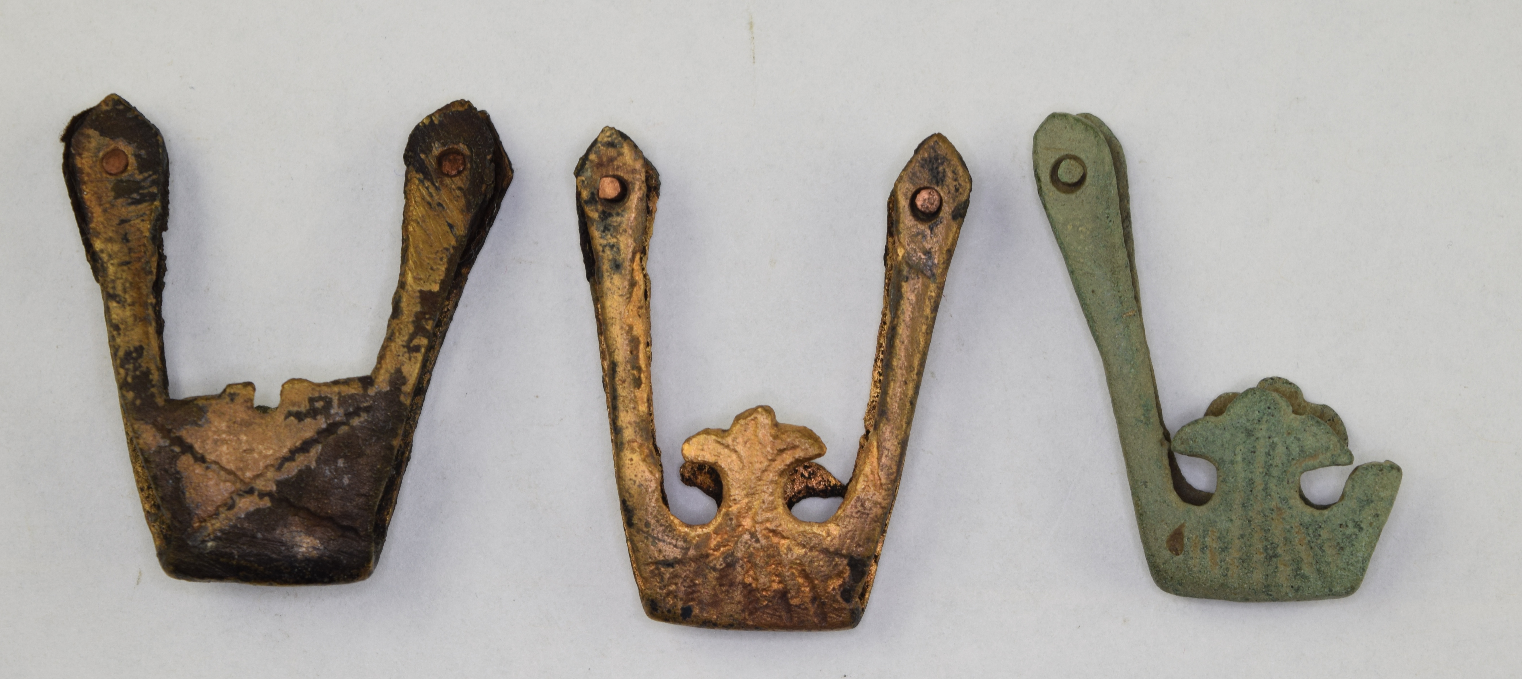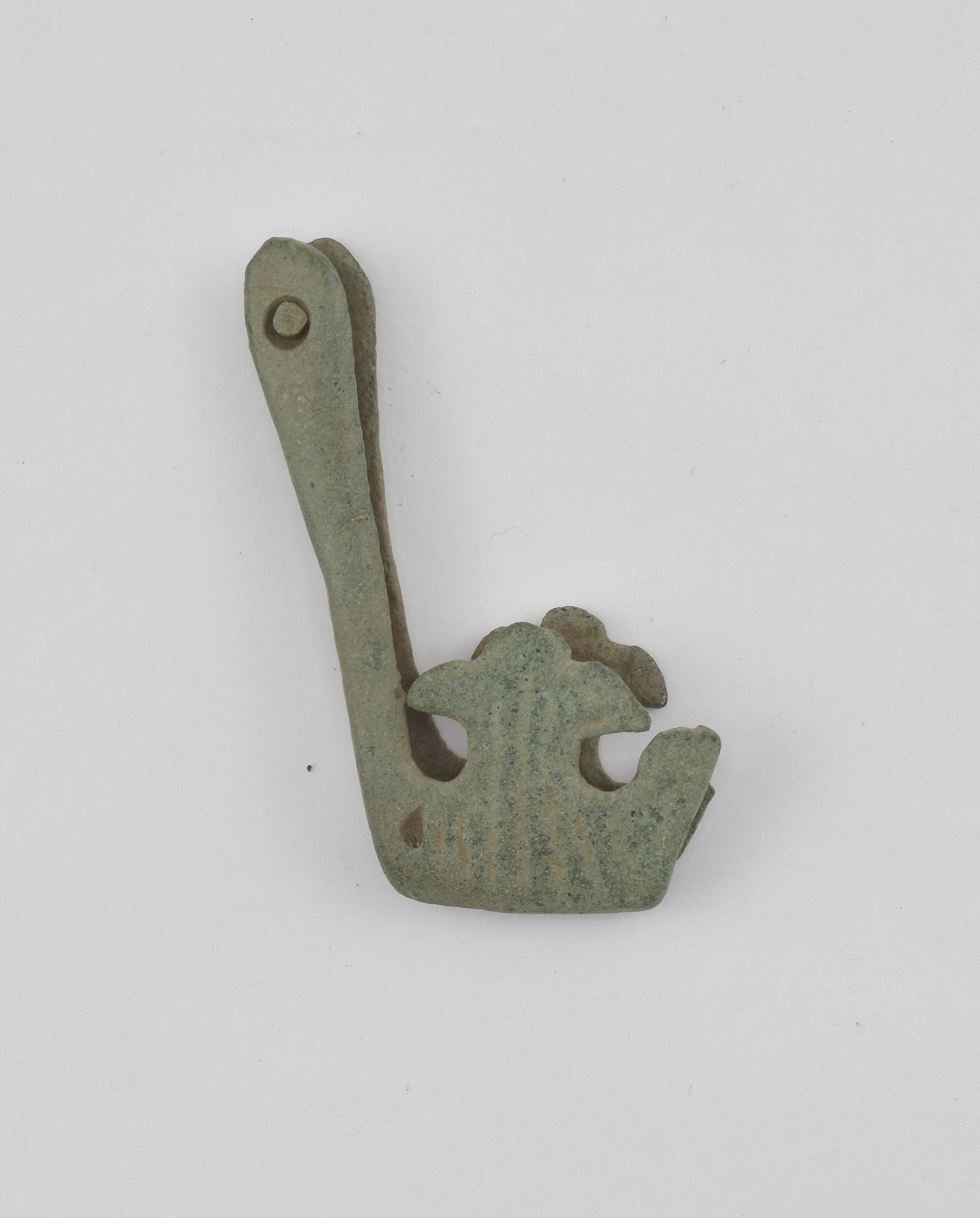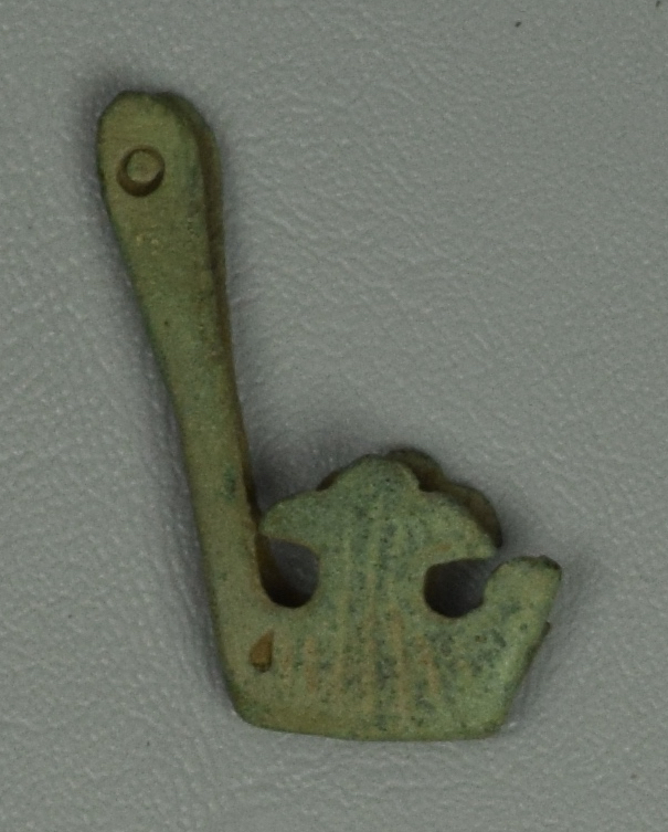 Copper alloy. Trapezoidal with arms formerly extending up both sides. One lost. Engraved with a spray of lines. Center extending to a trefoil. Likely for a dagger. From the Anthony De Reuck collection.