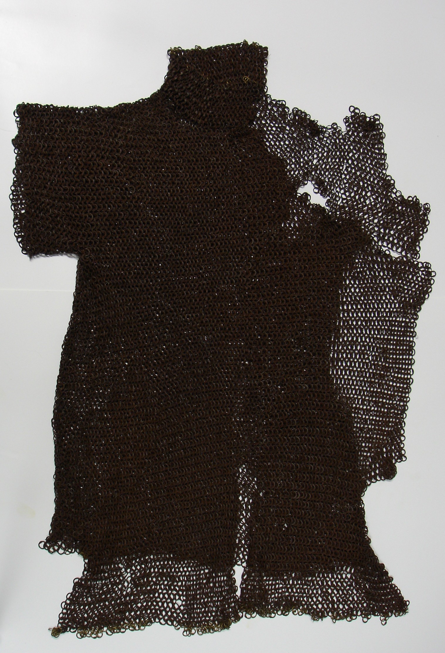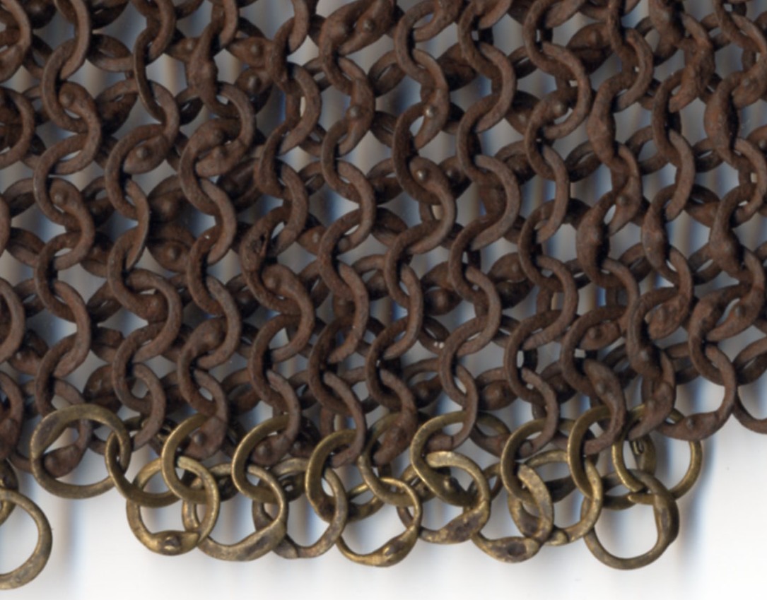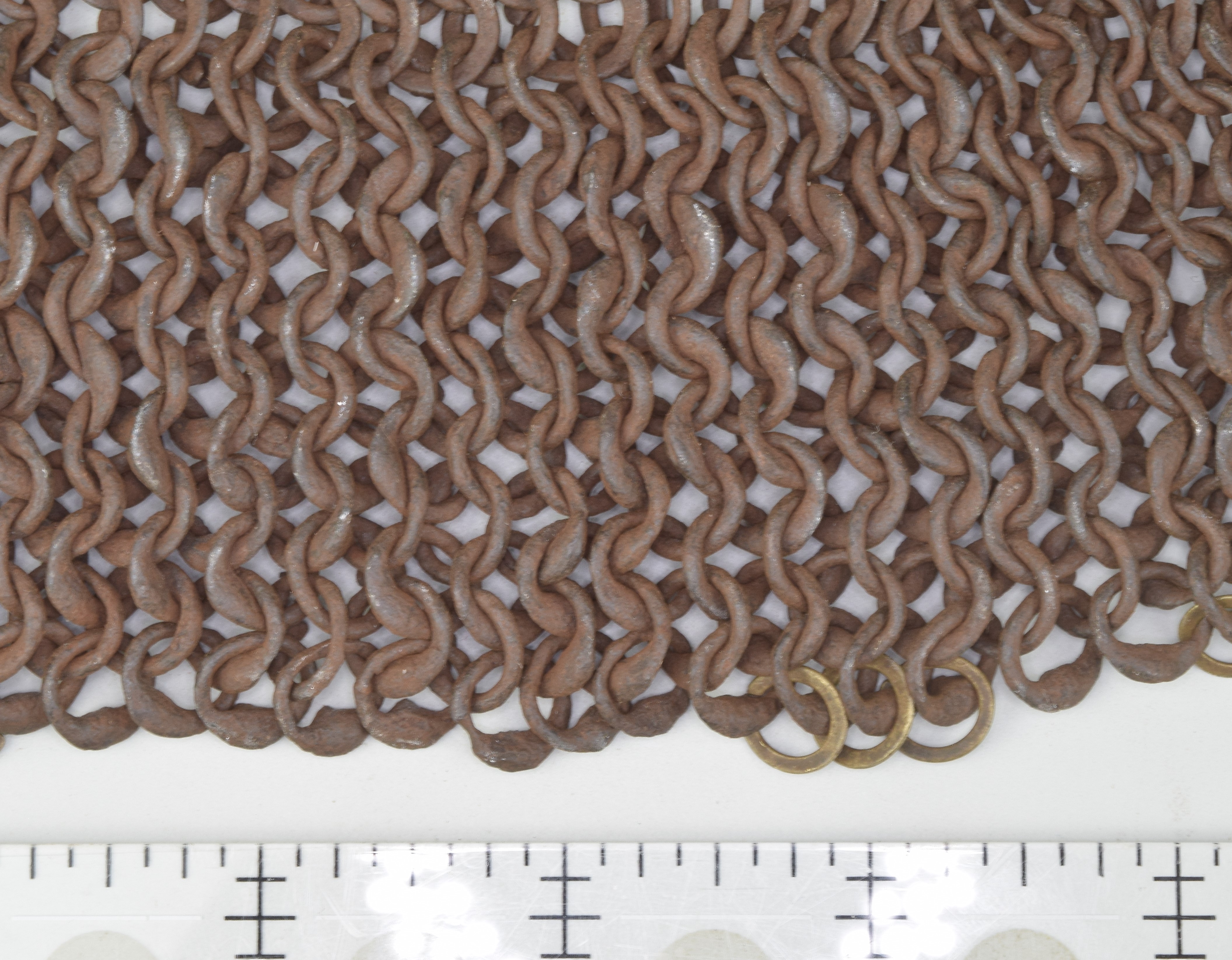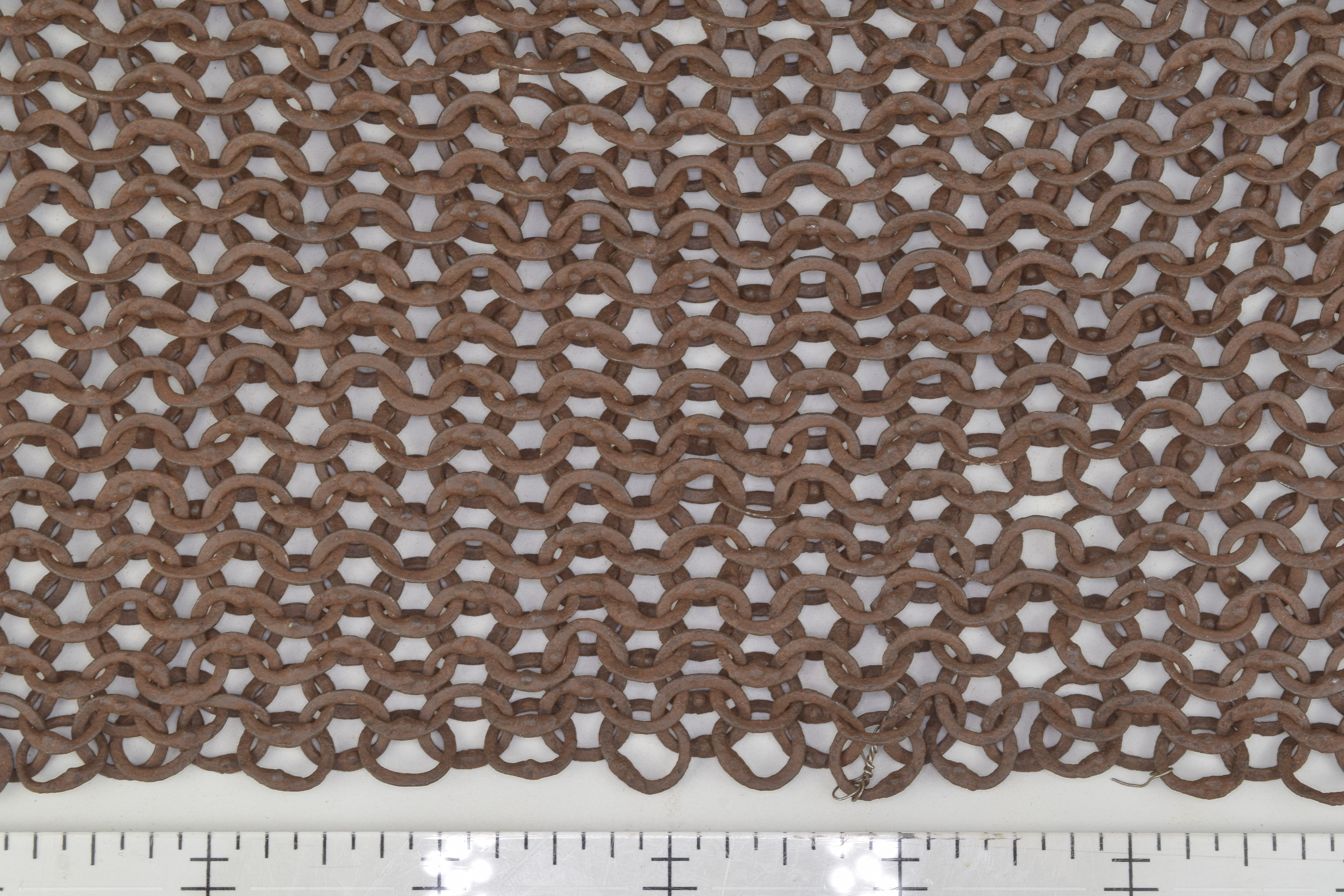 European. Most of a shirt of mail. One sleeve missing. It may have been cut away to form a gusset. The remains of the shirt have very nice details. The shirt includes a standing collar formed of heavier rings. The wire from which these rings were formed is thicker than the main body rings and the overlap for the rivet is even larger. This makes it stiff enough to stand up and protect the neck. The remaining sleeve is short. It does not seem to be due to loss. There are a few brass rings at the lower edge showing that the original form remains. The bottom edge is asymetric. The back is shorter than the front. There is a central slit in the front. Rings with noticeable swelling at the rivet. The rings are vaguely triangular in section. The inside is flat, the front is beveled slightly throughout the ring, more aggresively at the rivet overlap. Some rings obviously attached with wedge rivets, others not as clear. The inside of the rivet is flush with the body of the ring, the outside forms a nice head. Brass rings at the bottom edge have iron rivets. Measurements in mm, but the scale shown in the images is in inches. The last image includes some nice details near the center including a ring with overlapped but un-punched, a ring where most of the rivet is lost so the wedge shaped hole is visible and a bent ring. It appears that there are several un-punched rings in this area, they may represent patching.