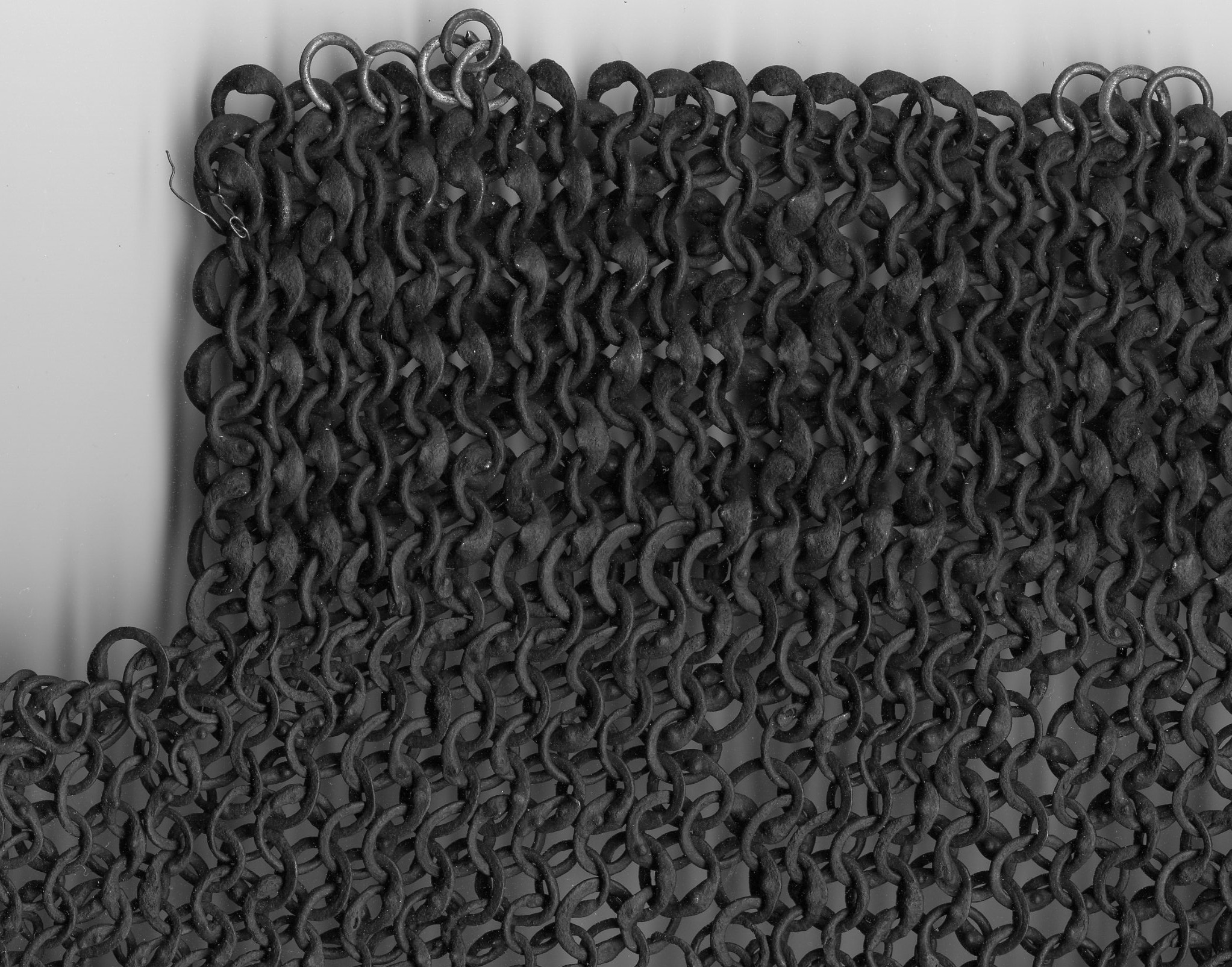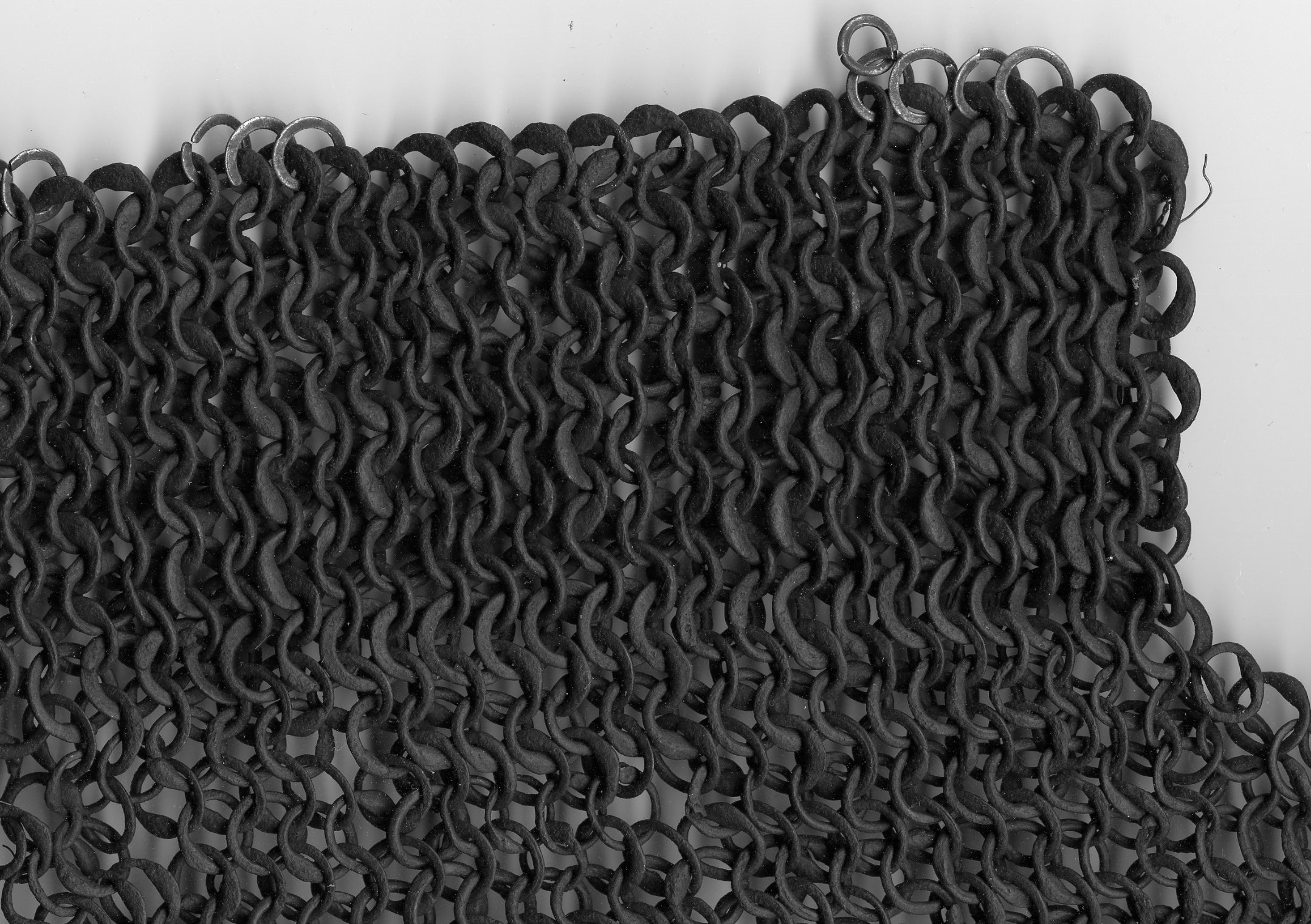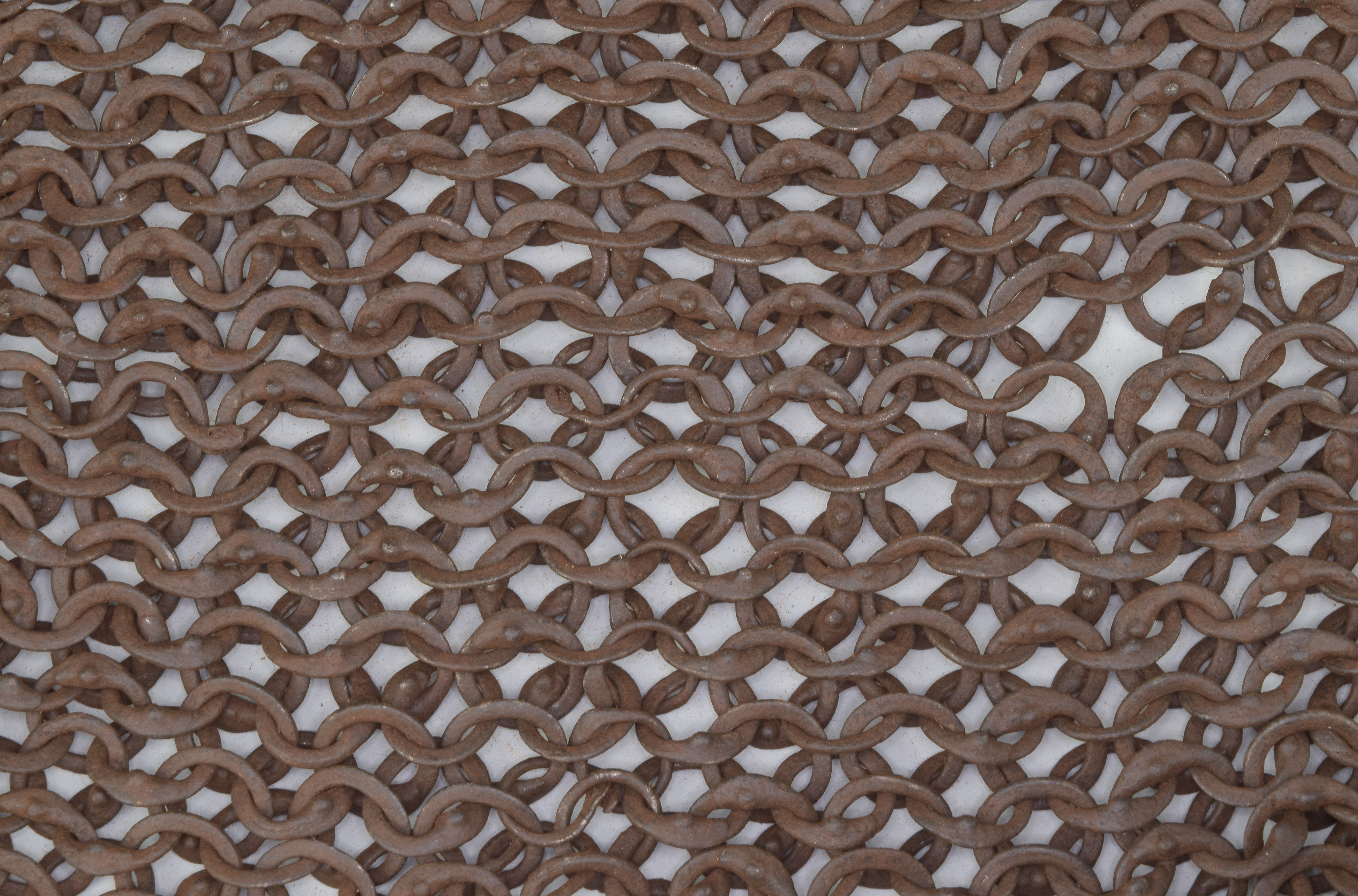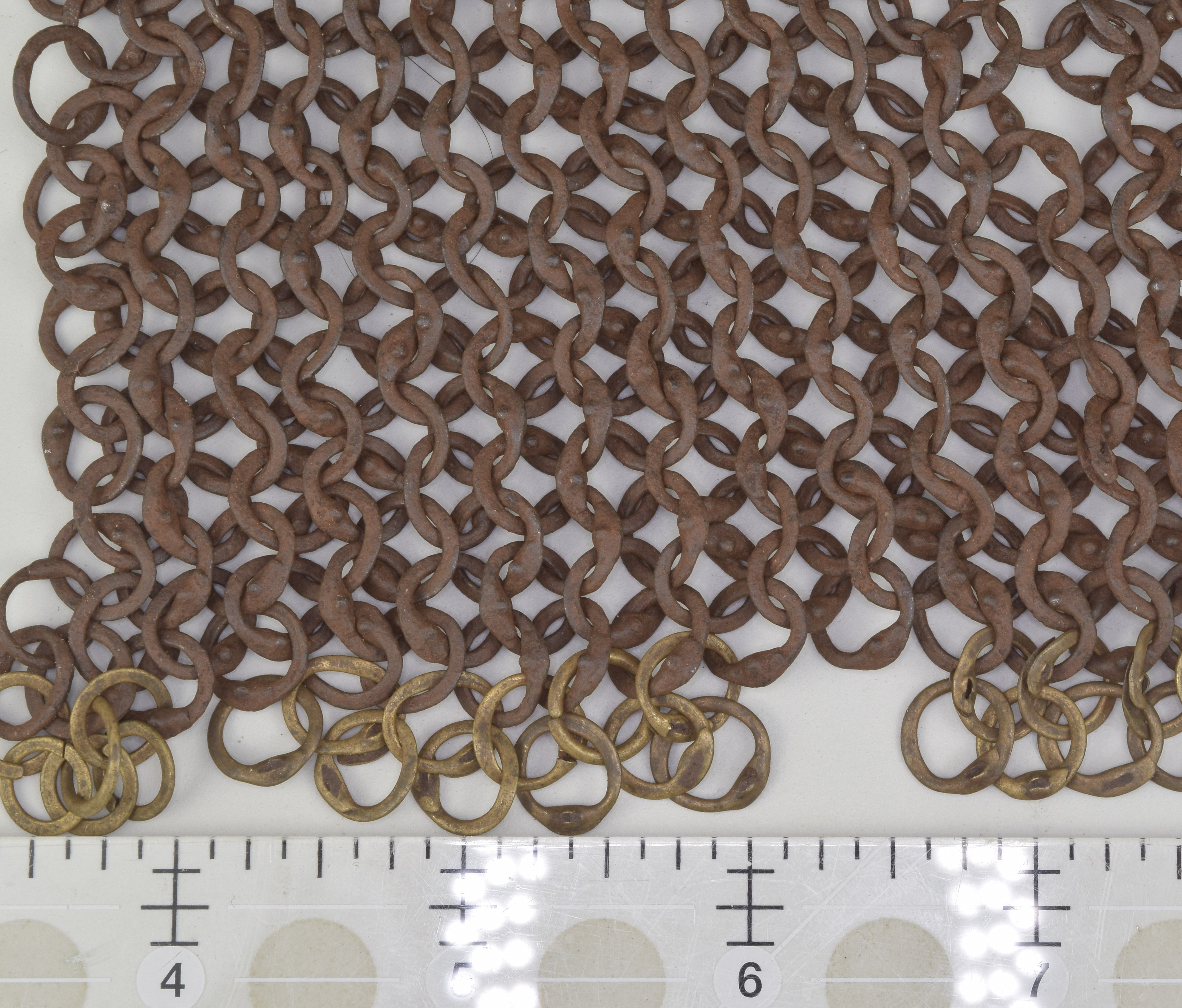 European. Most of a shirt of mail. One sleeve missing. It may have been cut away to form a gusset. The remains of the shirt have very nice details. The shirt includes a standing collar formed of heavier rings. The wire from which these rings were formed is thicker than the main body rings and the overlap for the rivet is even larger. This makes it stiff enough to stand up and protect the neck. The remaining sleeve is short. It does not seem to be due to loss. There are a few brass rings at the lower edge showing that the original form remains. The bottom edge is asymetric. The back is shorter than the front. There is a central slit in the front. Rings with noticeable swelling at the rivet. The rings are vaguely triangular in section. The inside is flat, the front is beveled slightly throughout the ring, more aggresively at the rivet overlap. Some rings obviously attached with wedge rivets, others not as clear. The inside of the rivet is flush with the body of the ring, the outside forms a nice head. Brass rings at the bottom edge have iron rivets. Measurements in mm, but the scale shown in the images is in inches. The last image includes some nice details near the center including a ring with overlapped but un-punched, a ring where most of the rivet is lost so the wedge shaped hole is visible and a bent ring. It appears that there are several un-punched rings in this area, they may represent patching.