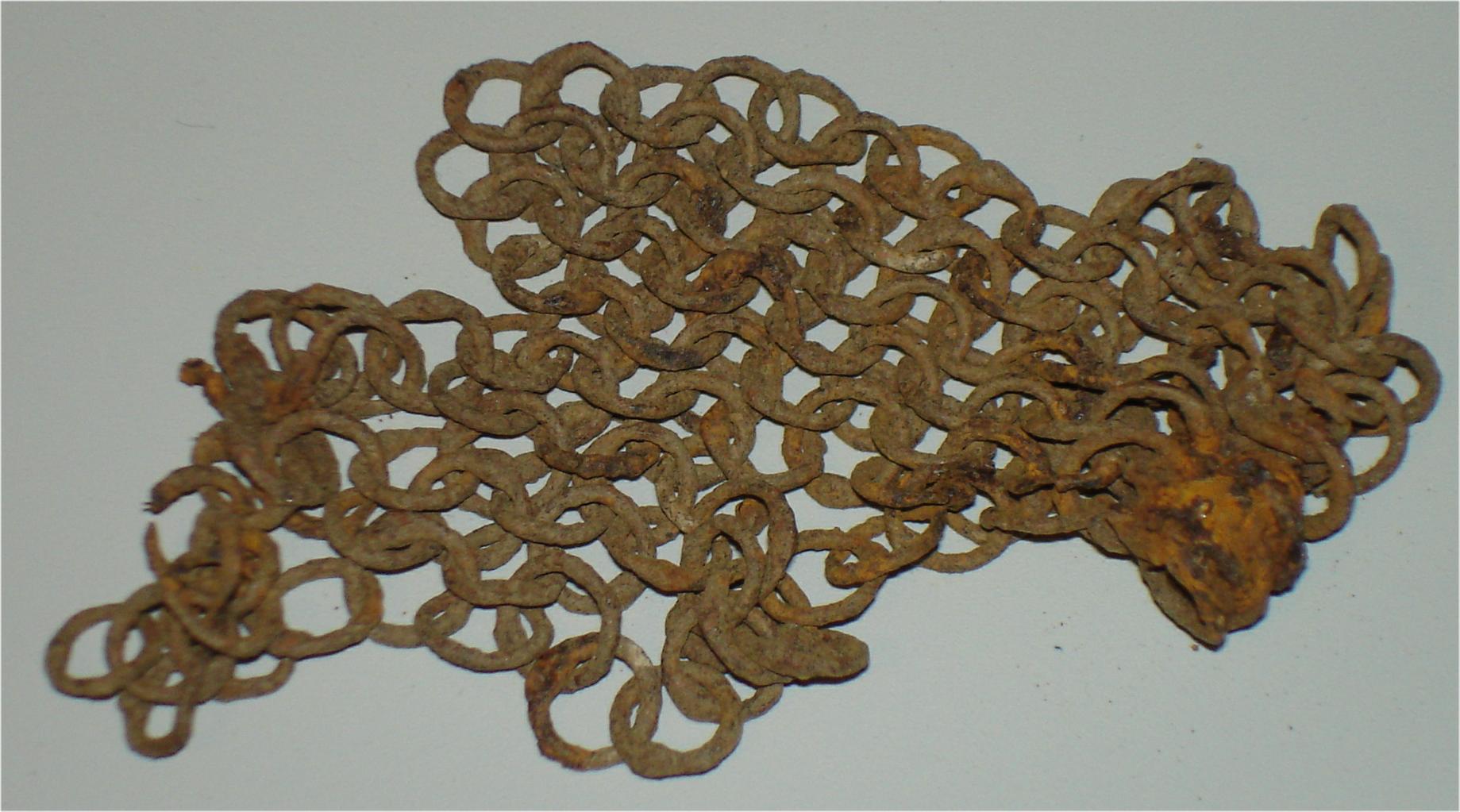 Piece of mail. Additional comment by Mart Shearer based on the image: the corroded U-shaped piece appears similar to the "hangers" used on mail collars to keep the overlapped section in place. I propose the lower right corner is the top of the collar." I think that in person investigation just indicates that the blob consists of rings that are semi-fused due to rust. This may still be the top of a collar, but I don't see signs of a hanger.