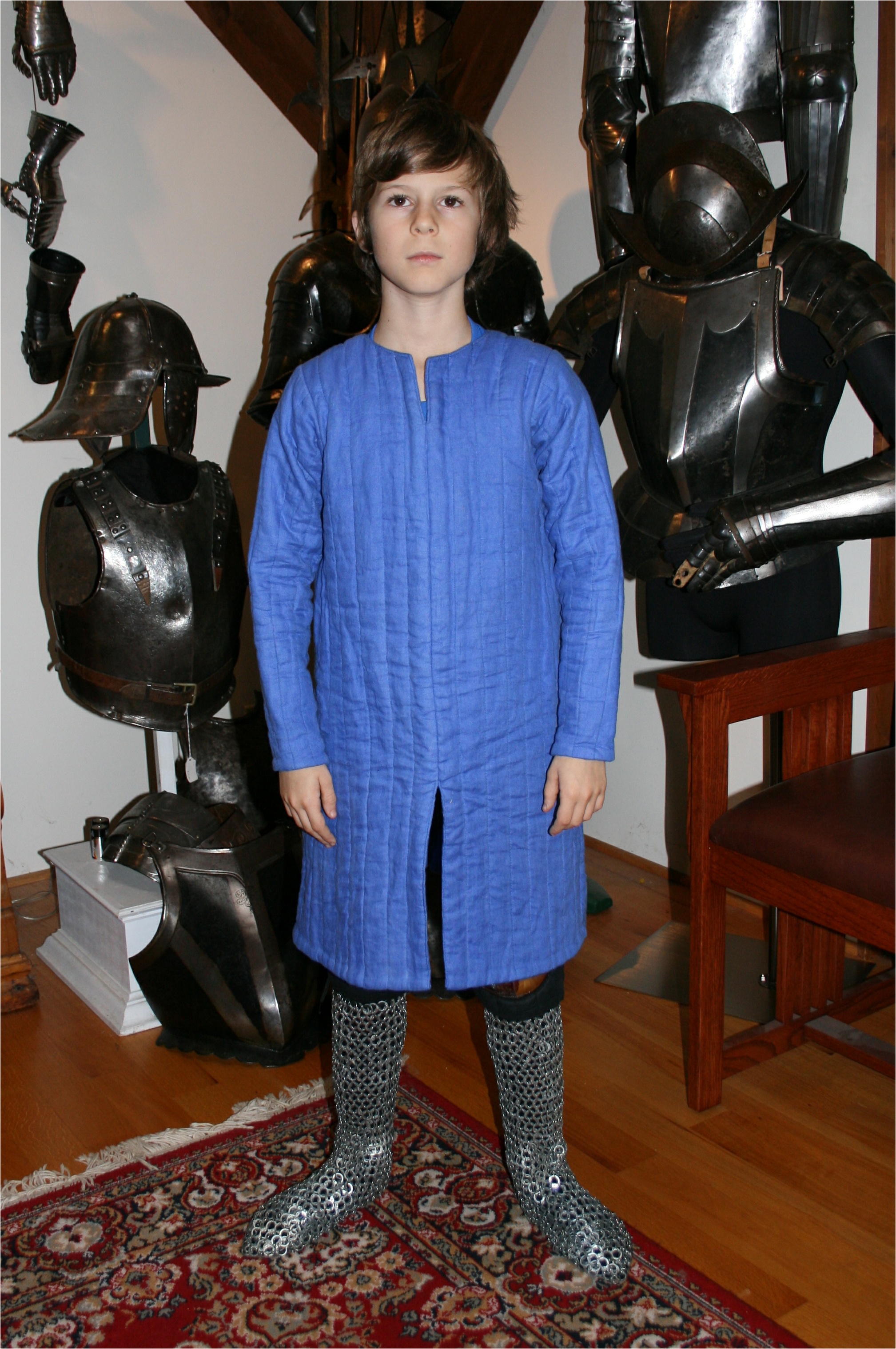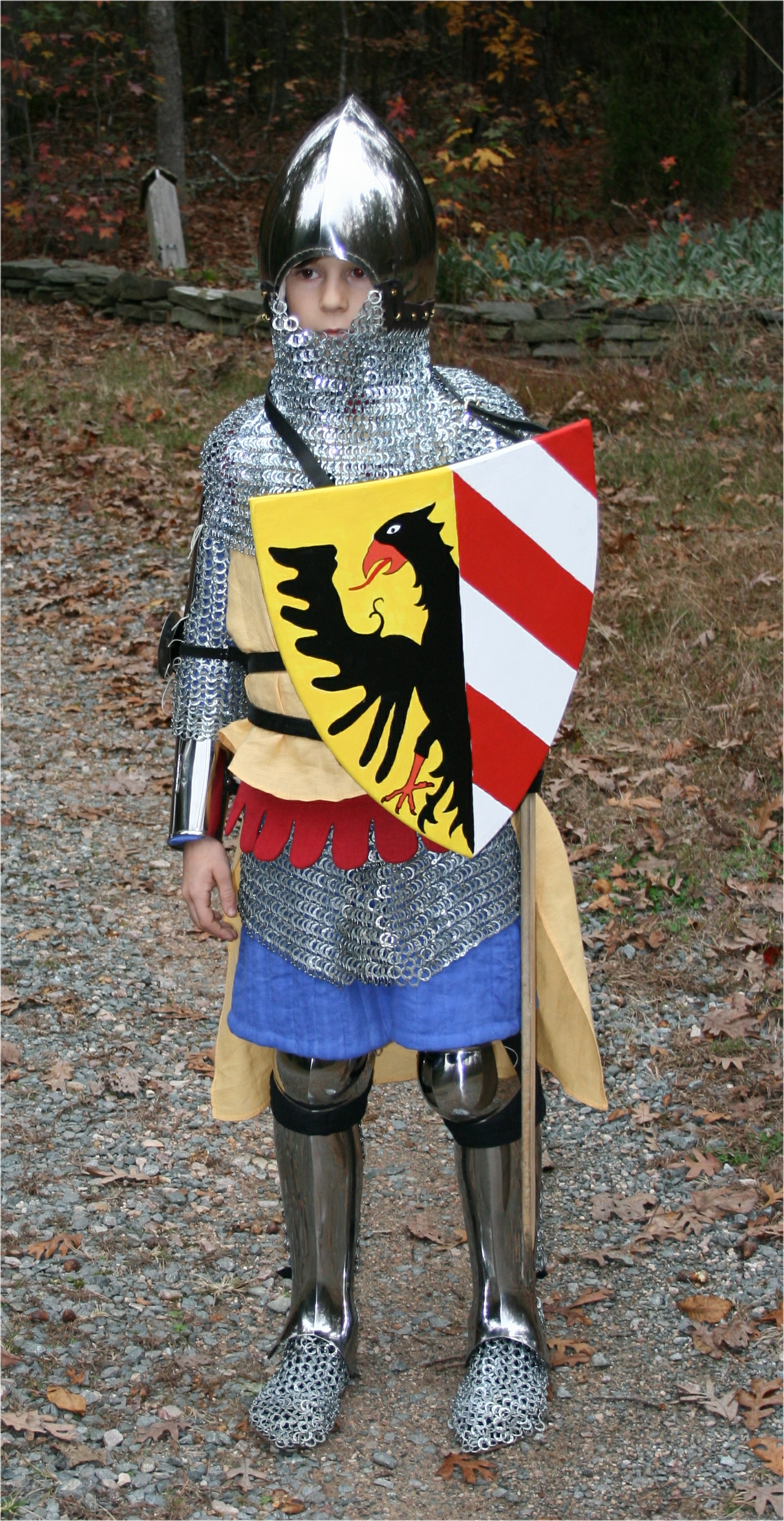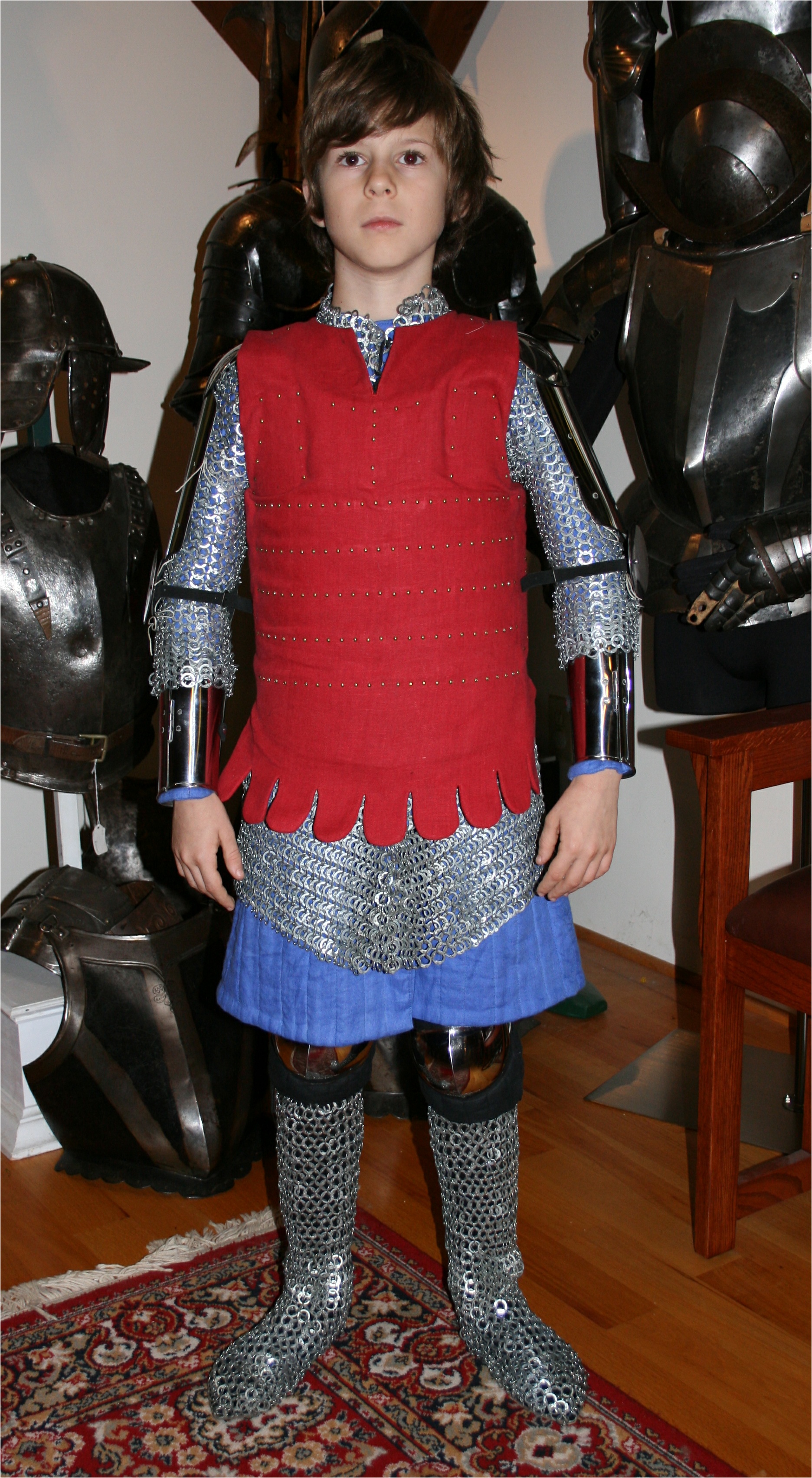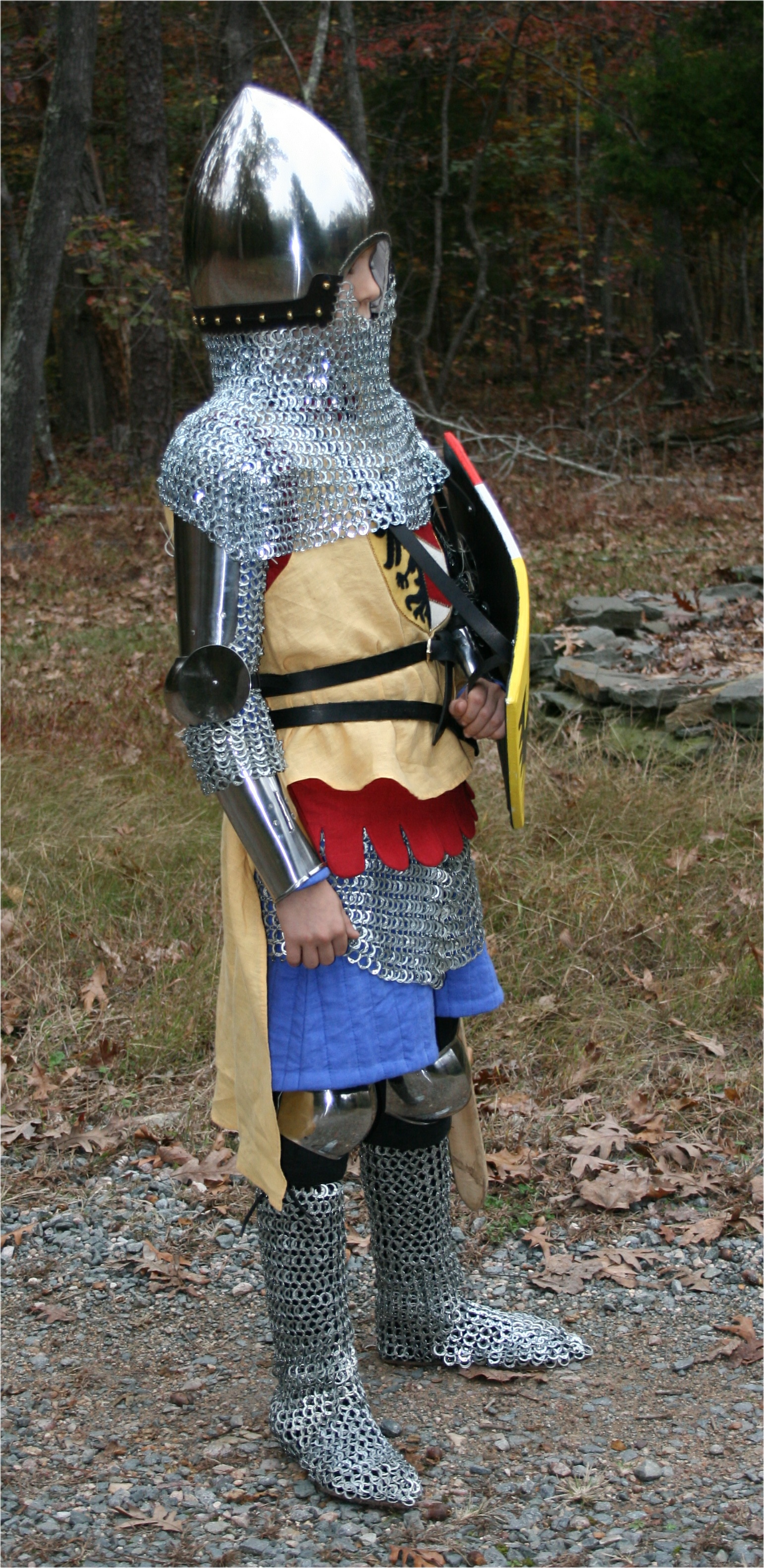 External plates of 1050 spring steel. Knees and elbows raised. Bascinet formed of two pieces with central weld. Coat-of-plates plates of stainless steel attached to fabric with #14 brass escutcheon pins spaced at one half inch intervals on main body plates and three quarter inch spacing on upper and side plates. Rivets follow the outer edge of the plates in the upper plates and on side plates. Knees attached by Y straps on both sides with laces securing them to the cuisses. Elbows with central strap of a Y strap at the back and straight strap at the front and suspended from the upper vambrace plate by a leather strap. Vambrace plates laced to the mail shirt - the upper plate laced by internal leather tabs over the mail and the lower vambrace cannon laced inside the short sleeves. Most buckles forged of steel. Coat-of-plates buckles cast of nickel silver. Additional cloth coif of linen. Gambeson and cuises machine stitched, surcoat and coif with main seams machine stitched but all edge finishing,binding, and applique hand stitched. Mail 9mm flat ring with round rivets zinc coated, formed of scraps from 1250 hauberk and loose rings. Mostly assembled from rings allowing for tailoring as part of the constuction process. Geoffrey was 4 foot 8 inches tall and weighed 65 pounds at the time this was made. Total weight of the armour and clothing - 29 pounds.
