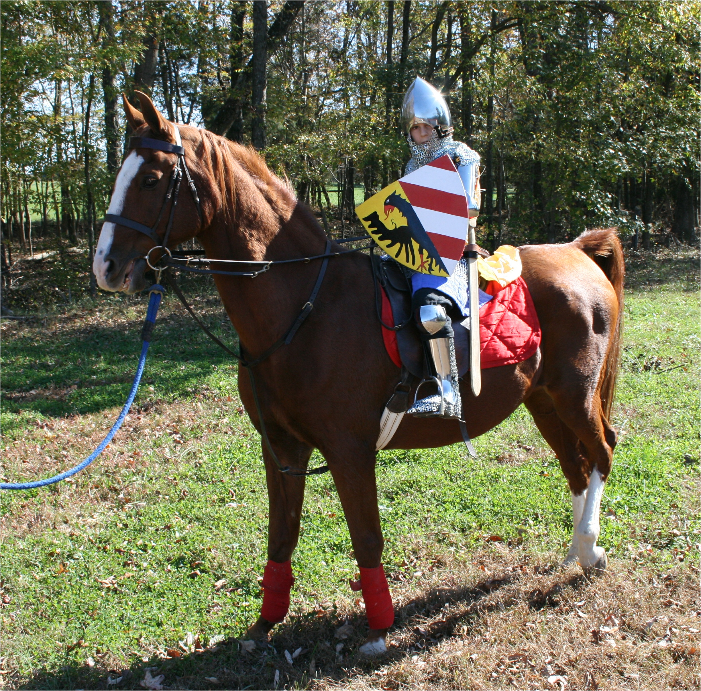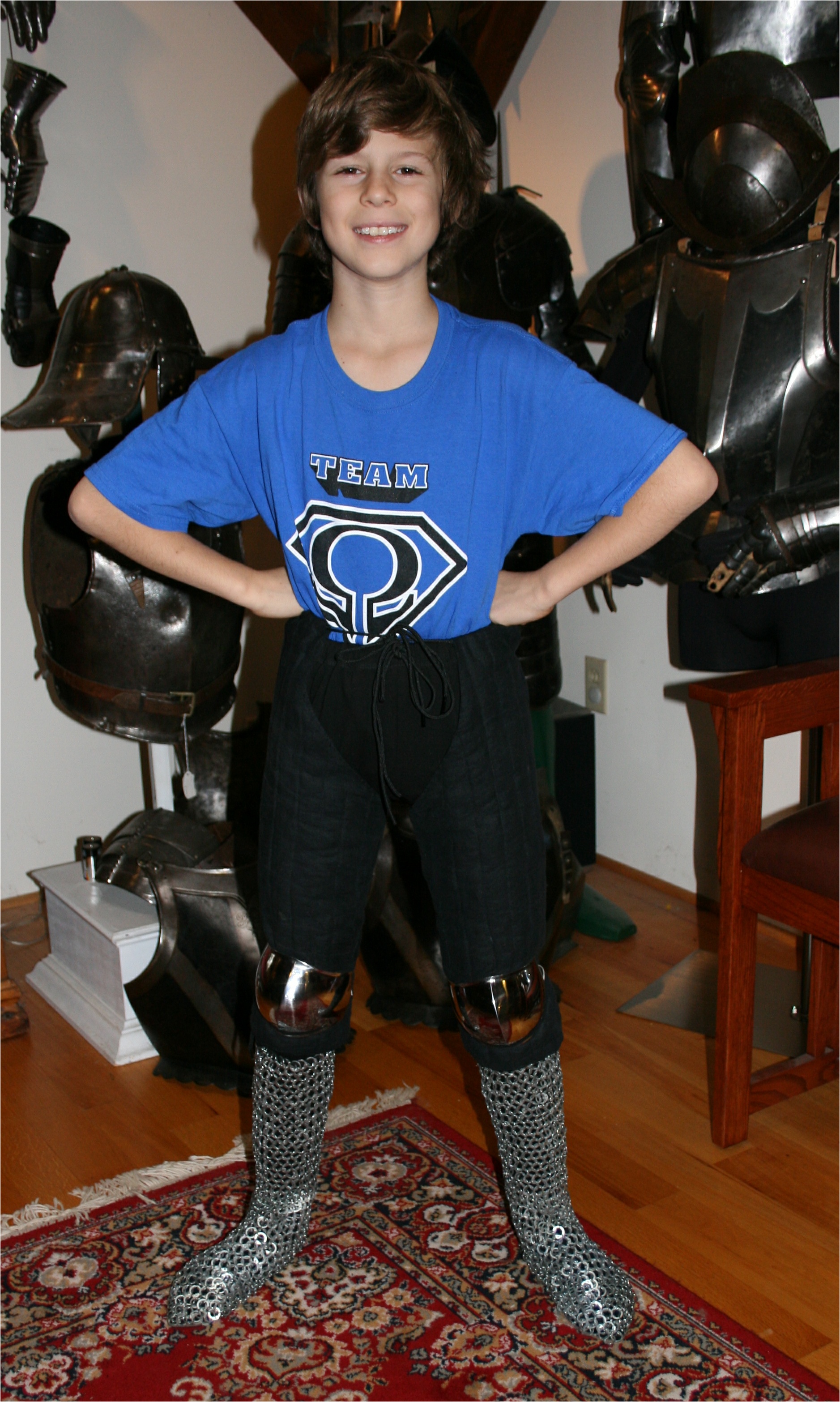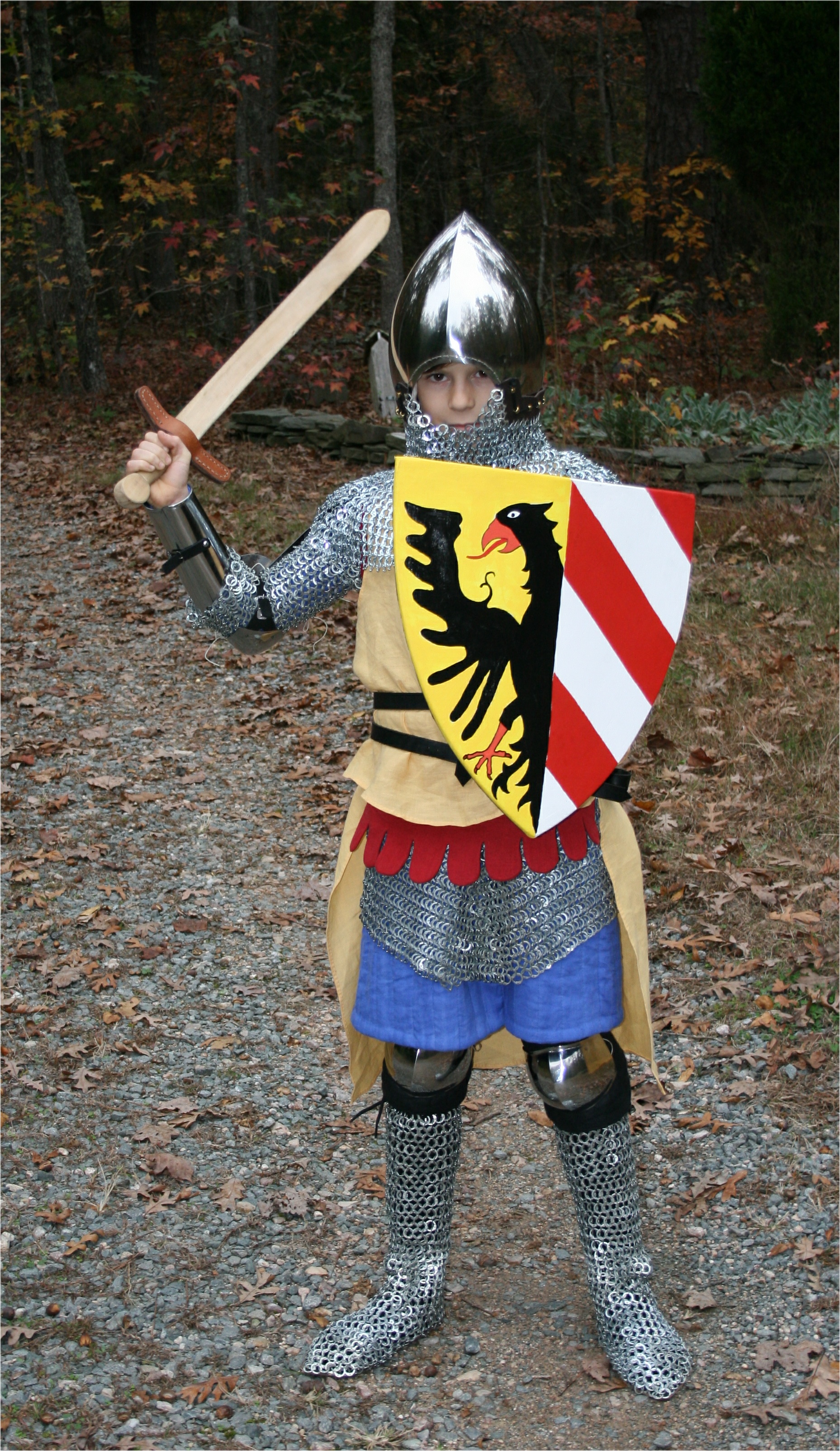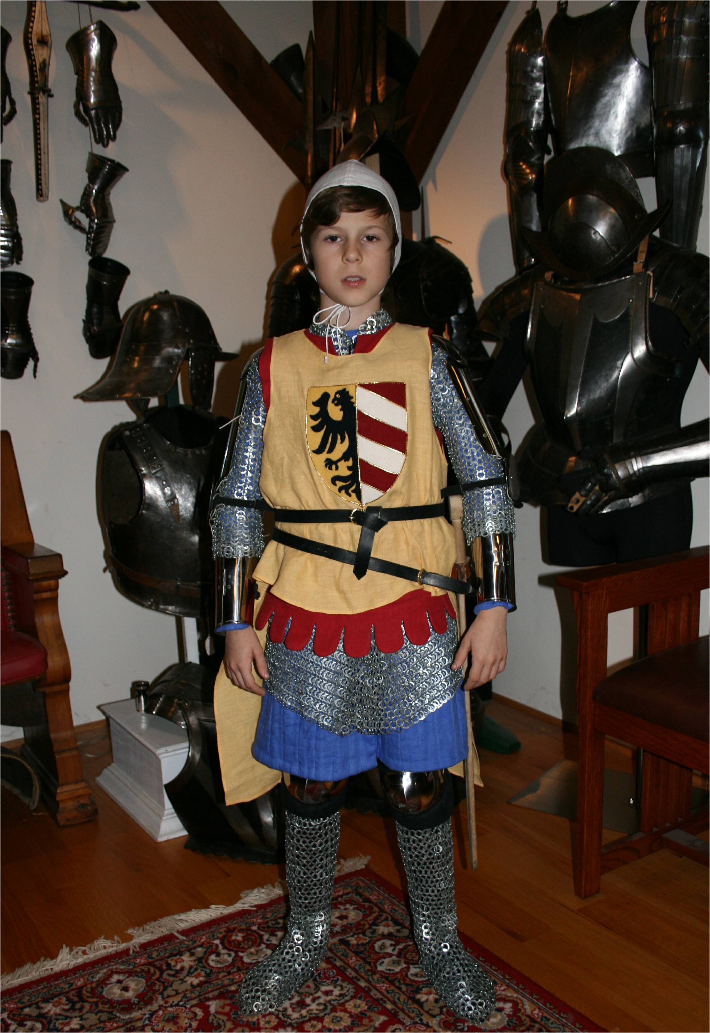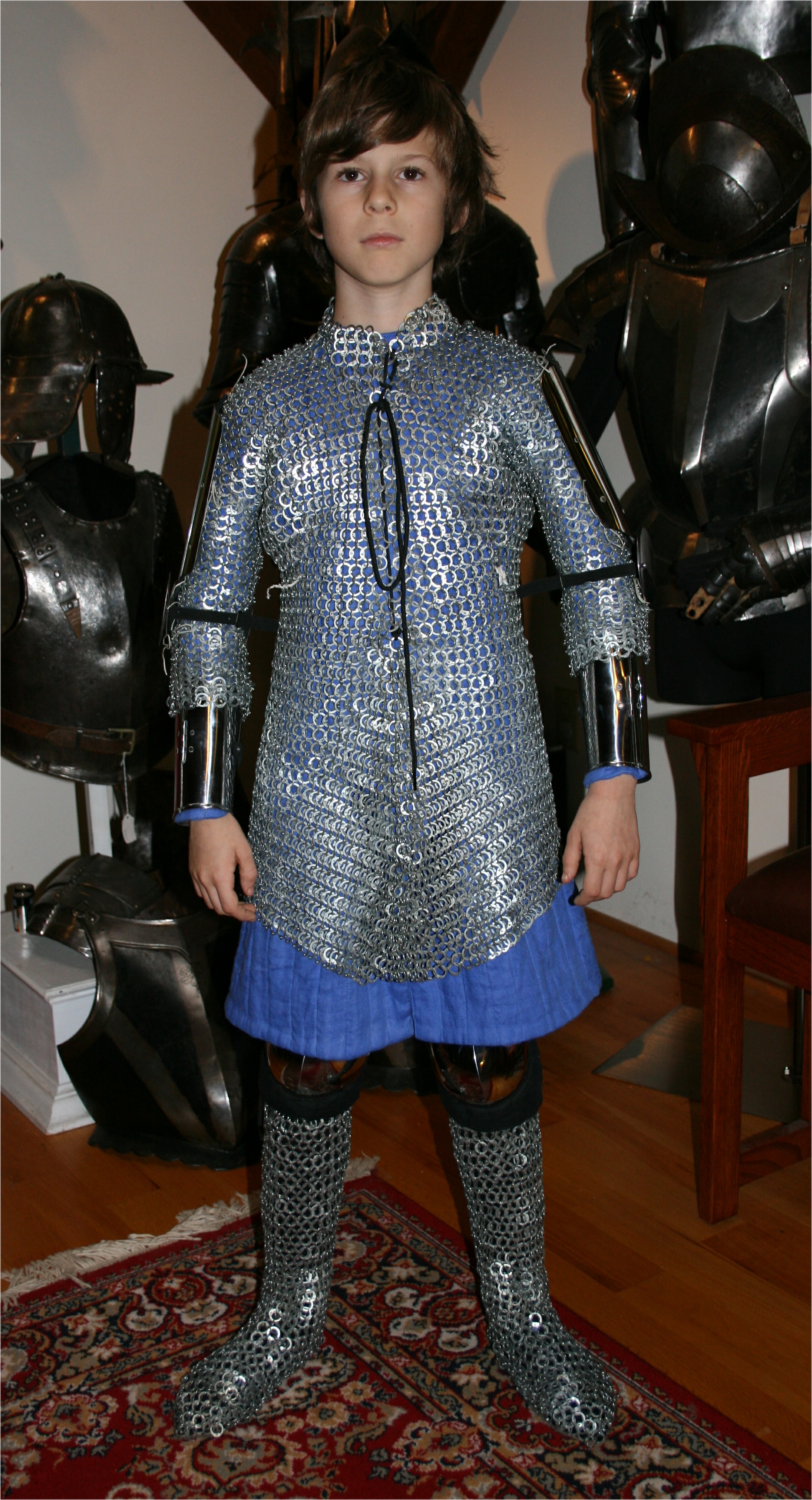 External plates of 1050 spring steel. Knees and elbows raised. Bascinet formed of two pieces with central weld. Coat-of-plates plates of stainless steel attached to fabric with #14 brass escutcheon pins spaced at one half inch intervals on main body plates and three quarter inch spacing on upper and side plates. Rivets follow the outer edge of the plates in the upper plates and on side plates. Knees attached by Y straps on both sides with laces securing them to the cuisses. Elbows with central strap of a Y strap at the back and straight strap at the front and suspended from the upper vambrace plate by a leather strap. Vambrace plates laced to the mail shirt - the upper plate laced by internal leather tabs over the mail and the lower vambrace cannon laced inside the short sleeves. Most buckles forged of steel. Coat-of-plates buckles cast of nickel silver. Additional cloth coif of linen. Gambeson and cuises machine stitched, surcoat and coif with main seams machine stitched but all edge finishing,binding, and applique hand stitched. Mail 9mm flat ring with round rivets zinc coated, formed of scraps from 1250 hauberk and loose rings. Mostly assembled from rings allowing for tailoring as part of the constuction process. Geoffrey was 4 foot 8 inches tall and weighed 65 pounds at the time this was made. Total weight of the armour and clothing - 29 pounds.