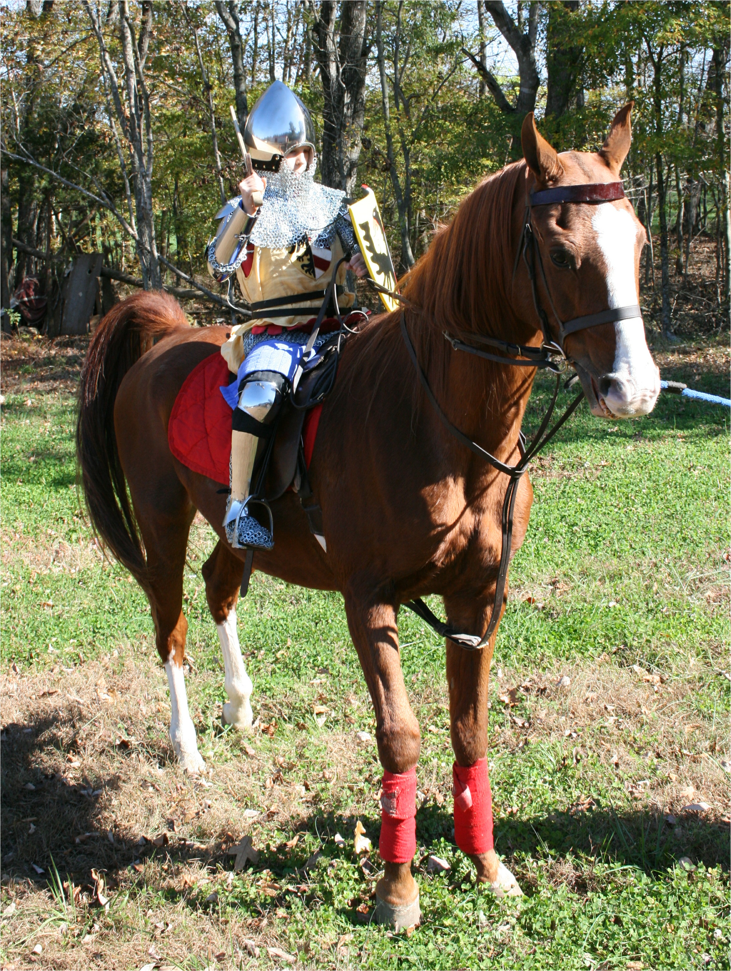 Patterned after images from the Romance of Alexander (Ms. Bodley 264) and related brasses from 1330-1350. Composed of a bascinet closely patterned after the tall rounded bascinets with small face holes, short sides and central crease in the Romance of Alexander with an aventail formed of two trapezoids (rear one slightly larger to account for the breadth of the back) with extensions at the face. Trapezoids with forty five degree taper (one extra ring per row) on each side. Aventail secured to a leather band which is secured to the helmet by brass vervelles. Lining of linen with loose tow stuffing secured to the helmet by stitches to small lining holes along the edge. Linen gambeson lined with cotton. Full haubergeon with two thirds length sleeves. Fitted with expansion from the waist up to the chest, in the skirt and tapered upper arms. Fitting in the chest adding 4 rings every other row. Fitting in the skirt of two added rings every other row in the back and the front formed with 45 degree additions on each side of the center which forms the point at the centre of the front. Haubergeon split in the front to the waist and with a short collar. Over the haubergeon the arms are covered by simple upper vambrace covering the outer third of the upper arm, a floating elbow with attached rondel and full lower vambraces of two plates joined by an inset hinge on the outside and strap and buckle on the inside. Body of the haubergeon covered by a coat of plates similar to Wisby #1. Cover of two layers of linen over 1 layer of canvas. Coat of plates includes shoulder plates. Legs covered by mail chauses on the lower legs, gamboised cuisses over the thighs and knees, simple knee cops and frontal greaves (schynbalds). Chausses covering the lower leg and foot with an attached leather sole. Cuisses of linen padding in differential thicknesses with raw, cleaned linen fibre. Surcoat of linen with appliqued coat of arms in wool. Shield of formed plywood covered with linen on the front and leather back. Face gessoed and painted. Shield with two enarmes and guige strap.