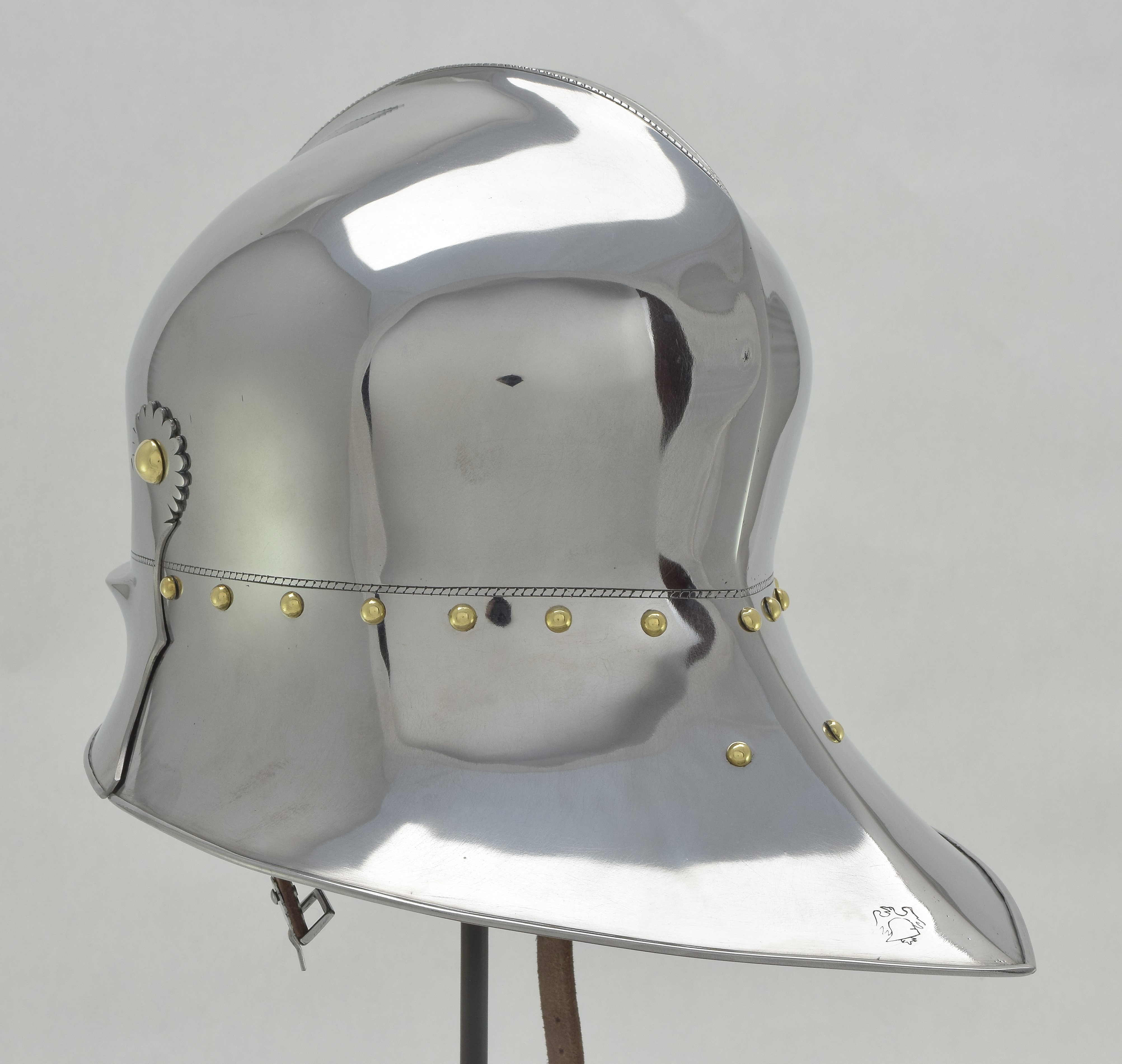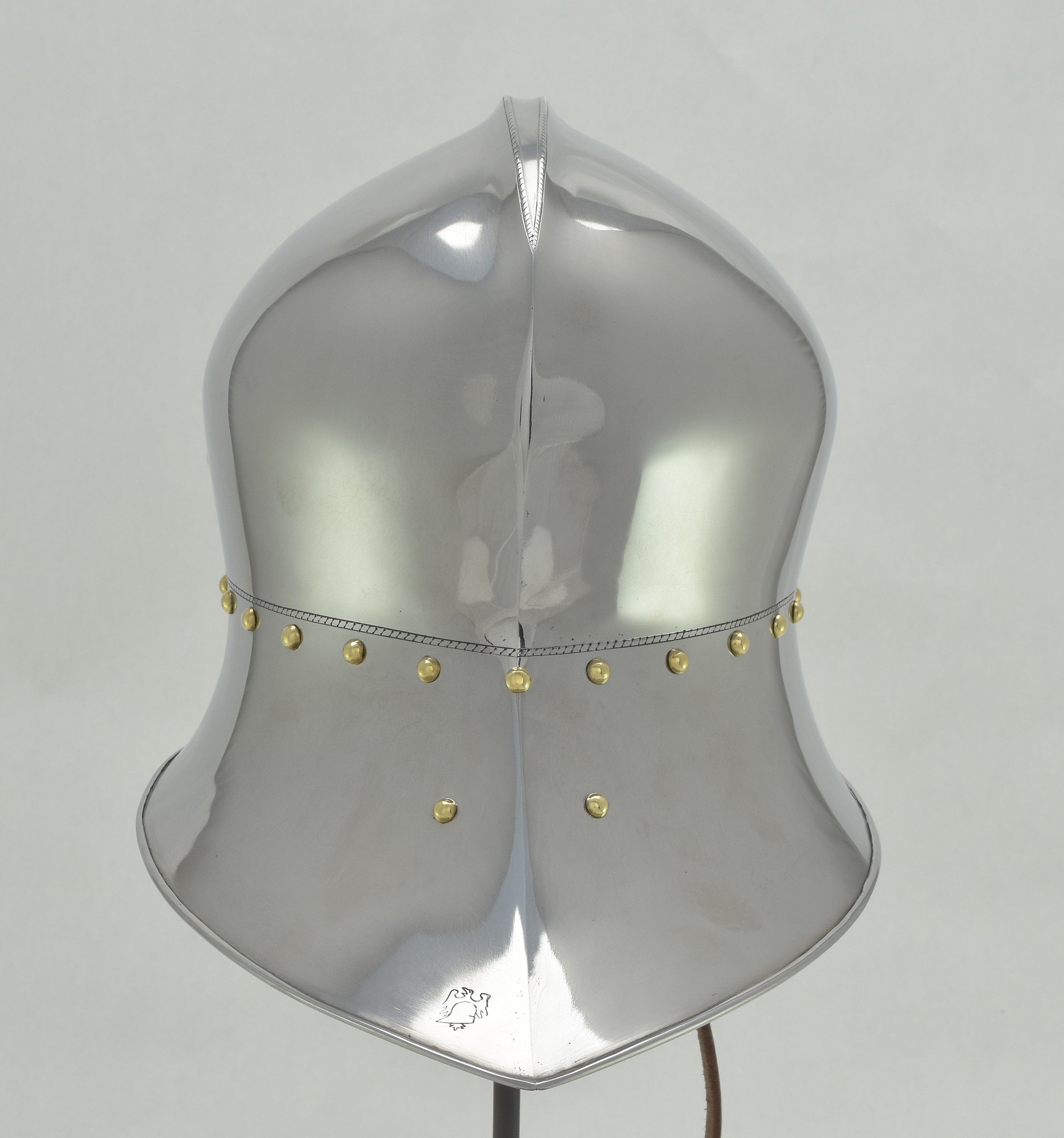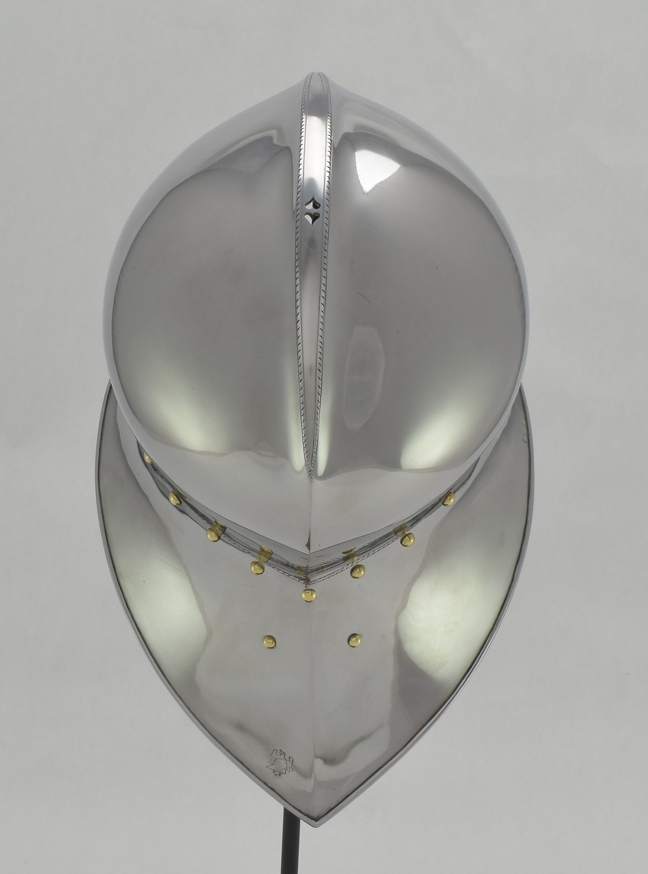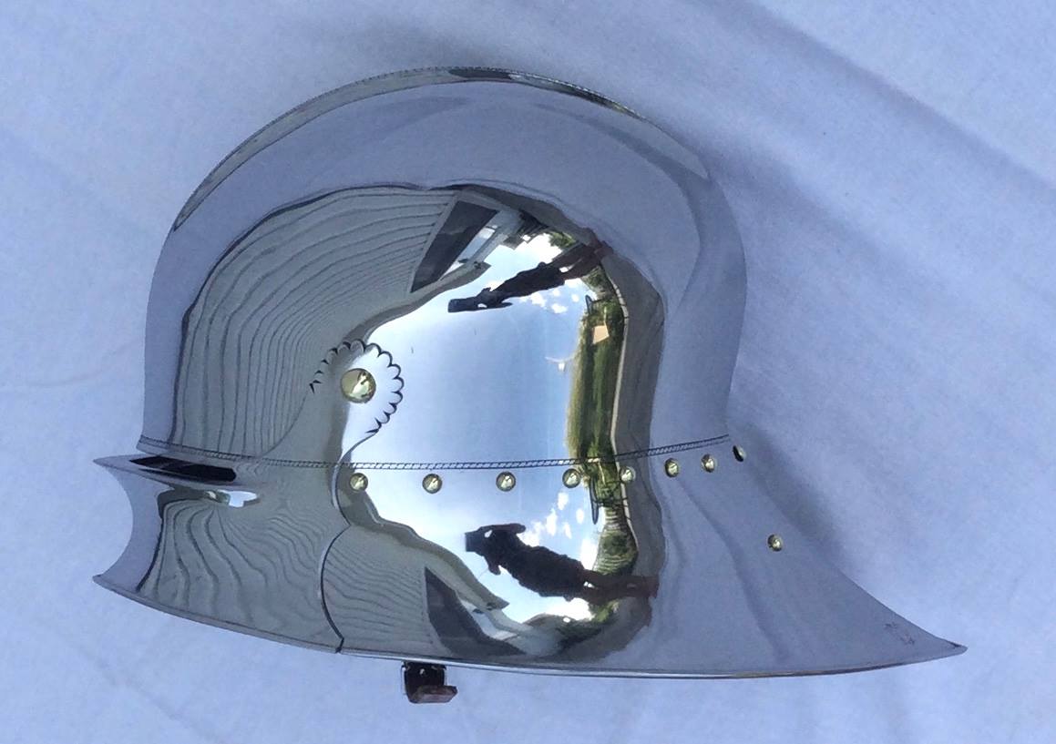 Expertly designed and built by Francois L'Archeveque. Based on A-62 KHM and similar helmets, but not intended as a direct copy. Somewhat simplified with a roll at the lower edge instead of applied copper alloy border. Complete with fine engraved decoration, interior visor reinforce and elegant double heart piercing at the center of the crest. Made by the modern armourer with a really great eye for salades. Formed of mild steel with an intentional thickness change between the top and the sides and back mimicing the construction of the high quality helmets of the time. The general concept was agreed to with Francois, but Francois was allowed to choose the details of the form to make the prettiest salade of this type he could.