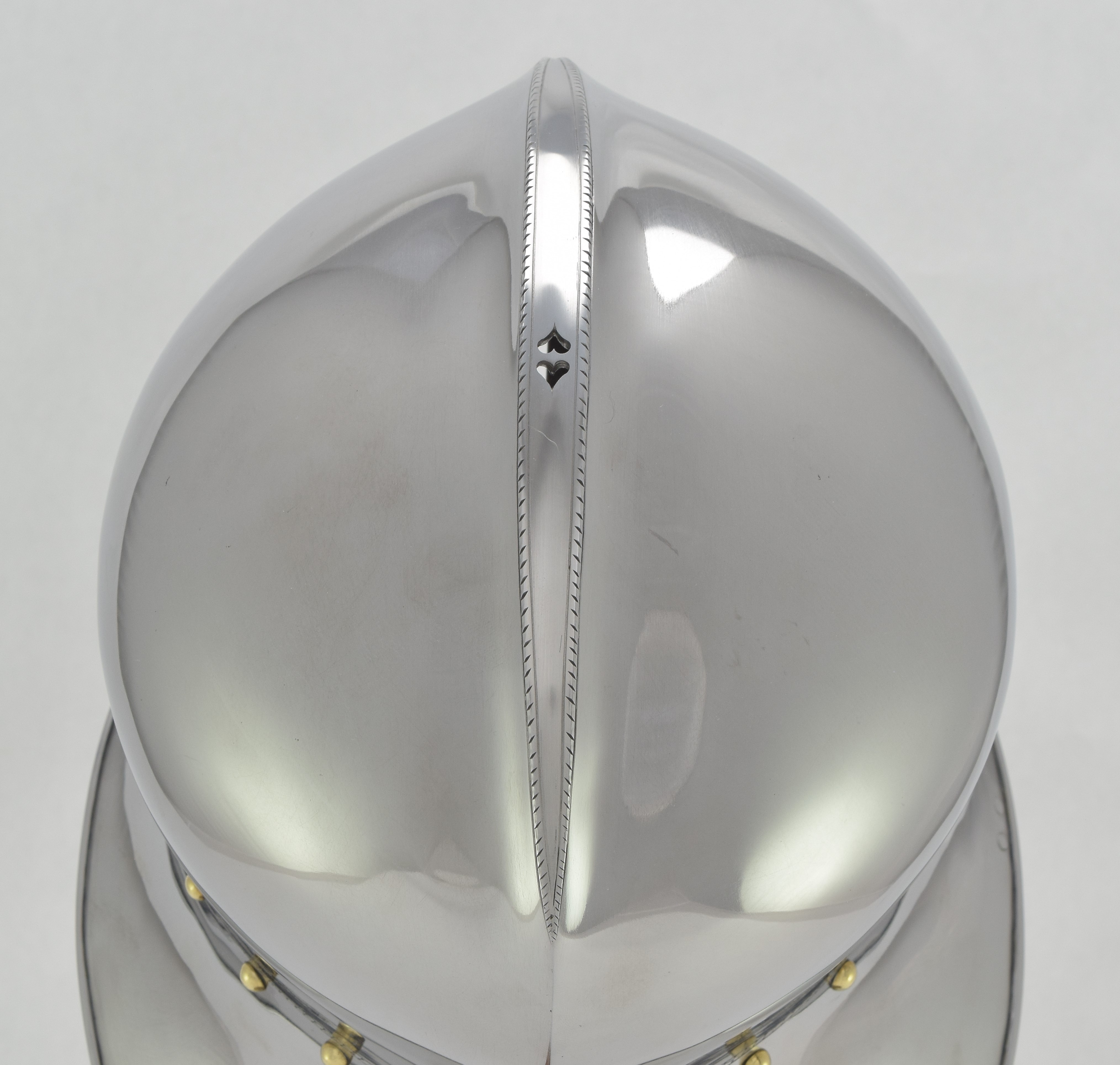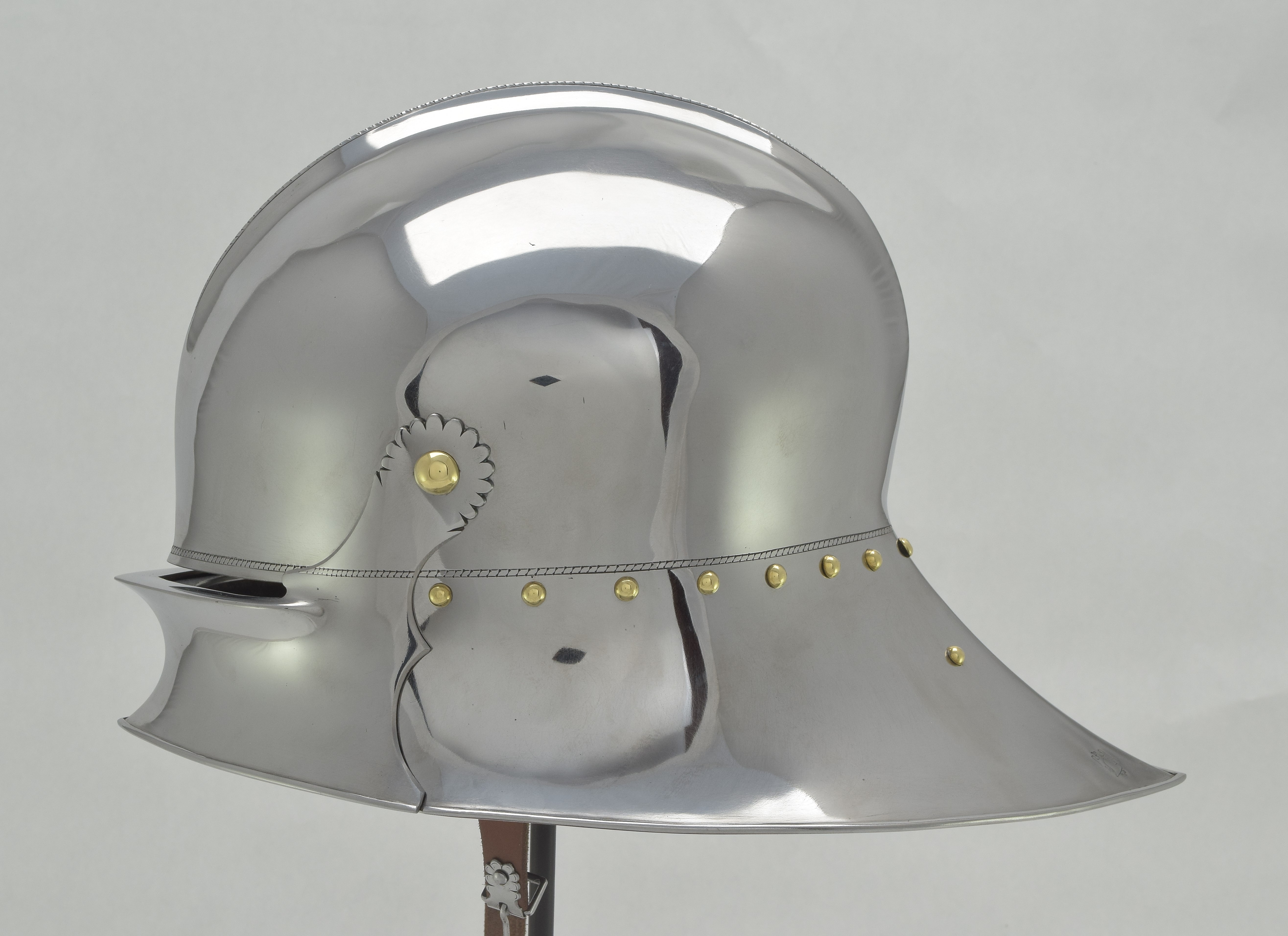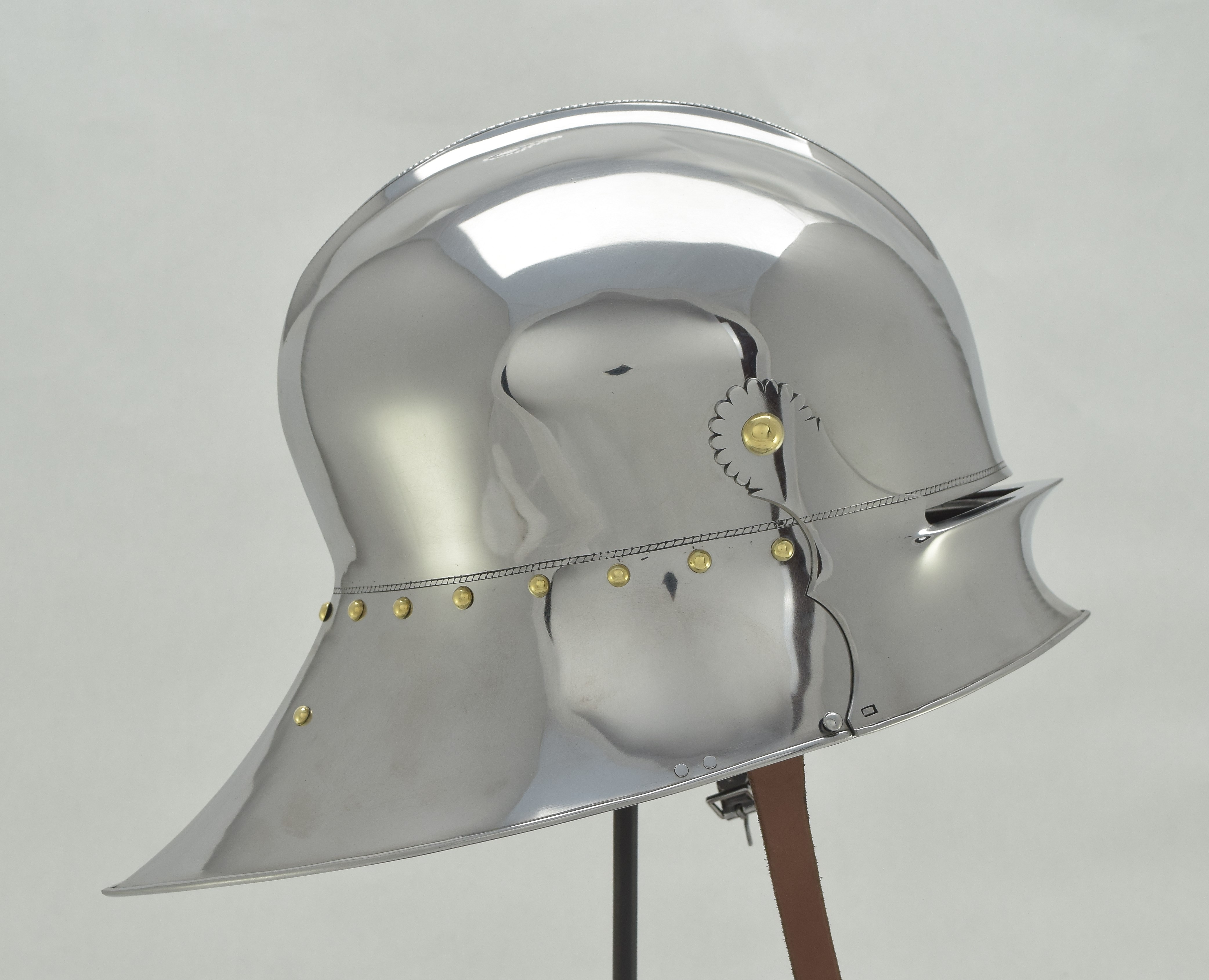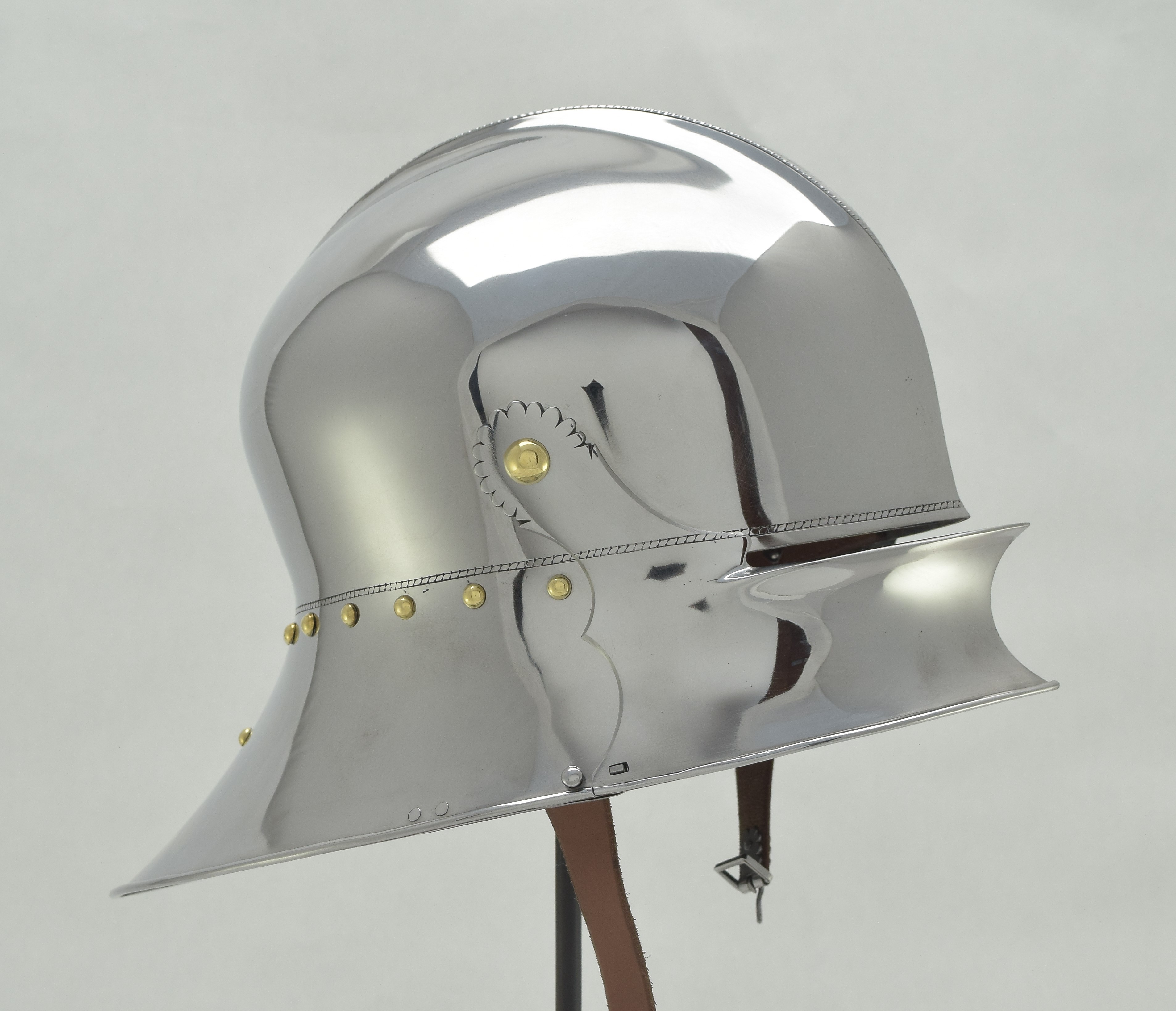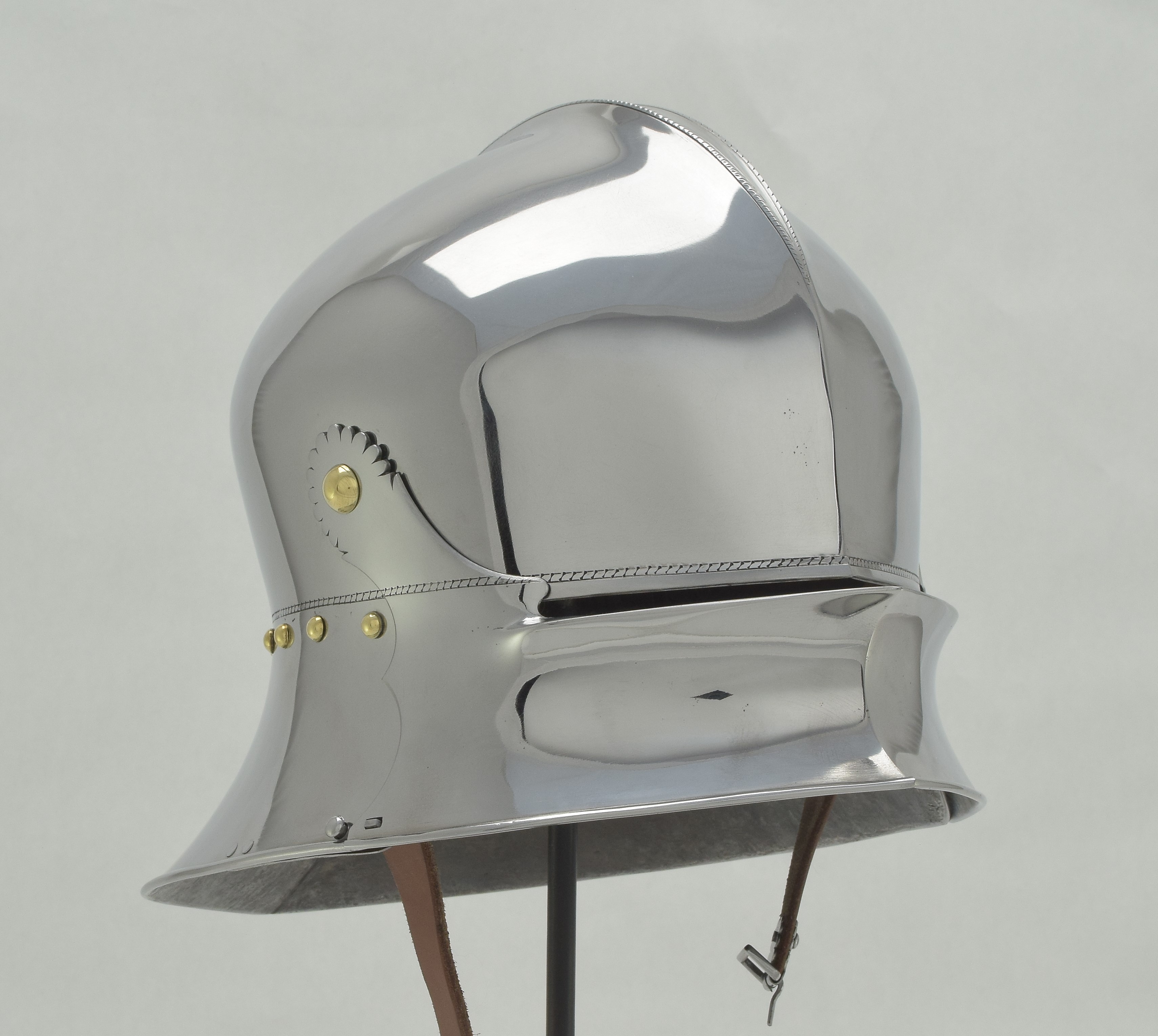Expertly designed and built by Francois L'Archeveque. Based on A-62 KHM and similar helmets, but not intended as a direct copy. Somewhat simplified with a roll at the lower edge instead of applied copper alloy border. Complete with fine engraved decoration, interior visor reinforce and elegant double heart piercing at the center of the crest. Made by the modern armourer with a really great eye for salades. Formed of mild steel with an intentional thickness change between the top and the sides and back mimicing the construction of the high quality helmets of the time. The general concept was agreed to with Francois, but Francois was allowed to choose the details of the form to make the prettiest salade of this type he could.