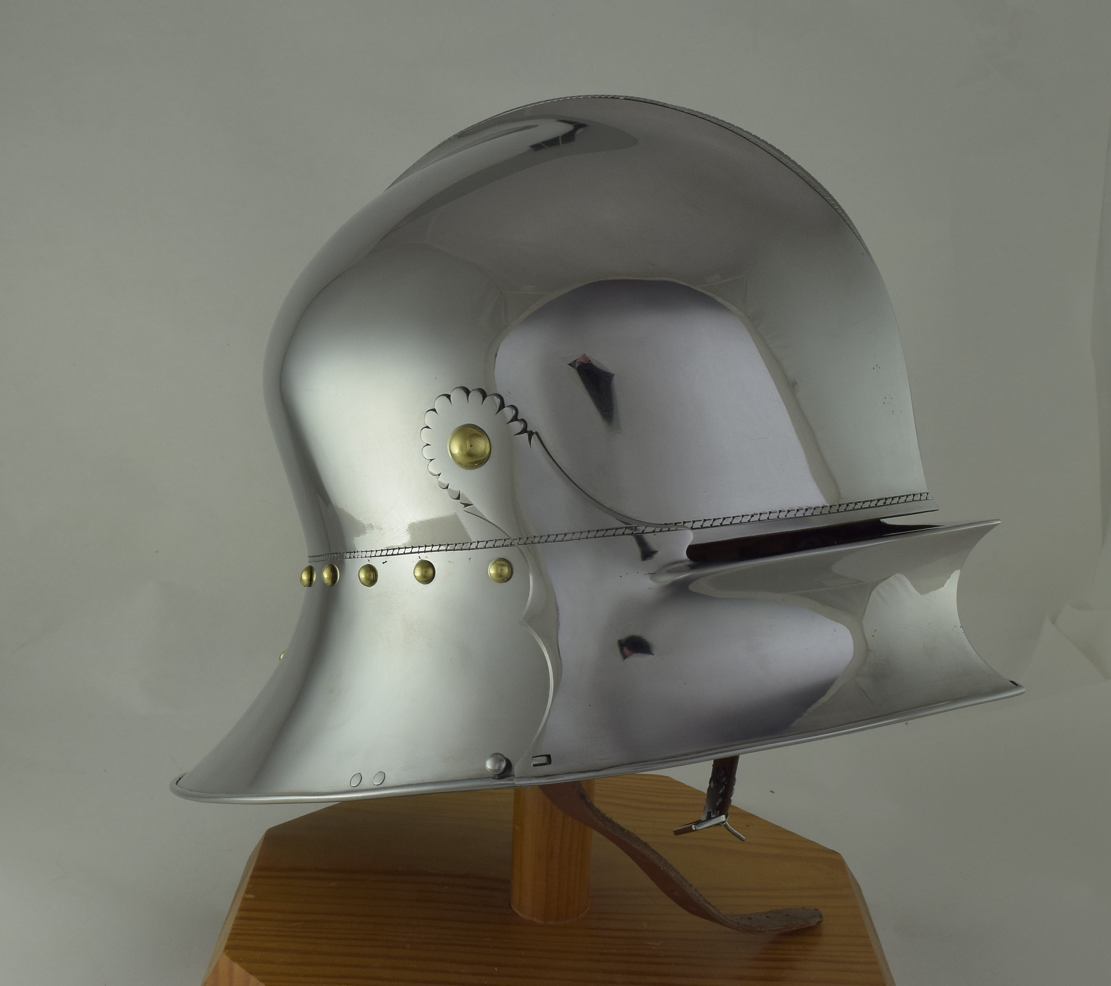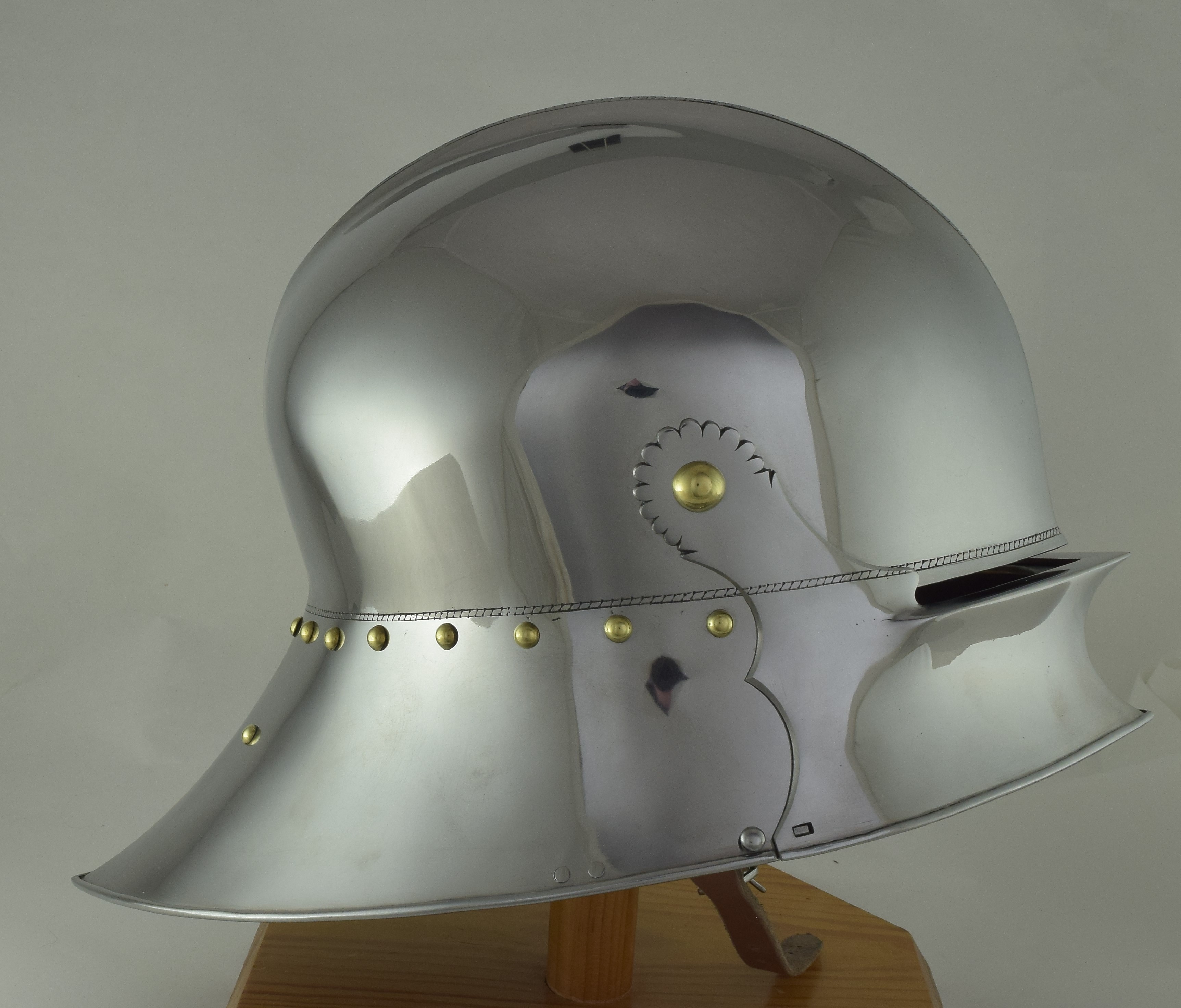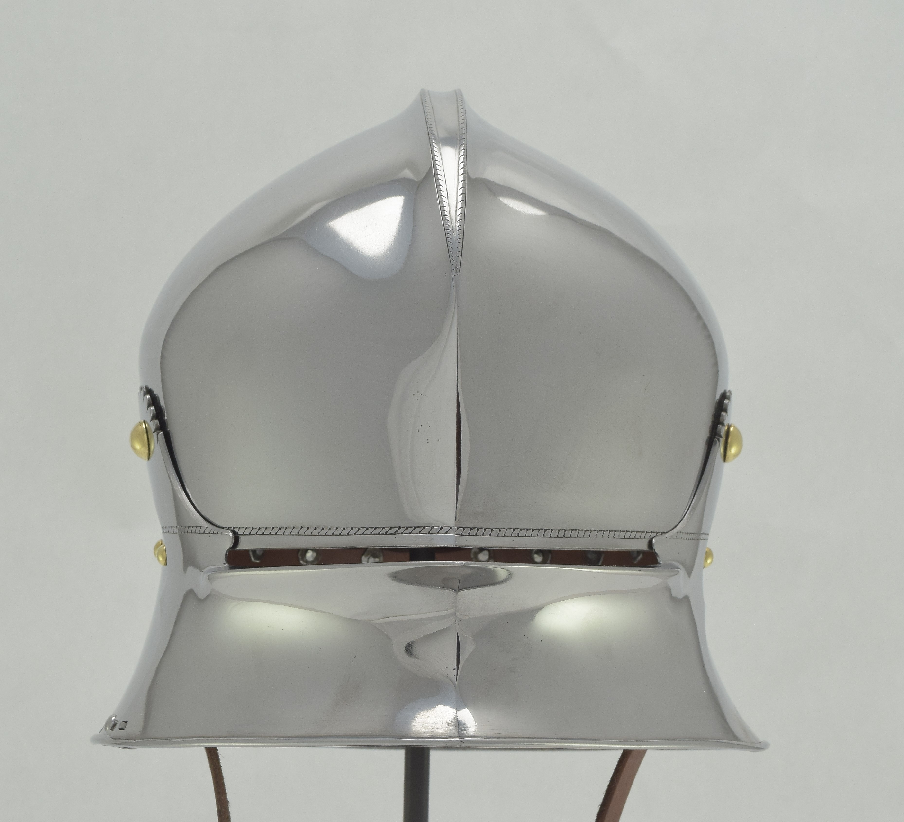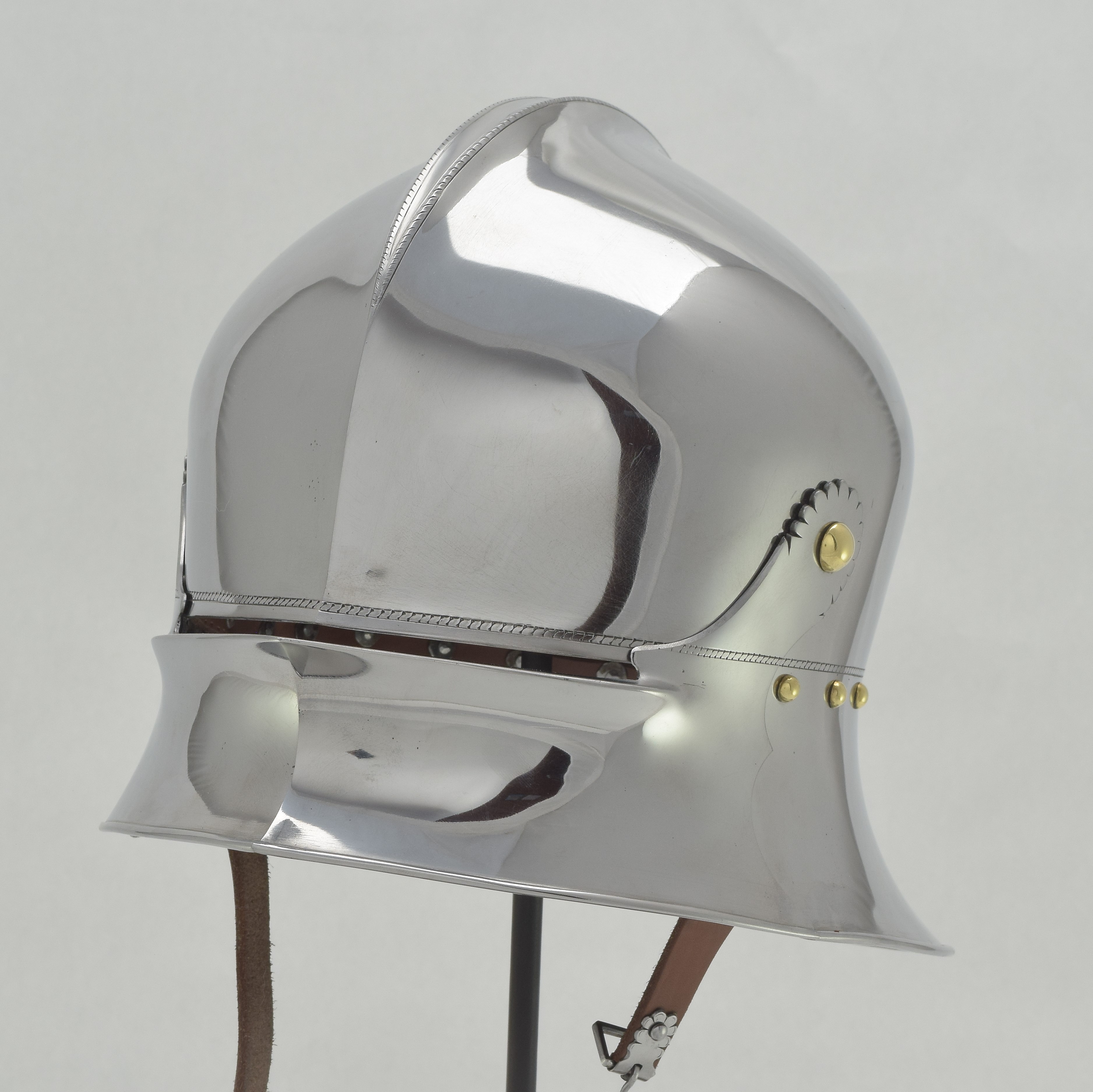 Expertly designed and built by Francois L'Archeveque. Based on A-62 KHM and similar helmets, but not intended as a direct copy. Somewhat simplified with a roll at the lower edge instead of applied copper alloy border. Complete with fine engraved decoration, interior visor reinforce and elegant double heart piercing at the center of the crest. Made by the modern armourer with a really great eye for salades. Formed of mild steel with an intentional thickness change between the top and the sides and back mimicing the construction of the high quality helmets of the time. The general concept was agreed to with Francois, but Francois was allowed to choose the details of the form to make the prettiest salade of this type he could.
