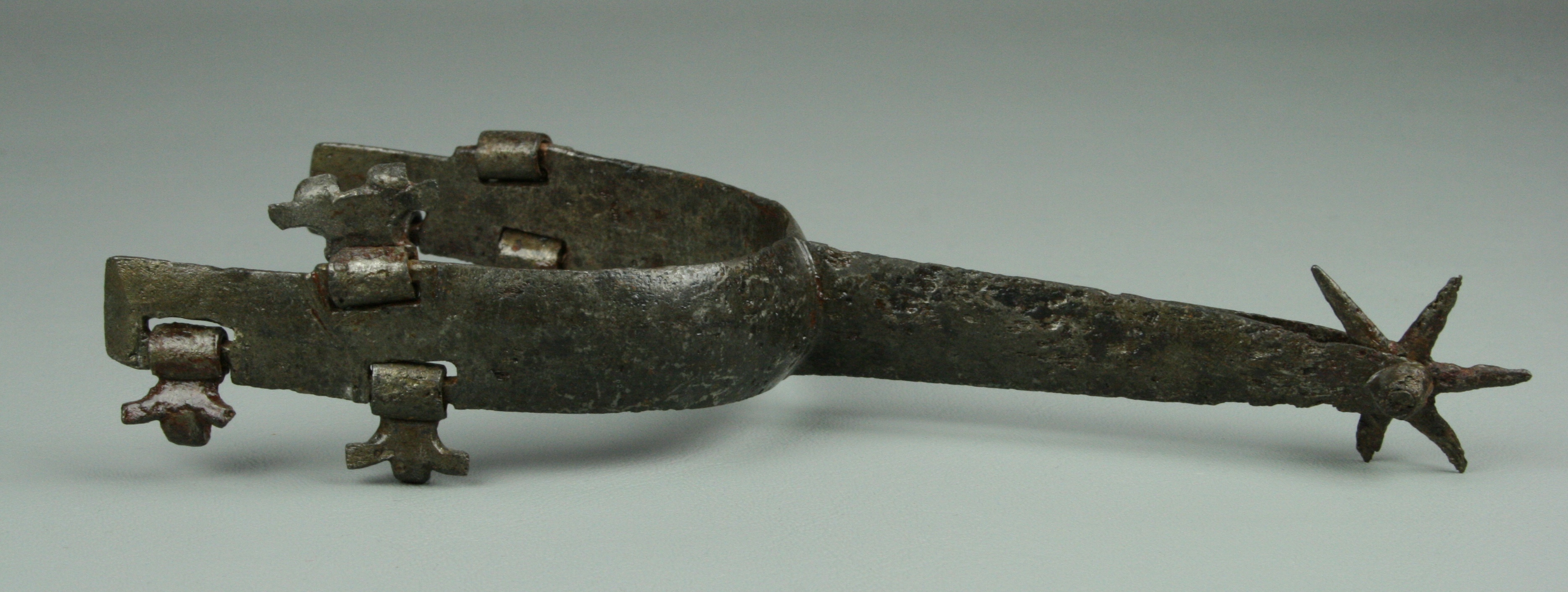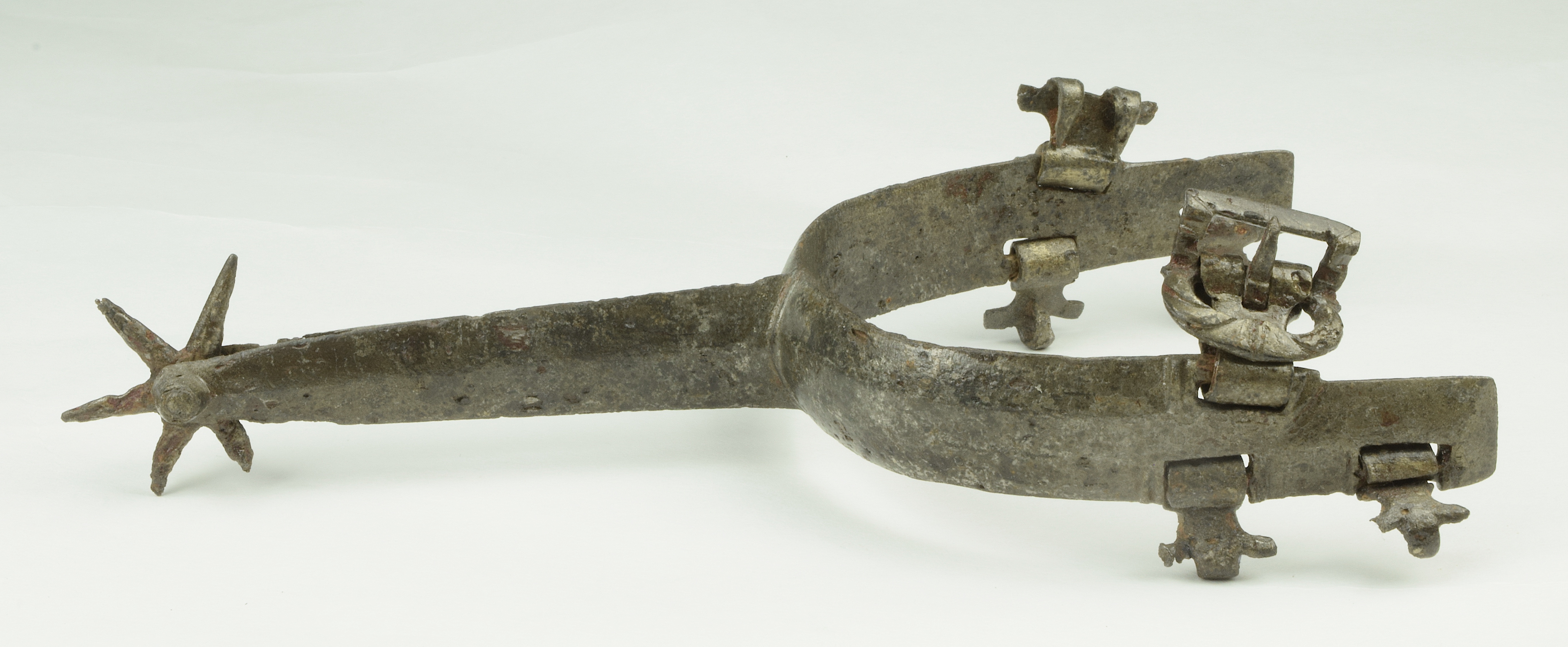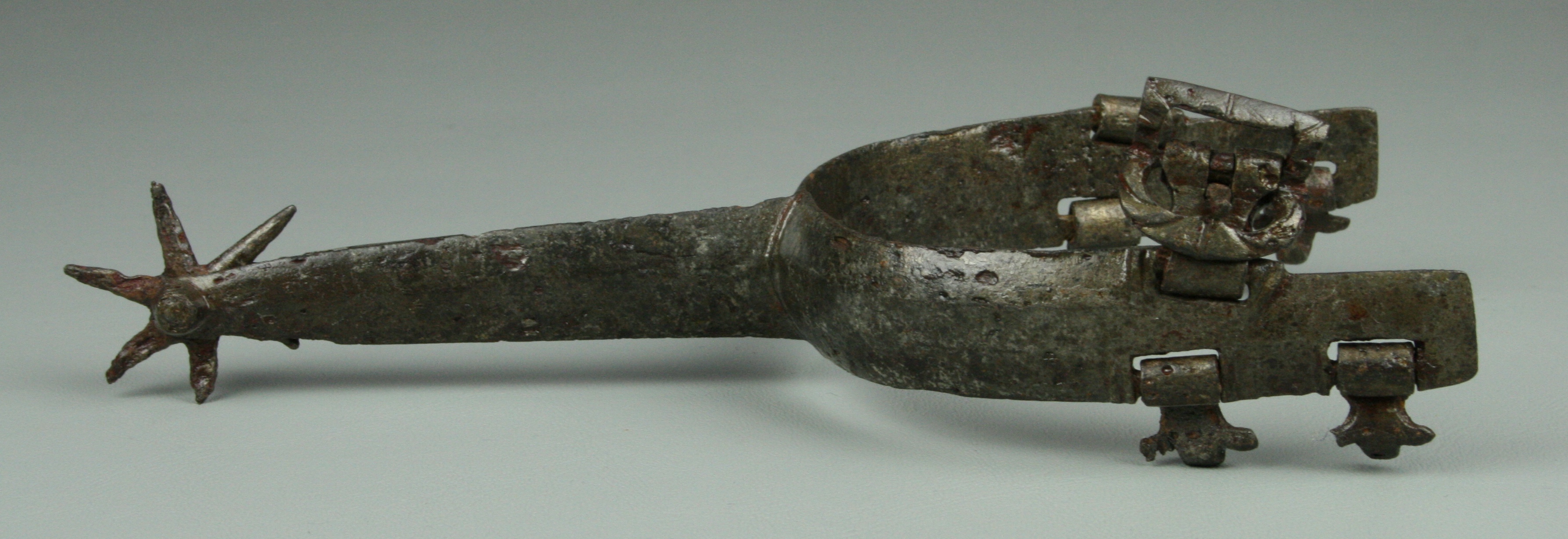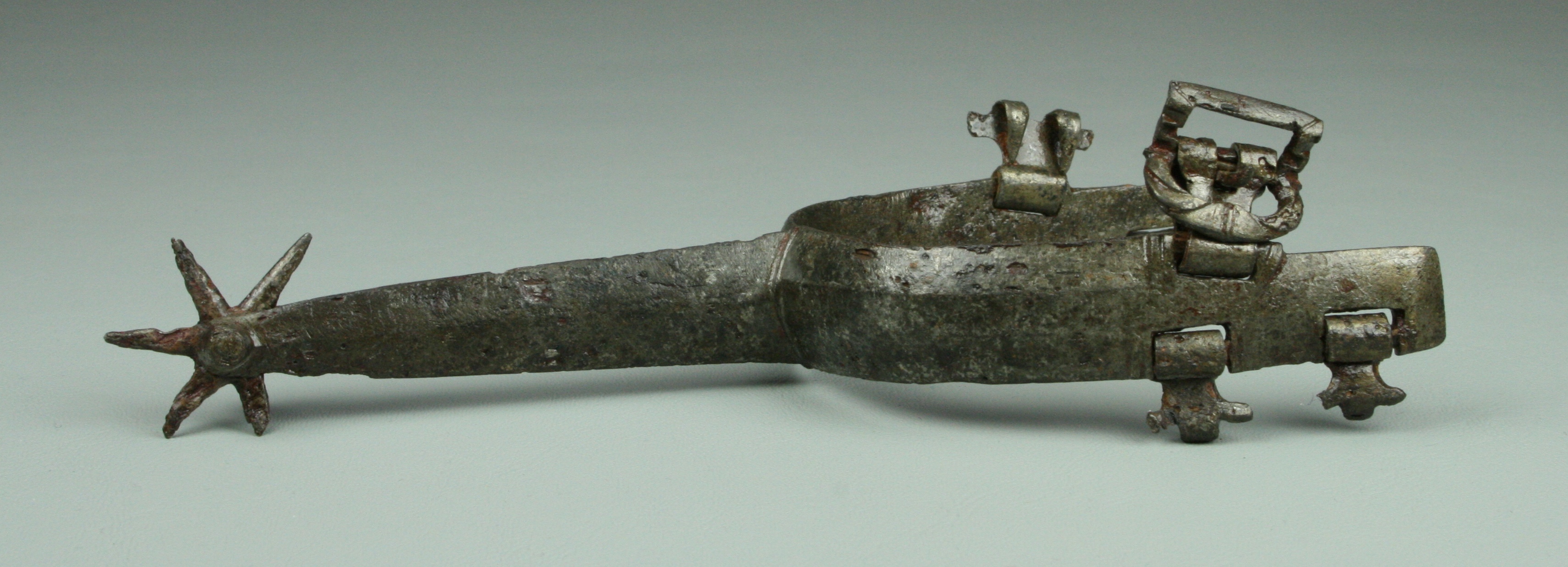Iron. Wide flat form to the arms and rowel stalk. widely beveled at the edges. Very straight form no curve at the ankles. very good shape and details mostly remaining. scattered heavy pitting. All 5 strap mounts and buckle remaining. 6 point rowel. A number of similar spurs are associated with jousting armours of Maximillian I in the Waffensammlung in Vienna. Similar to a spur in the Tower of London (item VI 382) and item #38 in The Art of Chivalry.