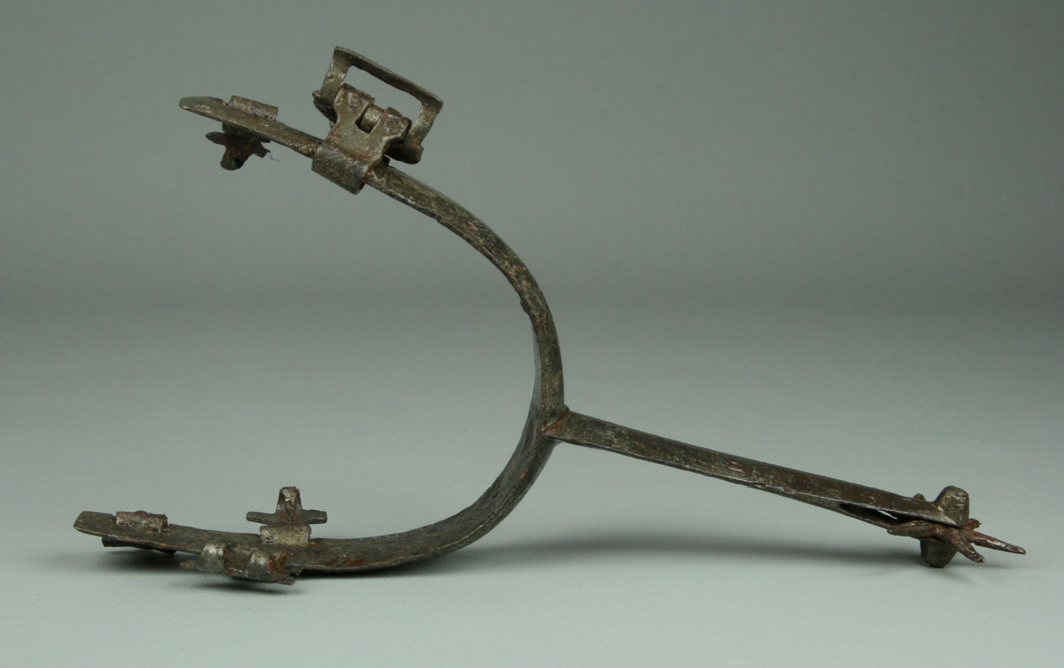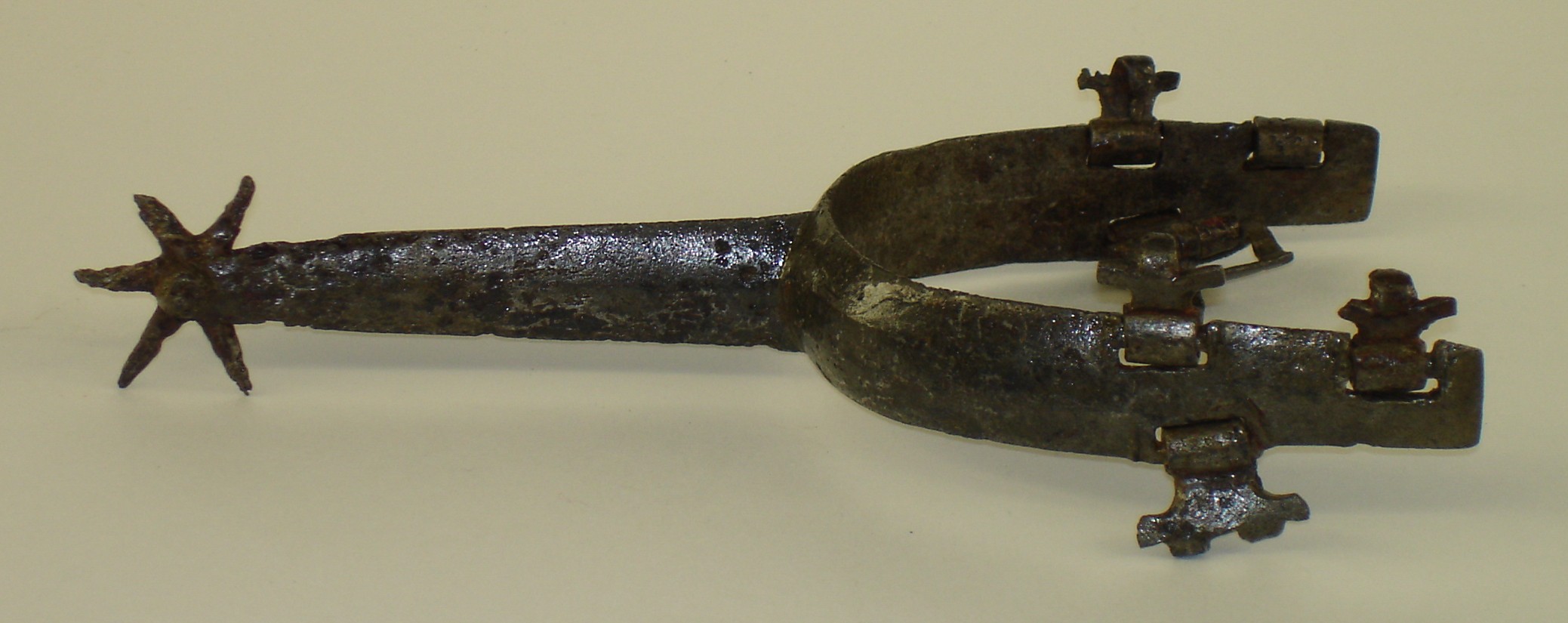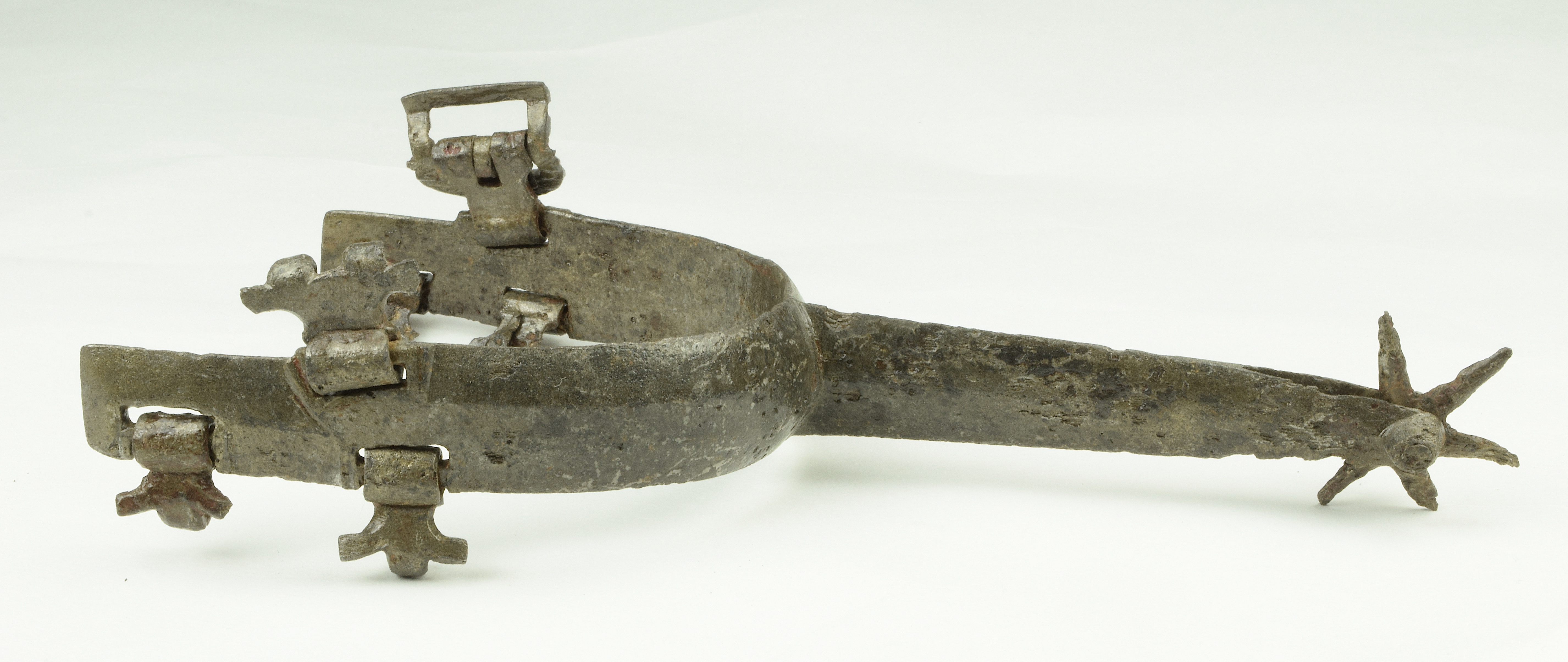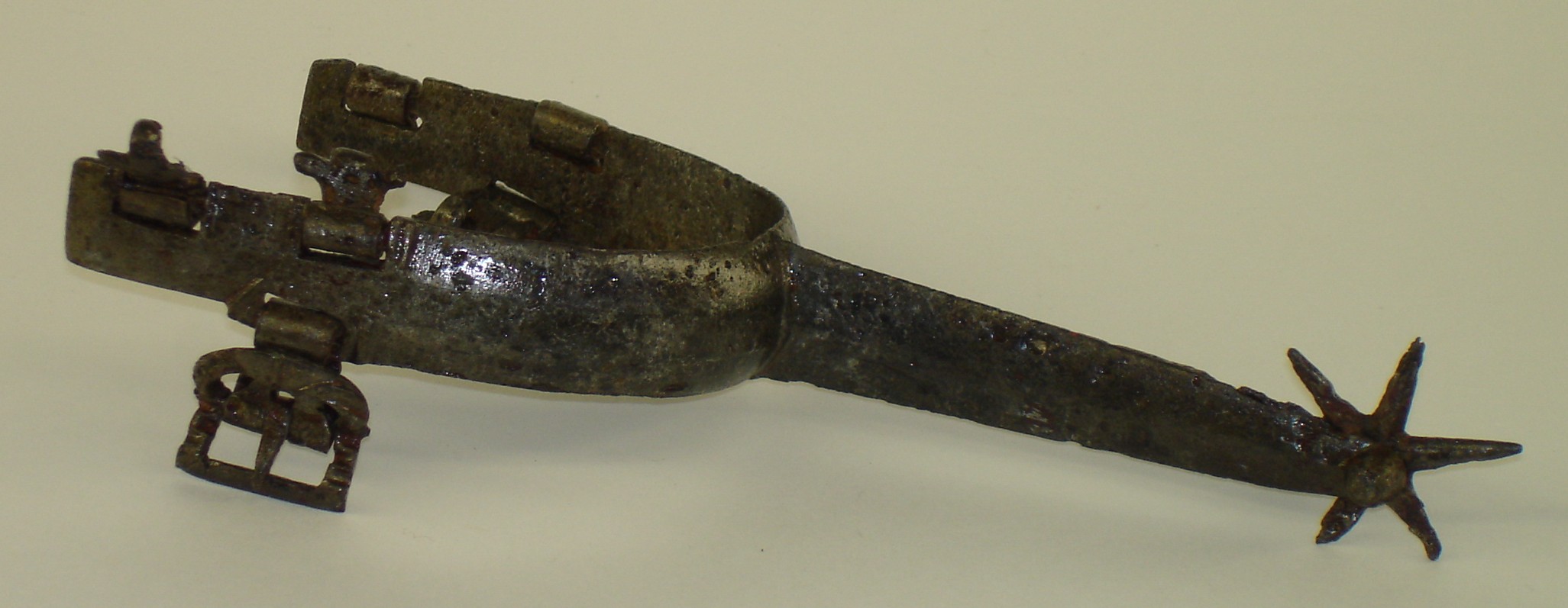 Iron. Wide flat form to the arms and rowel stalk. widely beveled at the edges. Very straight form no curve at the ankles. very good shape and details mostly remaining. scattered heavy pitting. All 5 strap mounts and buckle remaining. 6 point rowel. A number of similar spurs are associated with jousting armours of Maximillian I in the Waffensammlung in Vienna. Similar to a spur in the Tower of London (item VI 382) and item #38 in The Art of Chivalry.