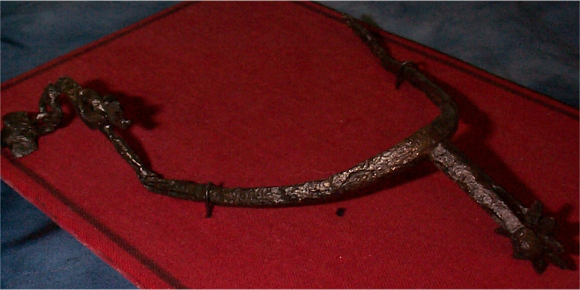 Rowel with sweeping and tapered arms of triangular form. sweeping down toward the ankle where it ends back up to the terminals, one of which remains. It is a double loop, separated by a curved arm. parts of 2 strap mounts remain. Longer stalk terminating in an 8 pointed rowel of flattened form. excavated condition.