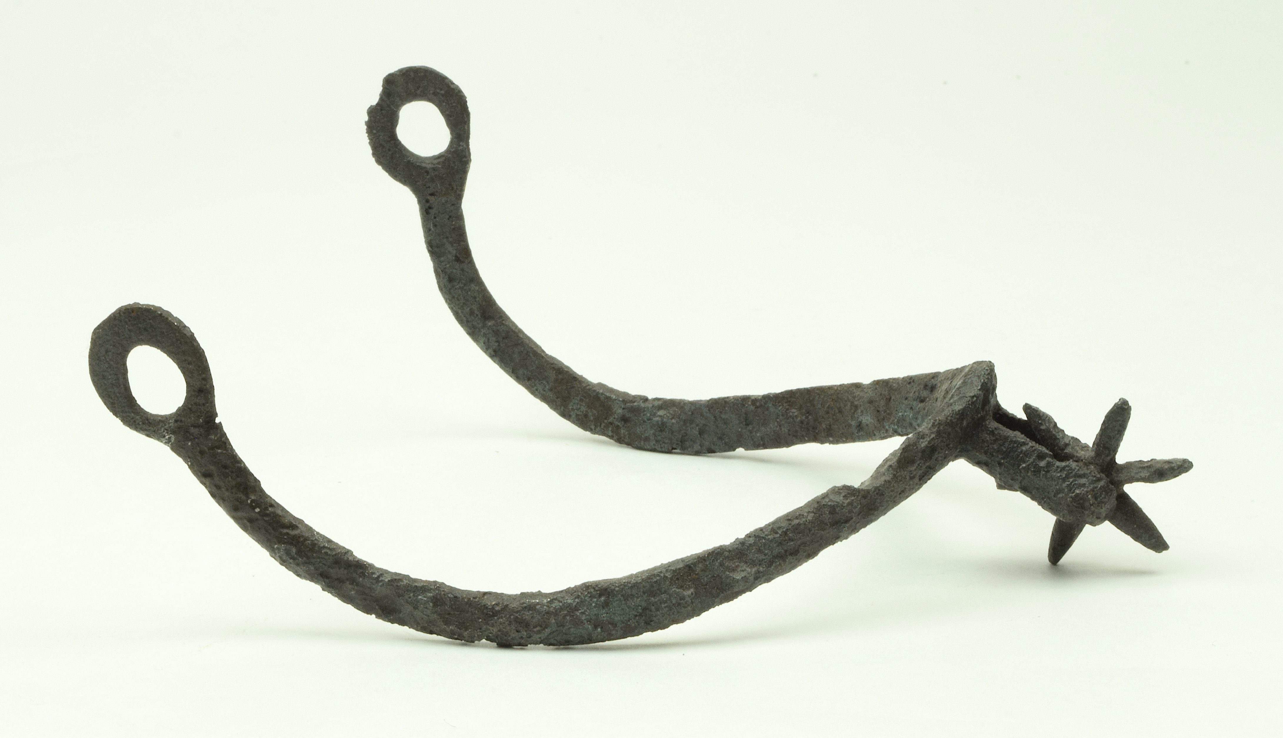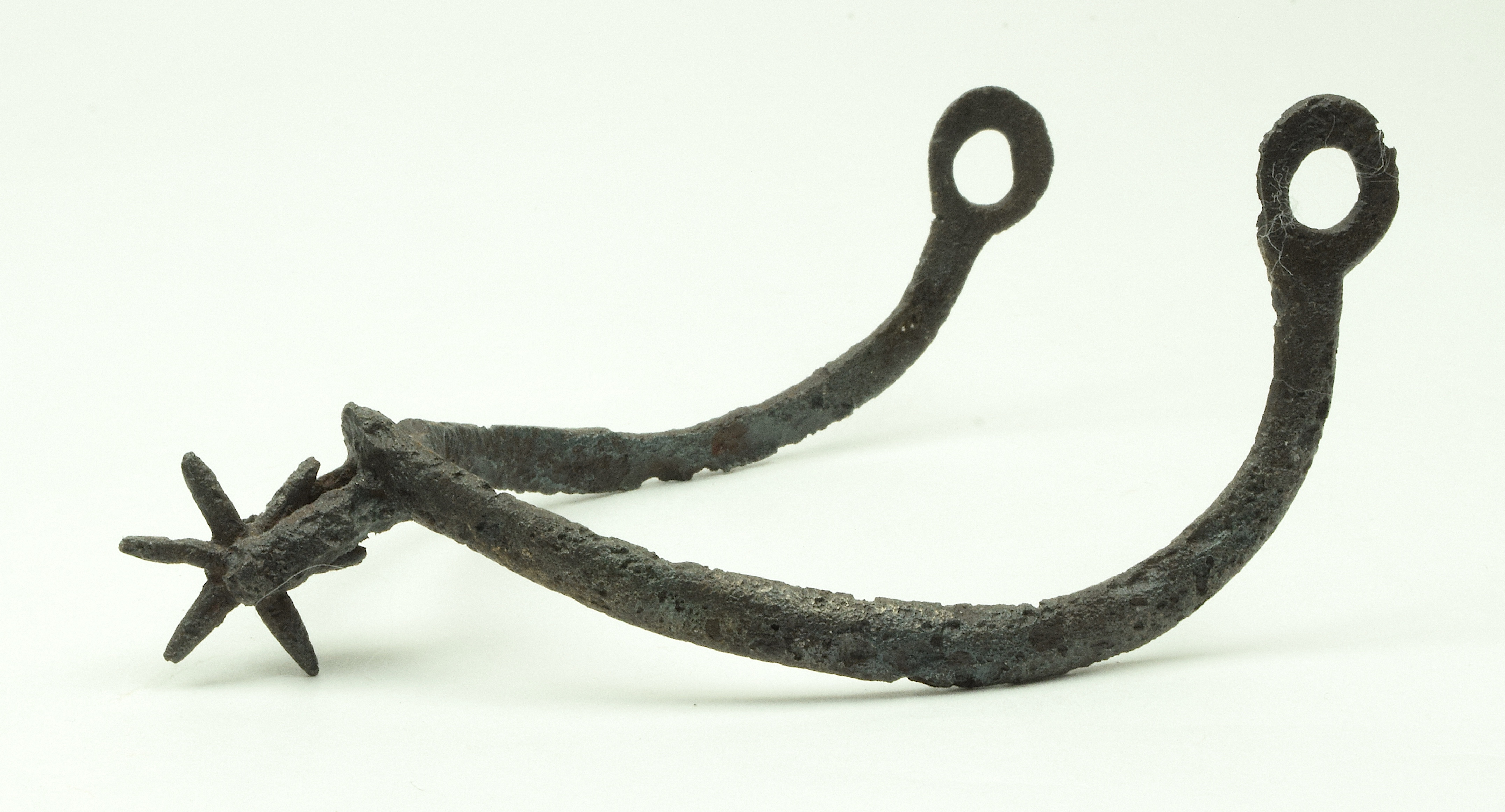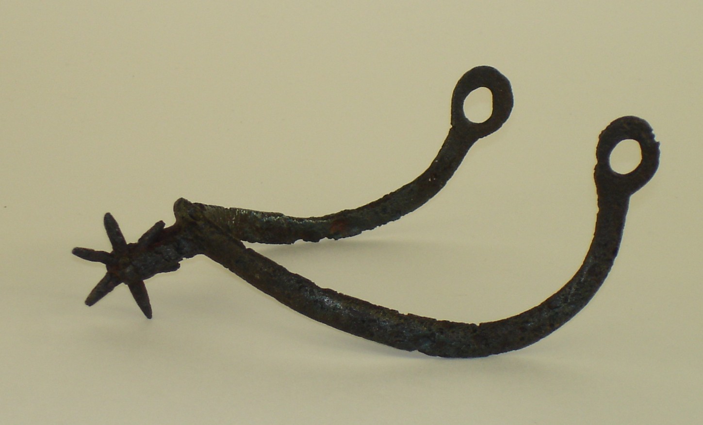 Iron, down curved arms with ring terminals. Small 6 pointed rowel. Excavated, but in good condition - both terminals complete and rowel in good shape. A very delicate form.