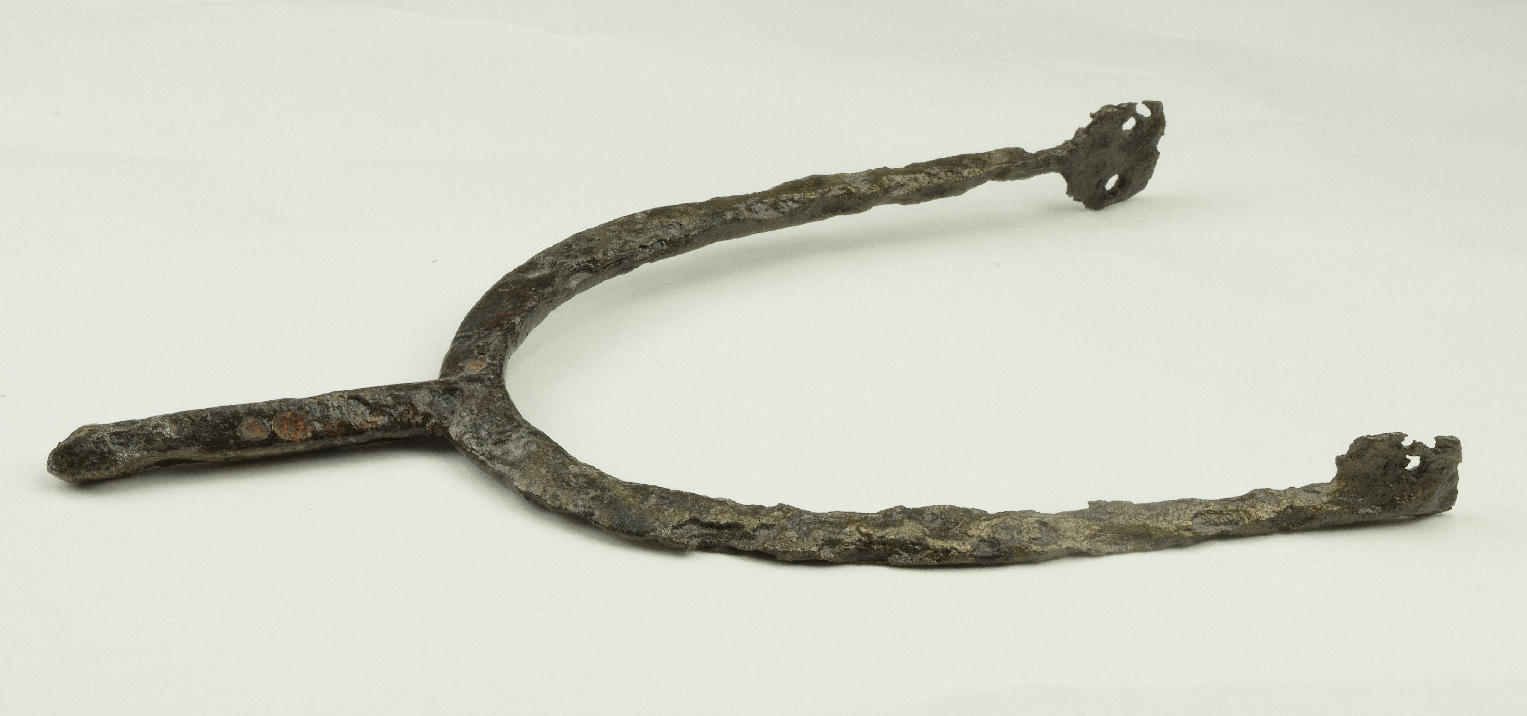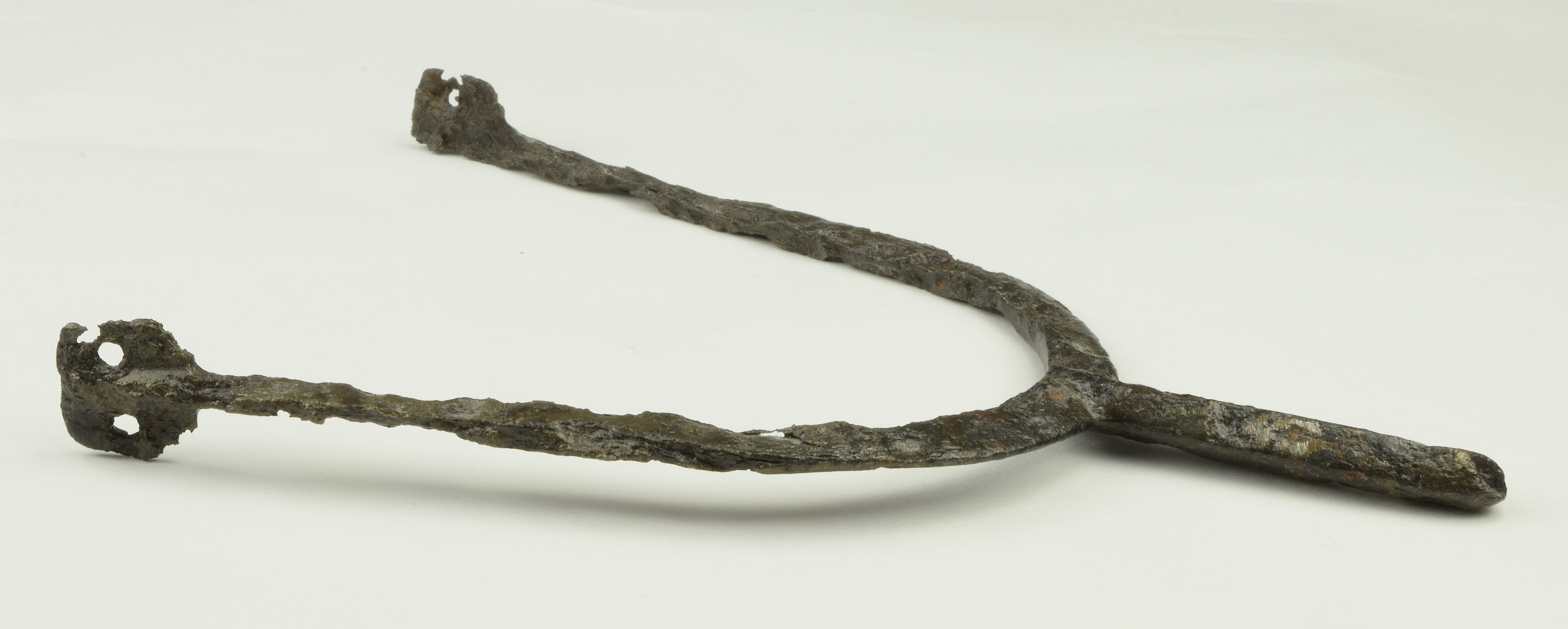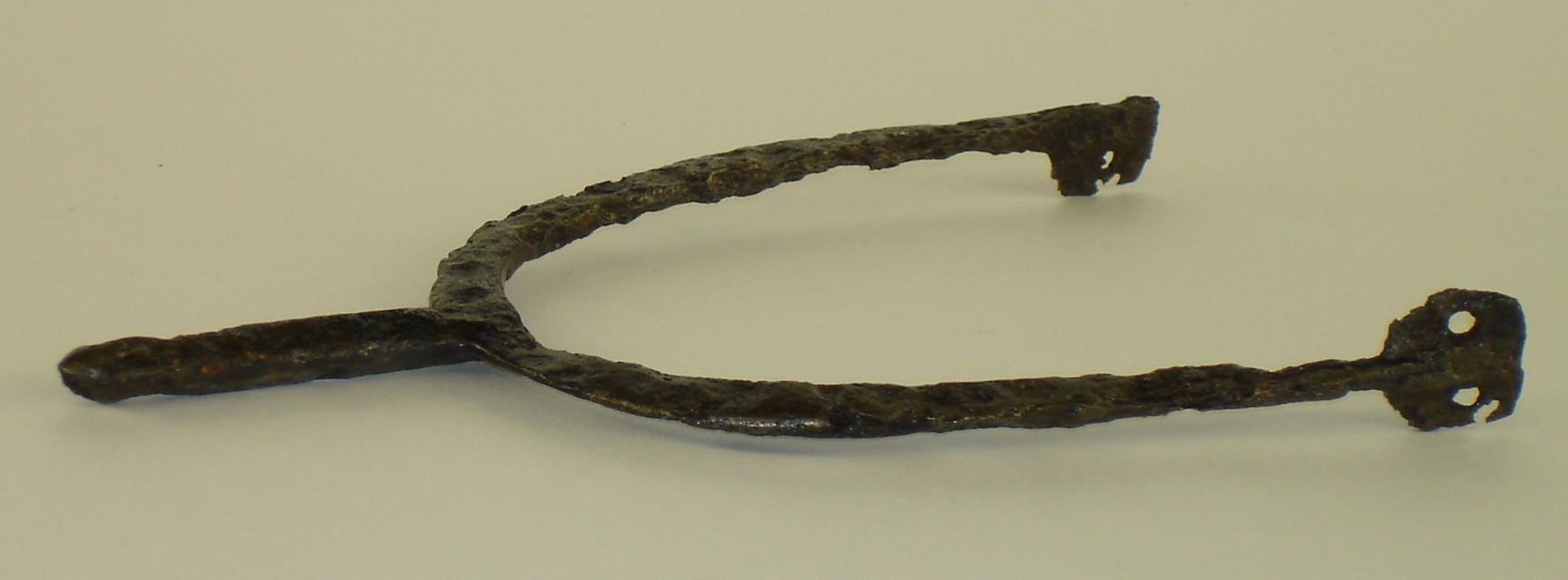 Prick spur of completely straight form. A very early and uncommon style. Each terminal of rectangular form with a rivet on each side (one side missing from one terminal). Arms of flattened form - but sticking out, not parallel to the body. Prick of straight, square form. Point now rounded, probably originally pointed.