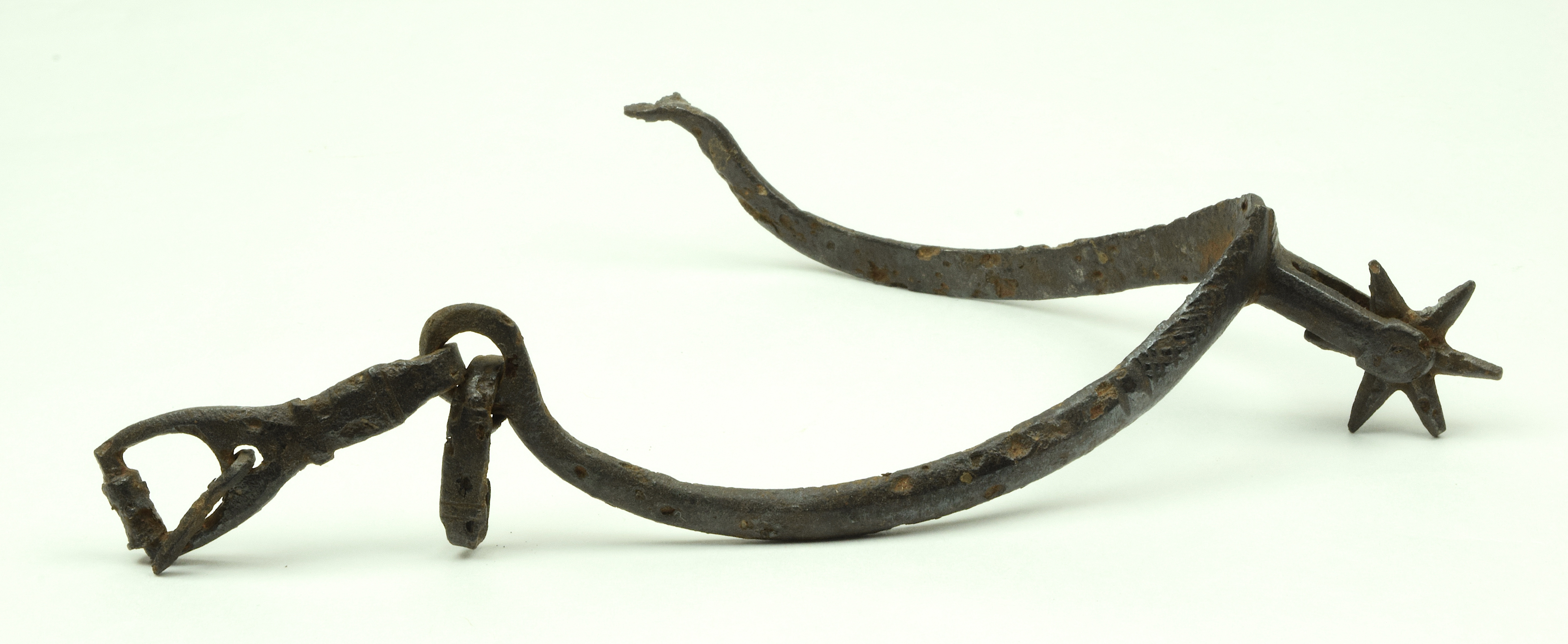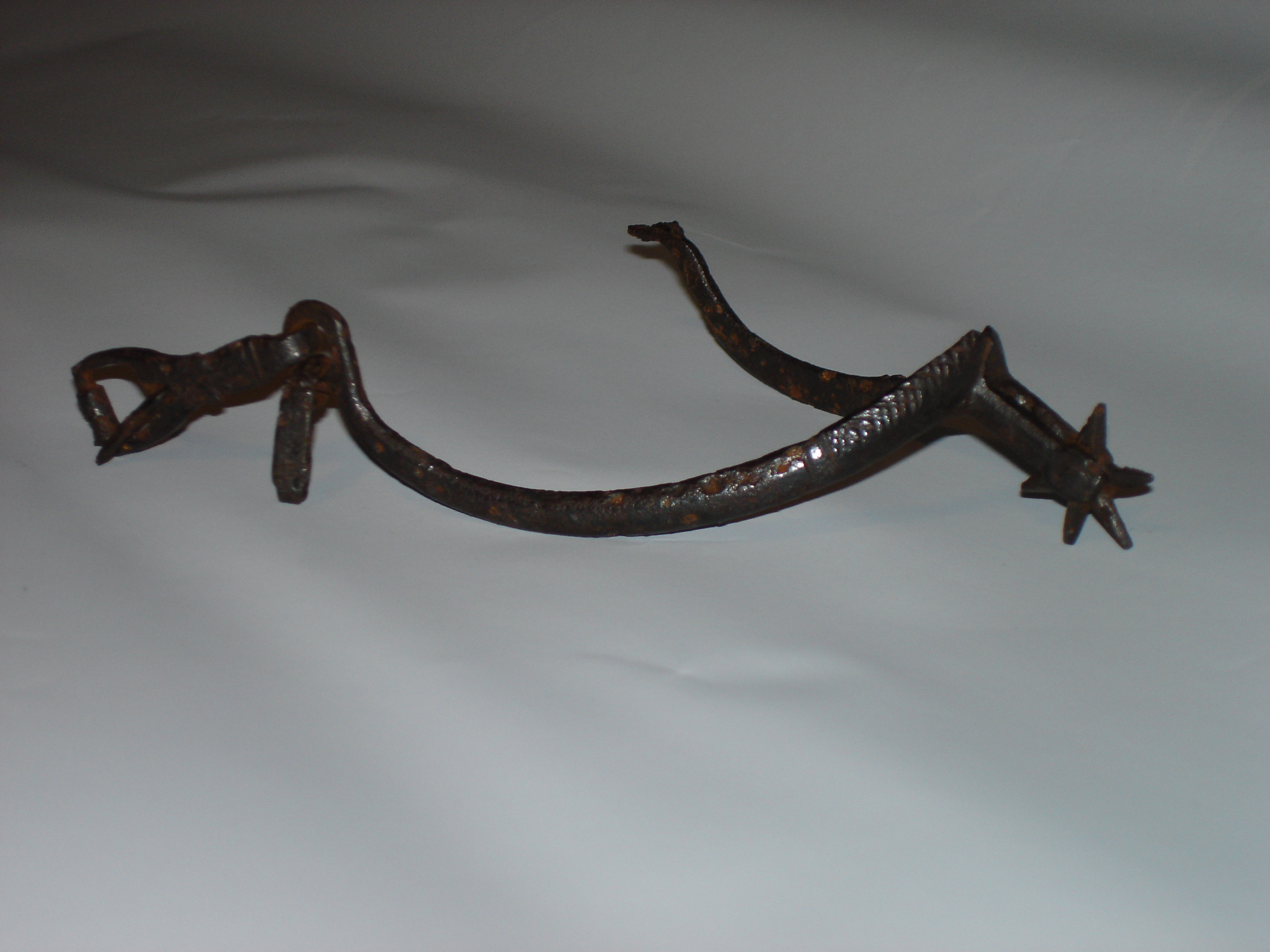 Spur. Curved arms. Cross-hatched file decoration on the upper facet of the center of the body. Small six pointed rowel. single figure 8 terminal. The other terminal would have been a vertial slot. buckle and strap mount remain on the extant terminal. Buckle is formed with an integral mount and retains its tongue and roller. The strap mount is relatively narrow and plain with some file decoration. Excavated in Germany.