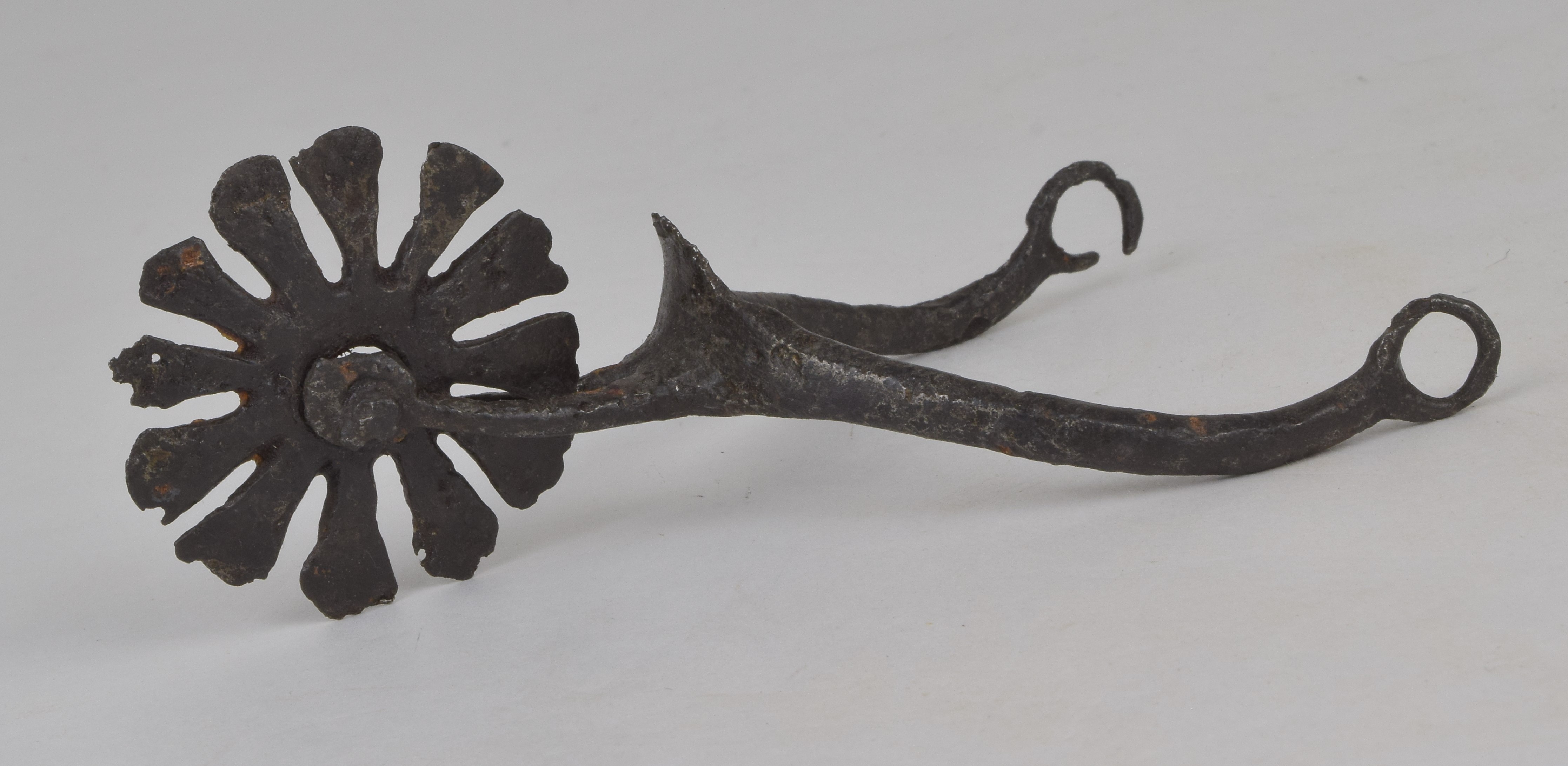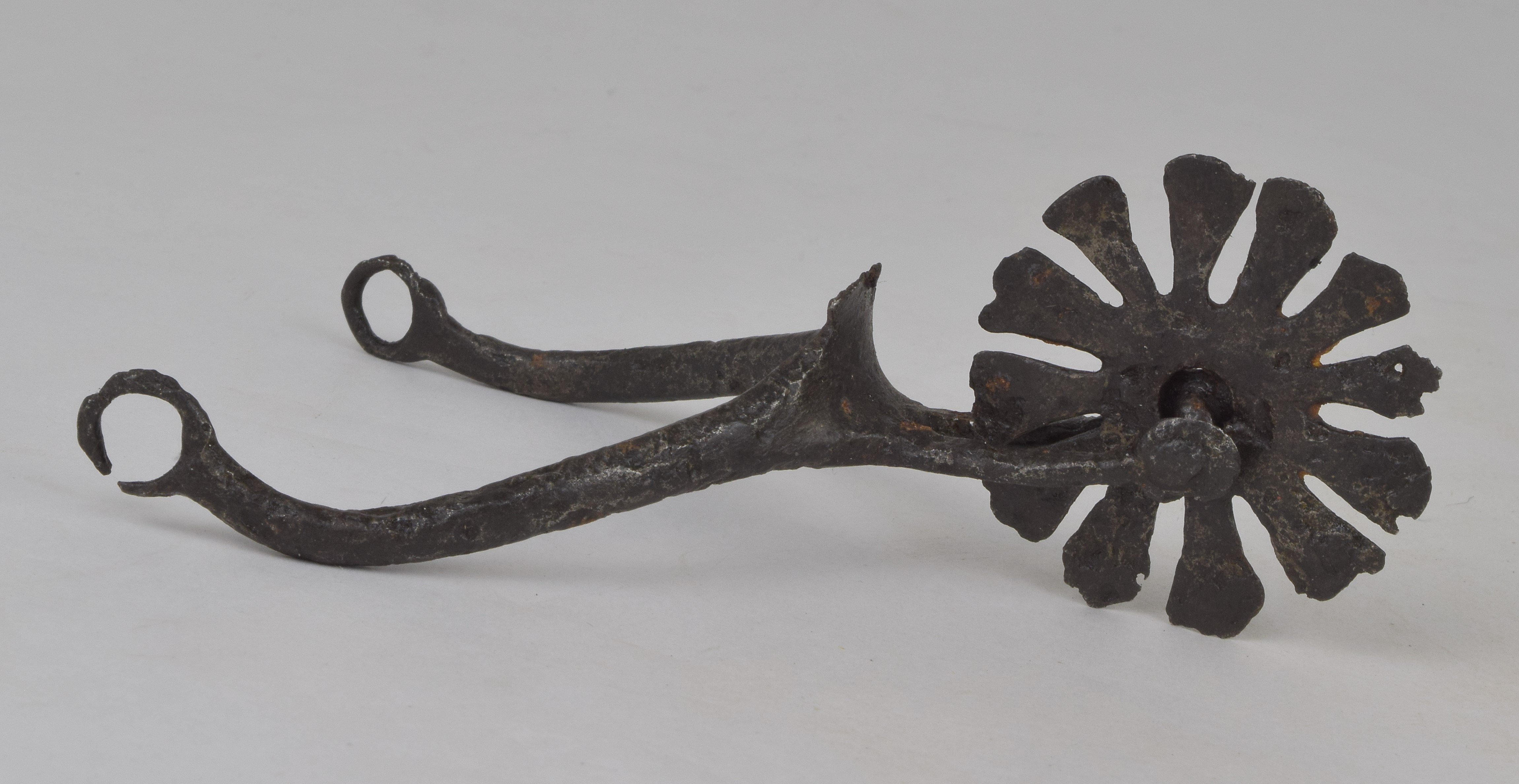 Rowel spur. Narrow, rounded arms terminating in a loop on each end which would have carried the strap mounts. Short tapering stalk which spreads to a large rounded section which carries the large rowel in the form of petals. The center of the body rises to a point at the base of the stalk.
