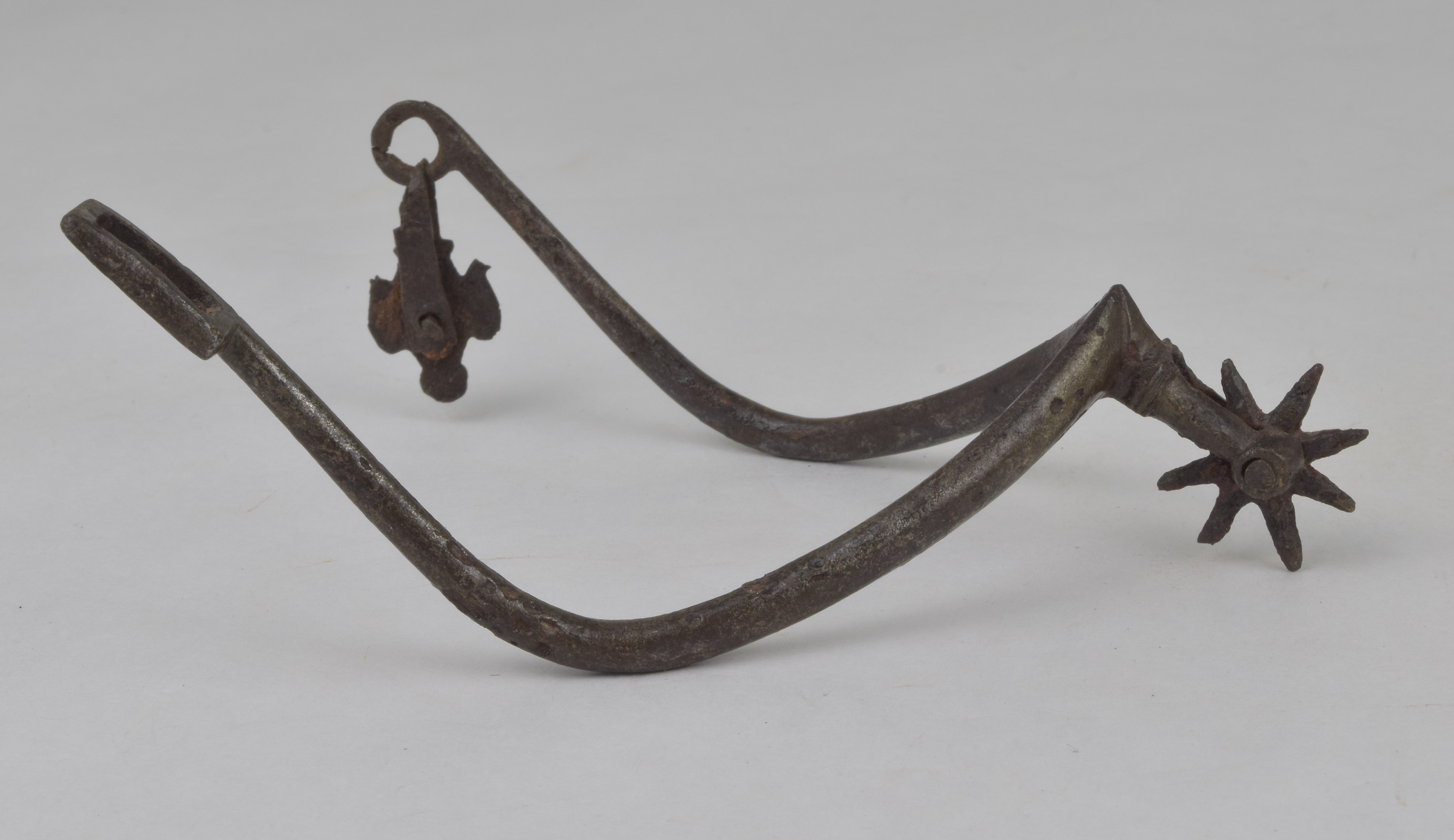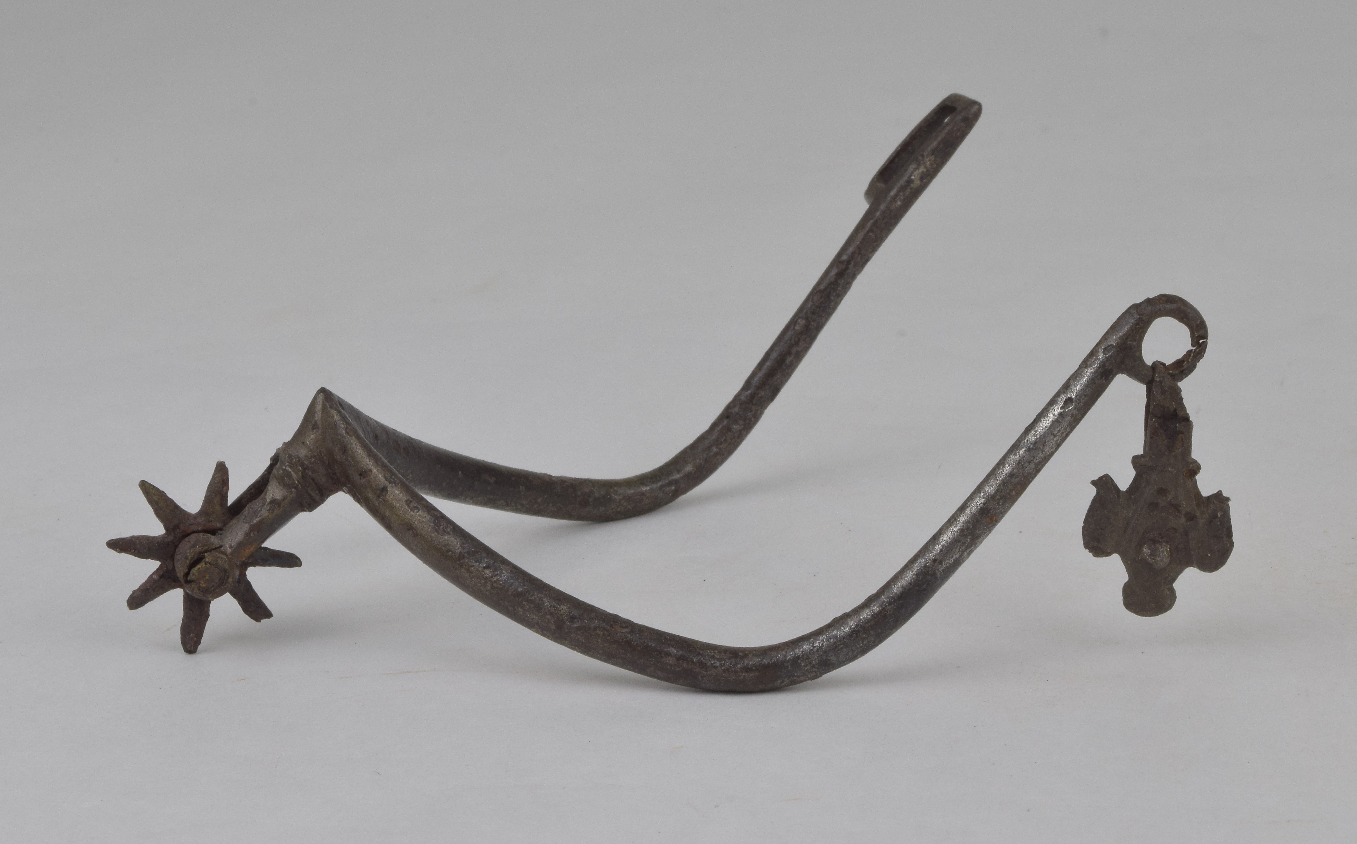 Rowel spur. Narrow arms of rounded section terminating in a loop on one end and a slot on the other end. Short stalk transitioning from oval to diamond shaped with a square decorative bolster in between carrying a small eight pointed rowel. Retains one strap mount. The strap mount is more decorated than most. For the right foot.