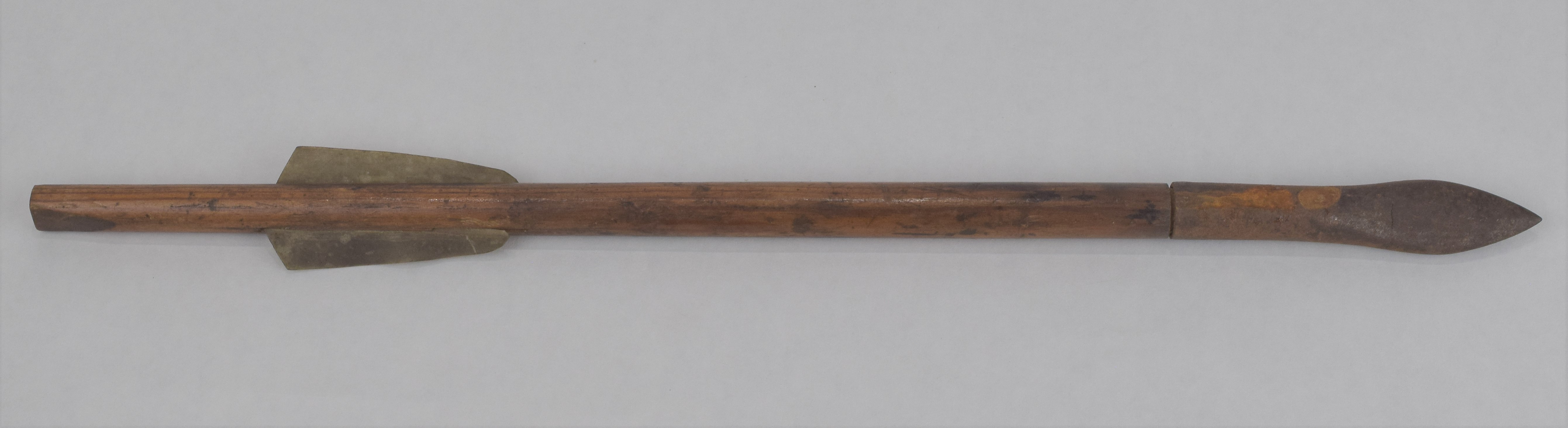 Wood shaft with leaf shaped point with socket. Shaft fitted to the inside of the socket so that the outside of the socket is flush with the shaft. Vanes replaced.