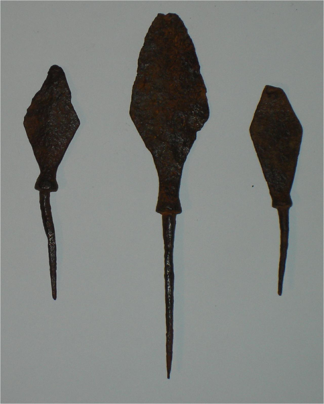 3 arrow heads with roughly dieamond-shaped heads and spikes for attachment to the arrows.