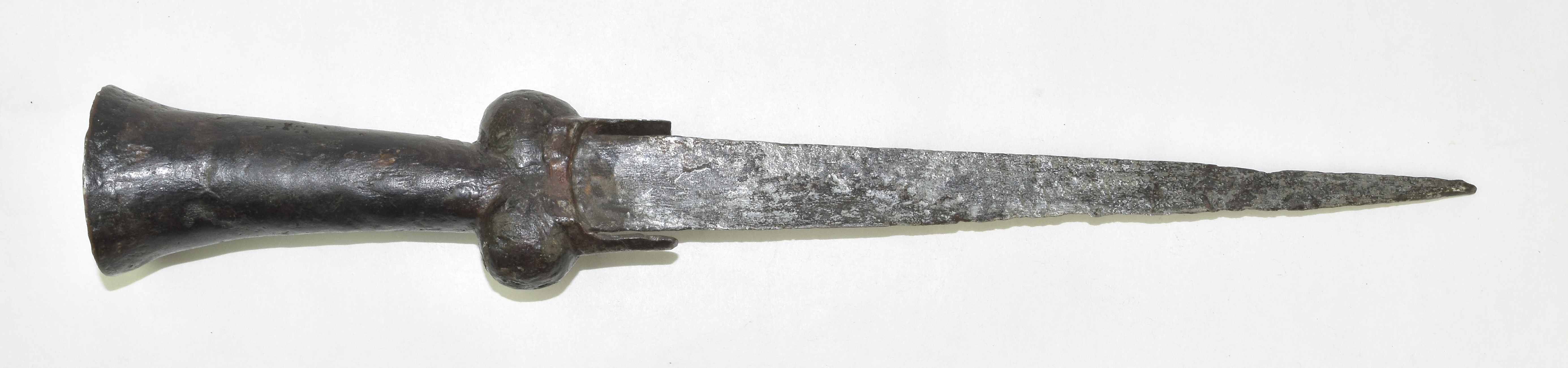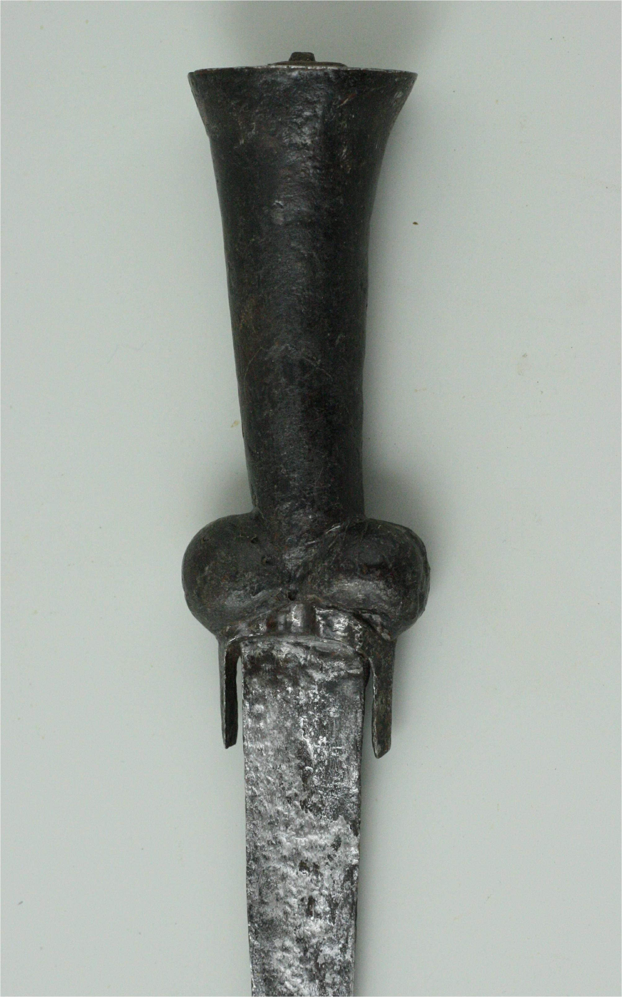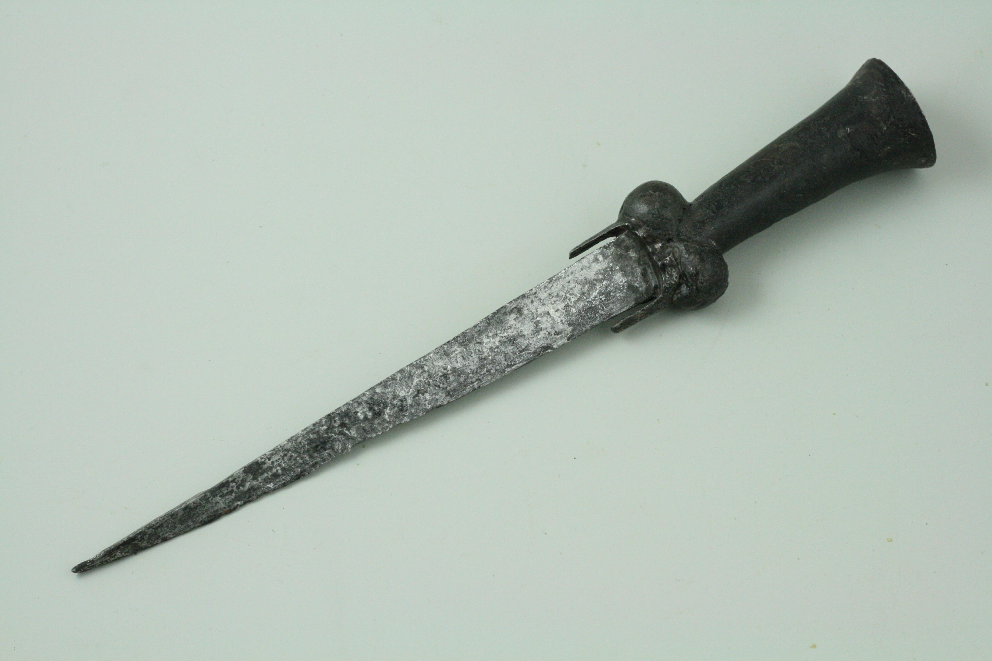 Excavated. Sharply tapered, deeply hollow ground, wedge shaped blade. Handle of typical form with a pair of lobes at the hilt and flairing out toward the pommel. The hilt with an iron plate bending down to form points on each side of the blade. Pommel with a disk shaped plate and a small copper washer and the peinned end of the tang. Wood with some modern fill. Measurements: 8 1/4 in (21 cm) blade. Ex. Coll. Anthony De Reuck.